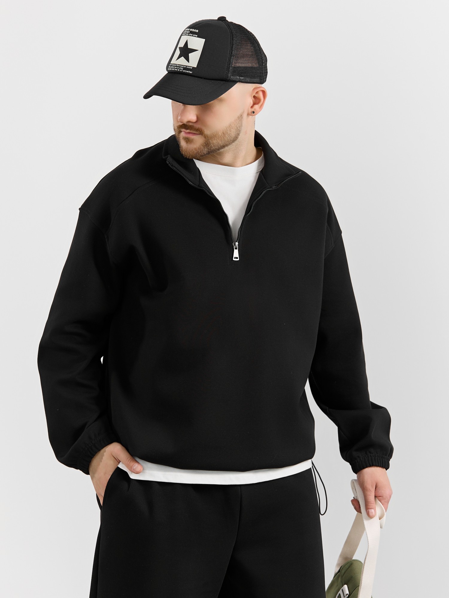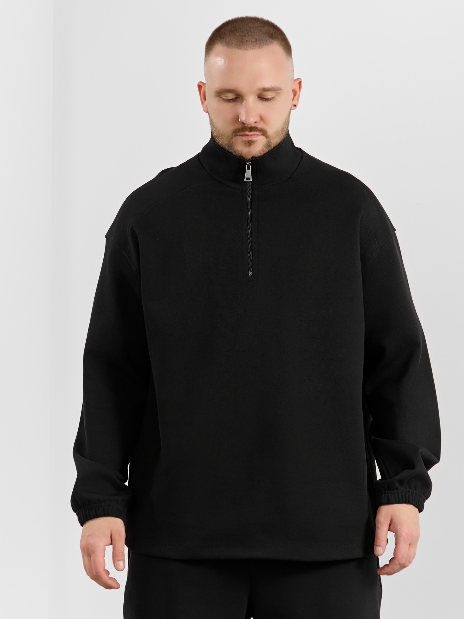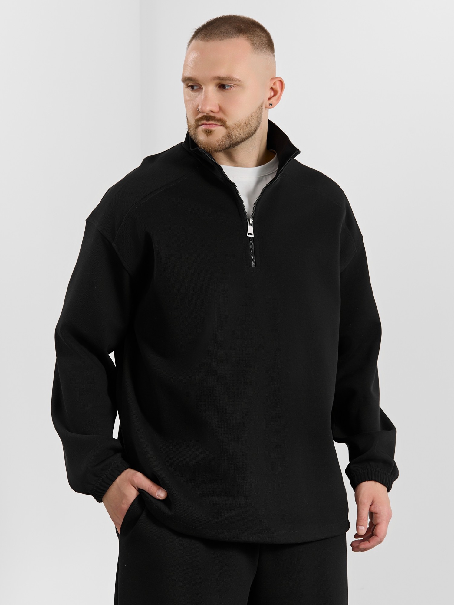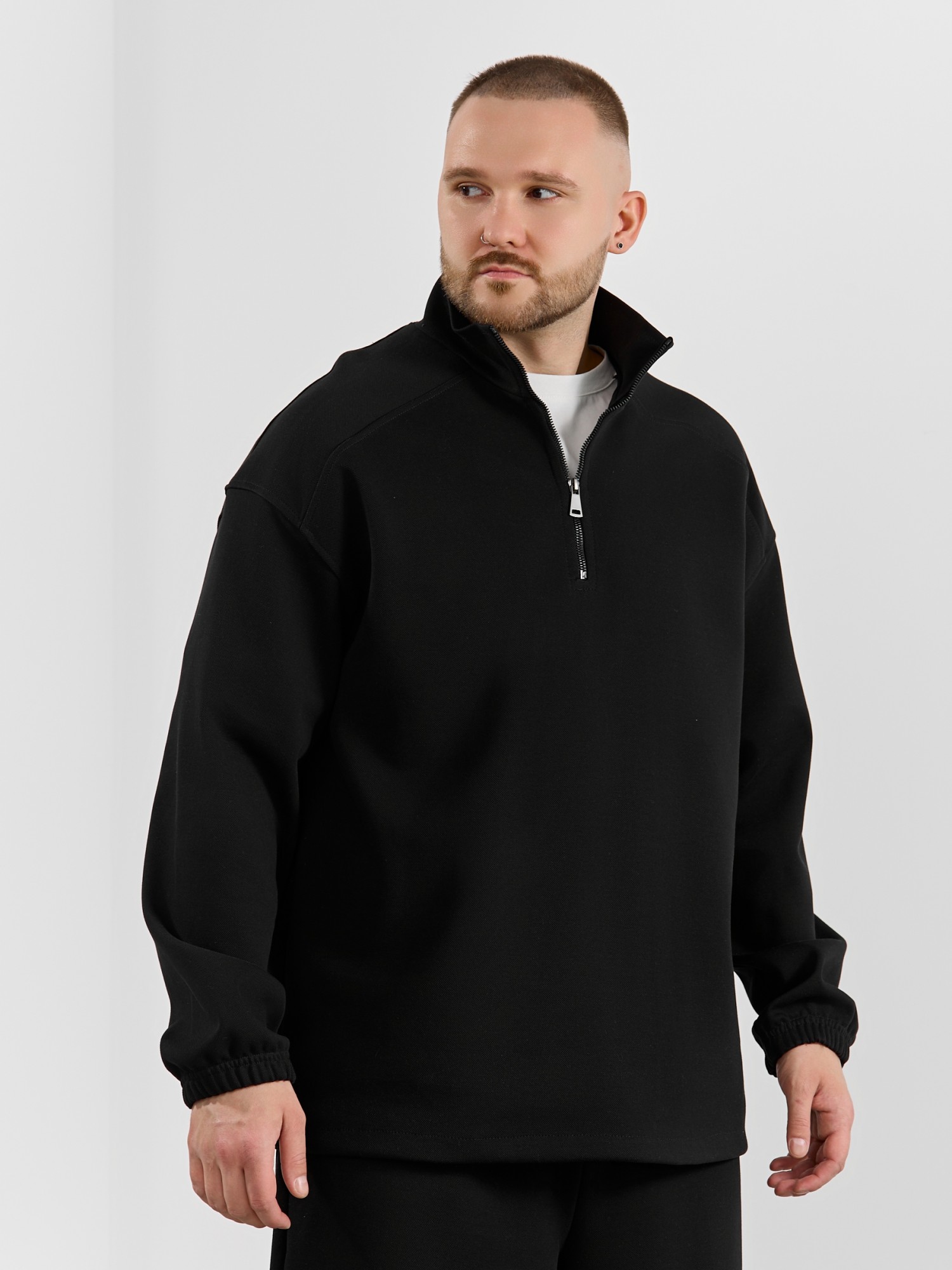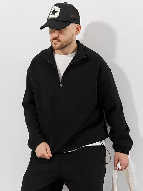 Толстовка мужская из трикотажного полотна "интерлок-пике". Толстовка свободного покроя, с длинными втачными рукавами, заниженными проймами и воротником-стойкой. Полочка с кокетками, с неразъемной застежкой "молния", обработанной в рамке. Нижние срезы рукавов обработаны с эластичной тесьмой, нижний срез изделия - подгибкой, с эластичным шнуром и фиксатором для регулировки ширины изделия на этом участке.