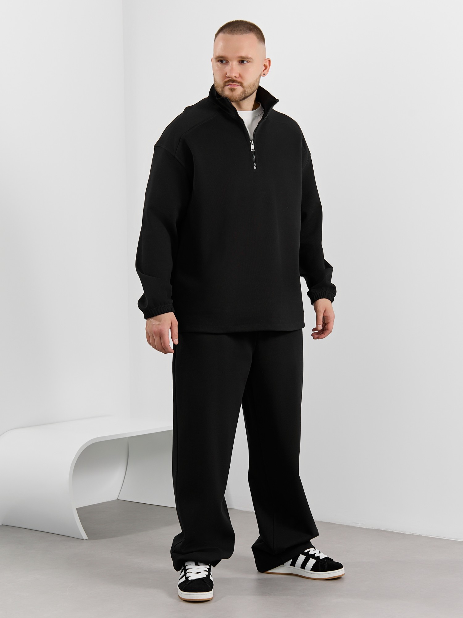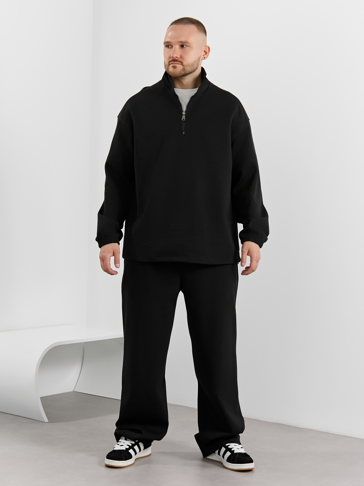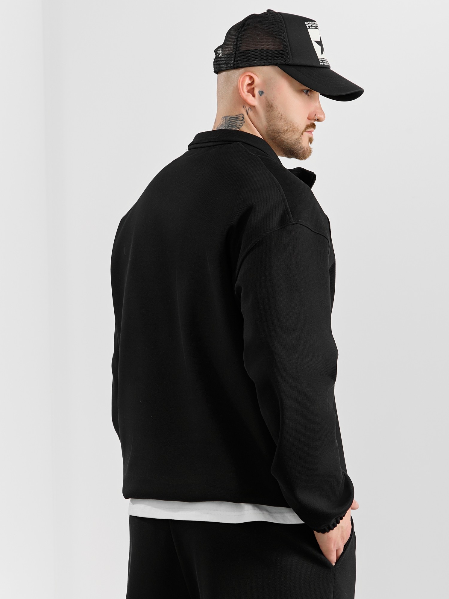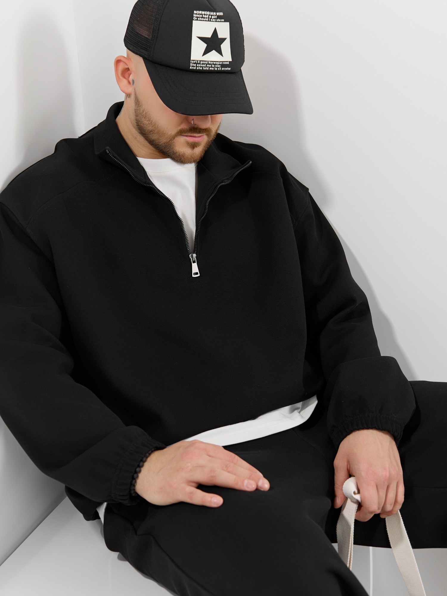 Толстовка мужская из трикотажного полотна "интерлок-пике". Толстовка свободного покроя, с длинными втачными рукавами, заниженными проймами и воротником-стойкой. Полочка с кокетками, с неразъемной застежкой "молния", обработанной в рамке. Нижние срезы рукавов обработаны с эластичной тесьмой, нижний срез изделия - подгибкой, с эластичным шнуром и фиксатором для регулировки ширины изделия на этом участке.