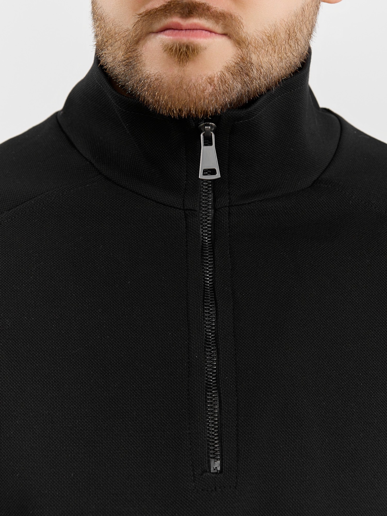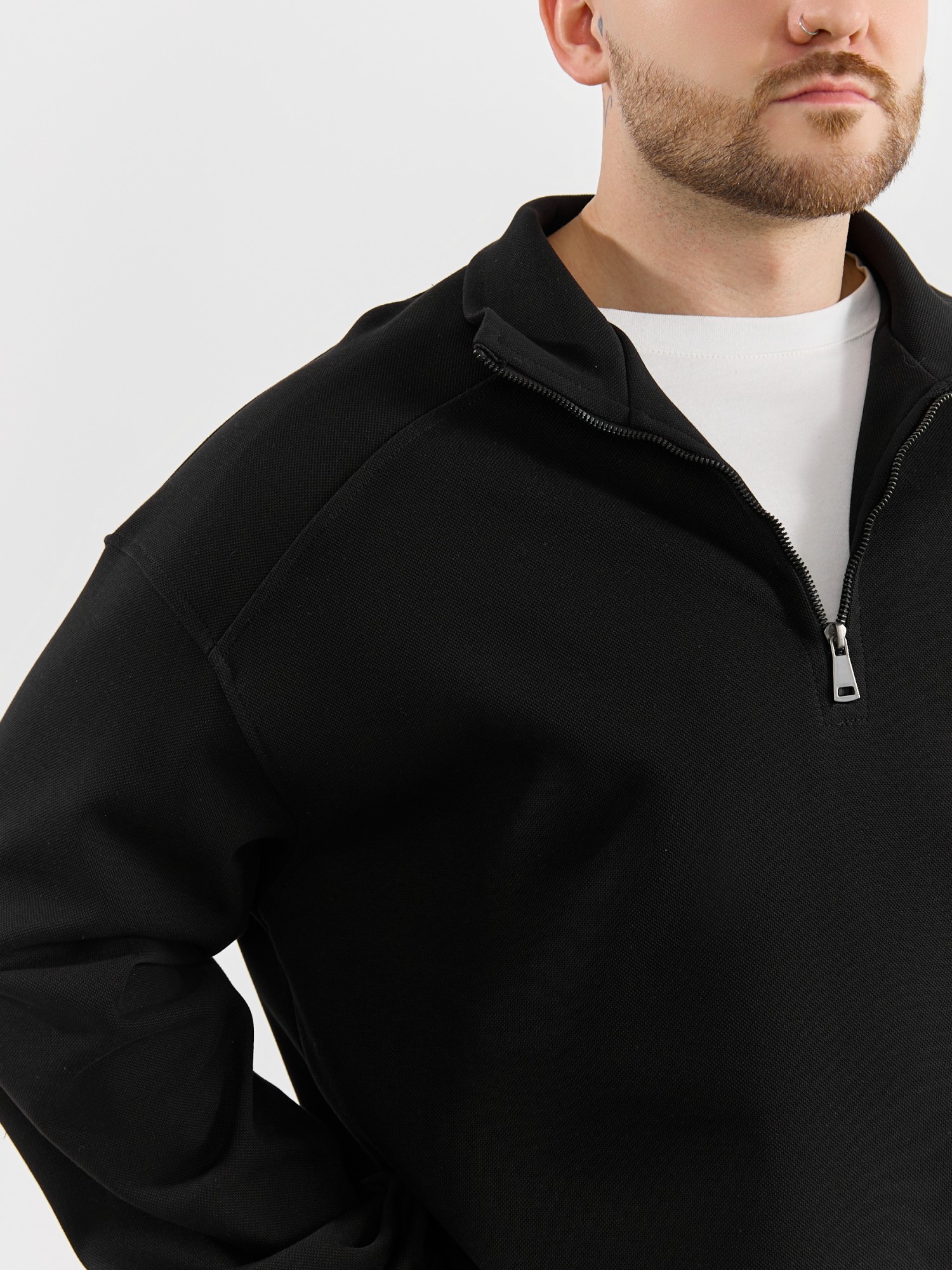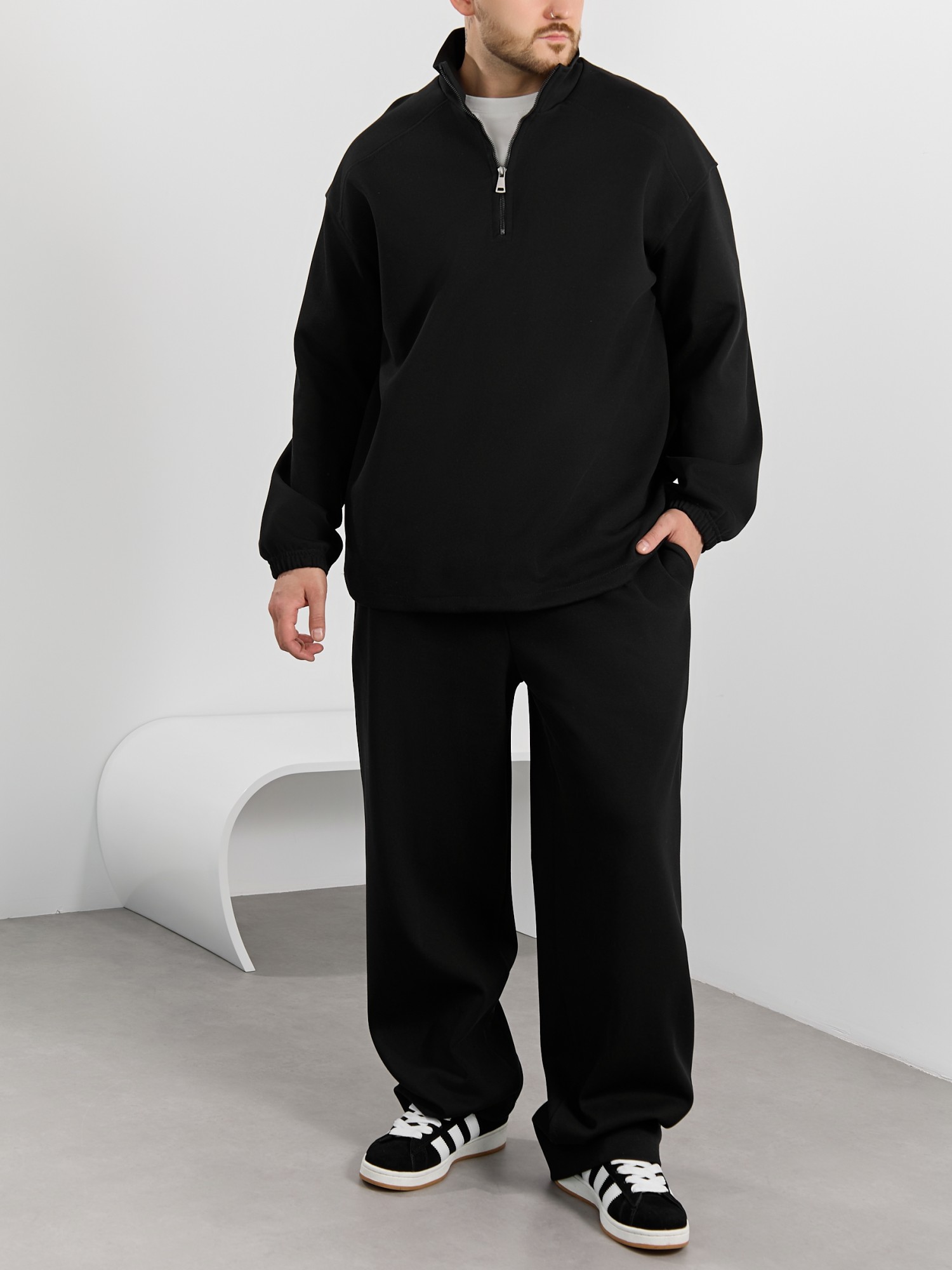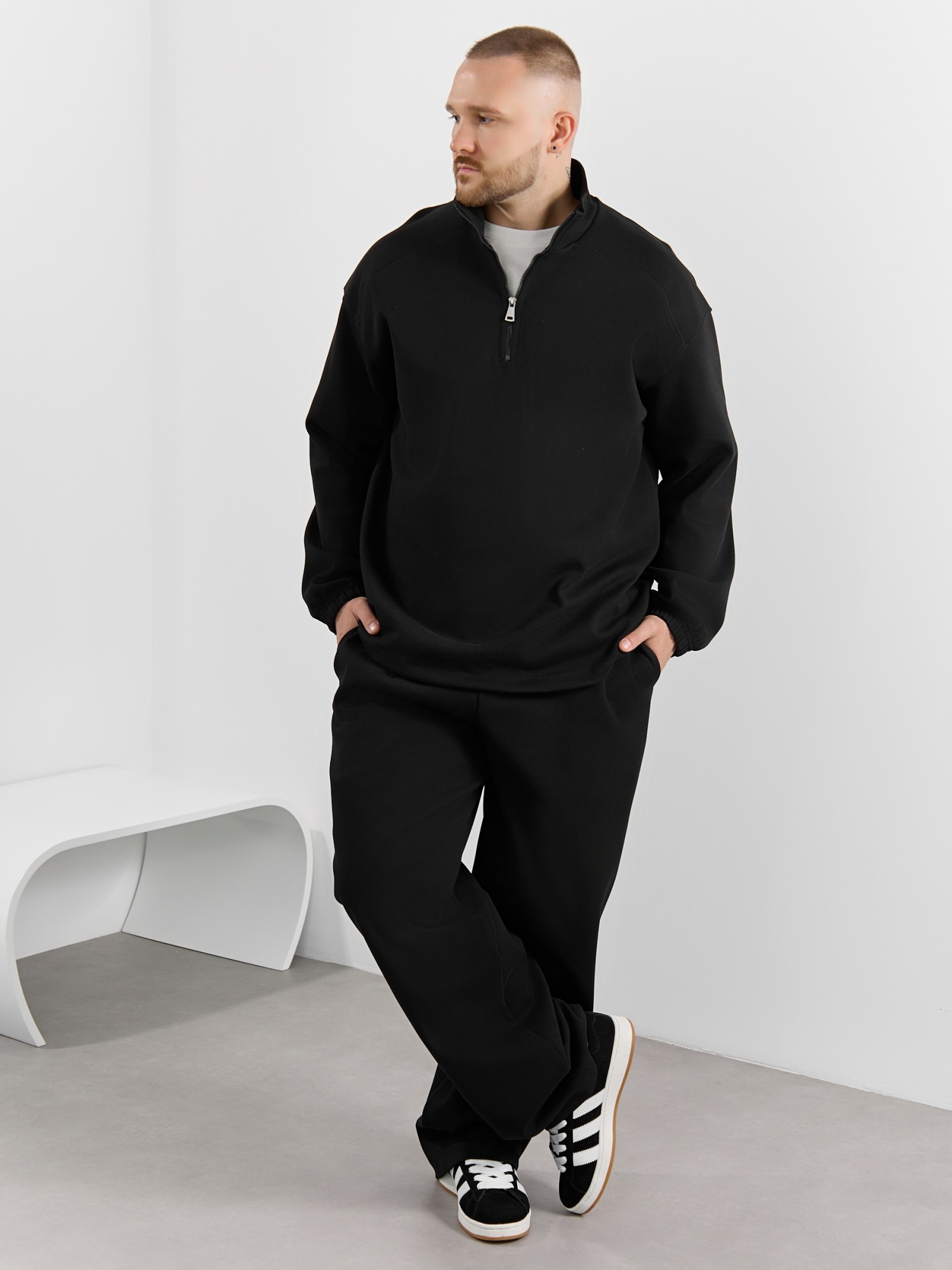 Толстовка мужская из трикотажного полотна "интерлок-пике". Толстовка свободного покроя, с длинными втачными рукавами, заниженными проймами и воротником-стойкой. Полочка с кокетками, с неразъемной застежкой "молния", обработанной в рамке. Нижние срезы рукавов обработаны с эластичной тесьмой, нижний срез изделия - подгибкой, с эластичным шнуром и фиксатором для регулировки ширины изделия на этом участке.