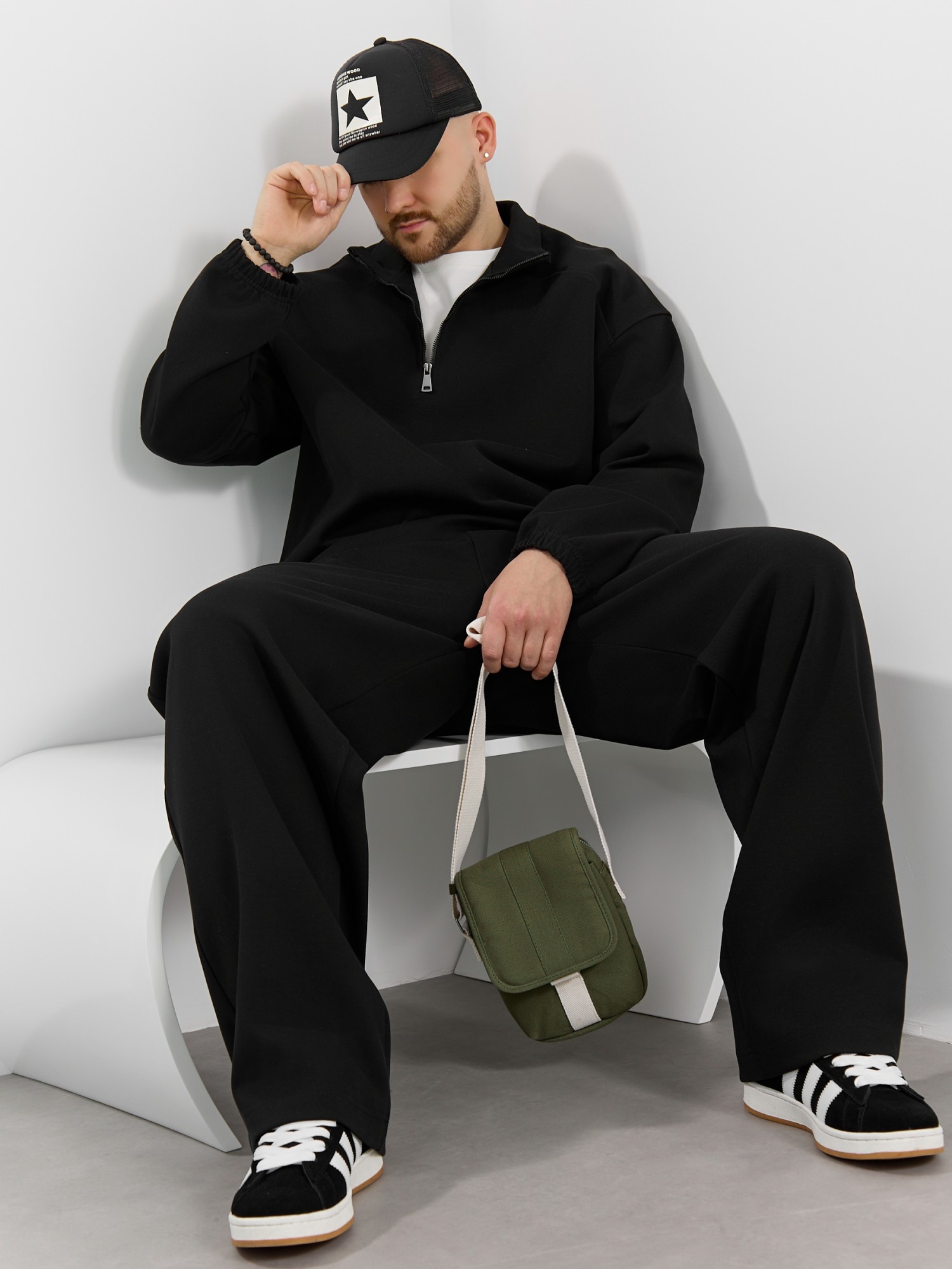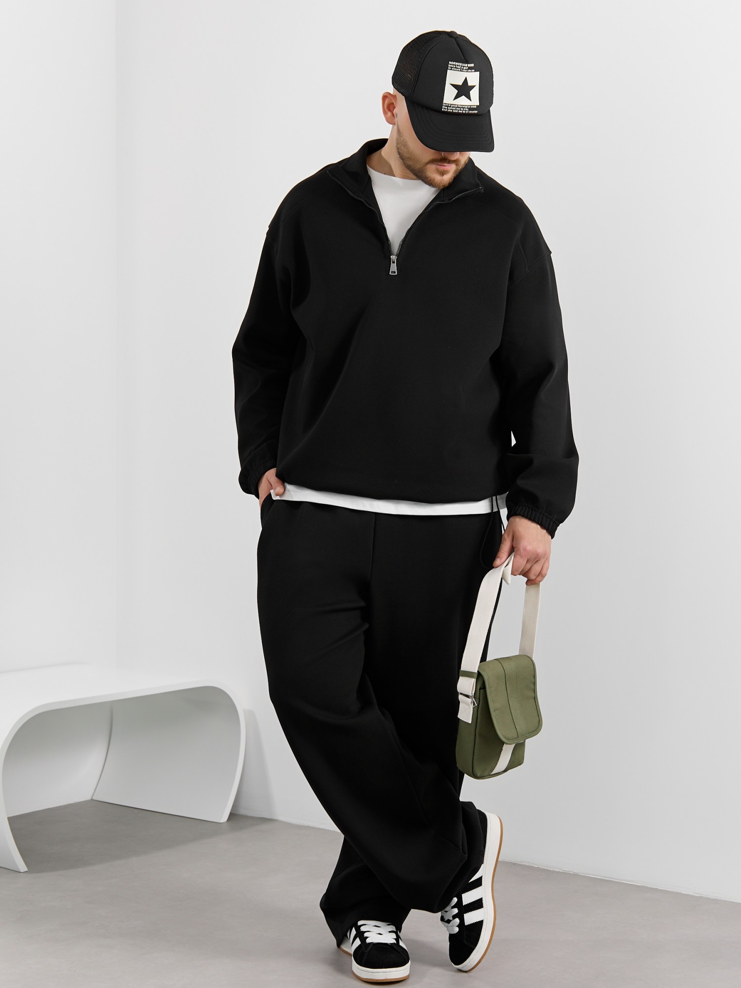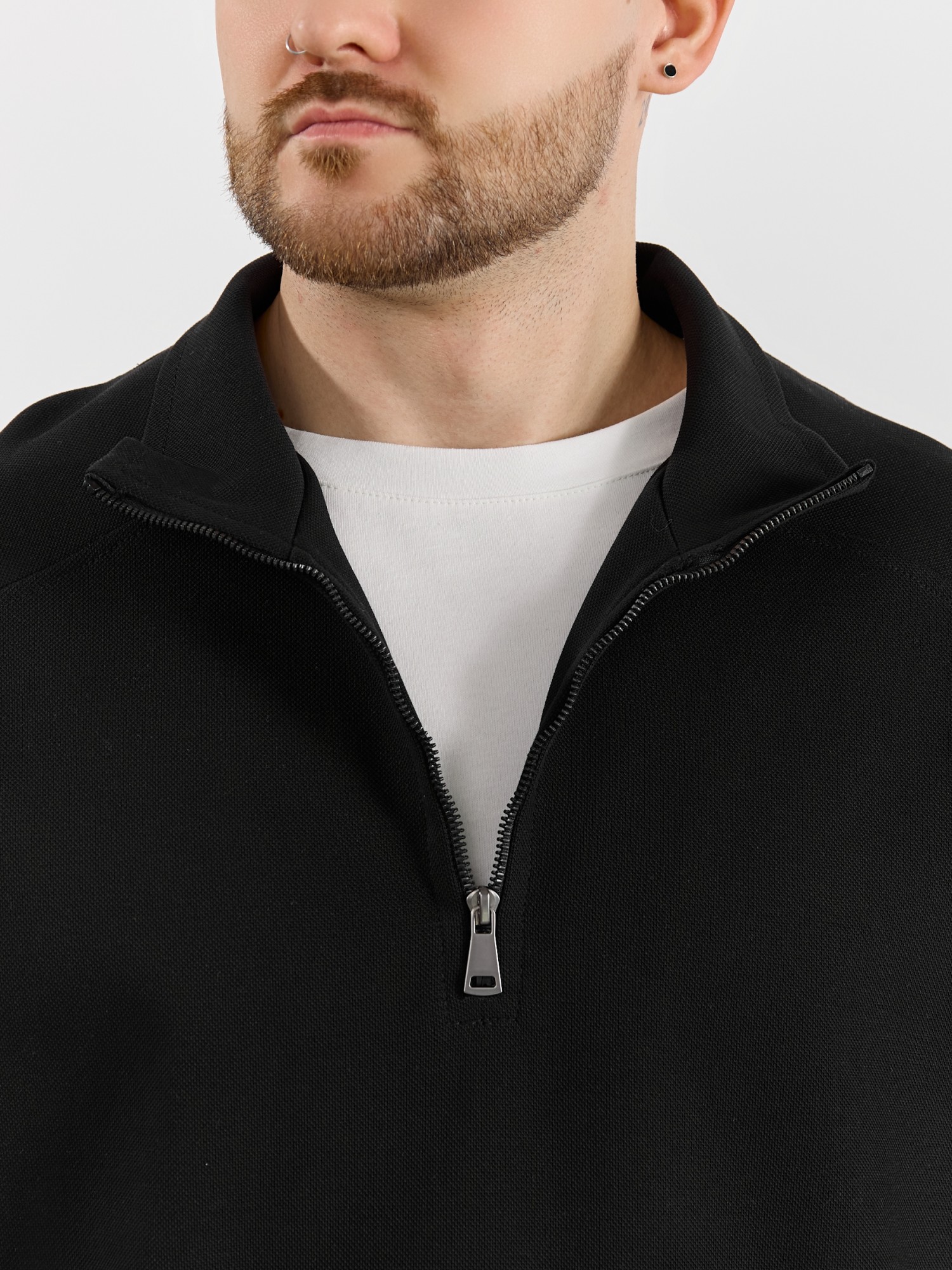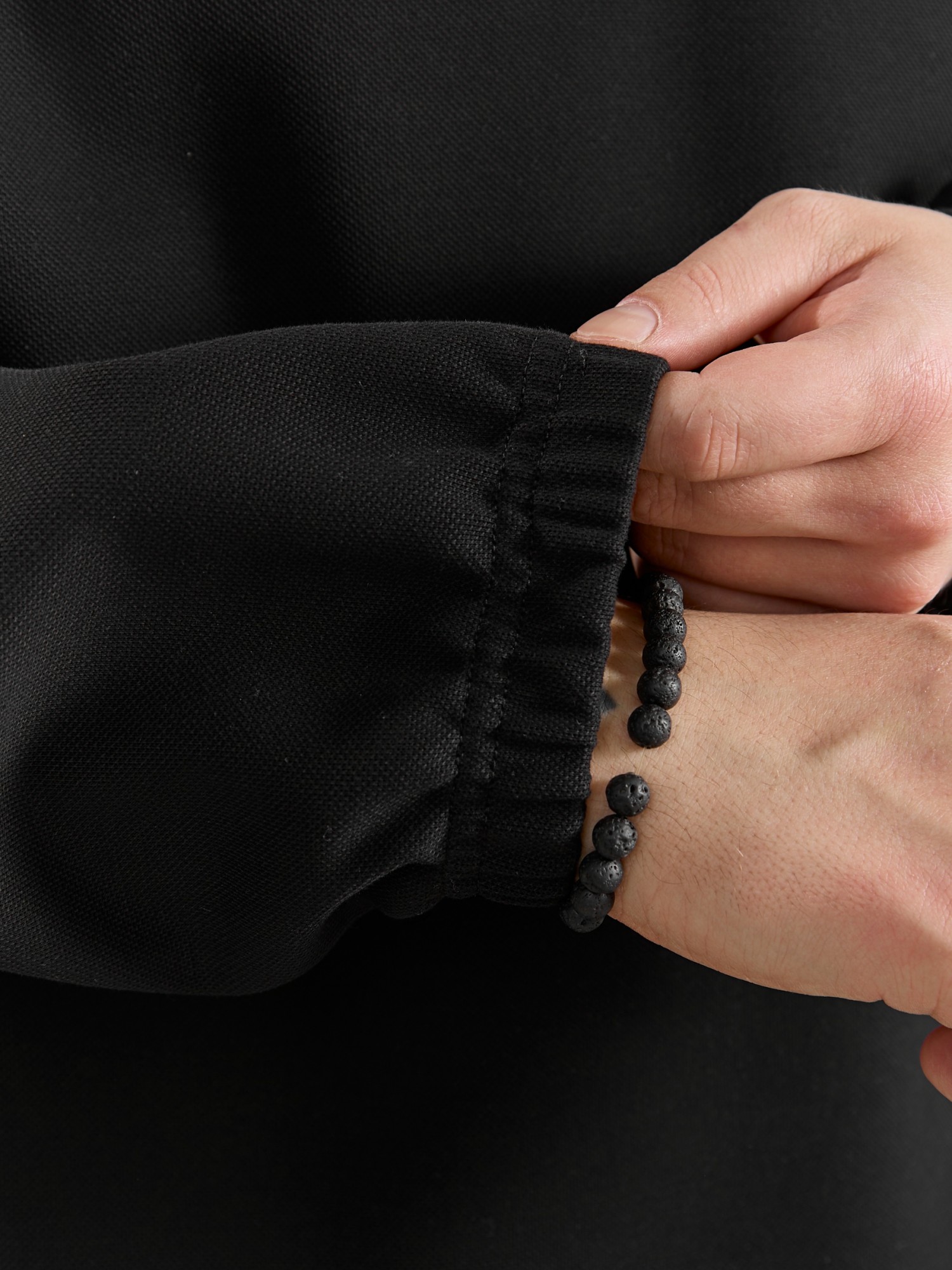 Толстовка мужская из трикотажного полотна "интерлок-пике". Толстовка свободного покроя, с длинными втачными рукавами, заниженными проймами и воротником-стойкой. Полочка с кокетками, с неразъемной застежкой "молния", обработанной в рамке. Нижние срезы рукавов обработаны с эластичной тесьмой, нижний срез изделия - подгибкой, с эластичным шнуром и фиксатором для регулировки ширины изделия на этом участке.