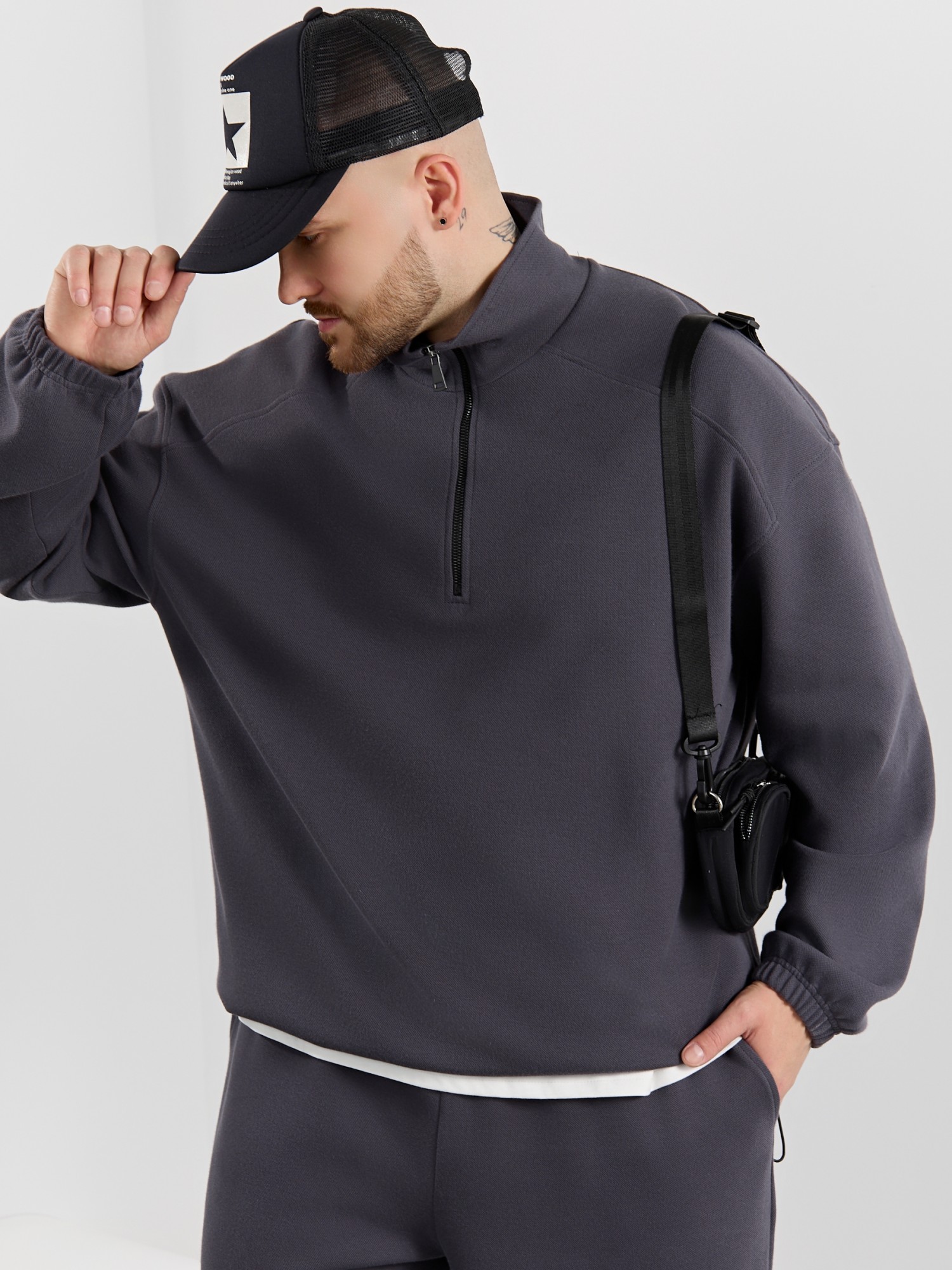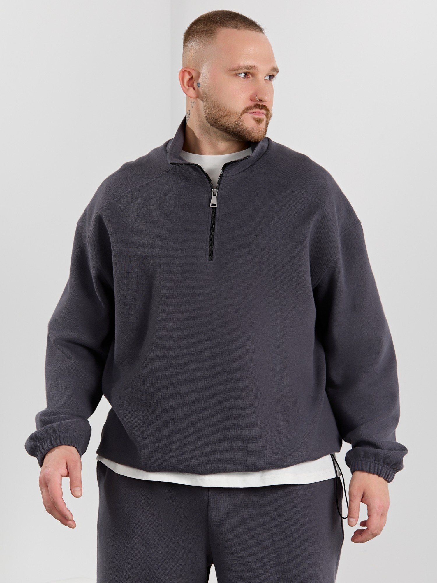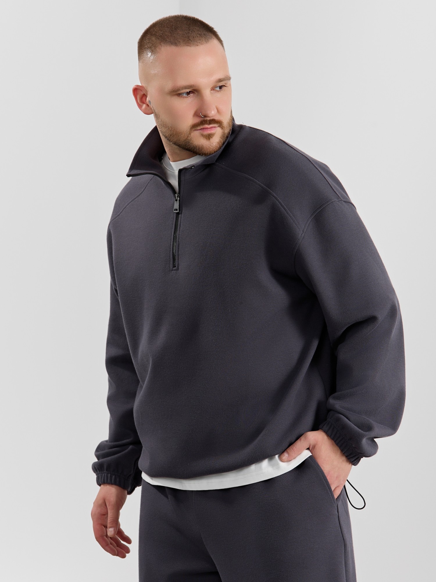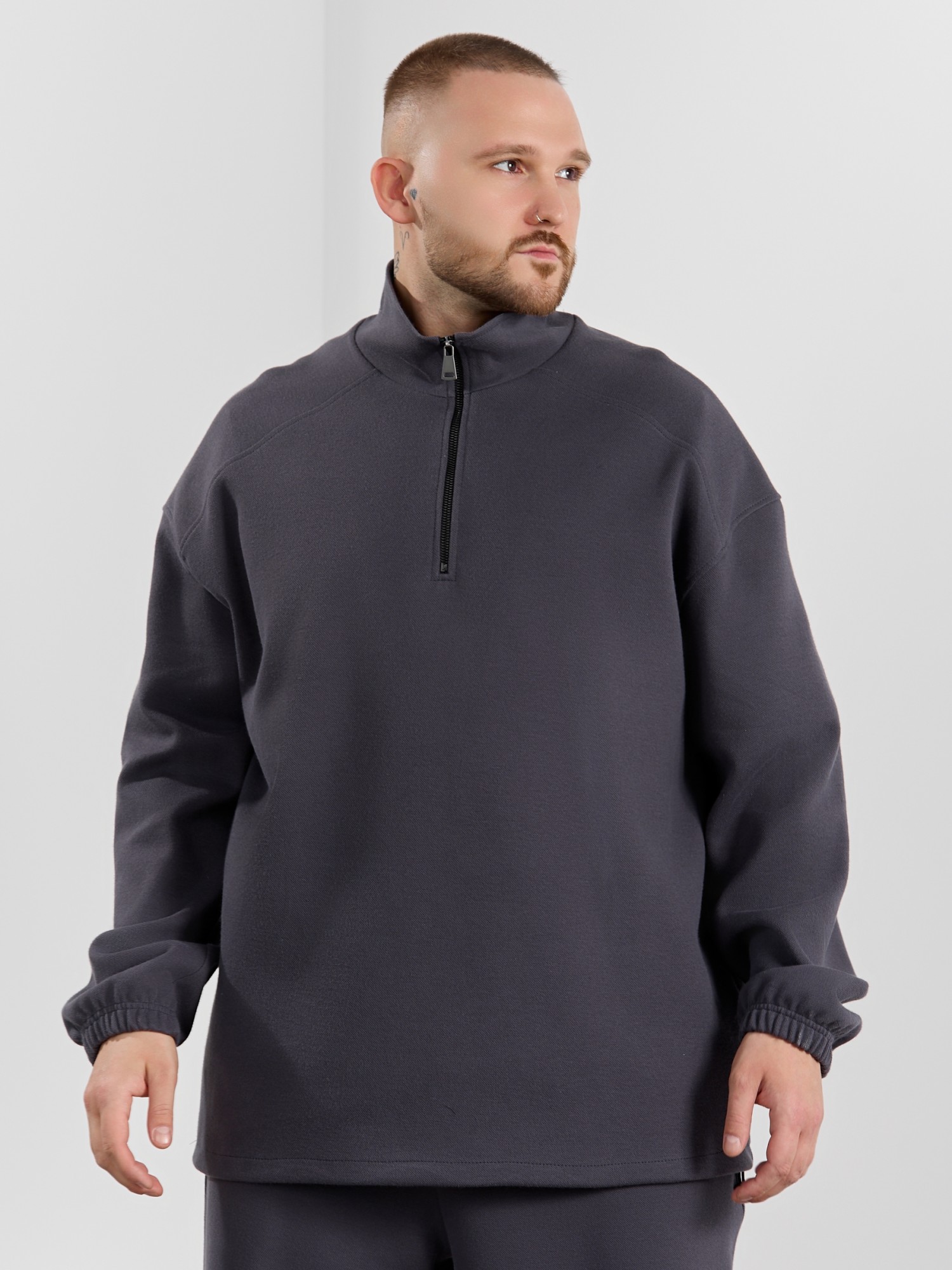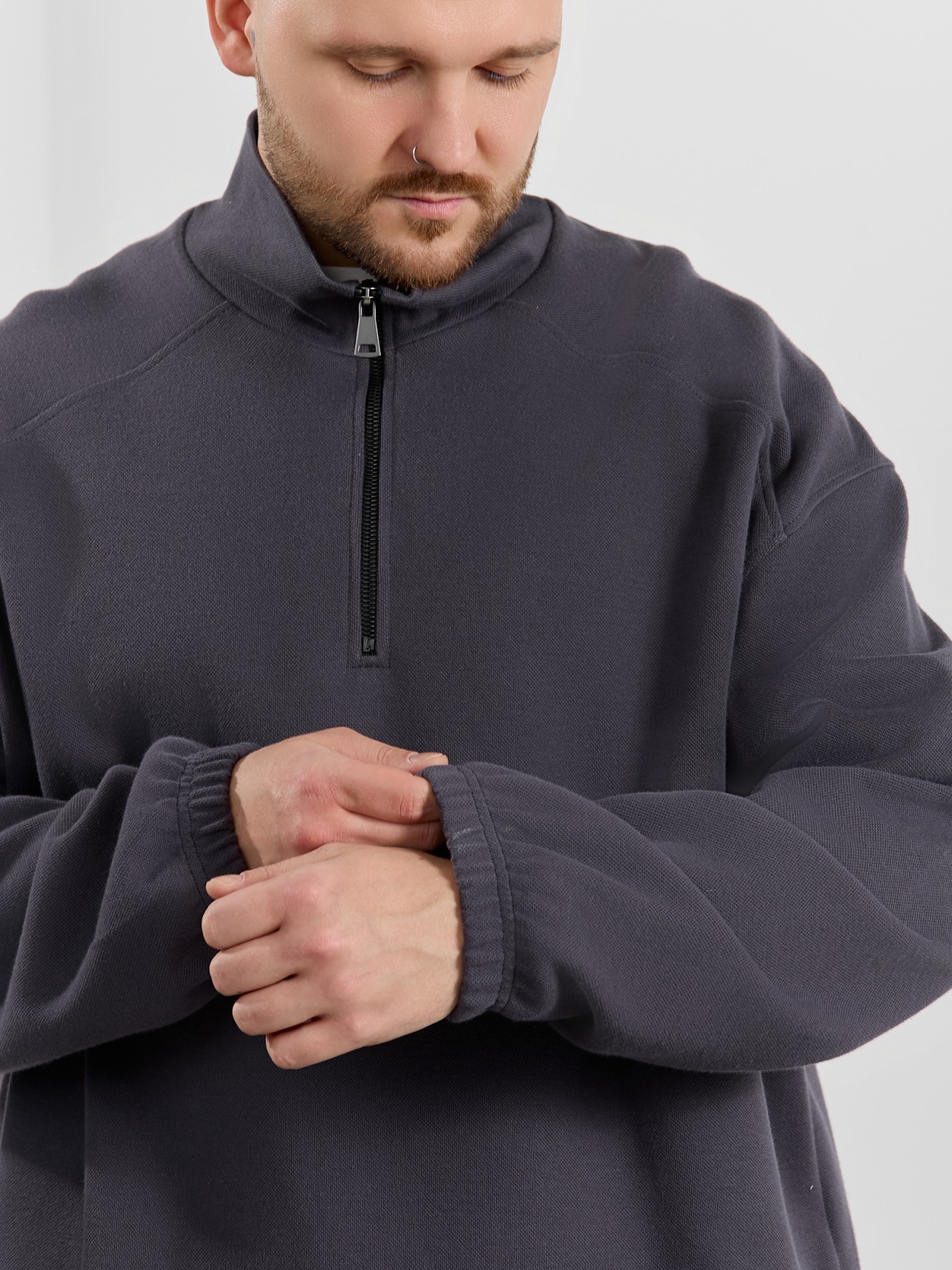Толстовка мужская из трикотажного полотна "интерлок-пике". Толстовка свободного покроя, с длинными втачными рукавами, заниженными проймами и воротником-стойкой. Полочка с кокетками, с неразъемной застежкой "молния", обработанной в рамке. Нижние срезы рукавов обработаны с эластичной тесьмой, нижний срез изделия - подгибкой, с эластичным шнуром и фиксатором для регулировки ширины изделия на этом участке.