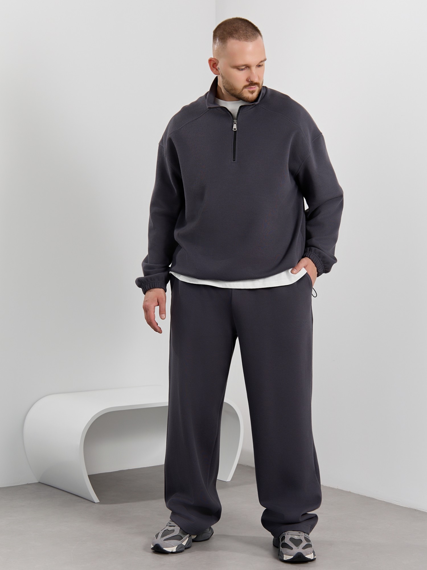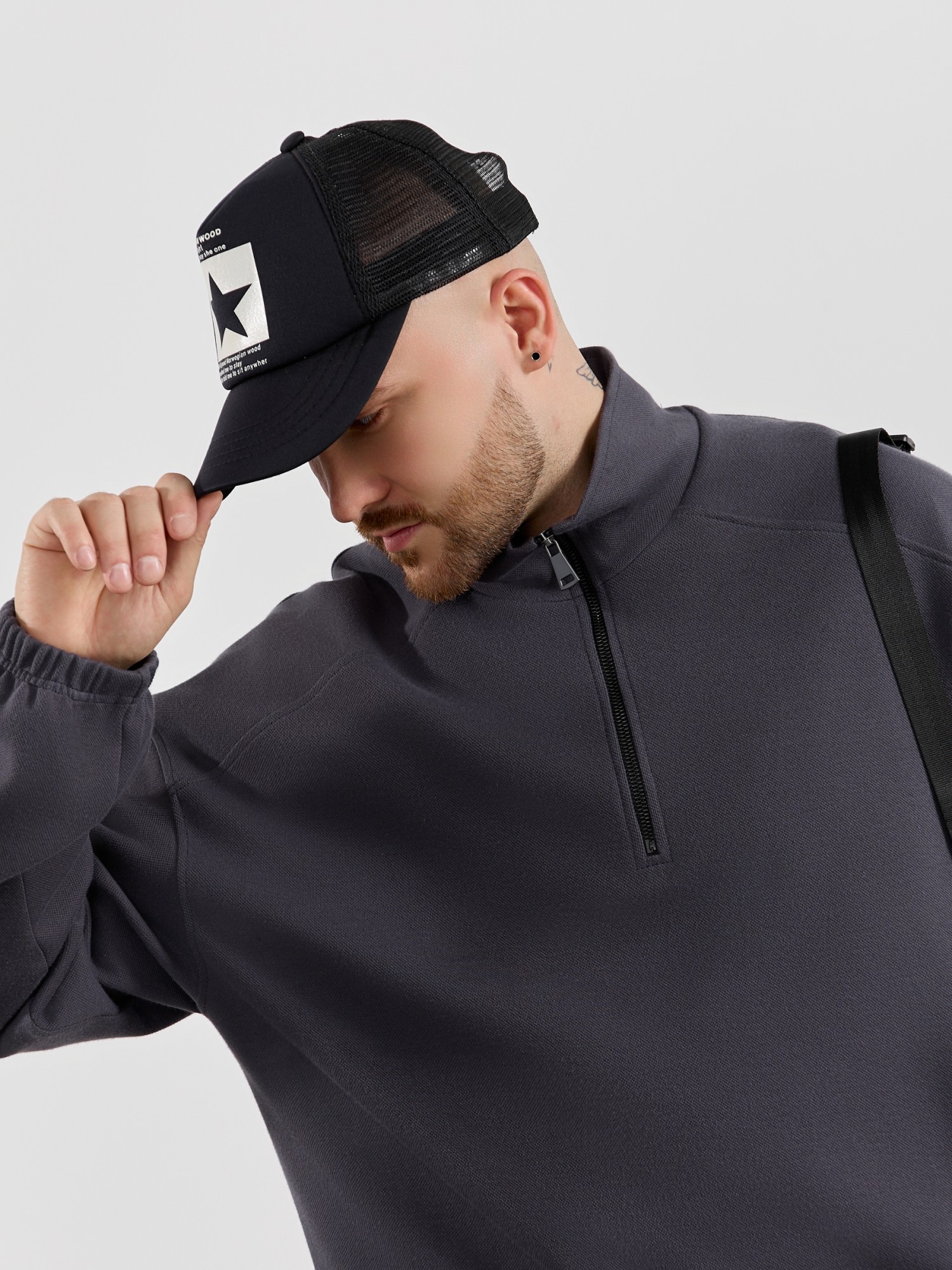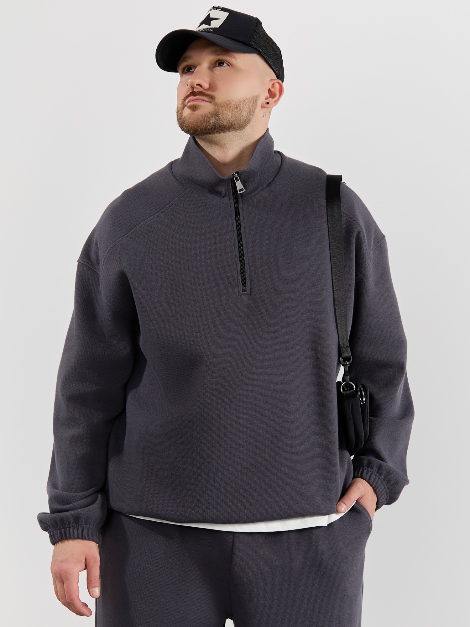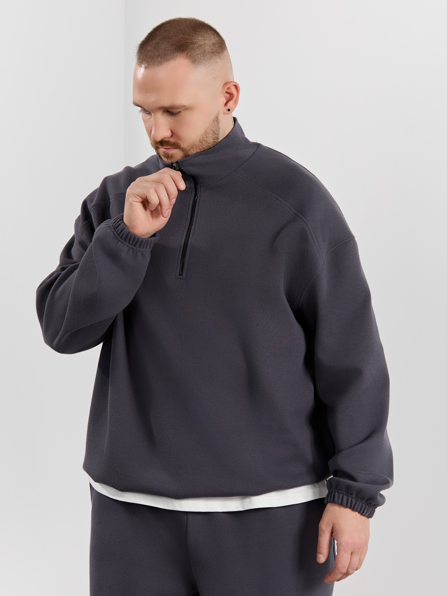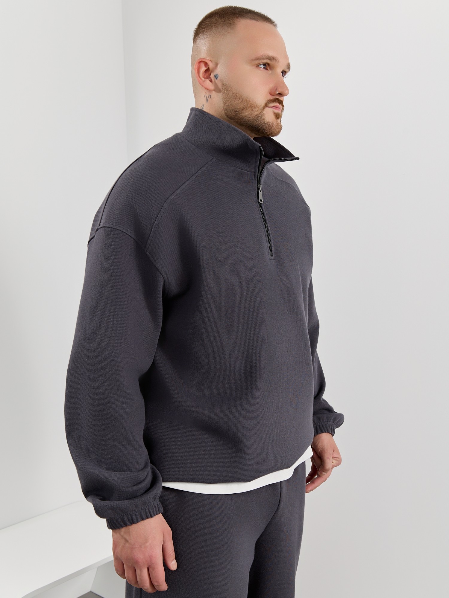 Толстовка мужская из трикотажного полотна "интерлок-пике". Толстовка свободного покроя, с длинными втачными рукавами, заниженными проймами и воротником-стойкой. Полочка с кокетками, с неразъемной застежкой "молния", обработанной в рамке. Нижние срезы рукавов обработаны с эластичной тесьмой, нижний срез изделия - подгибкой, с эластичным шнуром и фиксатором для регулировки ширины изделия на этом участке.