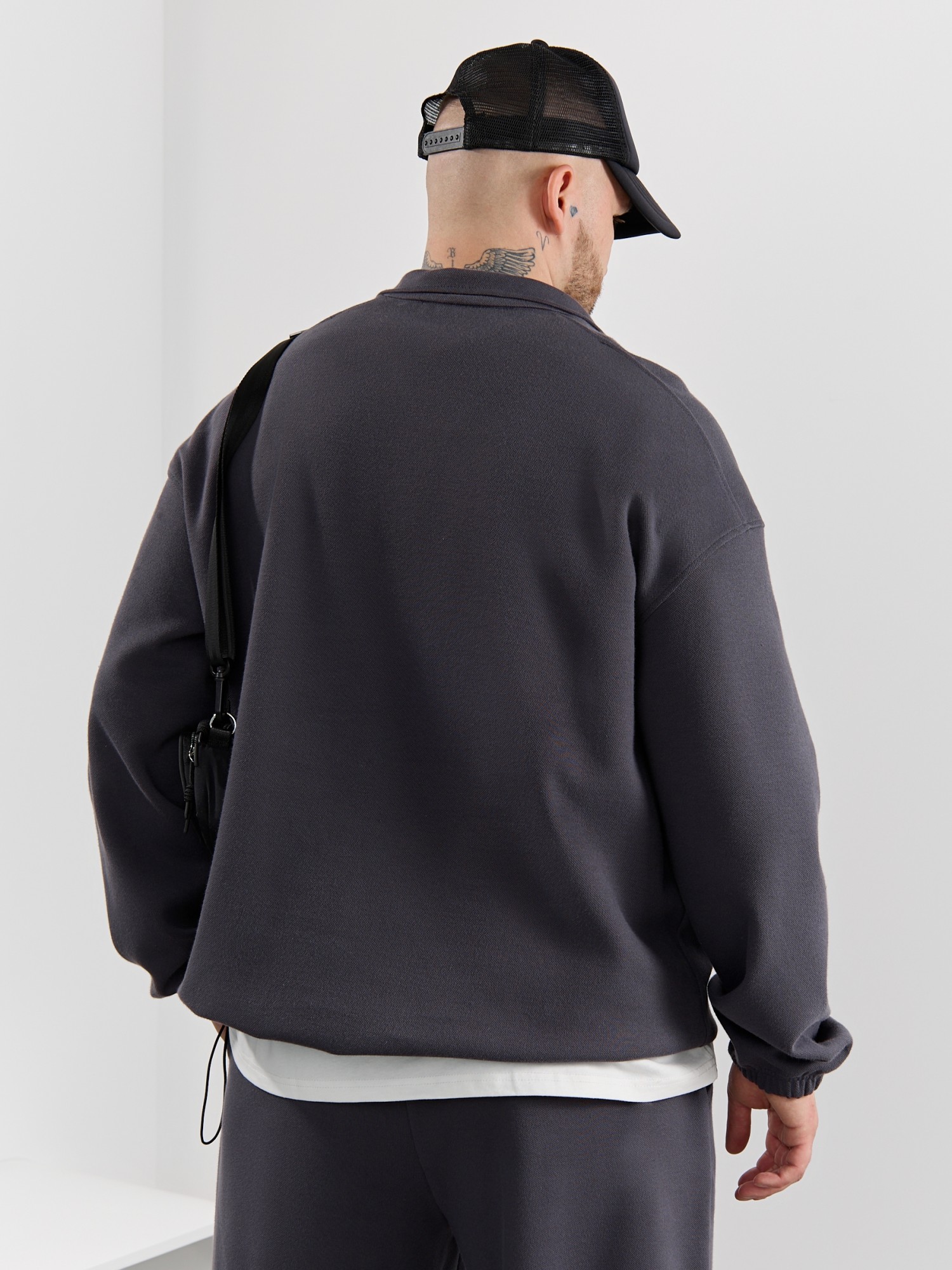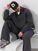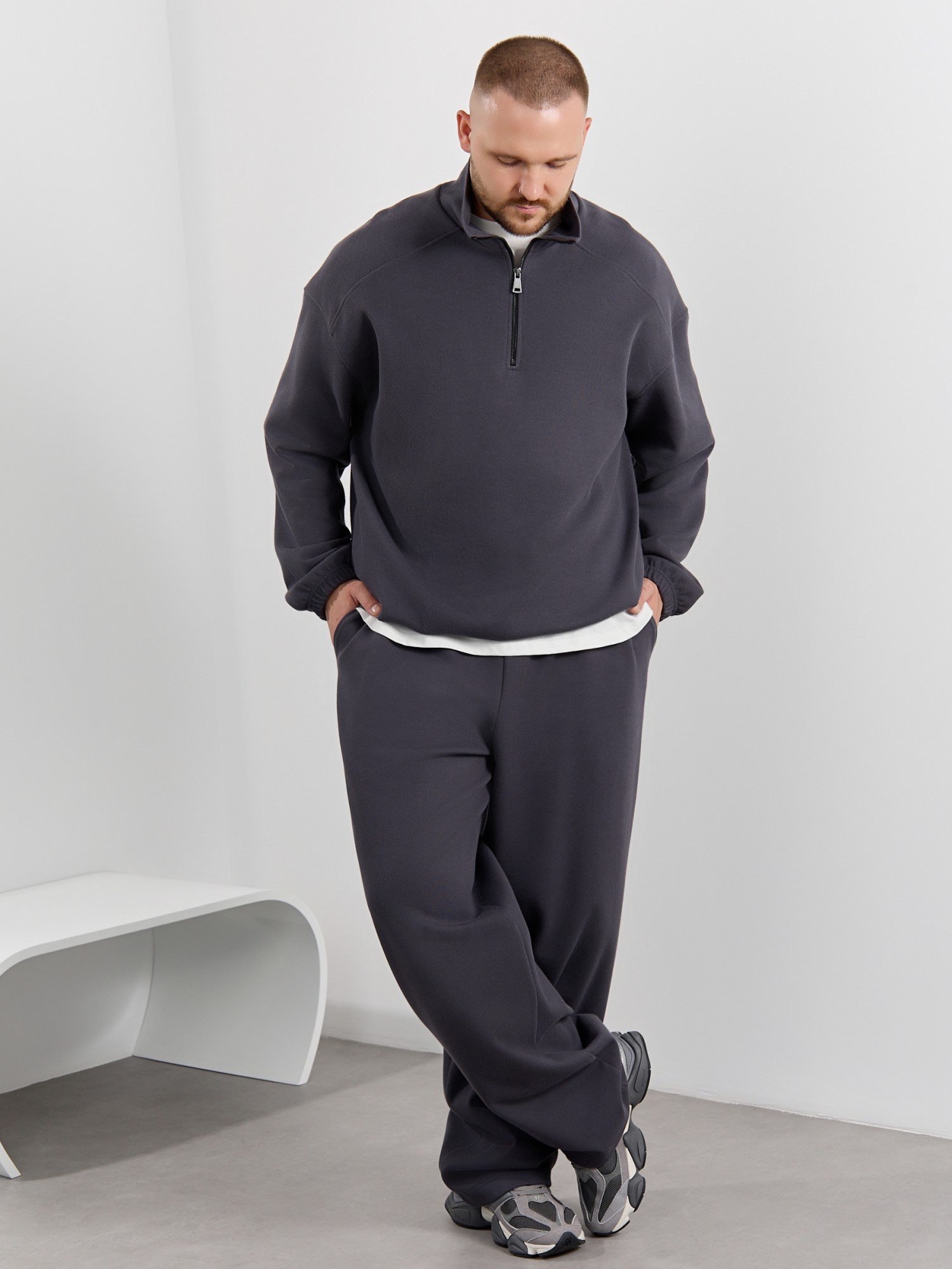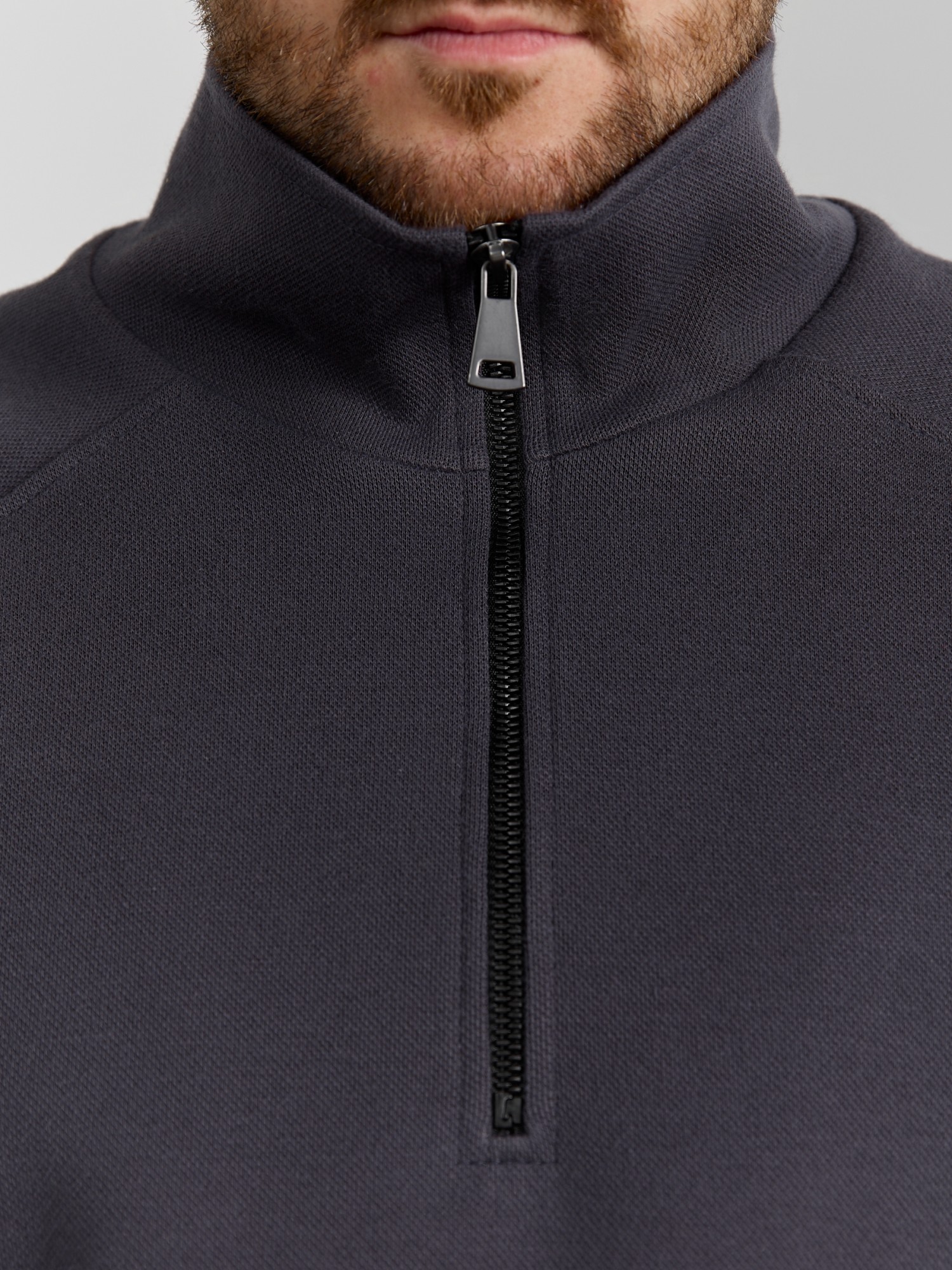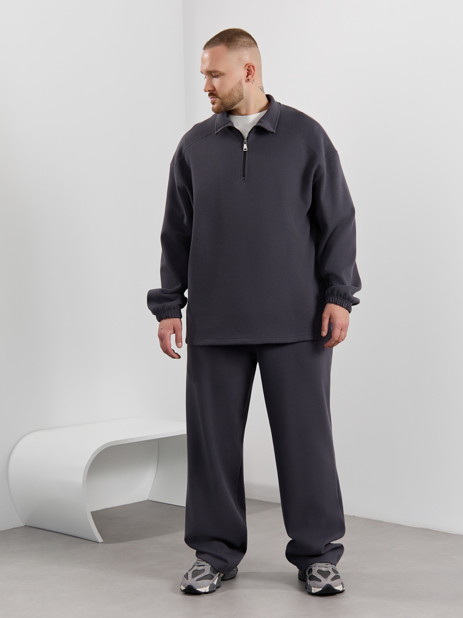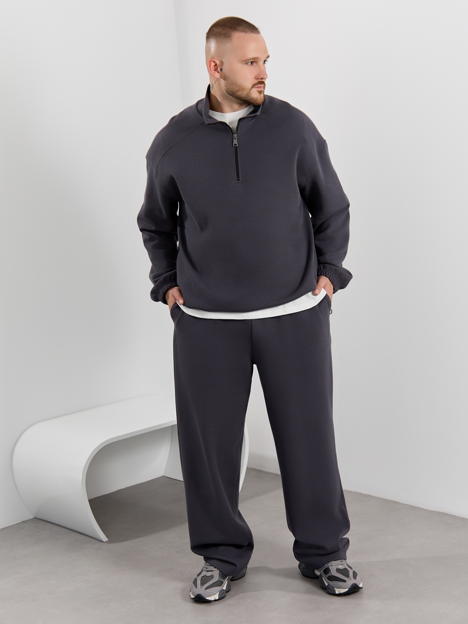 Толстовка мужская из трикотажного полотна "интерлок-пике". Толстовка свободного покроя, с длинными втачными рукавами, заниженными проймами и воротником-стойкой. Полочка с кокетками, с неразъемной застежкой "молния", обработанной в рамке. Нижние срезы рукавов обработаны с эластичной тесьмой, нижний срез изделия - подгибкой, с эластичным шнуром и фиксатором для регулировки ширины изделия на этом участке.