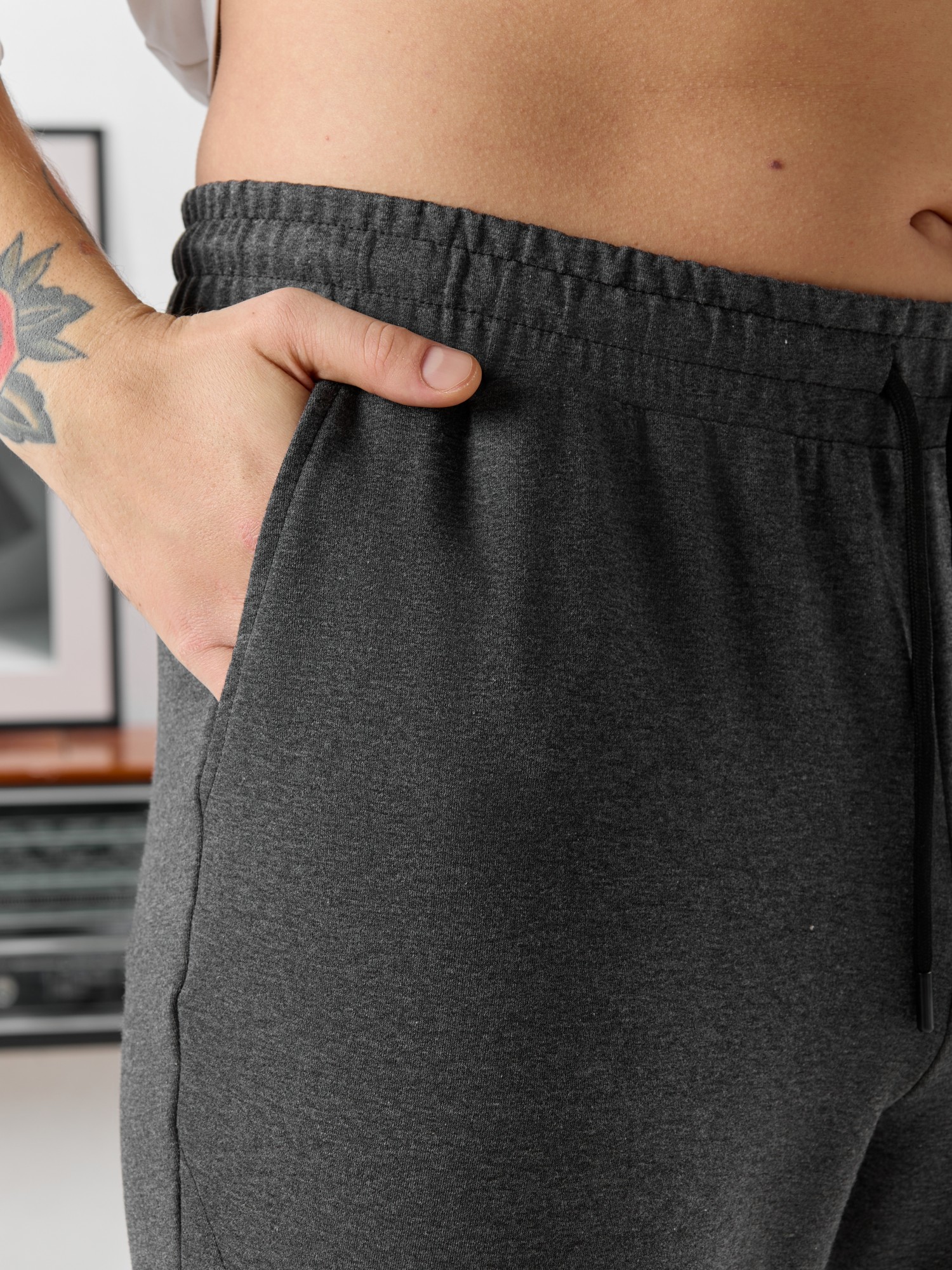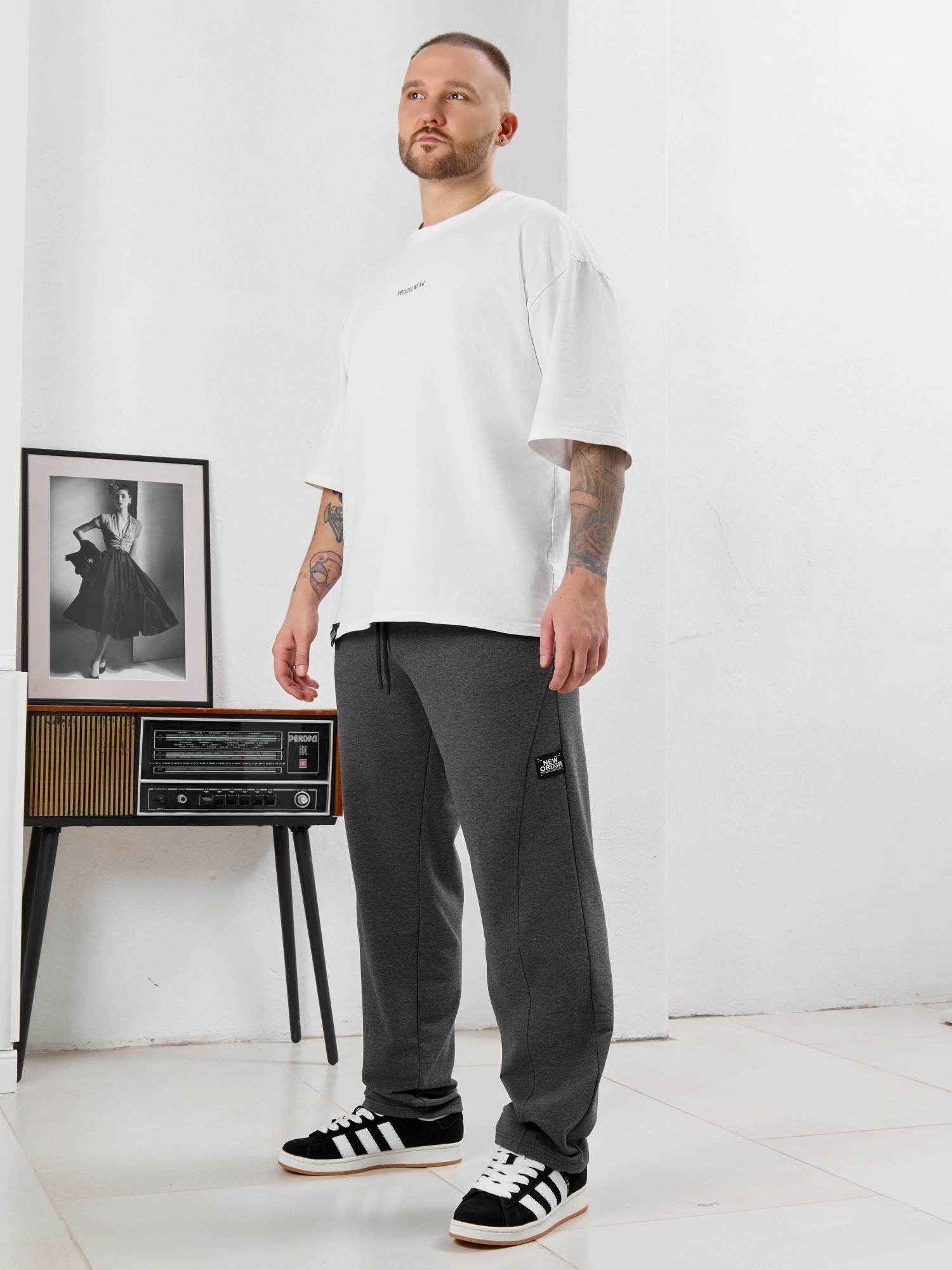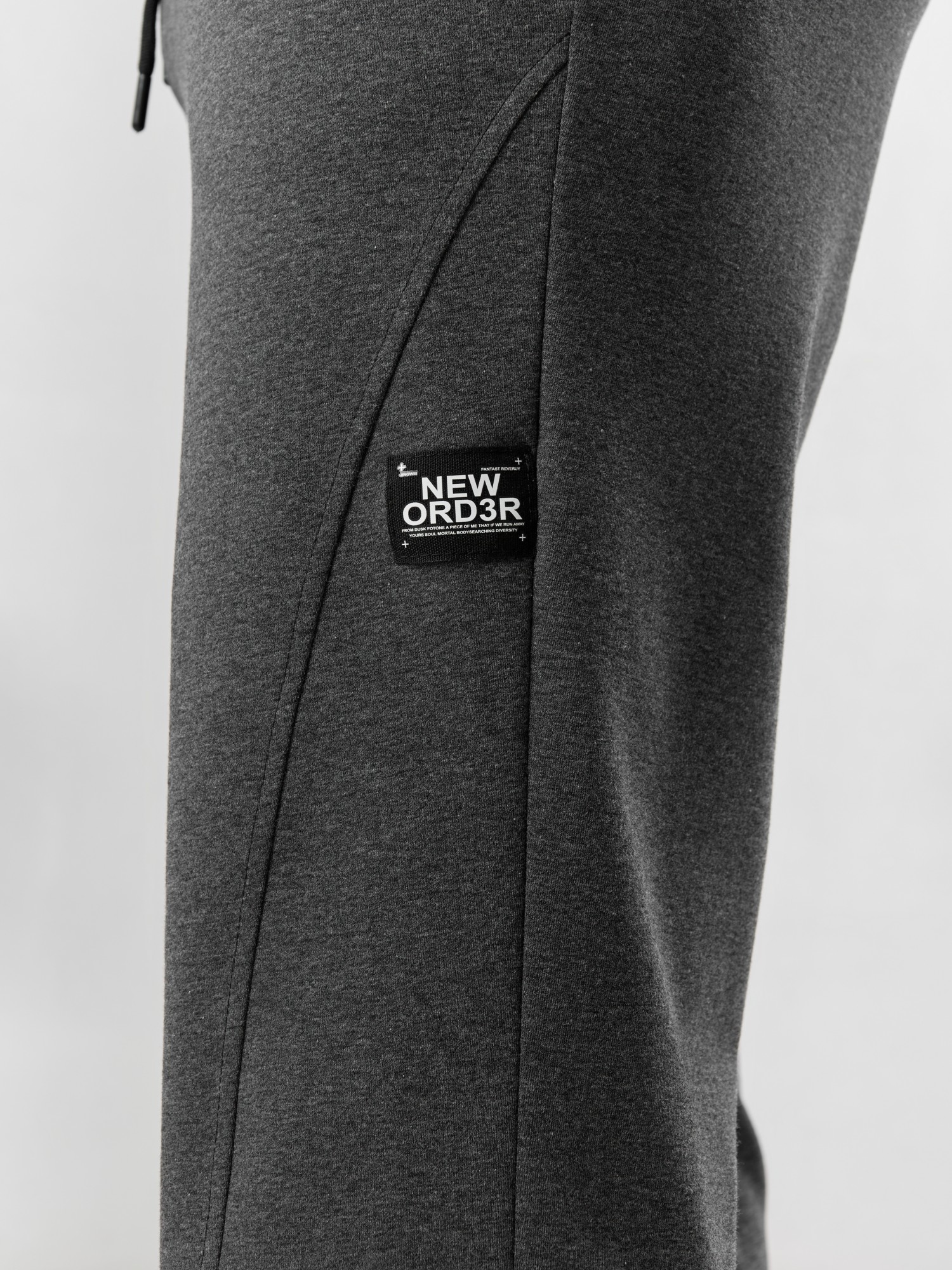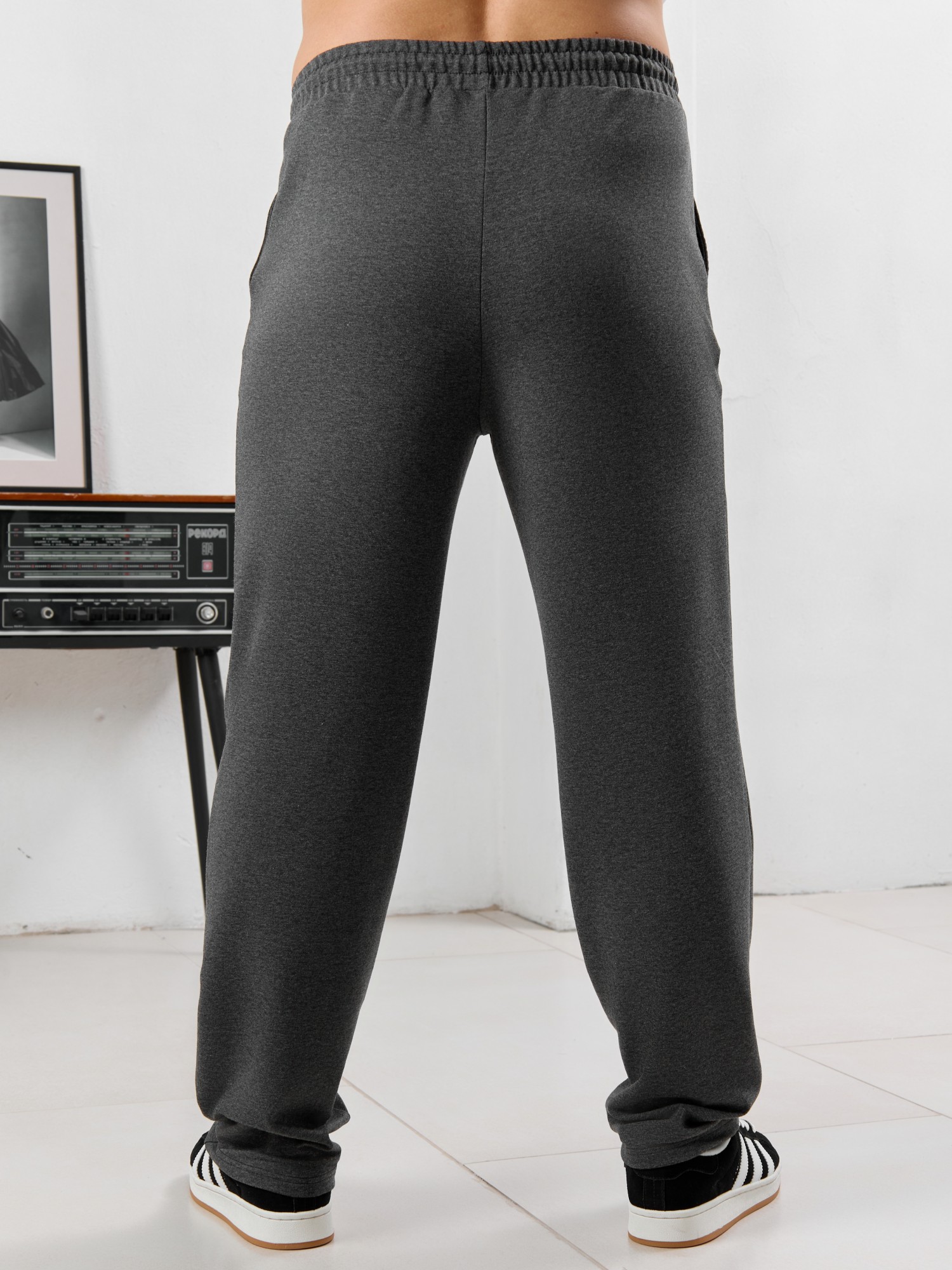 Брюки мужские прямого силуэта, из трикотажного полотна «футер двунитка с лайкрой». Модель с рельефными швами по передним деталям, декоративной «нашивкой», с карманами в боковых швах, на притачном поясе с отстроченной эластичной тесьмой и шнуром для регулирования степени прилегания изделия по линии талии, продетым через две обметанные петли в центре пояса.