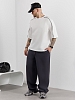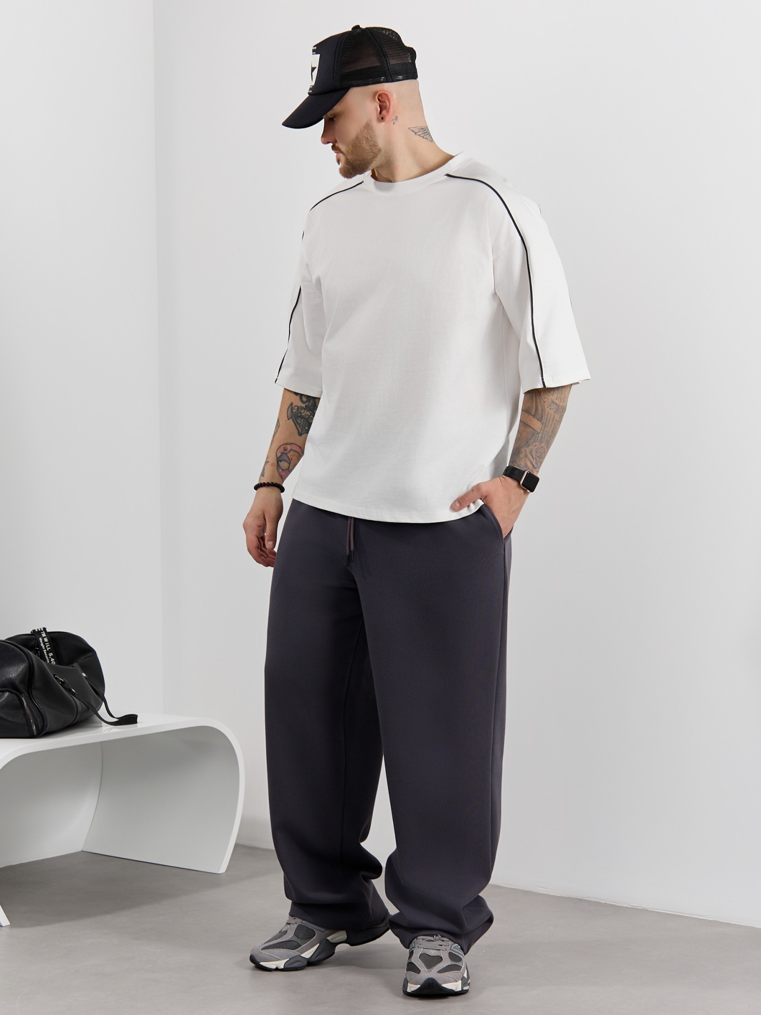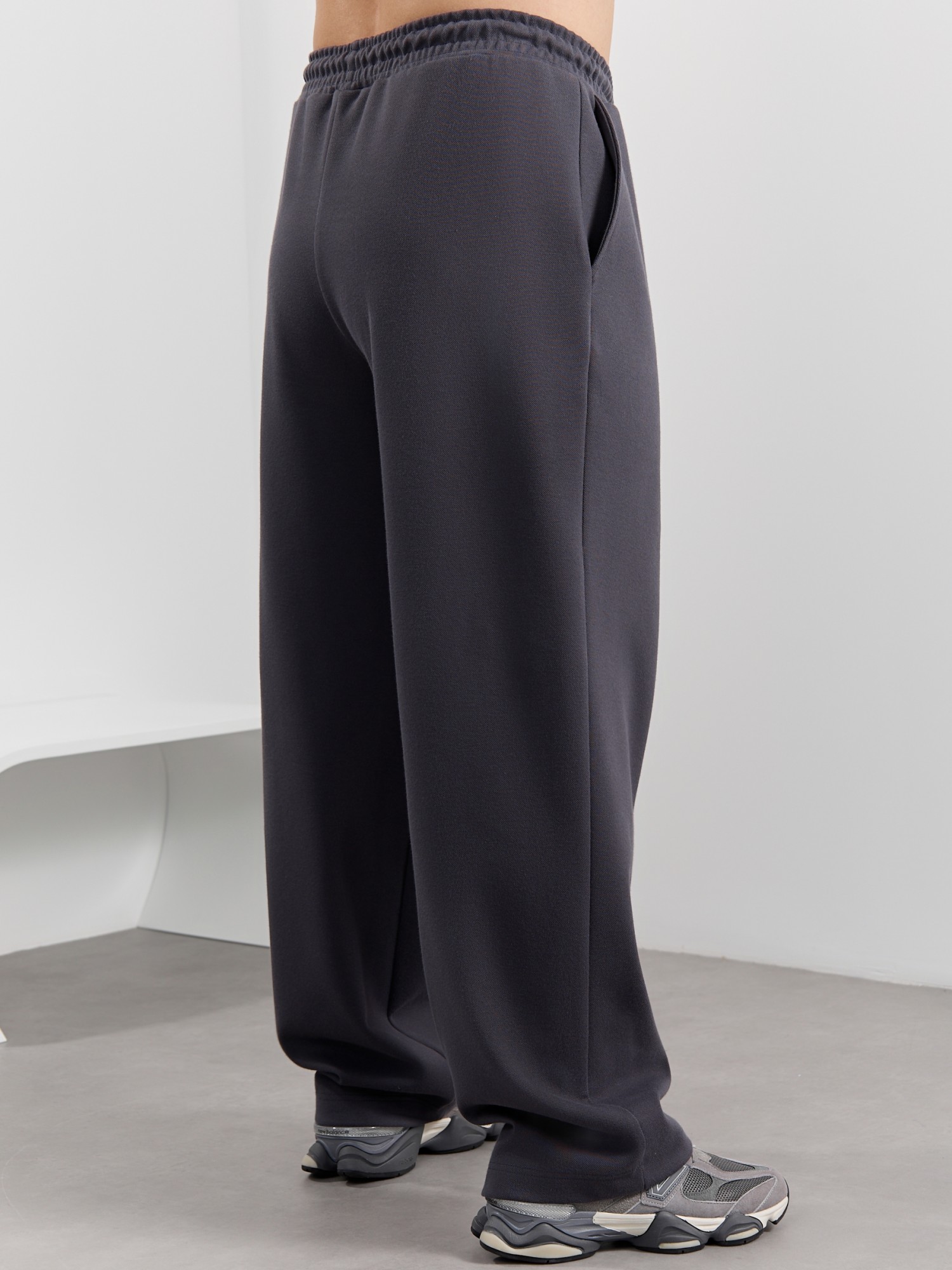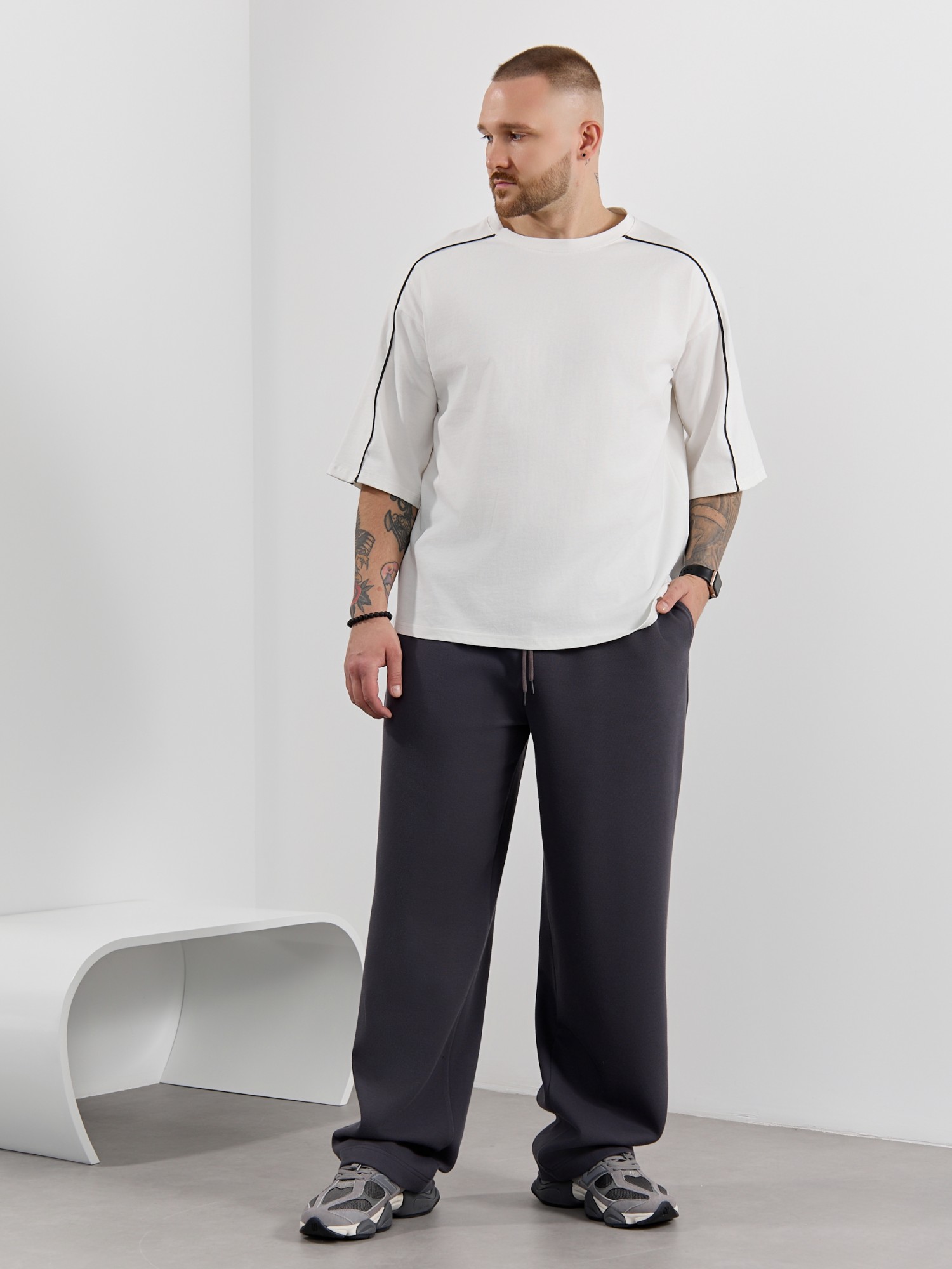 Брюки мужские из трикотажного полотна "интерлок-пике", на притачном поясе с эластичной тесьмой внутри, с карманами в боковых швах. Низ брюк прямой с подгибкой. Для регулирования степени прилегания изделия по линии талии предусмотрен декоративный шнурок, вставленный в пояс и продетый через две обметанные петли в центре.