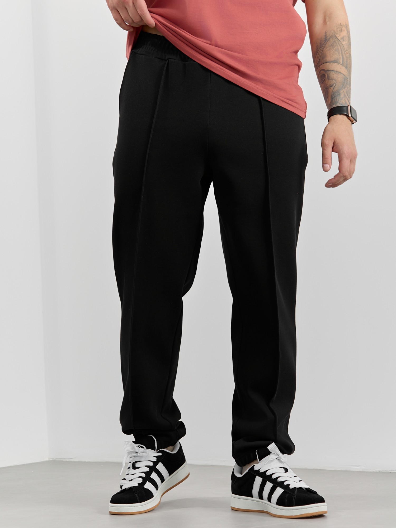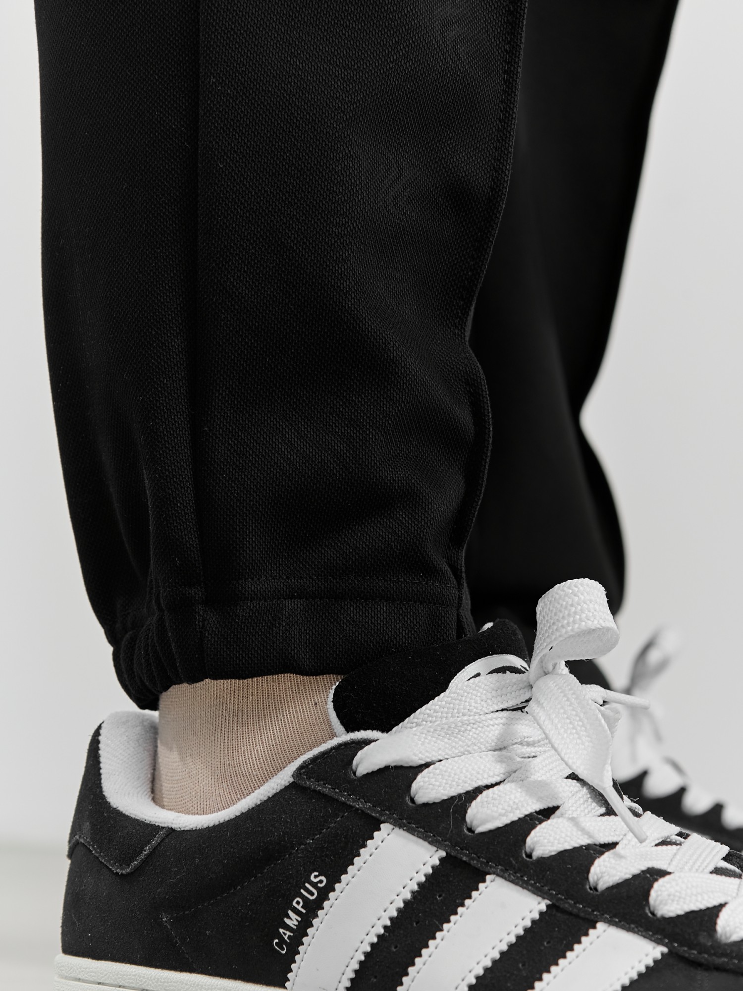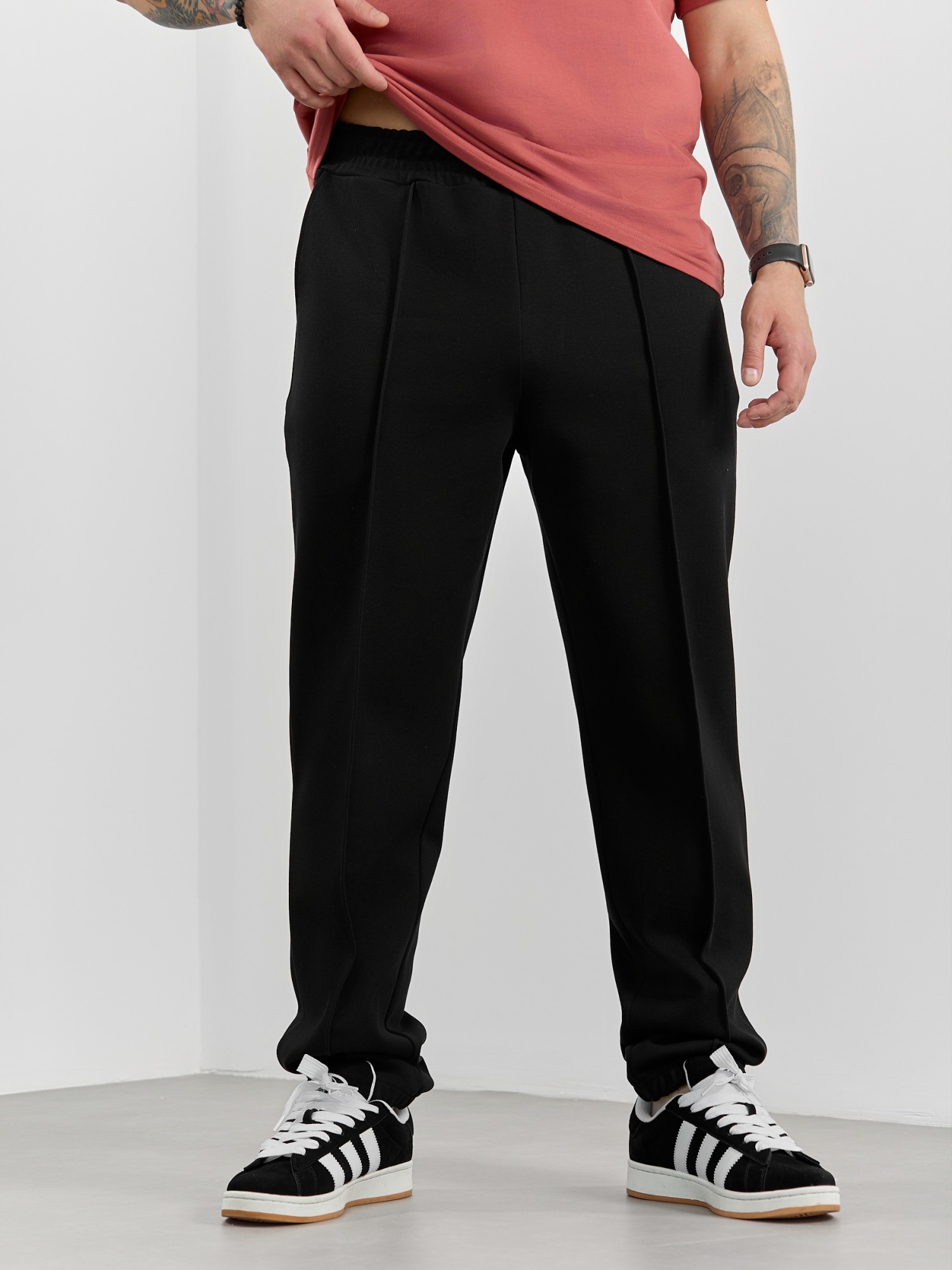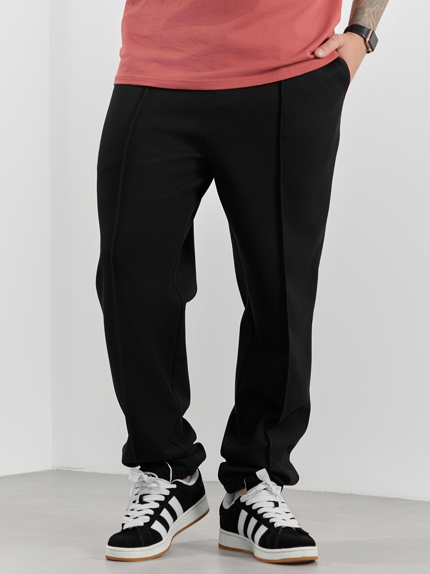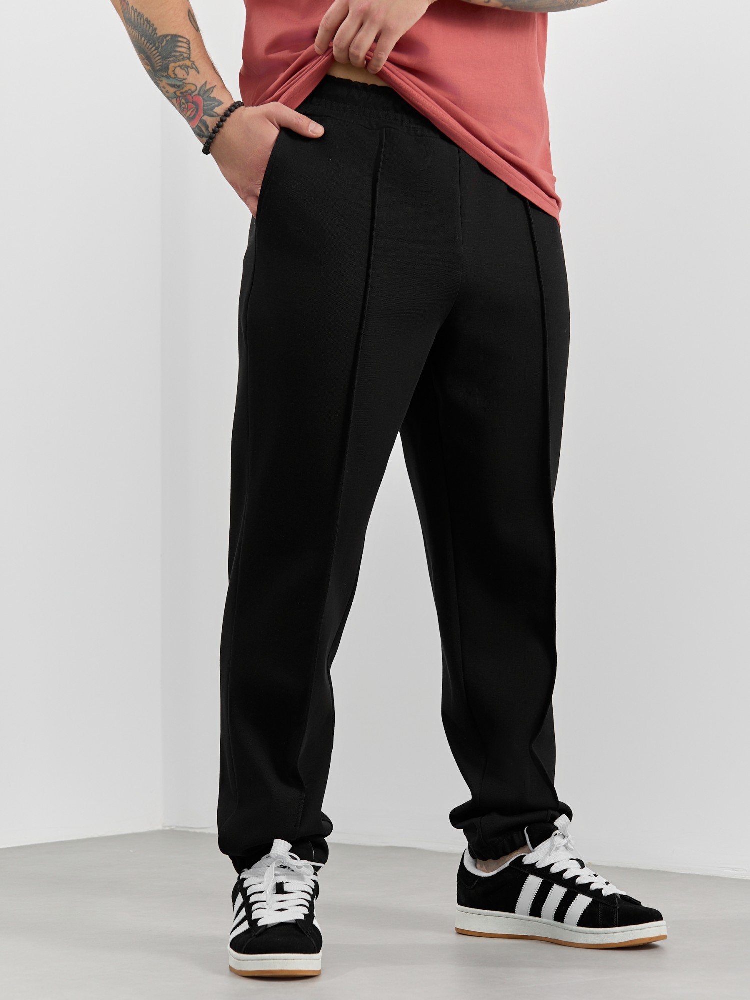 Брюки мужские из трикотажного полотна "интерлок-пике", на притачном поясе с эластичной тесьмой внутри, с карманами в боковых швах. По центру передних половинок расположены стрелки, закрепленные отделочной строчкой. Нижние срезы обработаны подгибкой с эластичной тесьмой. Для регулирования степени прилегания изделия по линии талии предусмотрен декоративный шнурок, вставленный в пояс и продетый через две обметанные петли в центре.