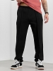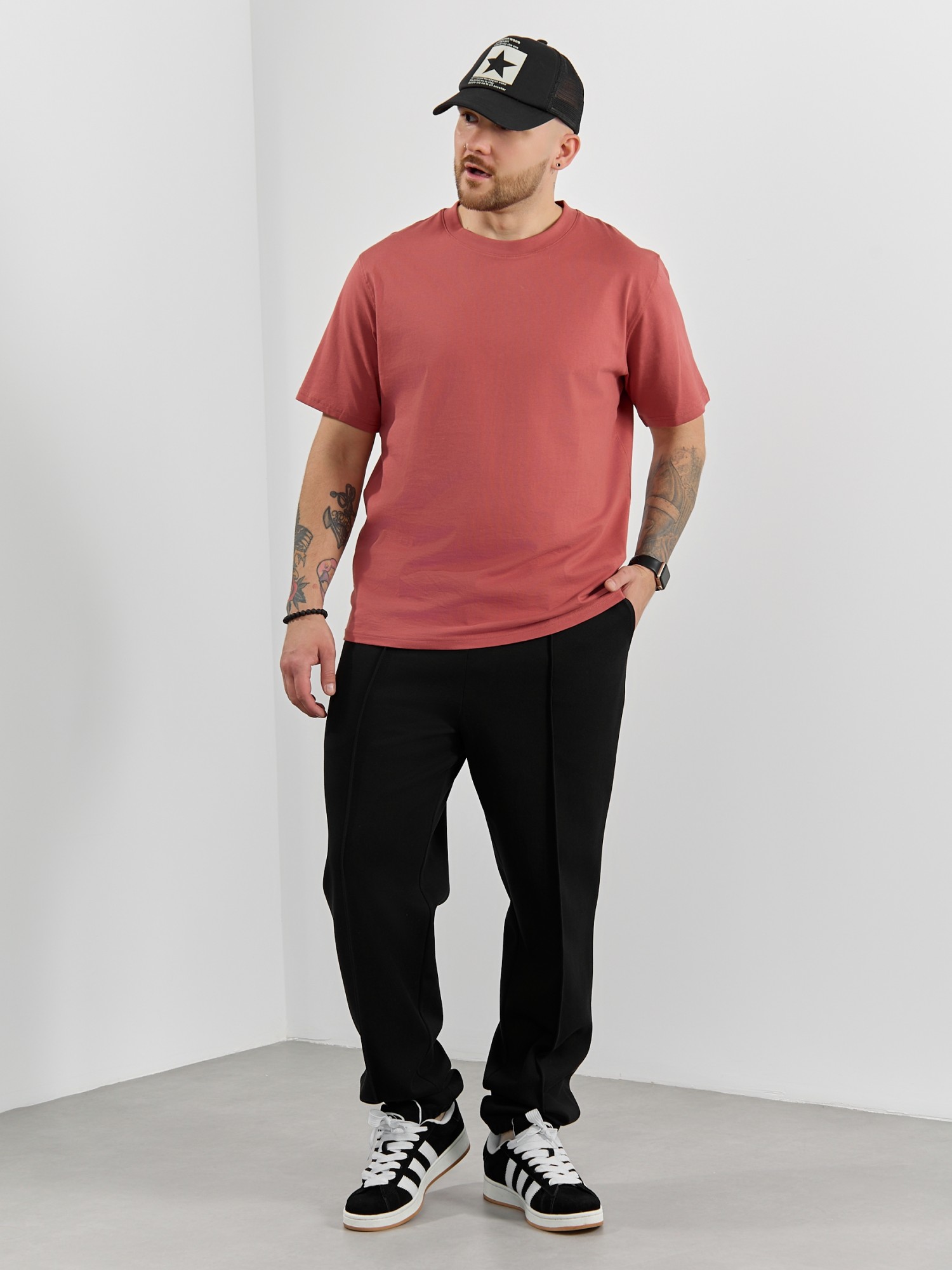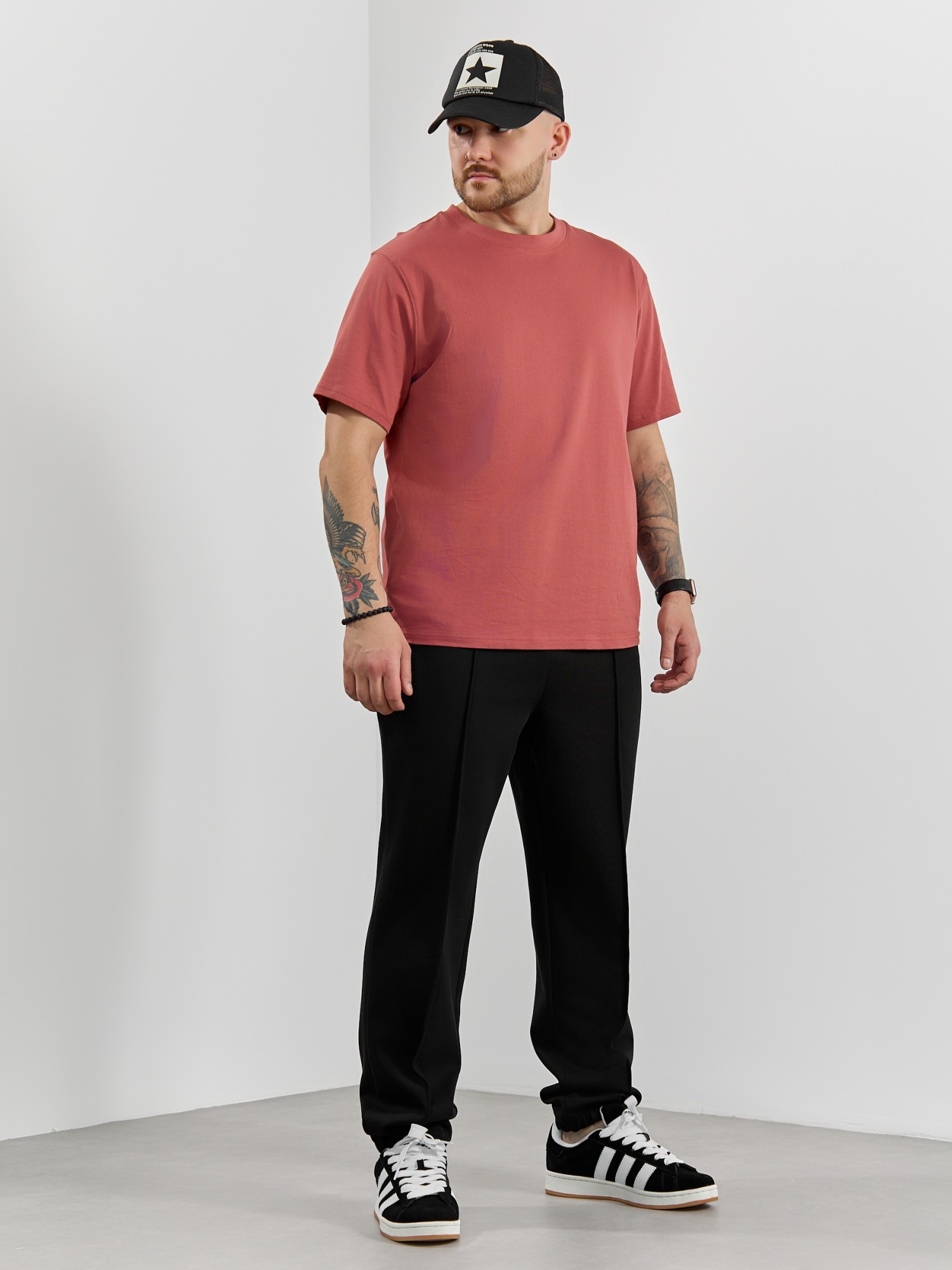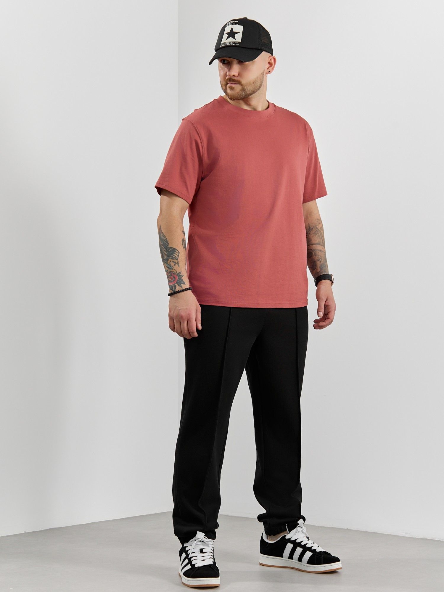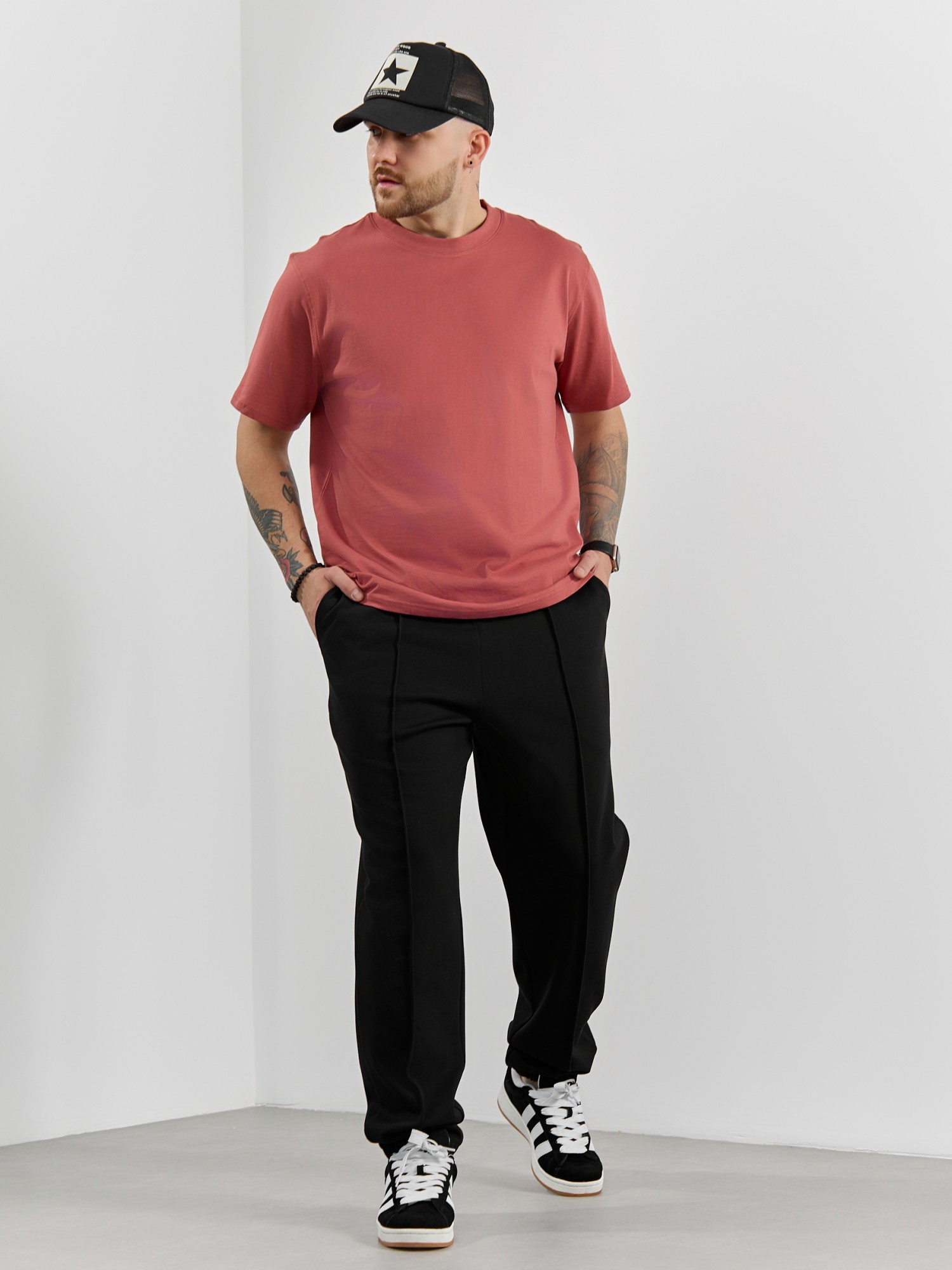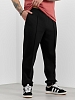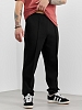 Брюки мужские из трикотажного полотна "интерлок-пике", на притачном поясе с эластичной тесьмой внутри, с карманами в боковых швах. По центру передних половинок расположены стрелки, закрепленные отделочной строчкой. Нижние срезы обработаны подгибкой с эластичной тесьмой. Для регулирования степени прилегания изделия по линии талии предусмотрен декоративный шнурок, вставленный в пояс и продетый через две обметанные петли в центре.