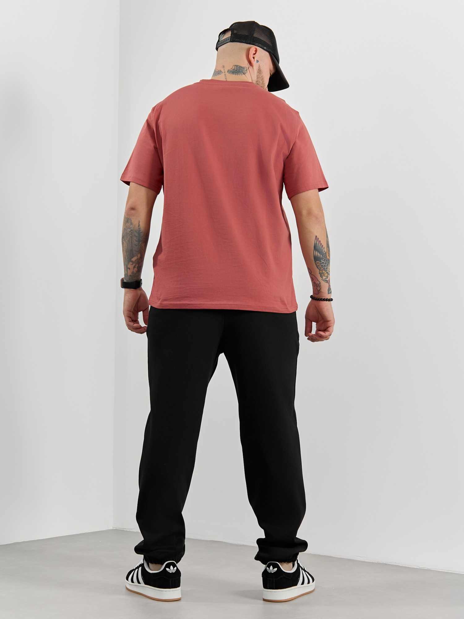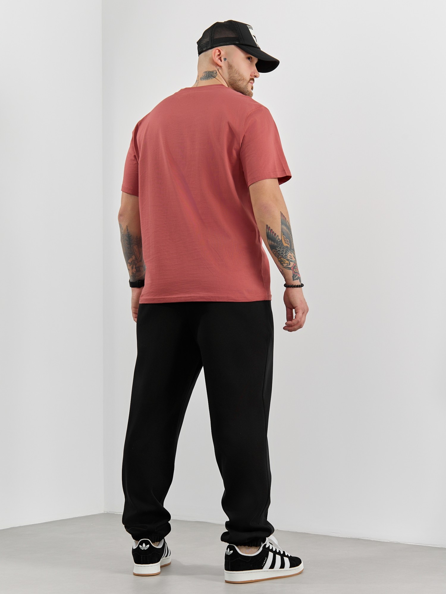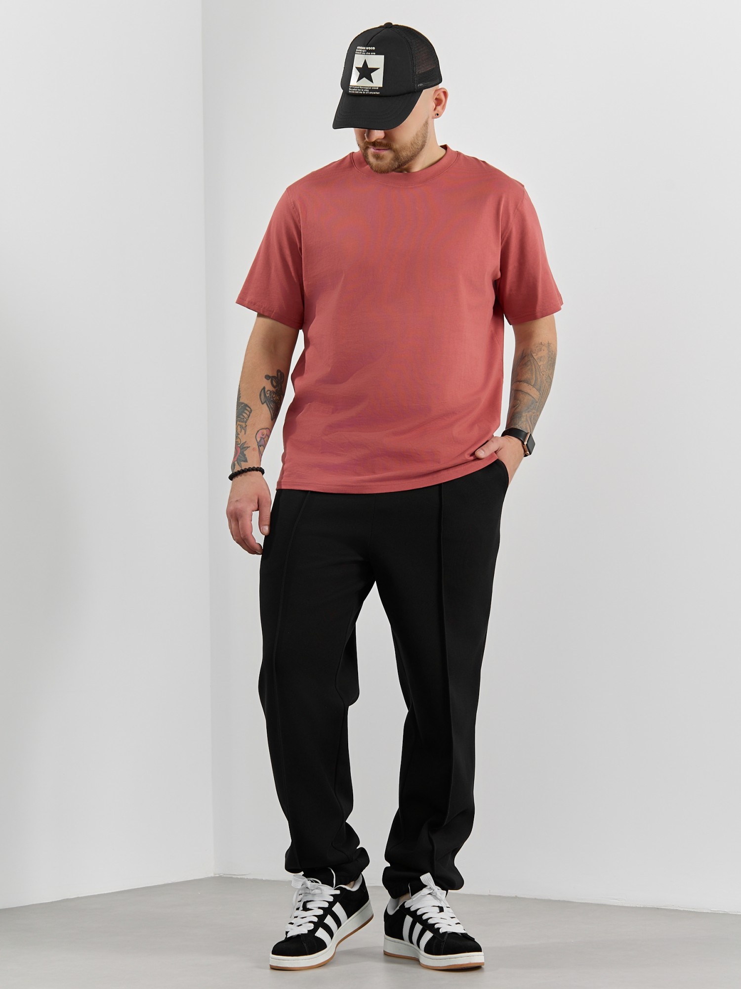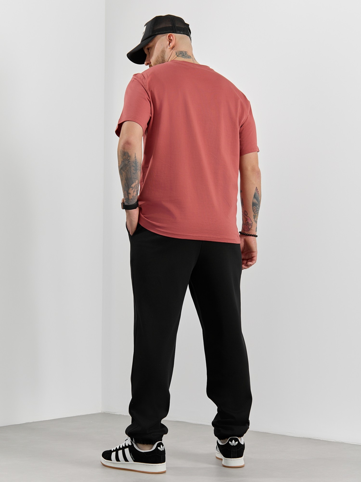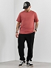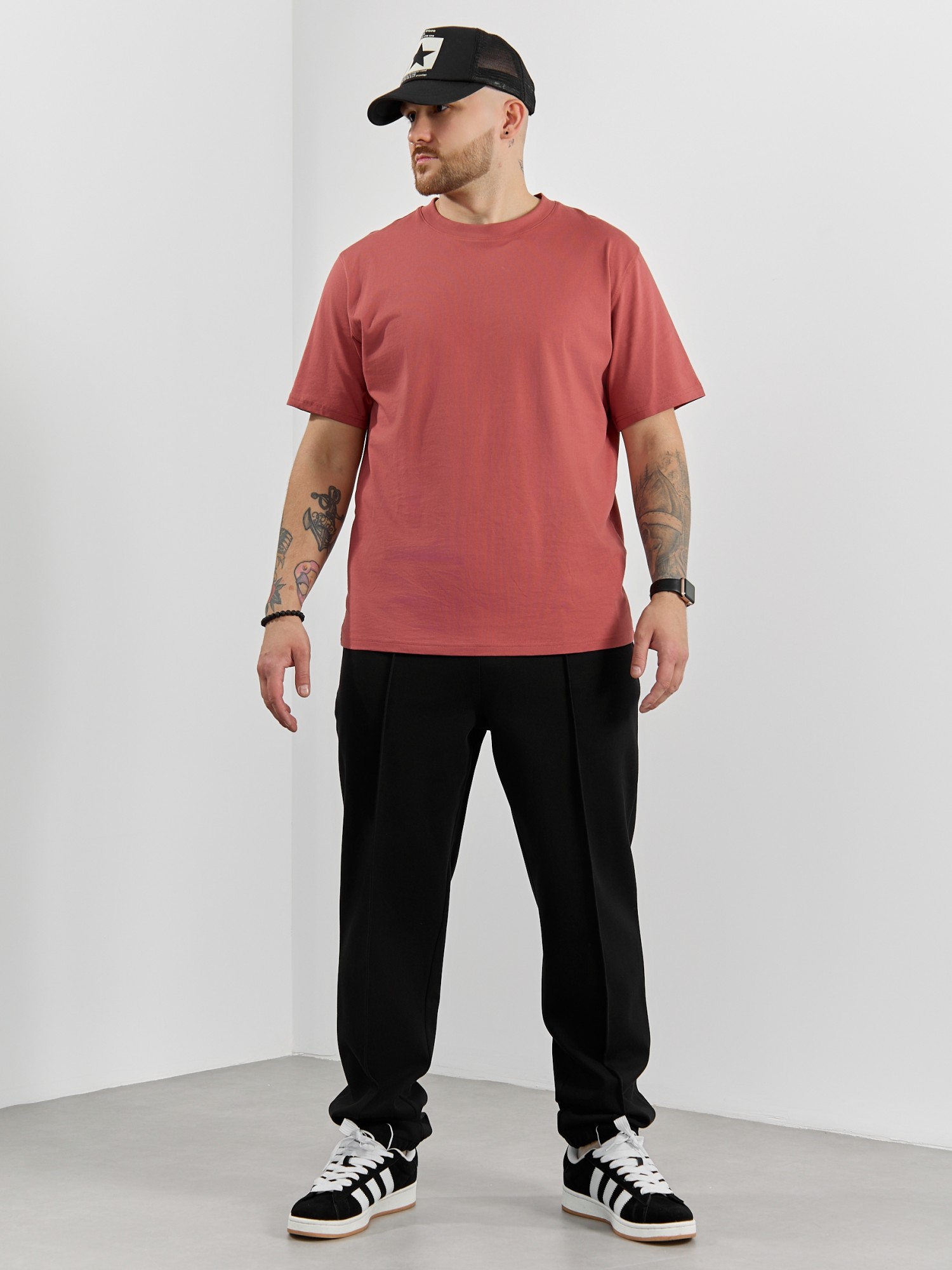 Брюки мужские из трикотажного полотна "интерлок-пике", на притачном поясе с эластичной тесьмой внутри, с карманами в боковых швах. По центру передних половинок расположены стрелки, закрепленные отделочной строчкой. Нижние срезы обработаны подгибкой с эластичной тесьмой. Для регулирования степени прилегания изделия по линии талии предусмотрен декоративный шнурок, вставленный в пояс и продетый через две обметанные петли в центре.