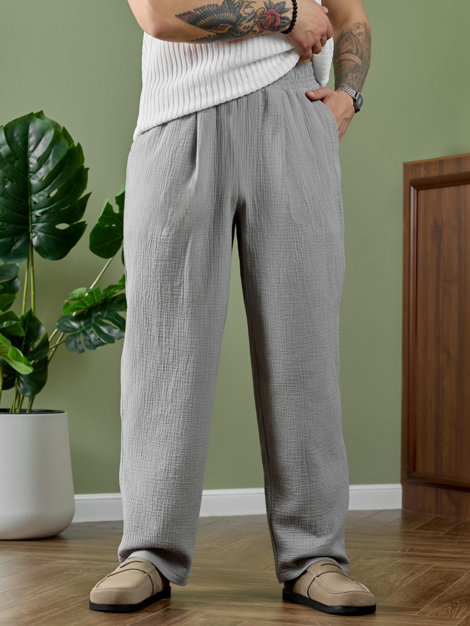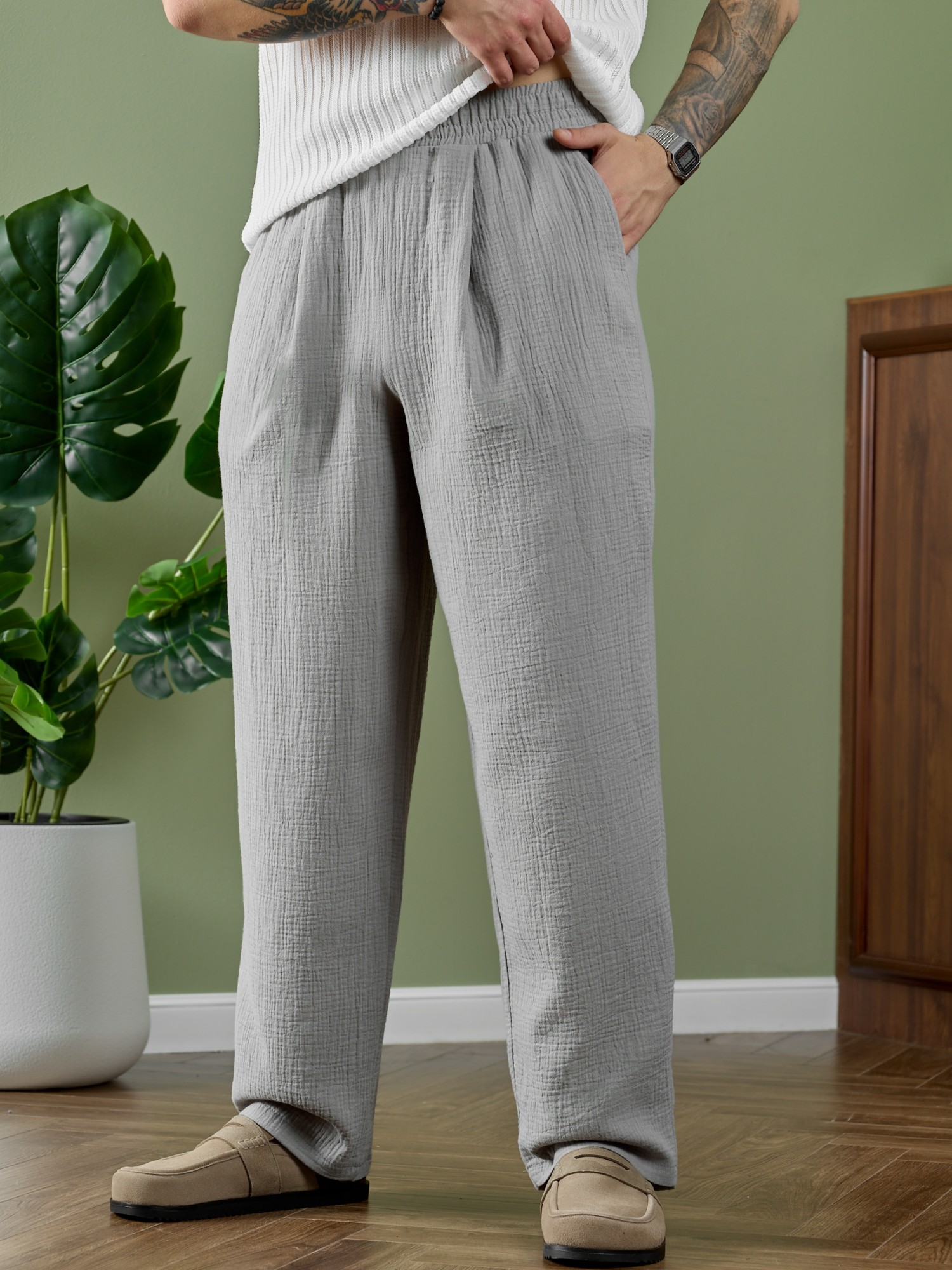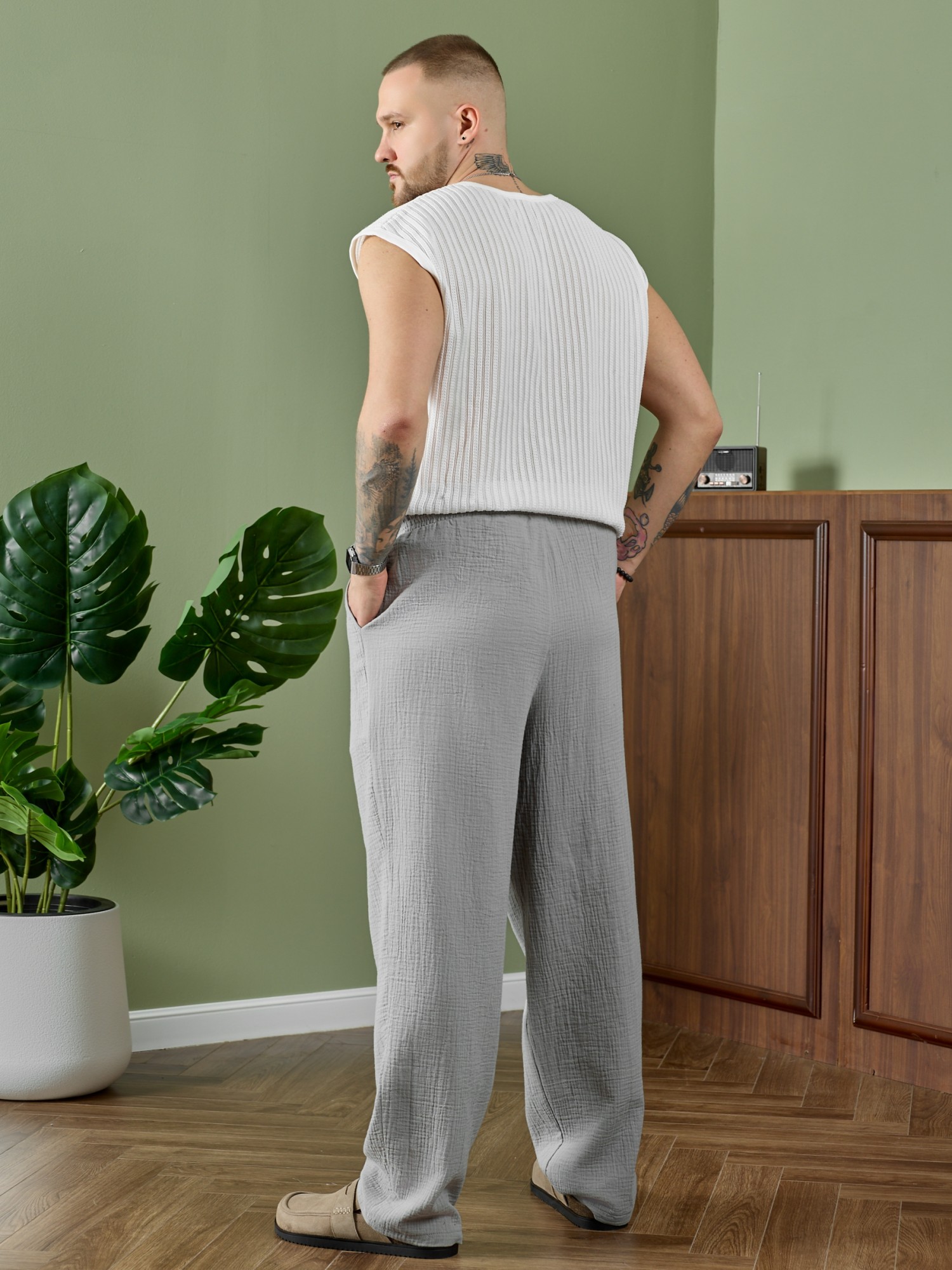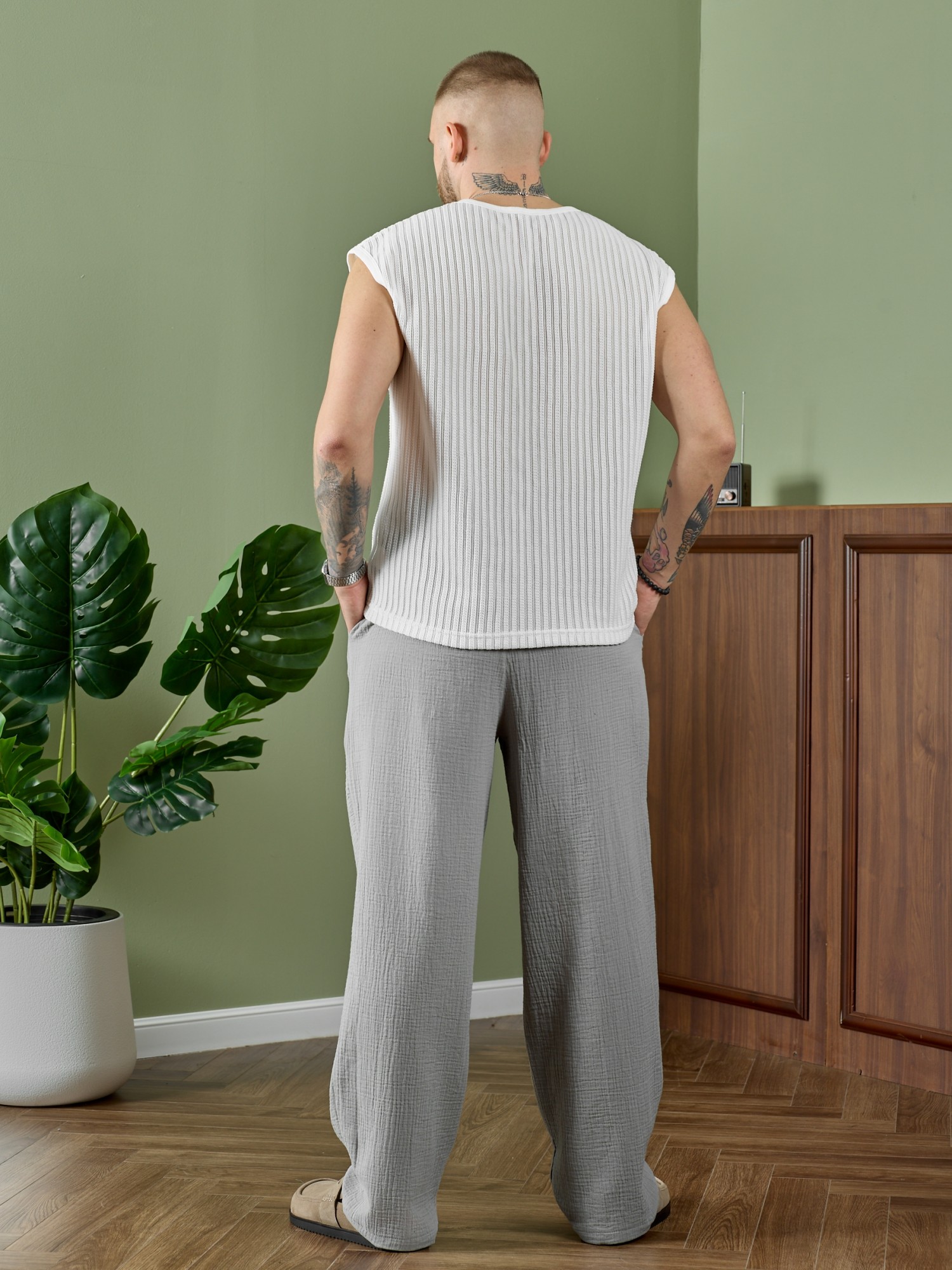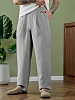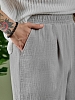 Брюки мужские из фактурного гладкокрашеного полотна на притачном поясе с эластичной тесьмой внутри , с карманами в боковых швах. На передних половинах брюк в шве притачивания пояса обработаны складки-защипы по две с каждой стороны. Нижние срезы брюк обработаны подгибкой.