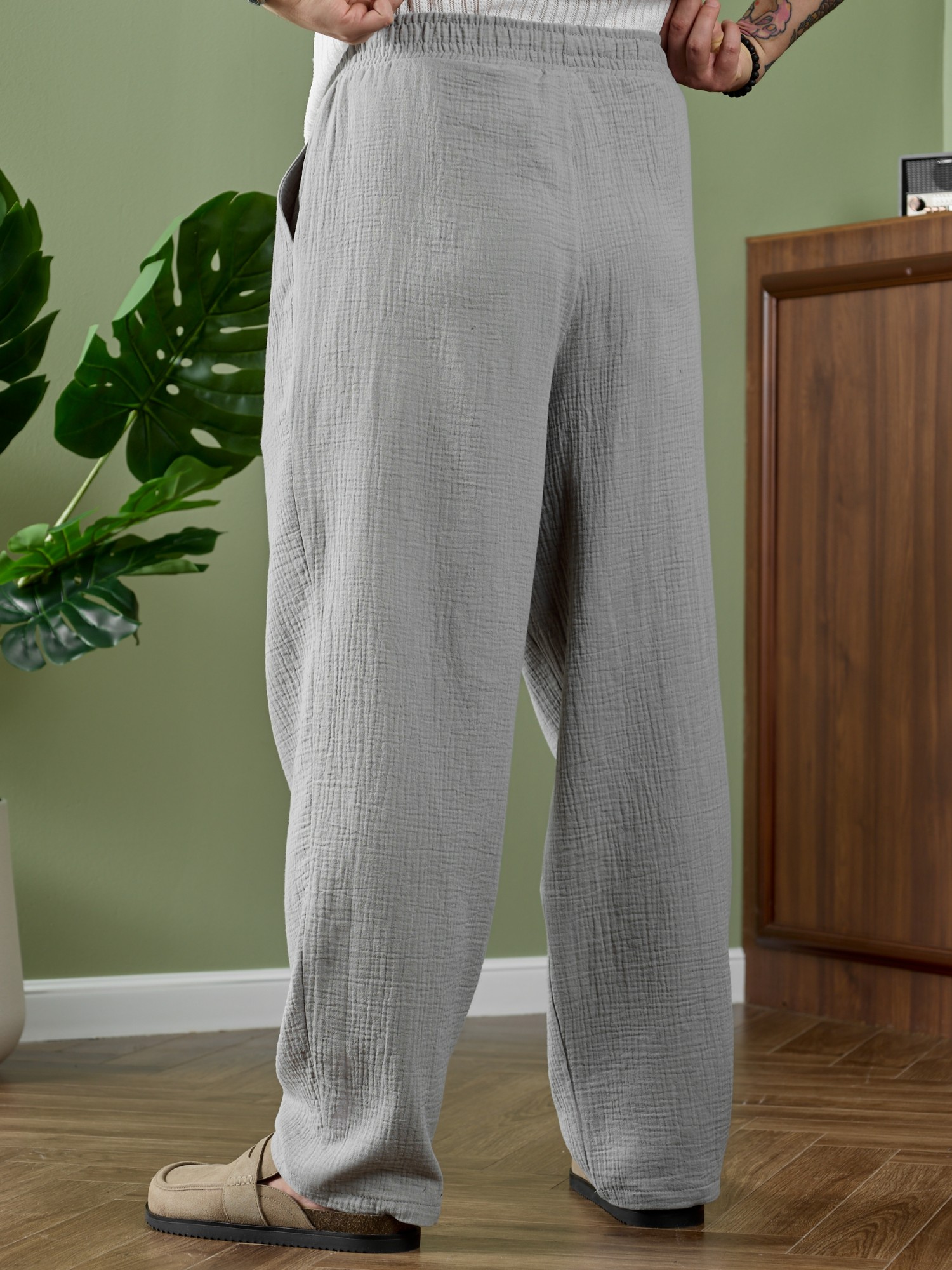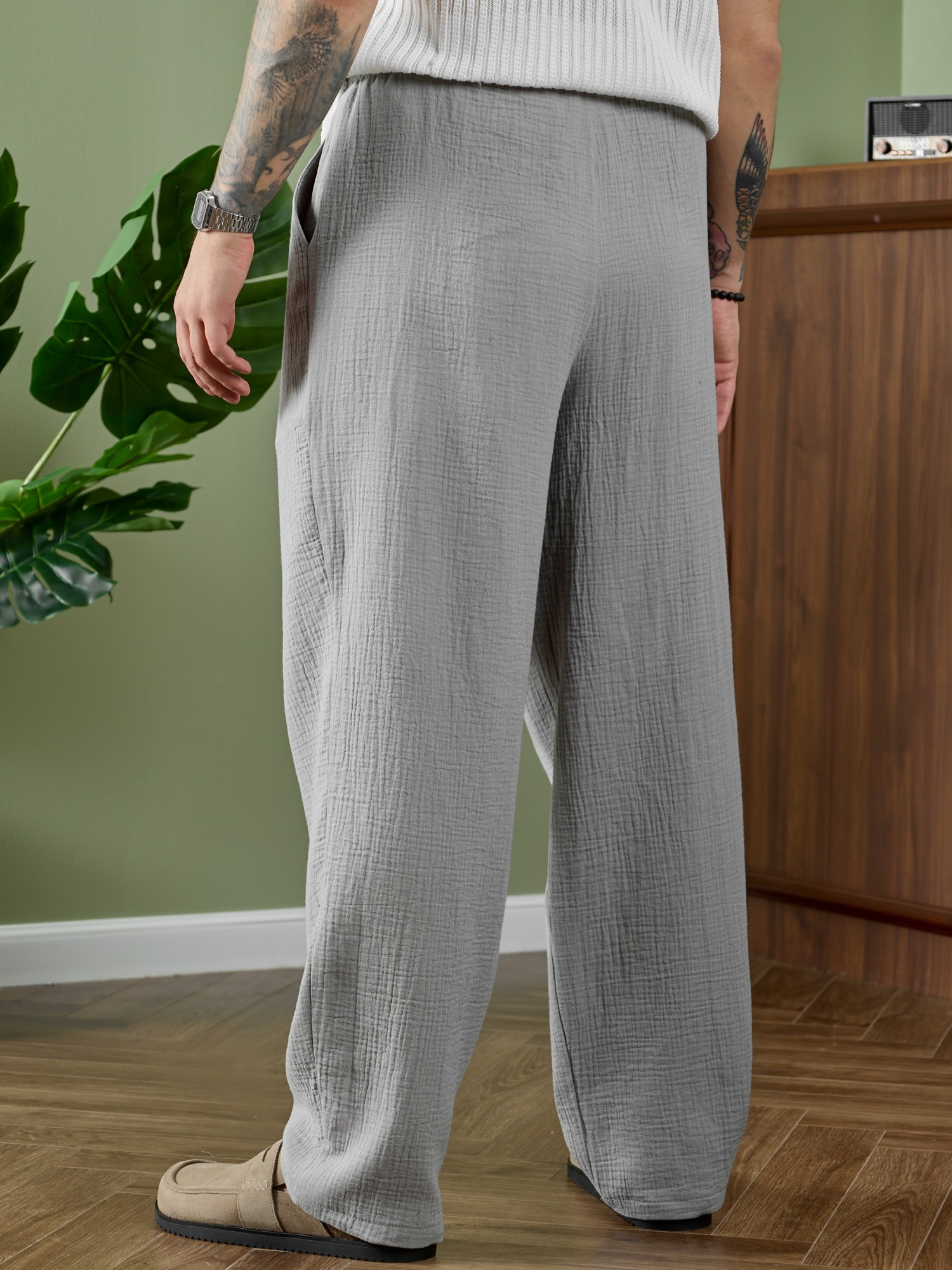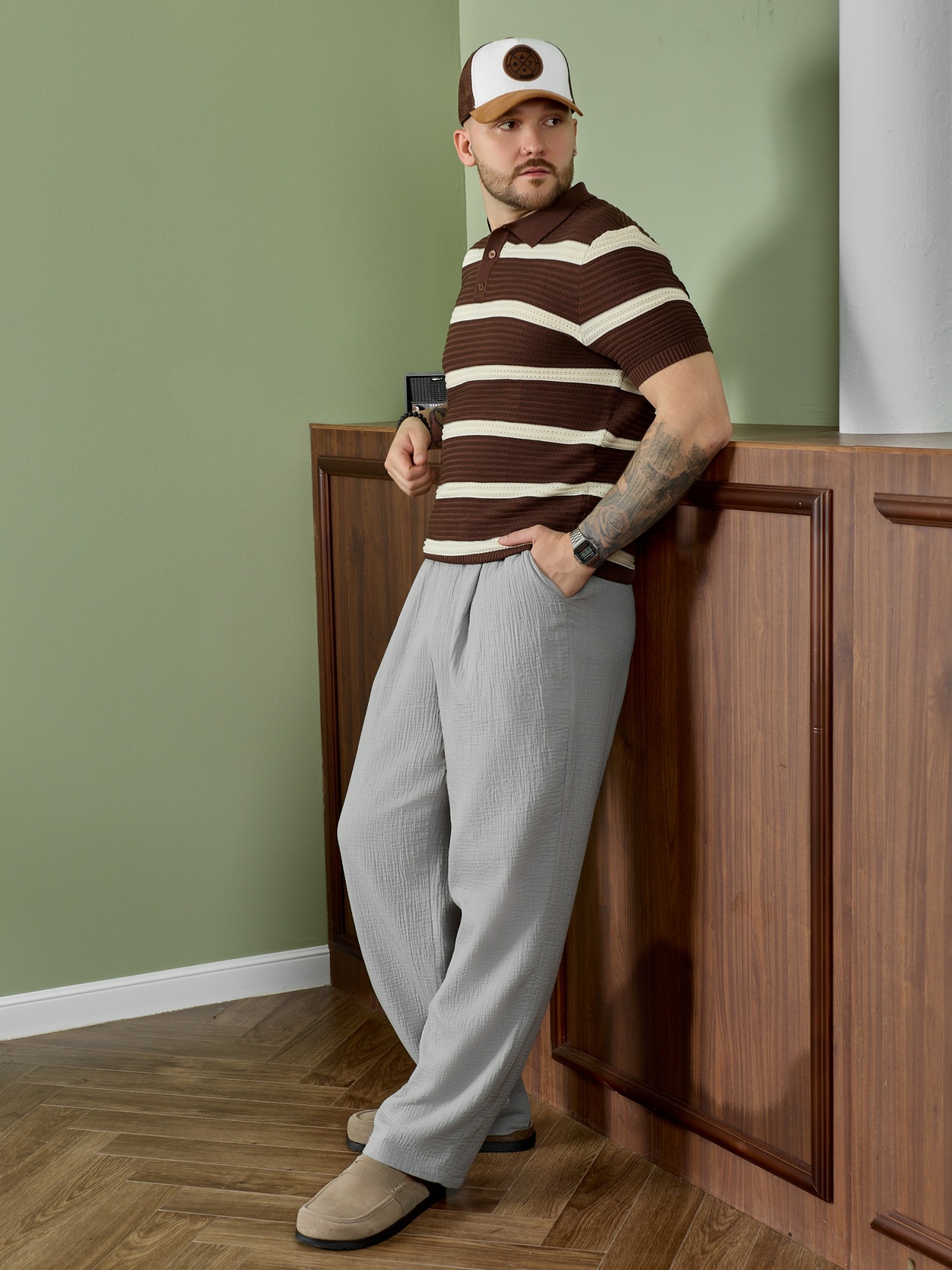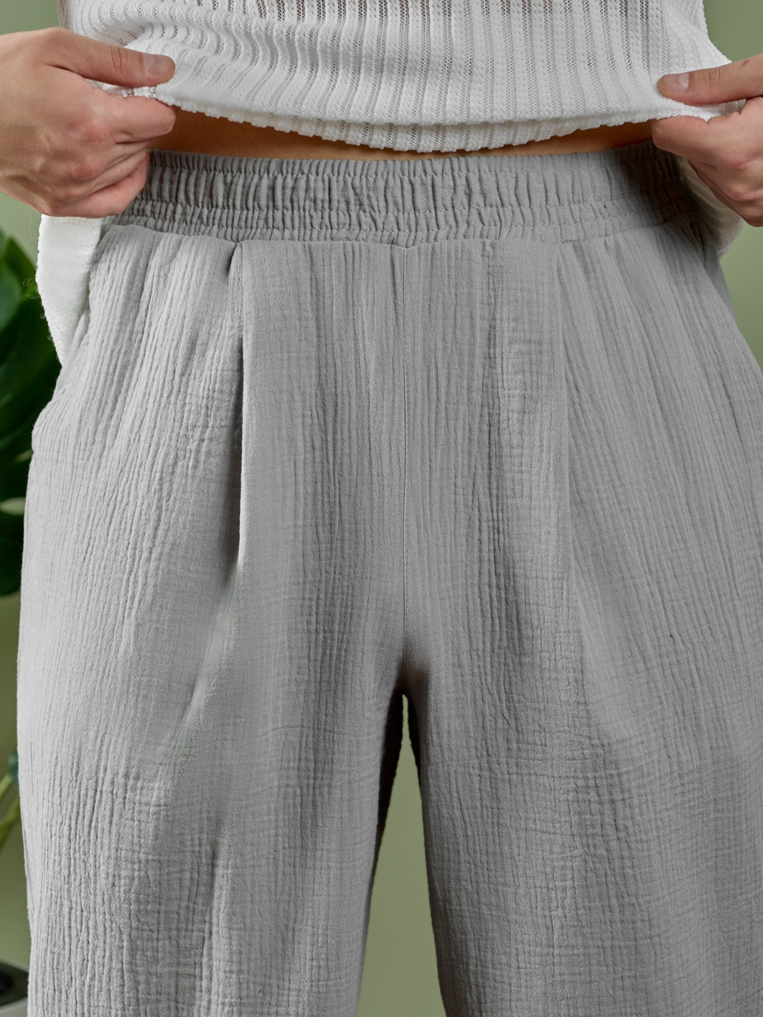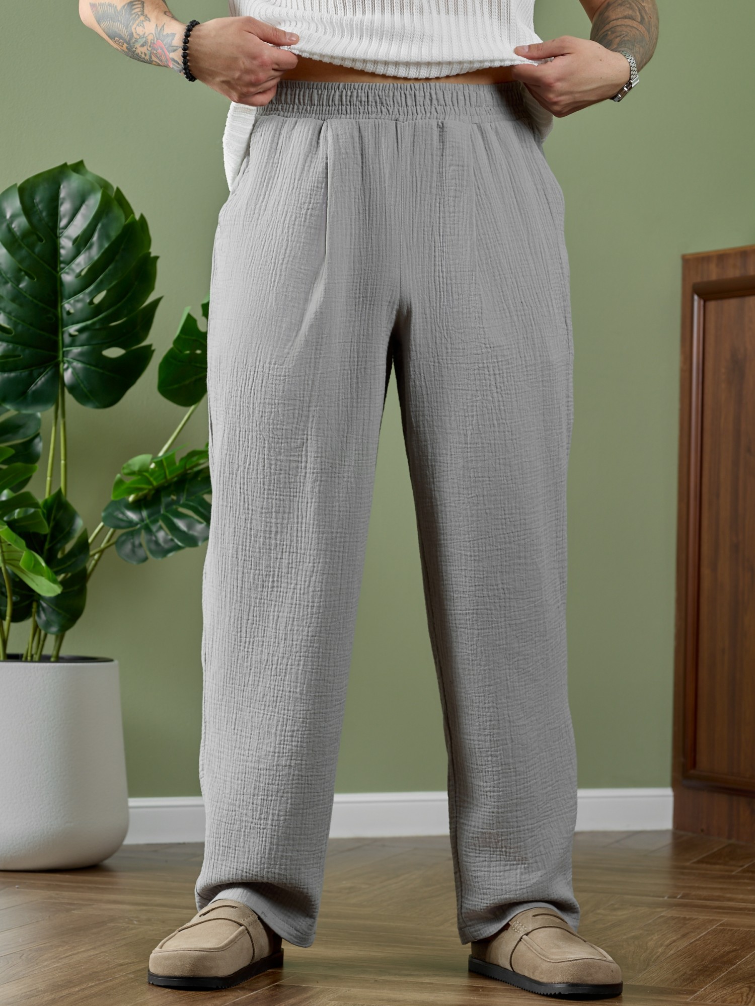 Брюки мужские из фактурного гладкокрашеного полотна на притачном поясе с эластичной тесьмой внутри , с карманами в боковых швах. На передних половинах брюк в шве притачивания пояса обработаны складки-защипы по две с каждой стороны. Нижние срезы брюк обработаны подгибкой.