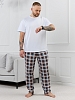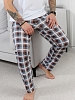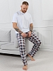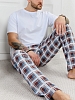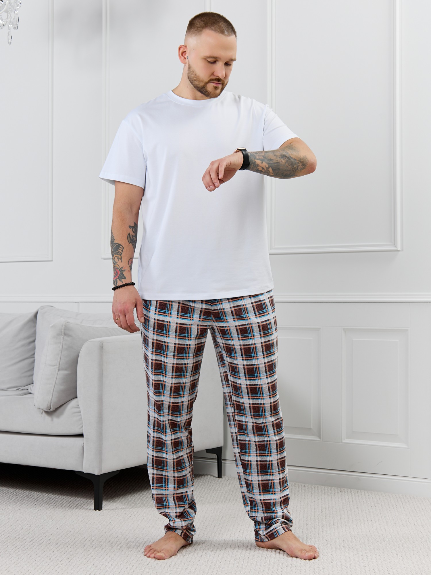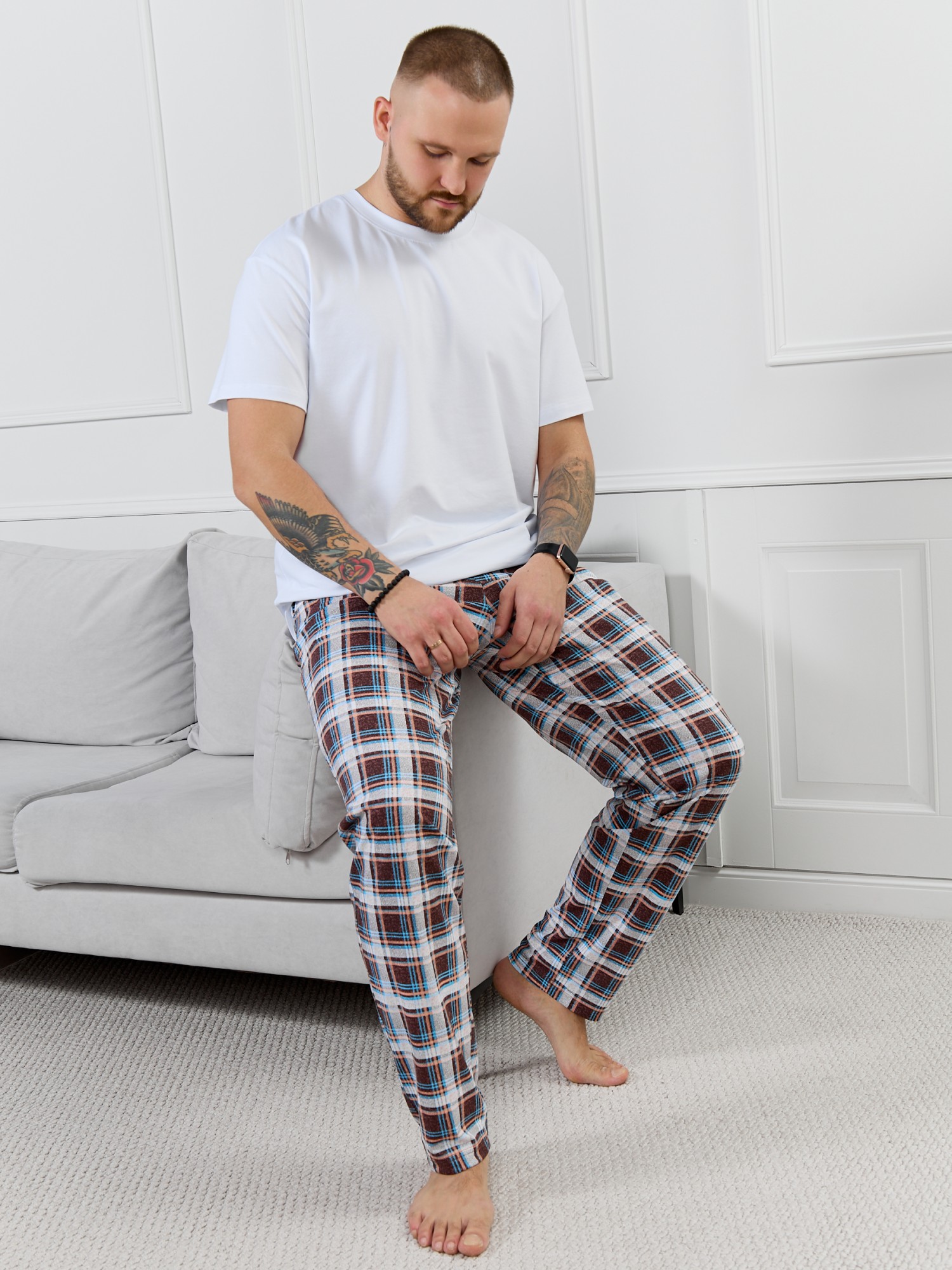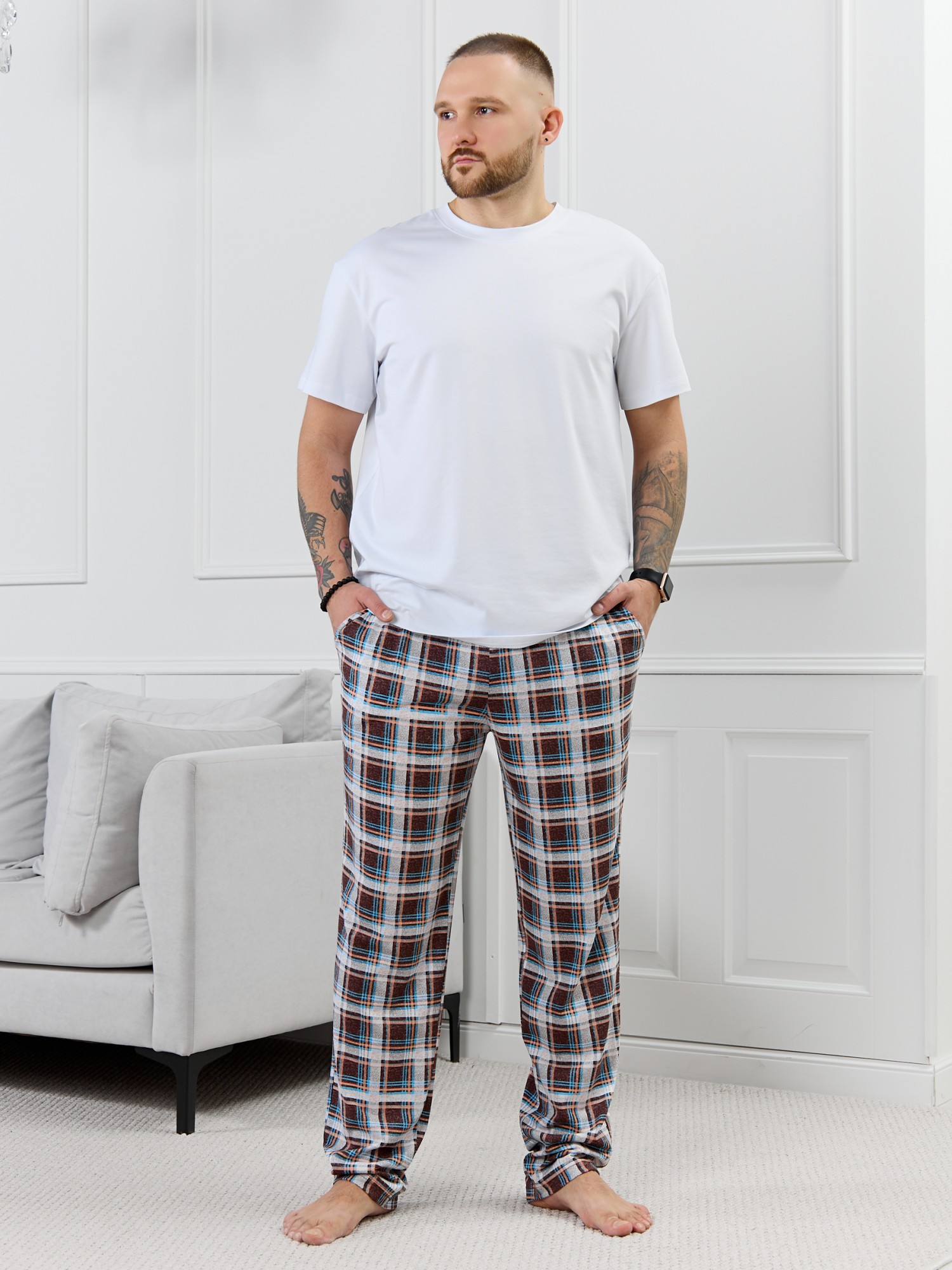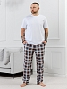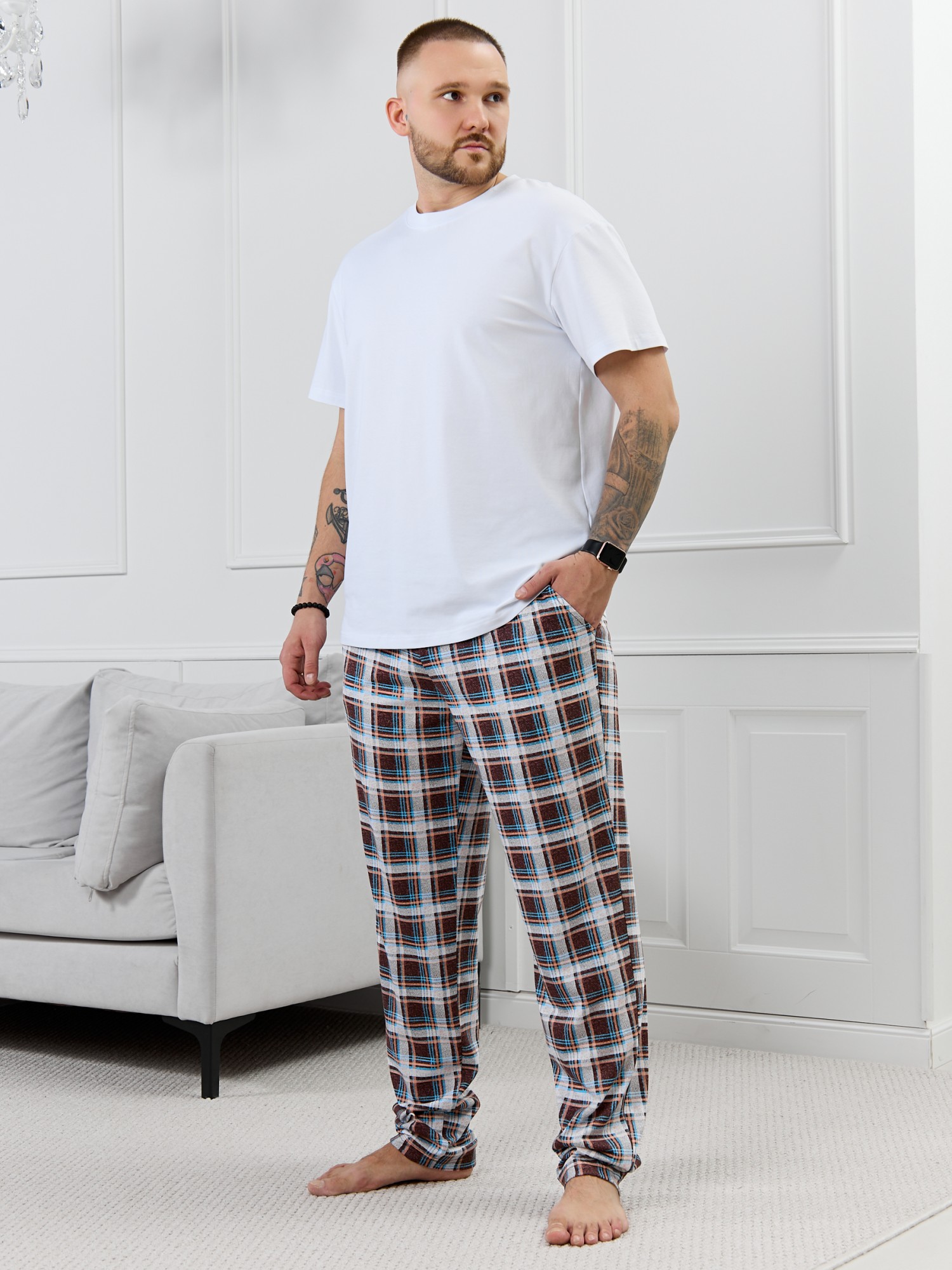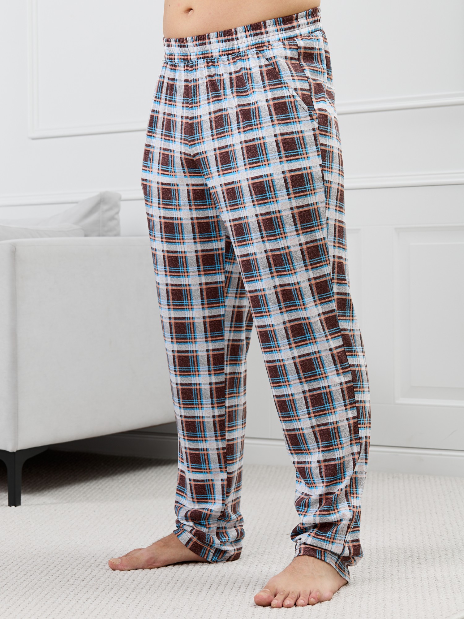Брюки мужские из трикотажного полотна "кулирка" в клетку, свободного покроя, на притачном поясе с эластичной тесьмой внутри, с карманами в боковых швах. Нижние срезы обработаны подгибкой.