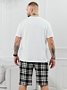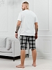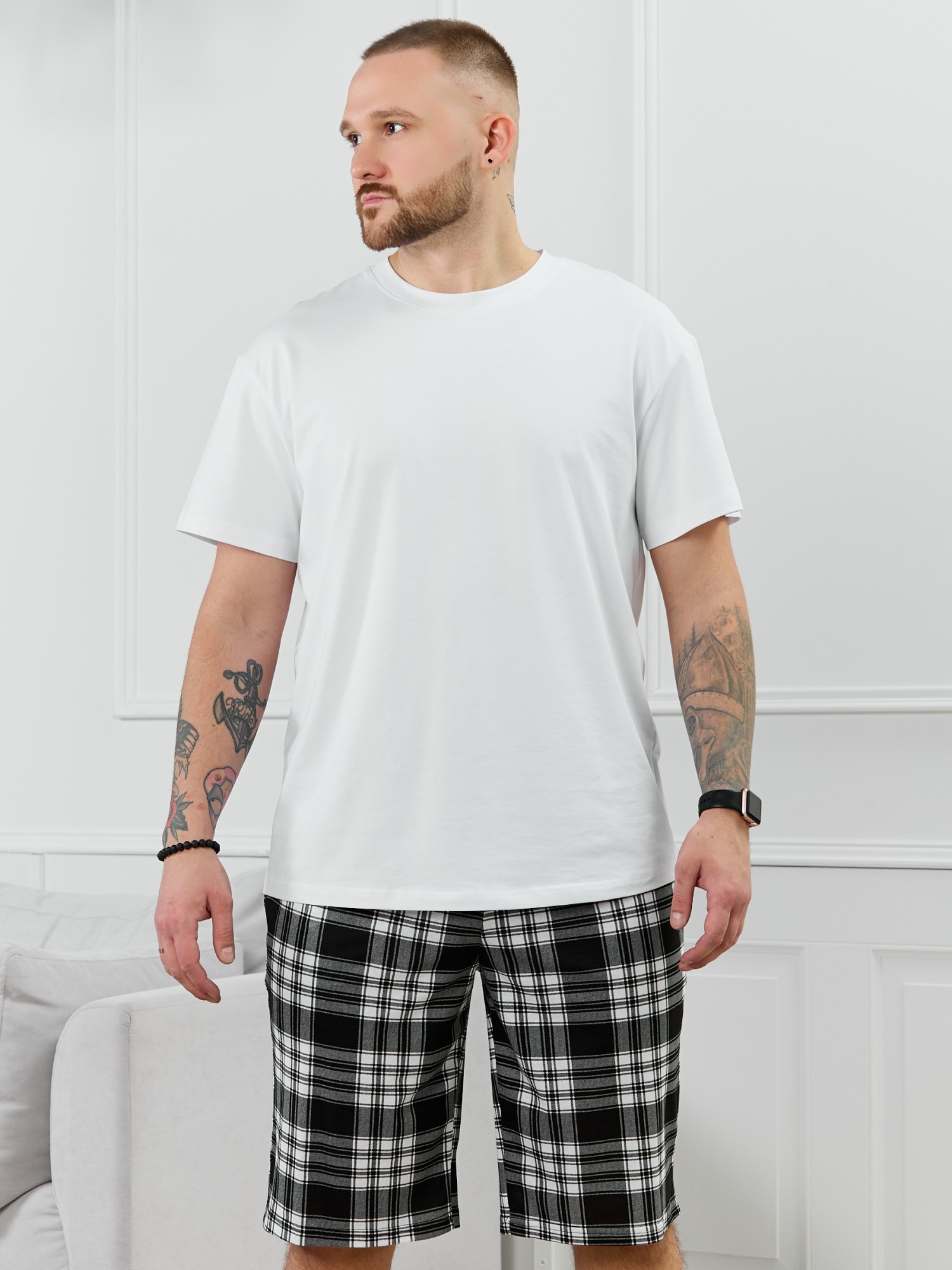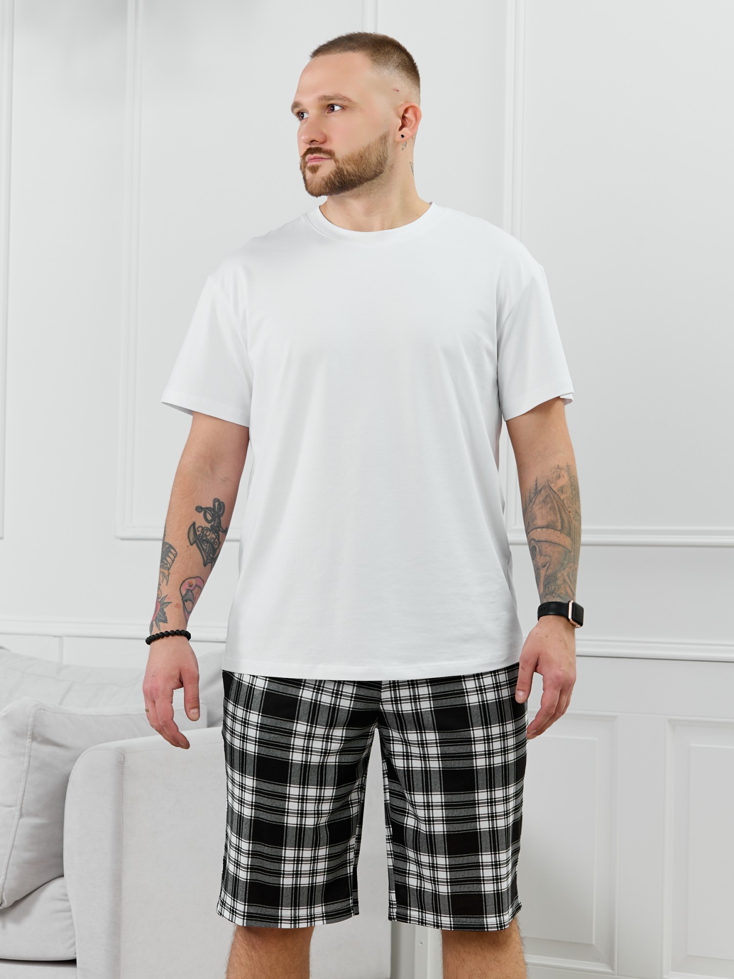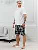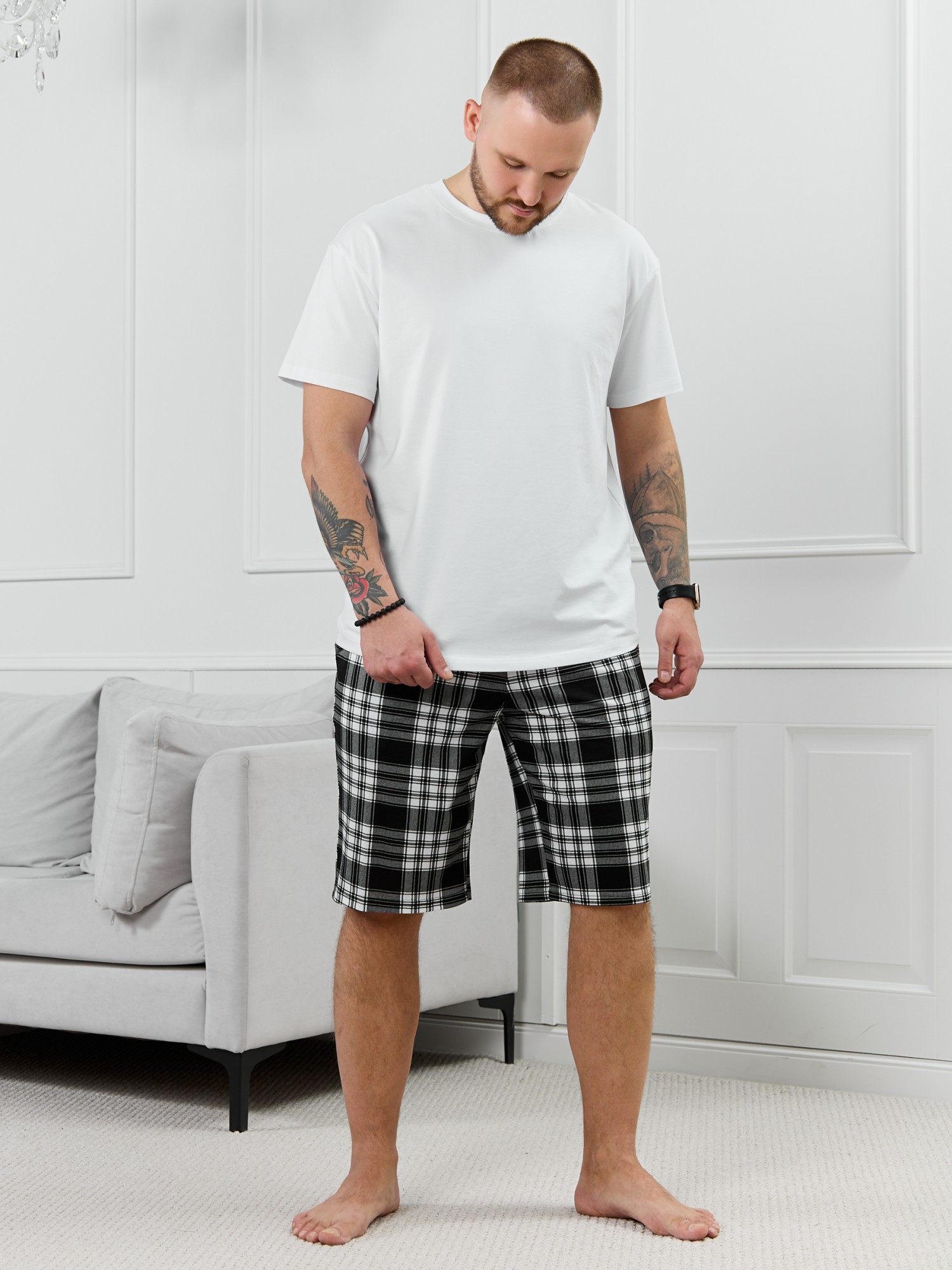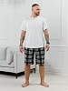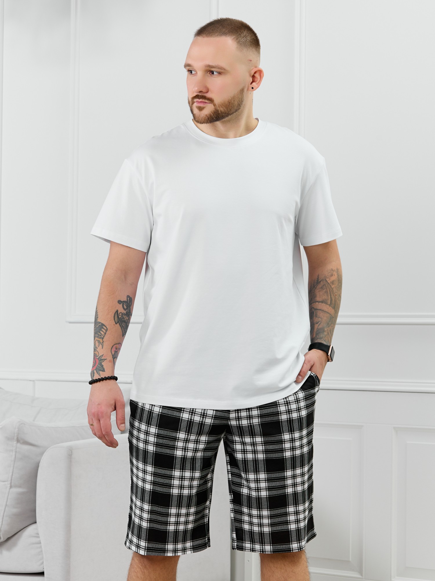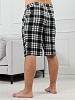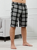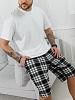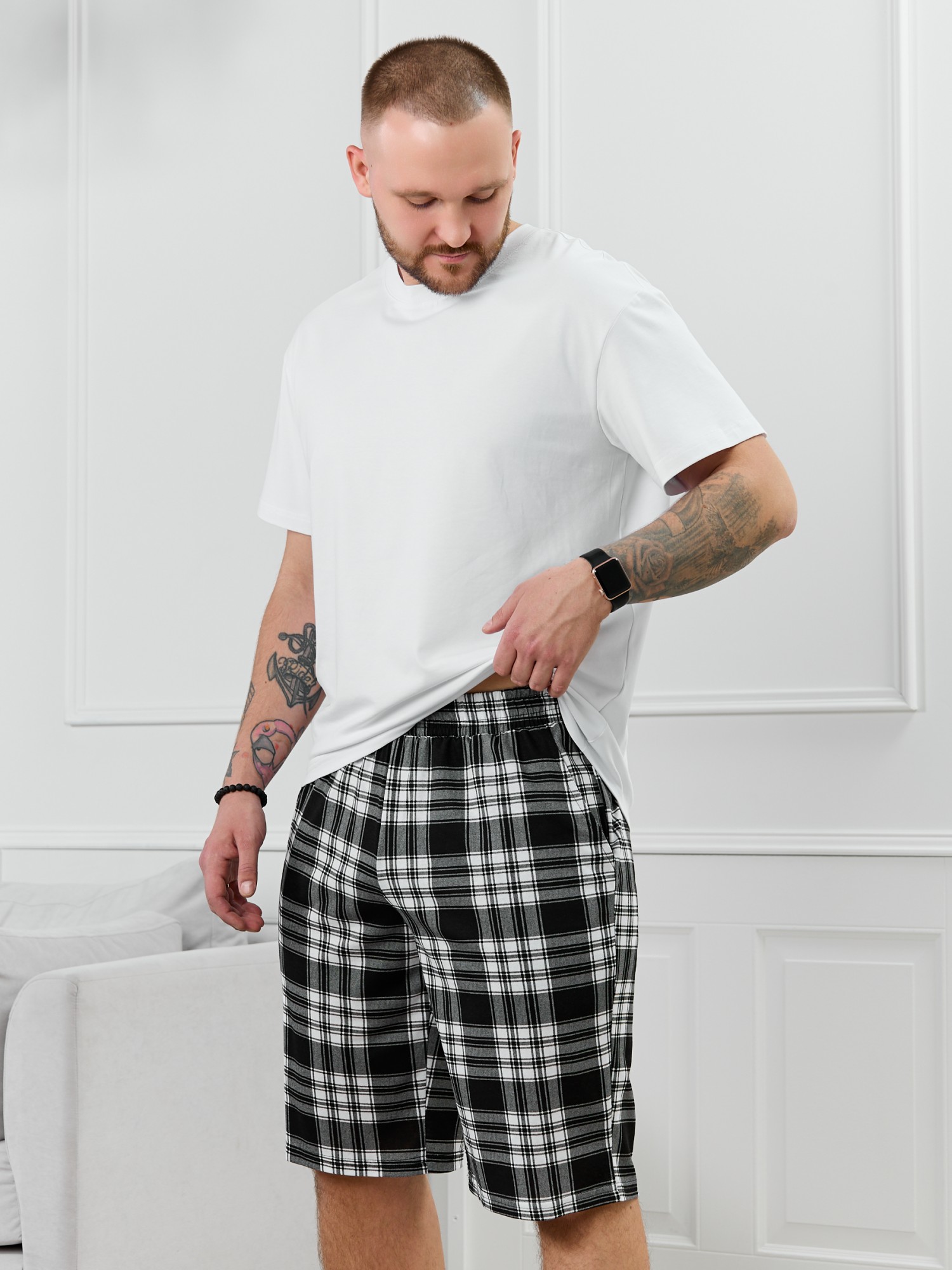 Шорты мужские из трикотажного полотна "кулирка" в клетку, свободного покроя, на притачном поясе с эластичной тесьмой внутри, с карманами в боковых швах. Нижние срезы обработаны подгибкой.