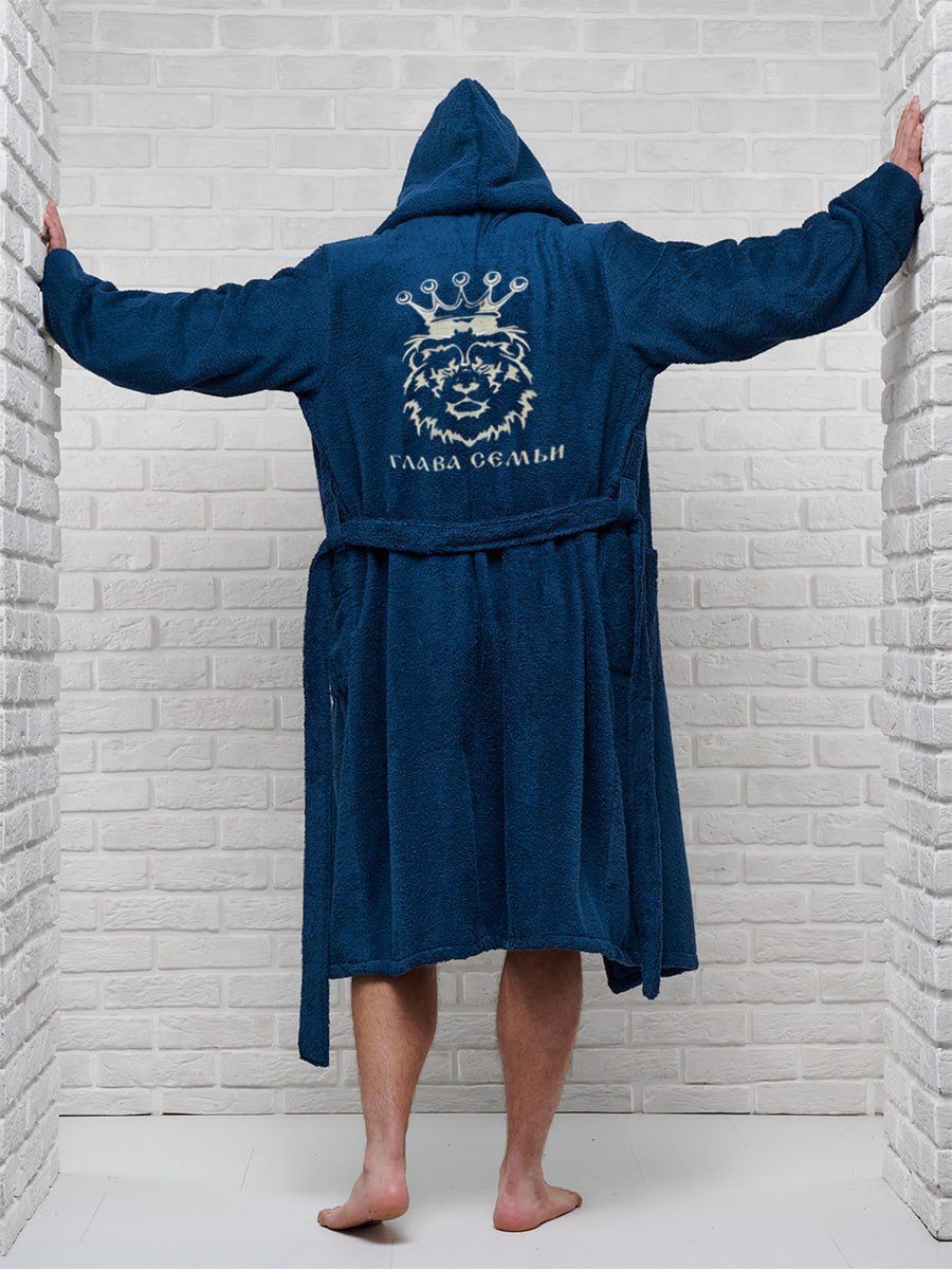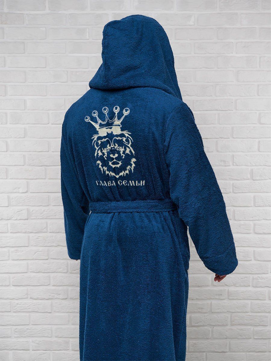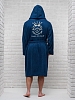 Мужской халат махровый с капюшоном / темно-синий с вышивкой