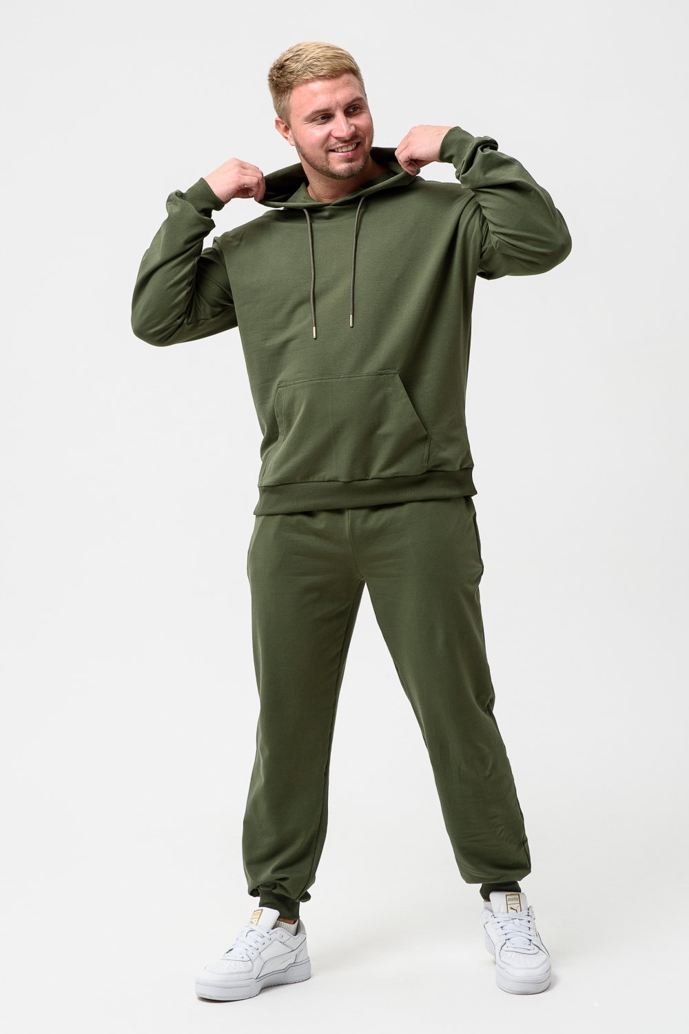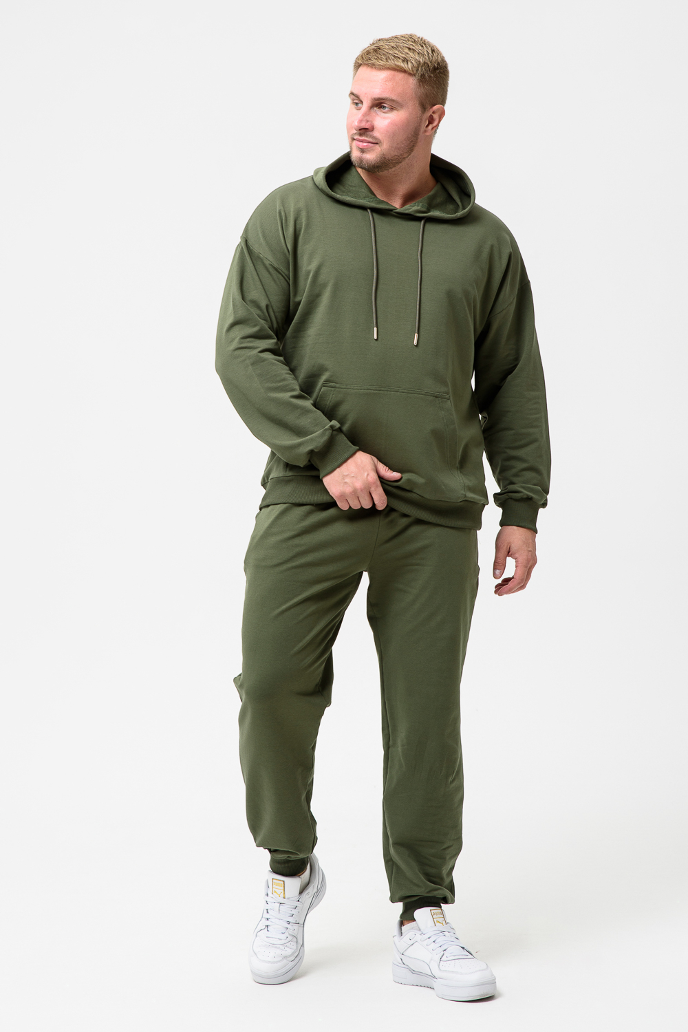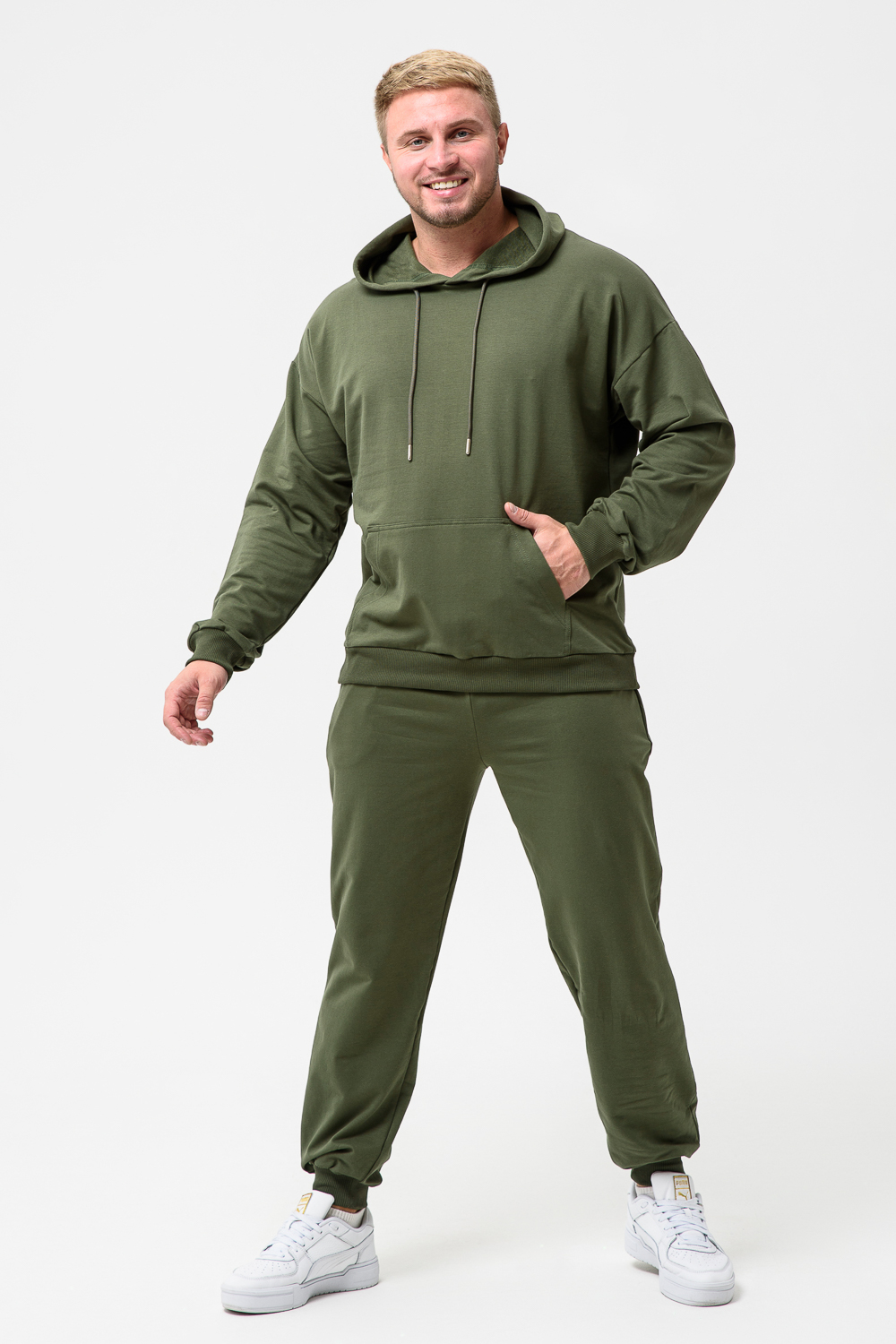 Костюм спортивный мужской с худи и джоггерами. Костюм свободного кроя состоит из толстовки с капюшоном и карманом кенгуру и брюк джоггеров на манжете с карманами в боковых швах. Костюм однотонный сшит из качественного хлопкового трикотажного материала - футера 2-х нитки. Обладает отличной эластичностью, не сковывает движений. Идеален для занятий спортом. Зимой костюм возможно носить в тренажерный зал или использовать как домашнюю одежду.