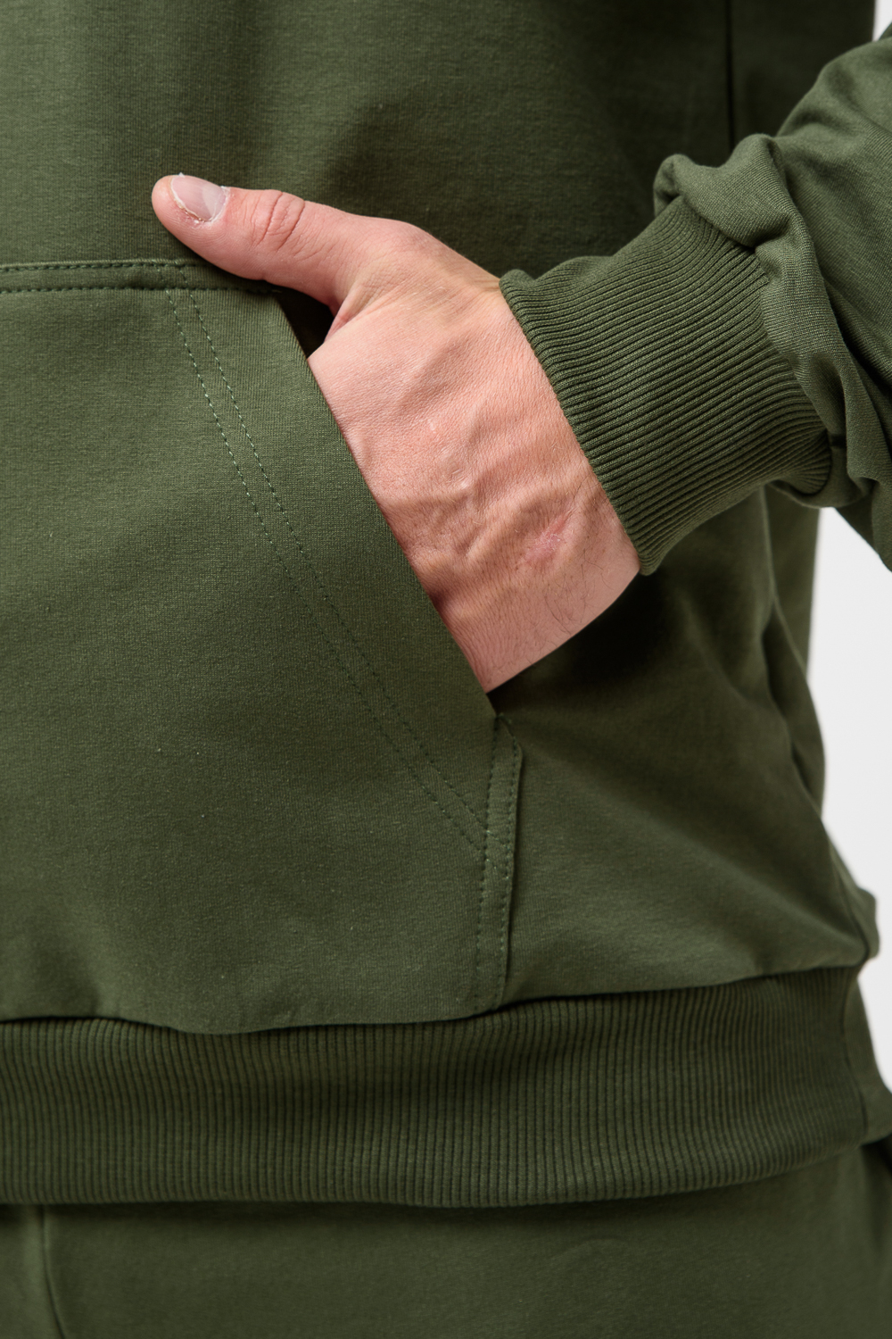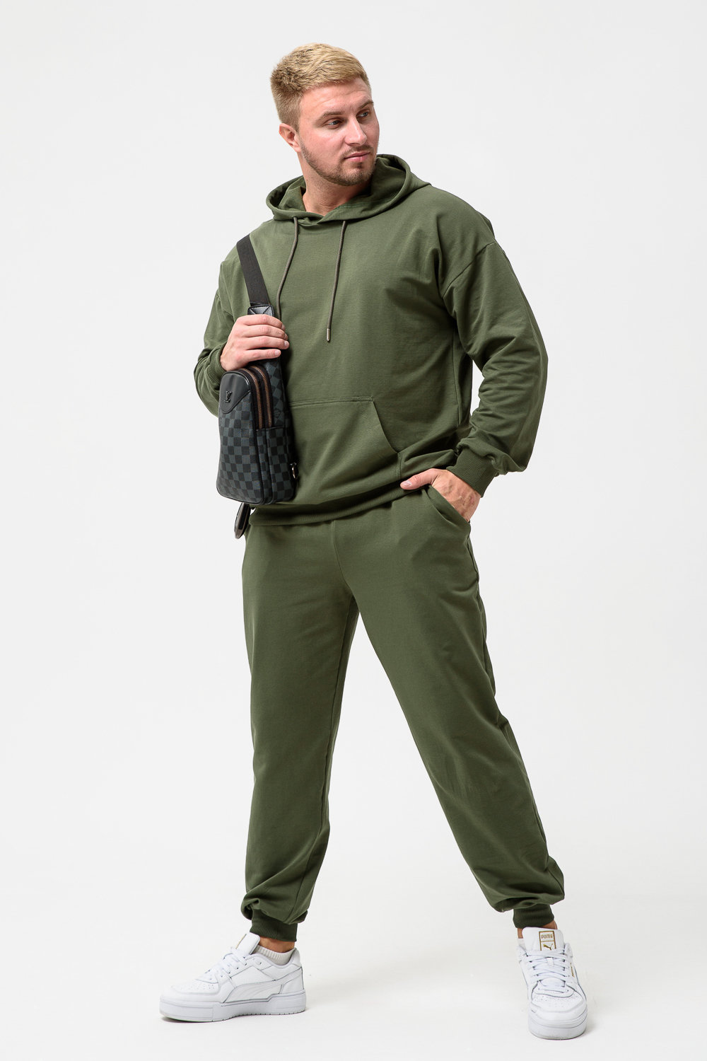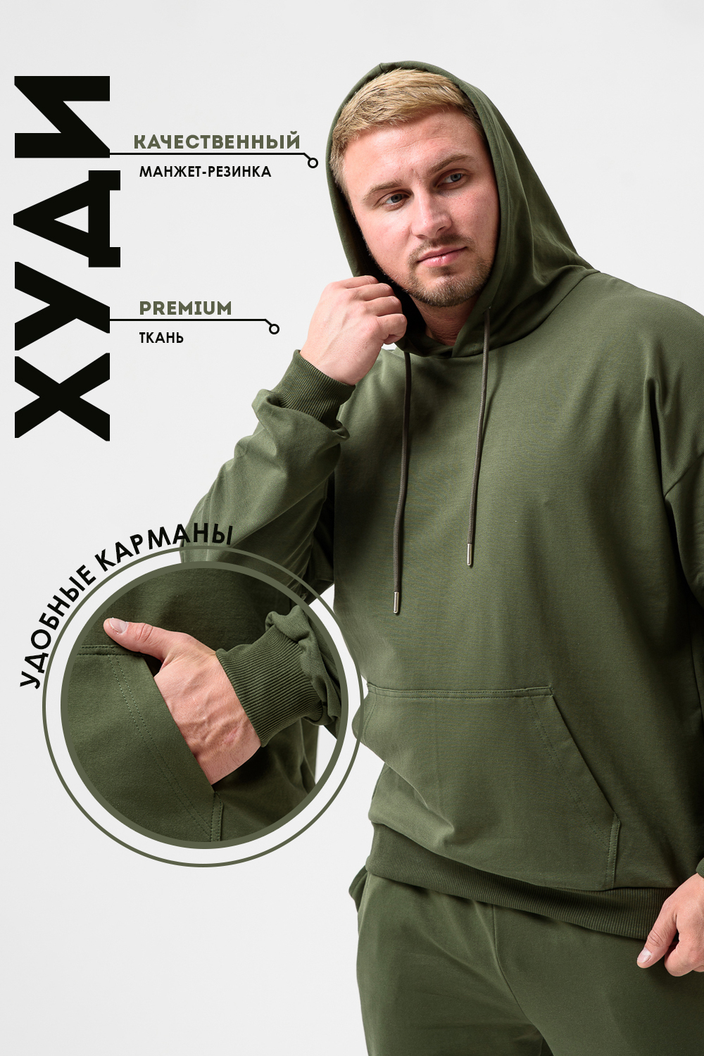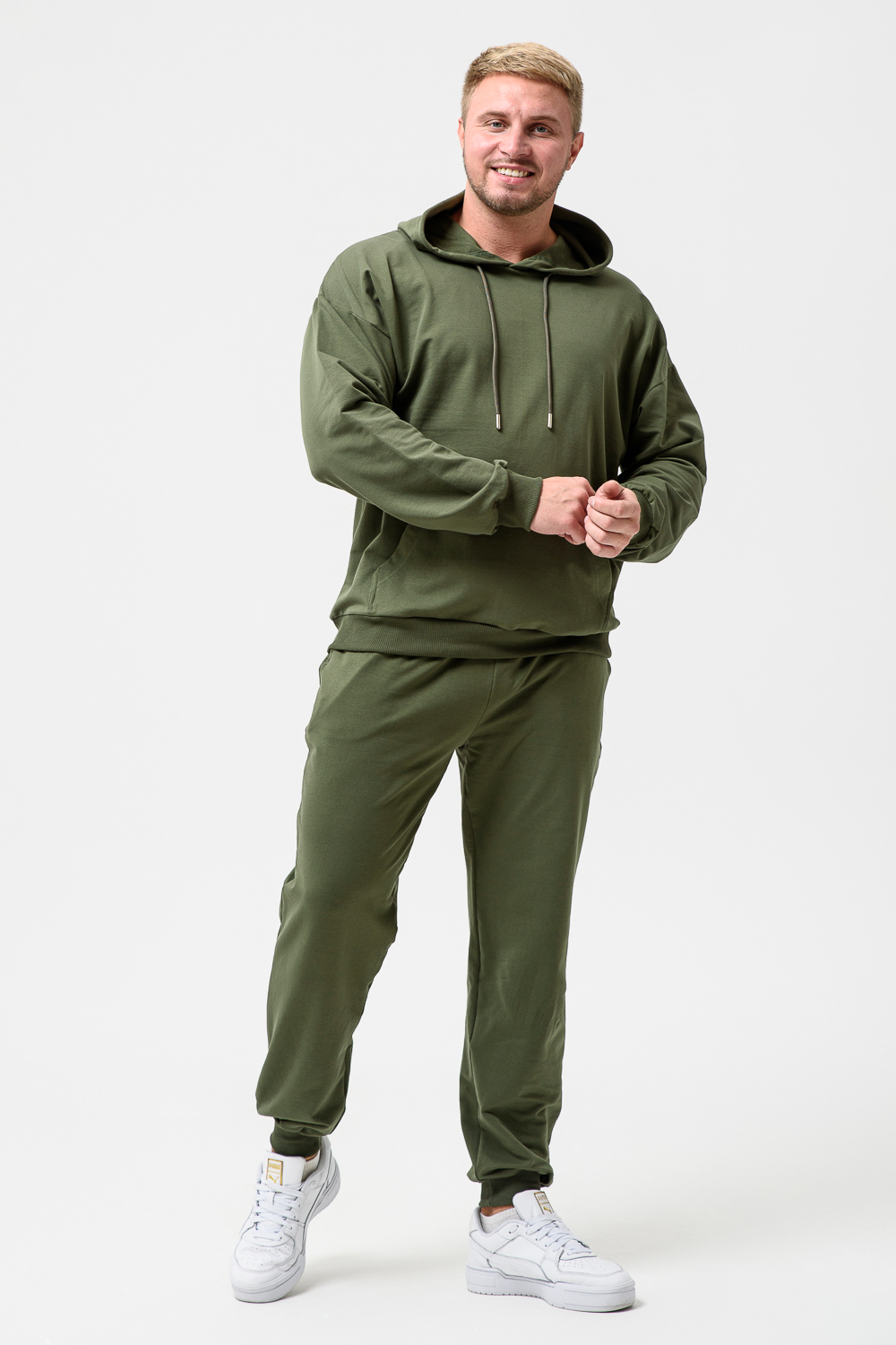 Костюм спортивный мужской с худи и джоггерами. Костюм свободного кроя состоит из толстовки с капюшоном и карманом кенгуру и брюк джоггеров на манжете с карманами в боковых швах. Костюм однотонный сшит из качественного хлопкового трикотажного материала - футера 2-х нитки. Обладает отличной эластичностью, не сковывает движений. Идеален для занятий спортом. Зимой костюм возможно носить в тренажерный зал или использовать как домашнюю одежду.