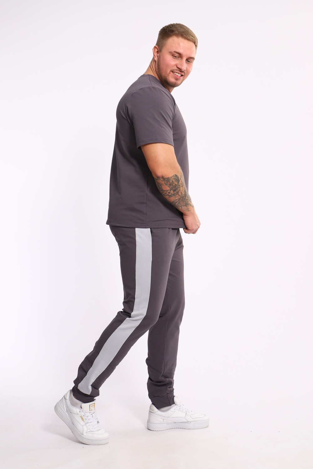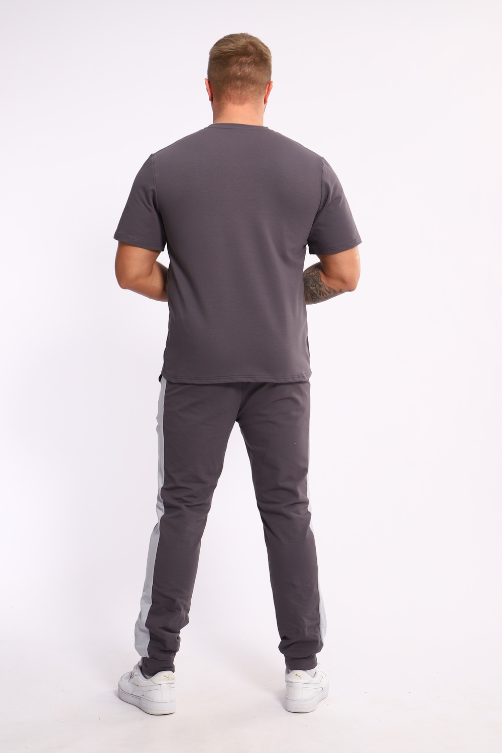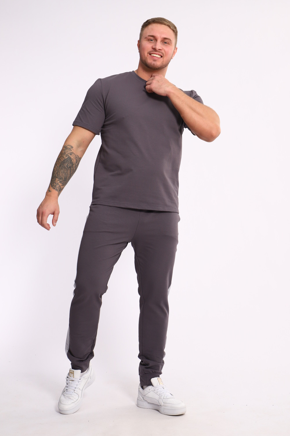 Стильный мужской костюм из мягкого и приятного на ощупь материала . Комплект состоит из футболки свободного кроя и комфортных прямых брюк с эластичным поясом и контрастной вставкой по бокам. Лаконичный дизайн делает этот костюм универсальным выбором для повседневной носки, прогулок или активного отдыха. Идеально сочетается с кроссовками для создания модного спортивного образа.