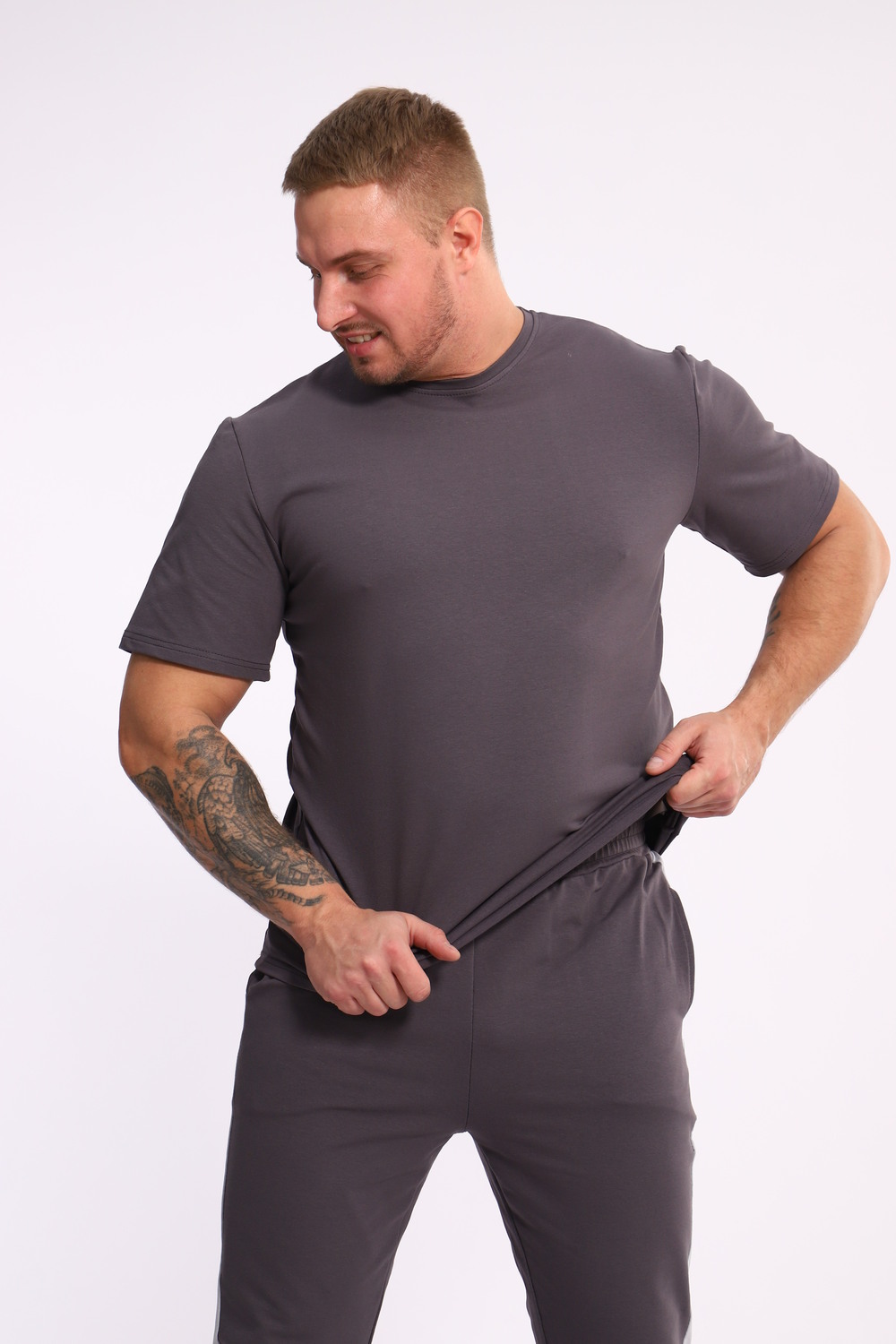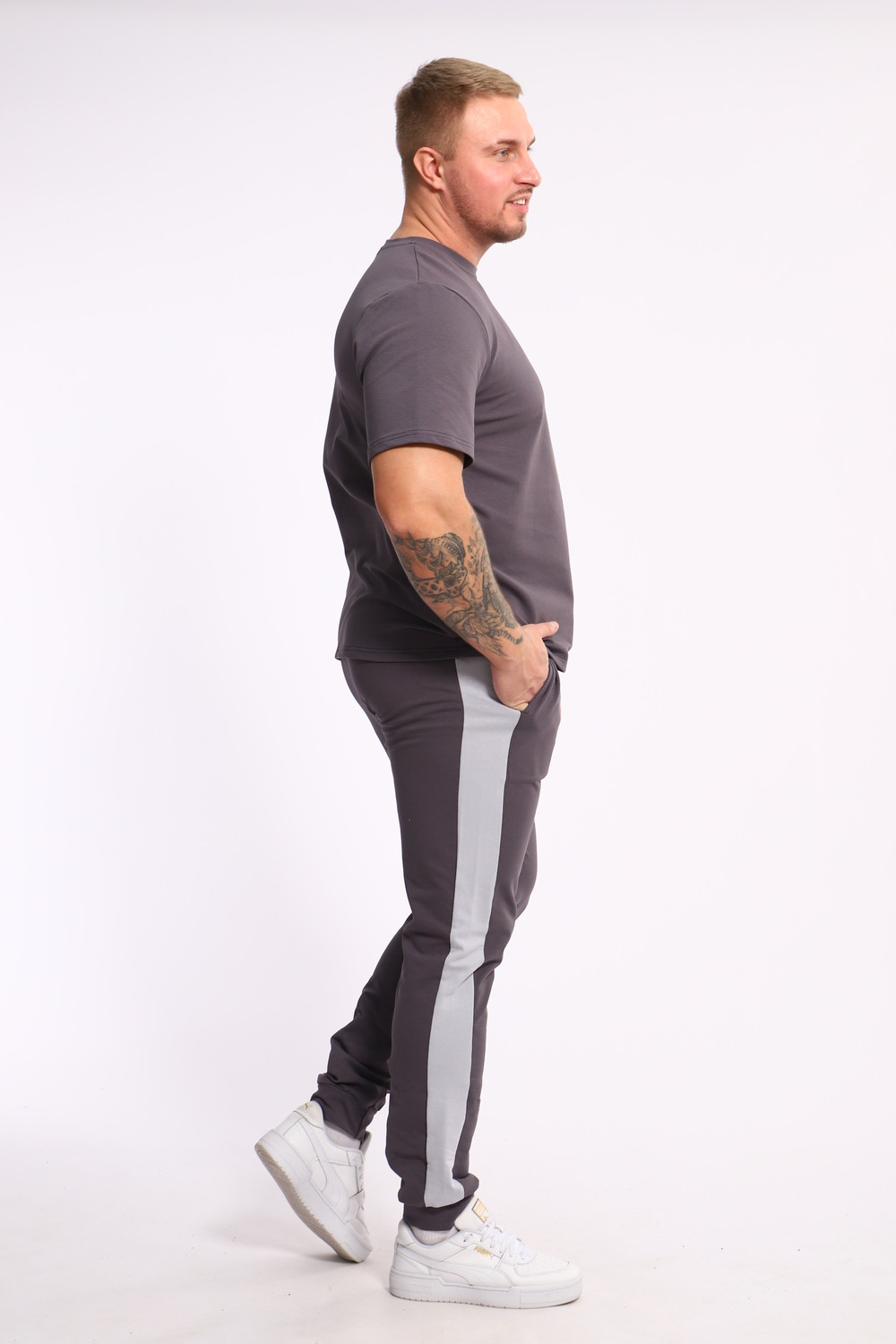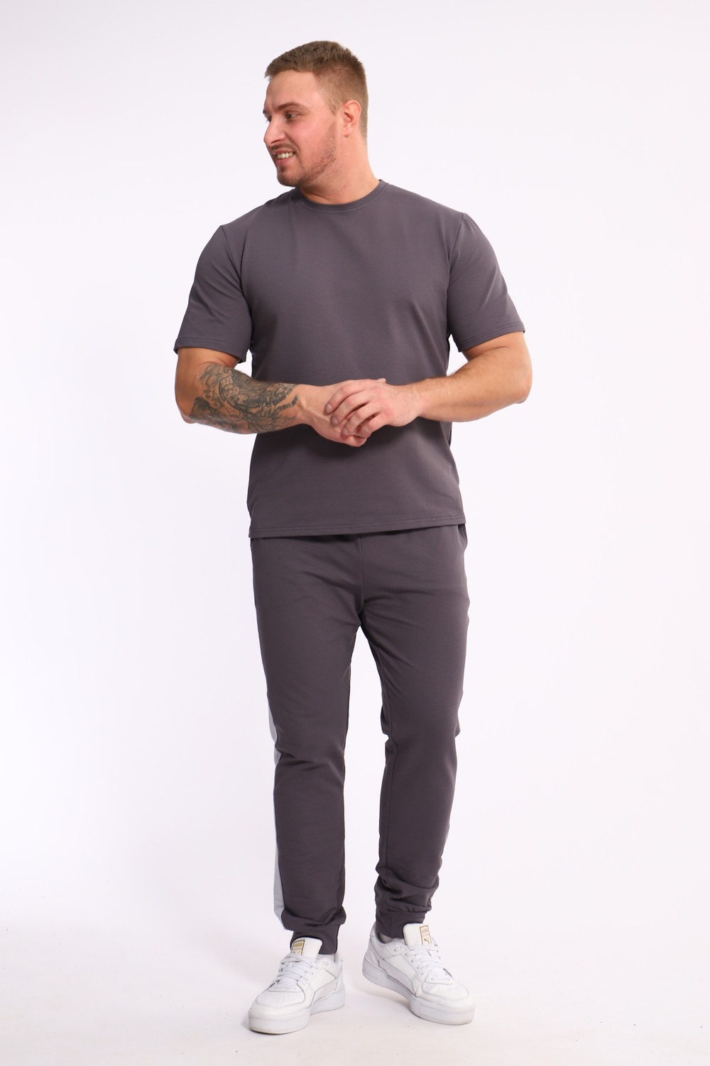 Стильный мужской костюм из мягкого и приятного на ощупь материала . Комплект состоит из футболки свободного кроя и комфортных прямых брюк с эластичным поясом и контрастной вставкой по бокам. Лаконичный дизайн делает этот костюм универсальным выбором для повседневной носки, прогулок или активного отдыха. Идеально сочетается с кроссовками для создания модного спортивного образа.