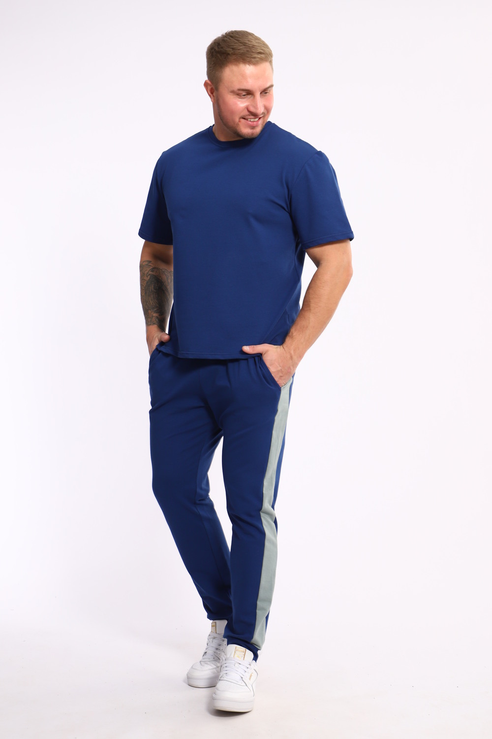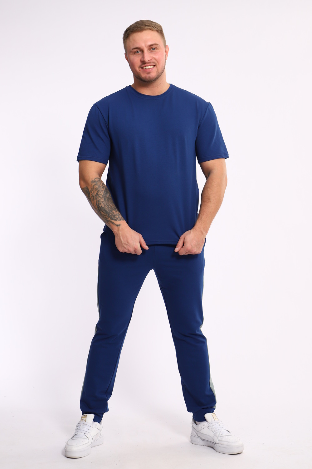 Стильный мужской костюм из мягкого и приятного на ощупь материала . Комплект состоит из футболки свободного кроя и комфортных прямых брюк с эластичным поясом и контрастной вставкой по бокам. Лаконичный дизайн делает этот костюм универсальным выбором для повседневной носки, прогулок или активного отдыха. Идеально сочетается с кроссовками для создания модного спортивного образа.