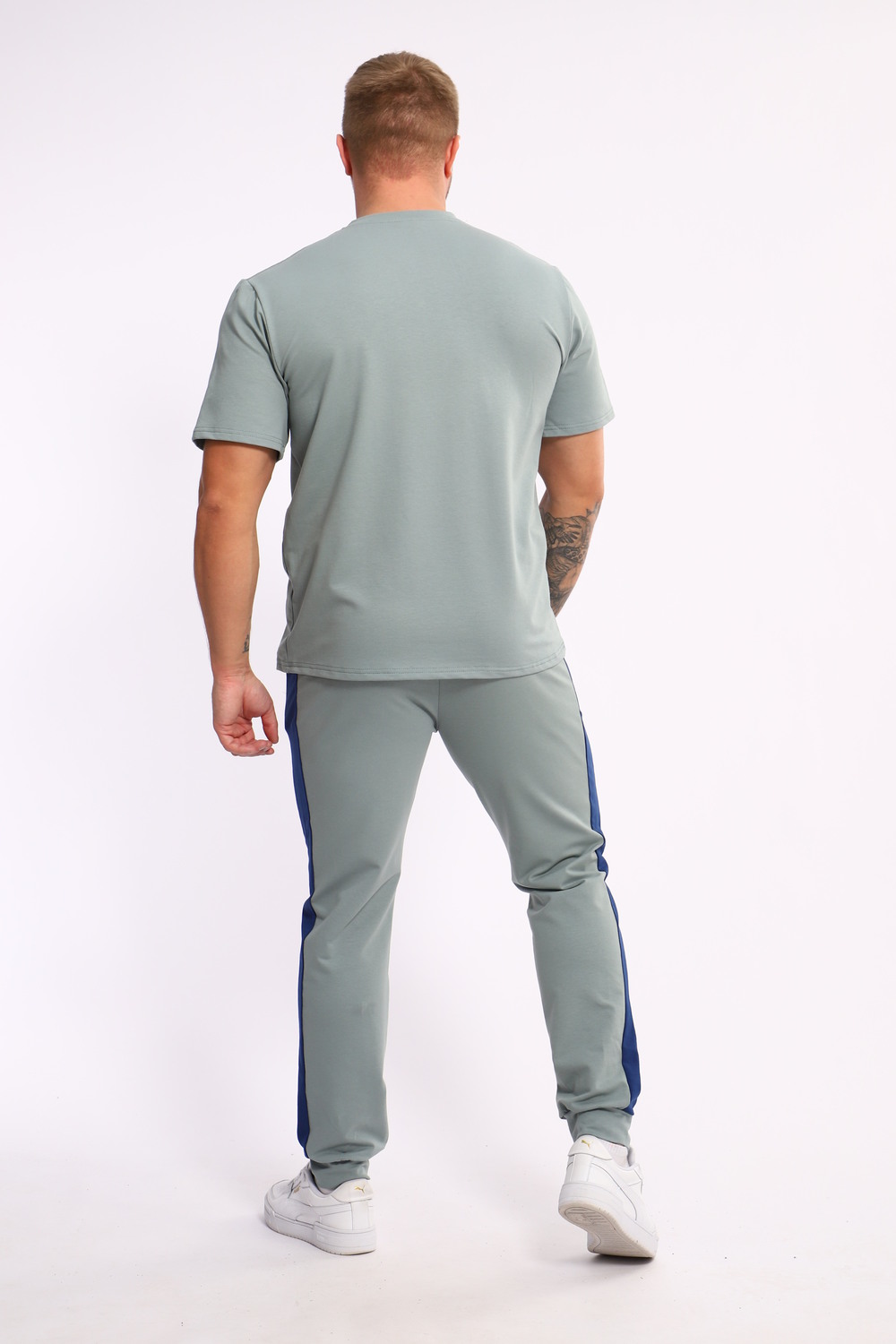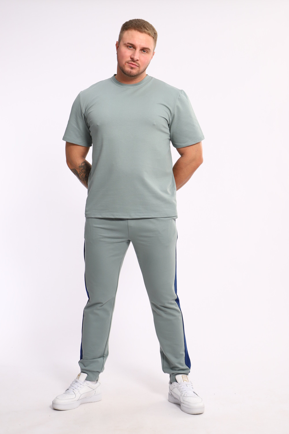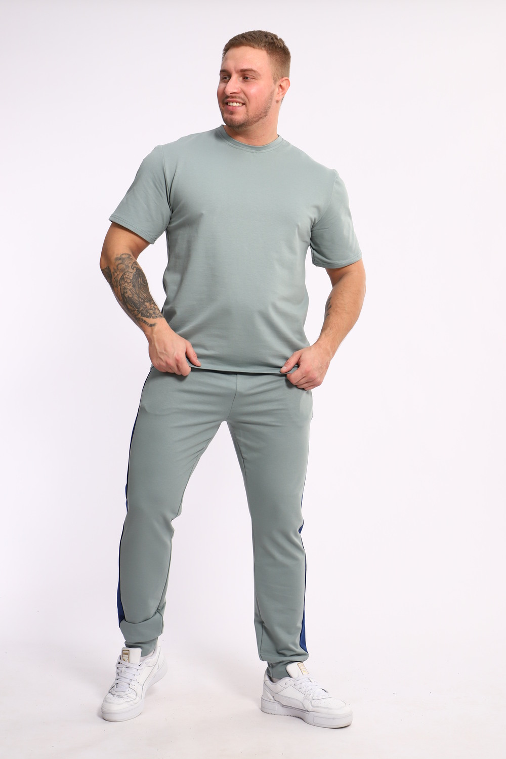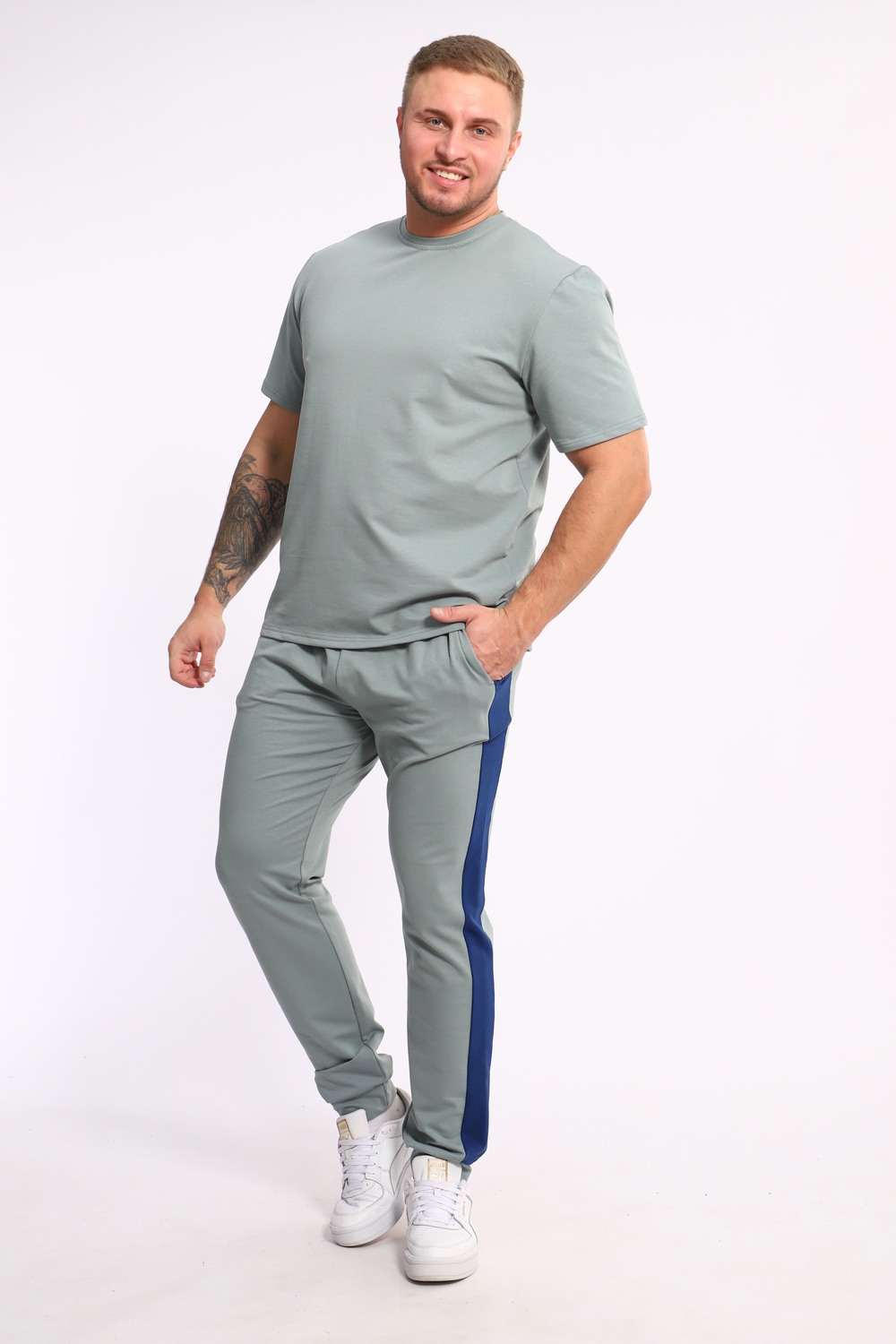 Стильный мужской костюм из мягкого и приятного на ощупь материала . Комплект состоит из футболки свободного кроя и комфортных прямых брюк с эластичным поясом и контрастной вставкой по бокам. Лаконичный дизайн делает этот костюм универсальным выбором для повседневной носки, прогулок или активного отдыха. Идеально сочетается с кроссовками для создания модного спортивного образа.