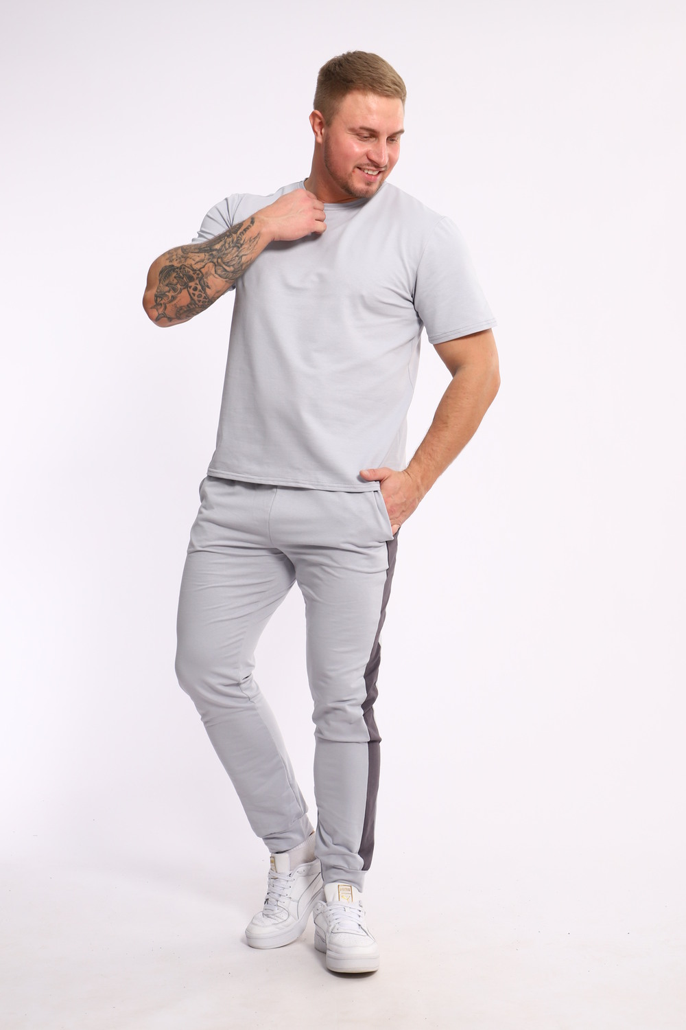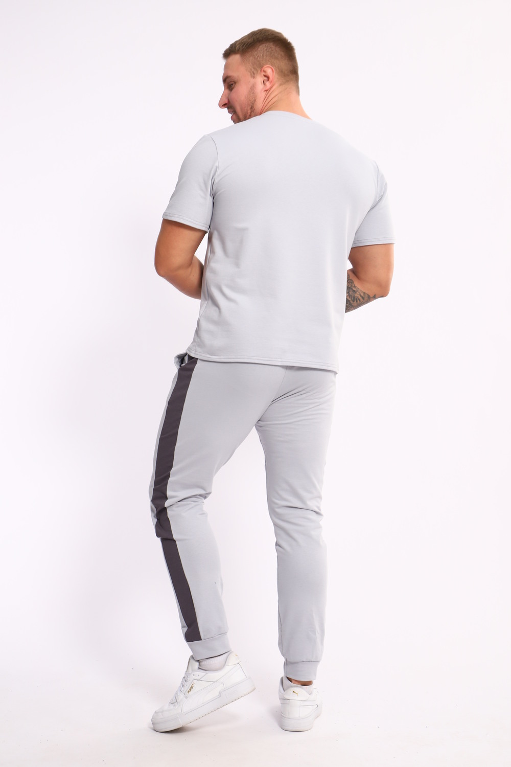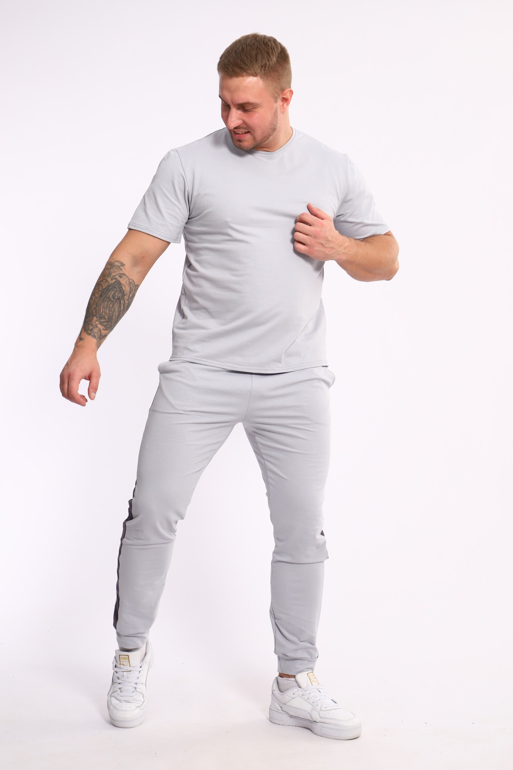 Стильный мужской костюм из мягкого и приятного на ощупь материала . Комплект состоит из футболки свободного кроя и комфортных прямых брюк с эластичным поясом и контрастной вставкой по бокам. Лаконичный дизайн делает этот костюм универсальным выбором для повседневной носки, прогулок или активного отдыха. Идеально сочетается с кроссовками для создания модного спортивного образа.