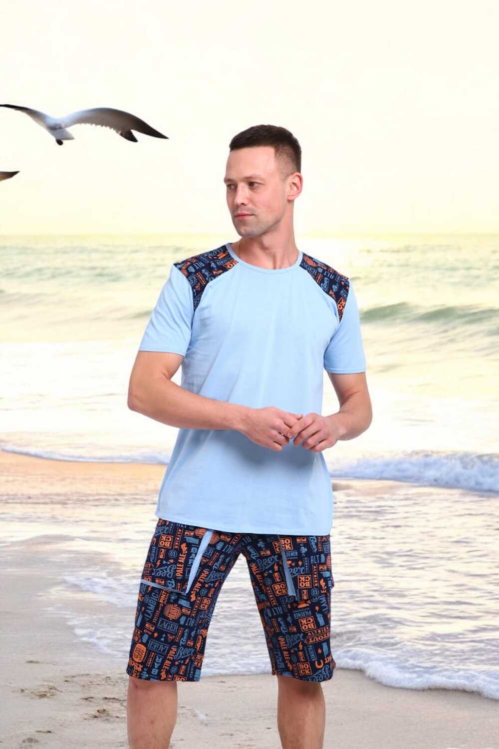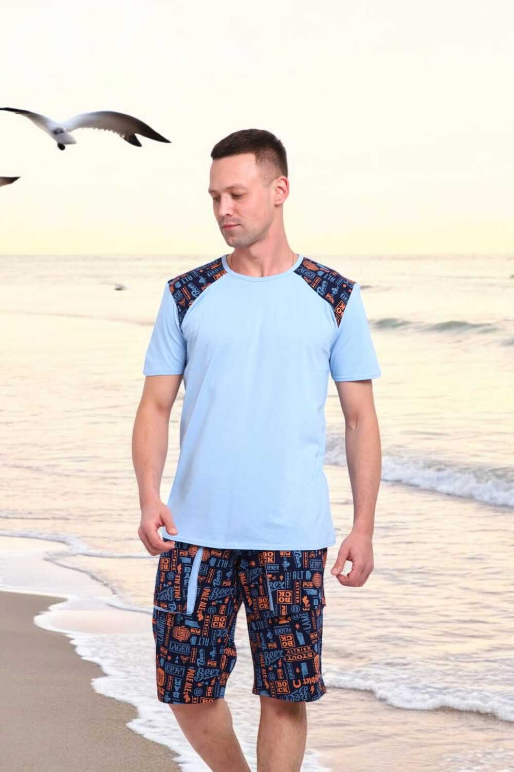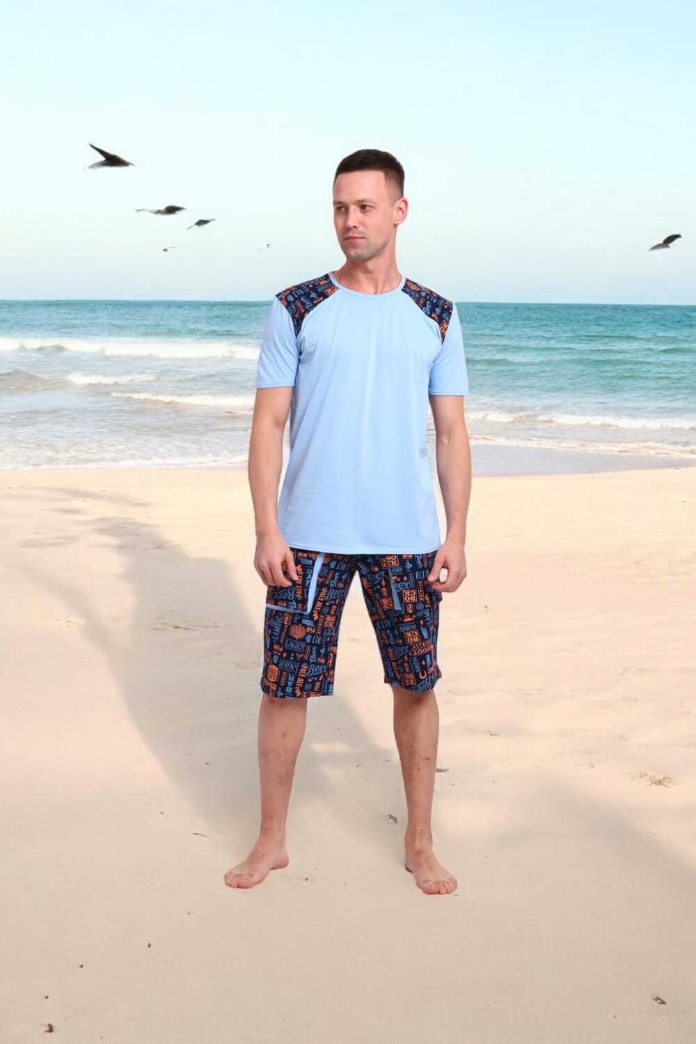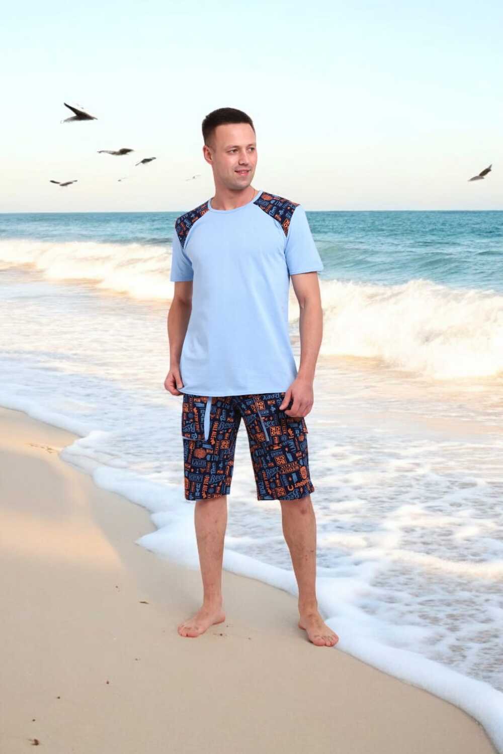 Погрузись в атмосферу свободы и летнего беззаботного отдыха с этим стильным мужским костюмом! Легкая футболка нежно-голубого цвета с оригинальными контрастными вставками на плечах это не просто одежда, а настроение.Костюм идеально подойдёт для отдыха на пляже, летней вечеринки или просто уютного дня дома. Свободный крой, приятная к телу ткань и яркий дизайн делают его настоящим must-have сезона.Выразительный дизайн, который притягивает взгляды, мягкий трикотаж, дарящий комфорт с утра до вечера, универсальность для дома, дачи, моря или прогулки, карманы в шортах для практичности, отлично сочетается с пляжными сандалиями или кедами.