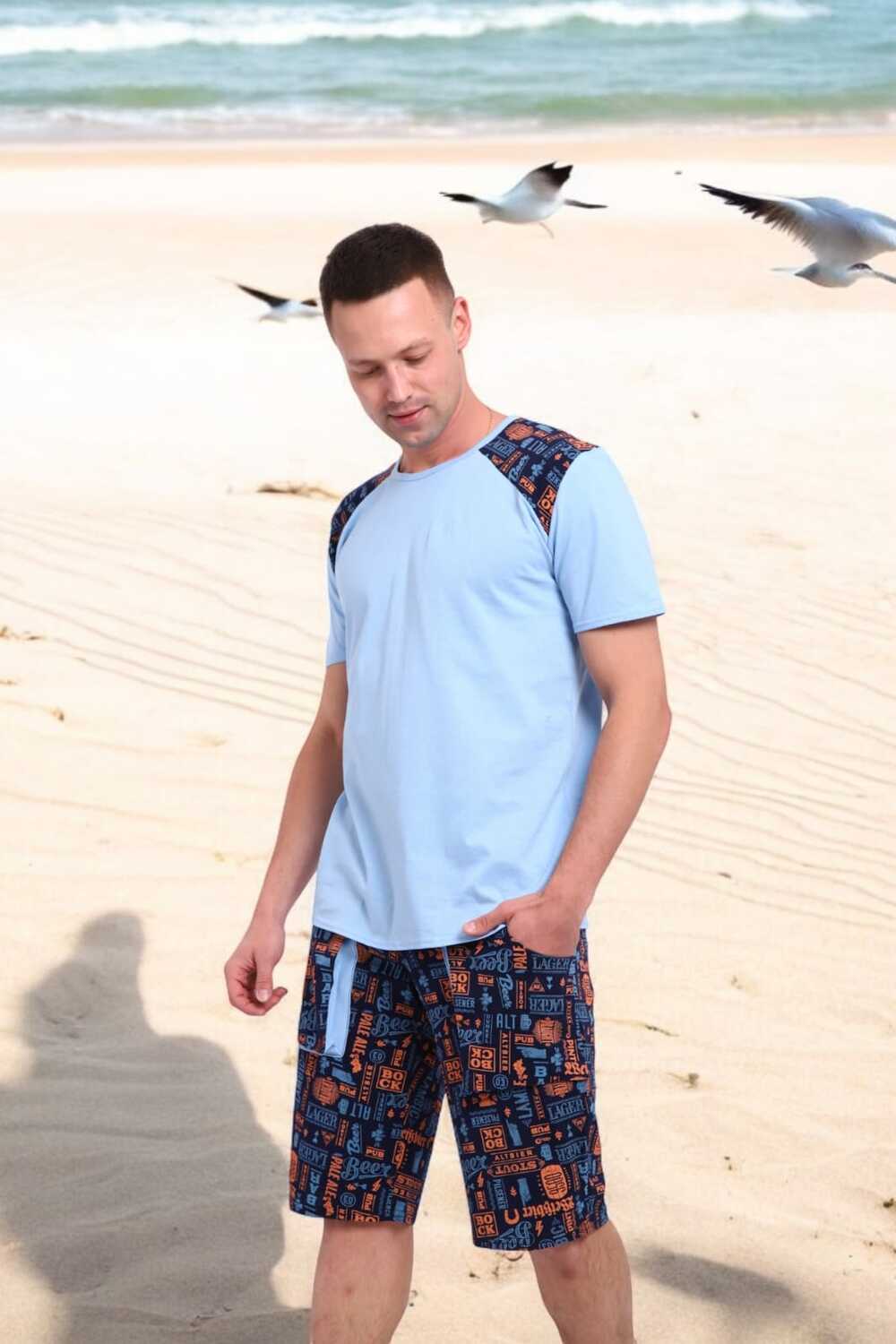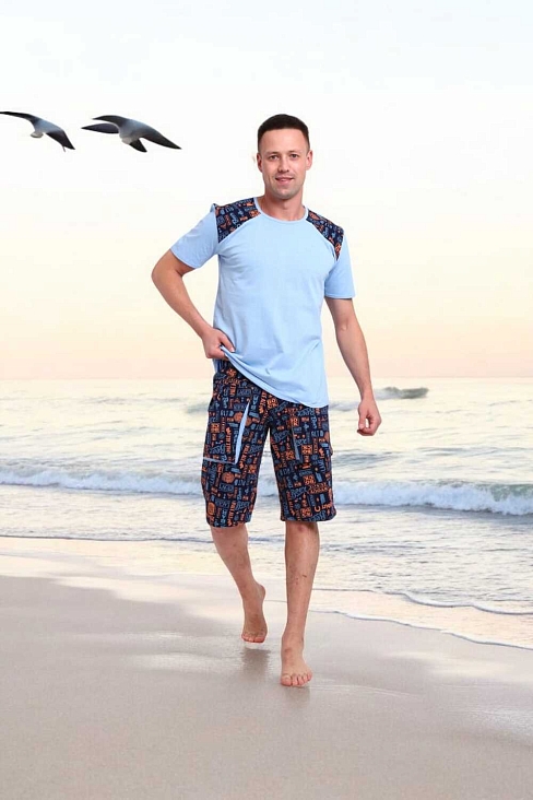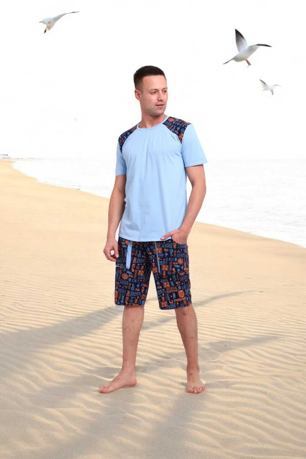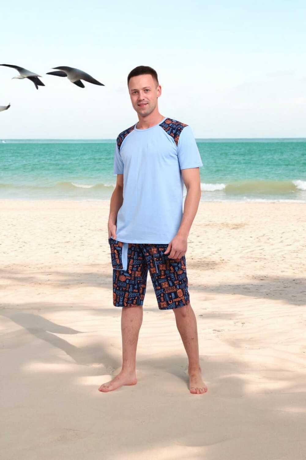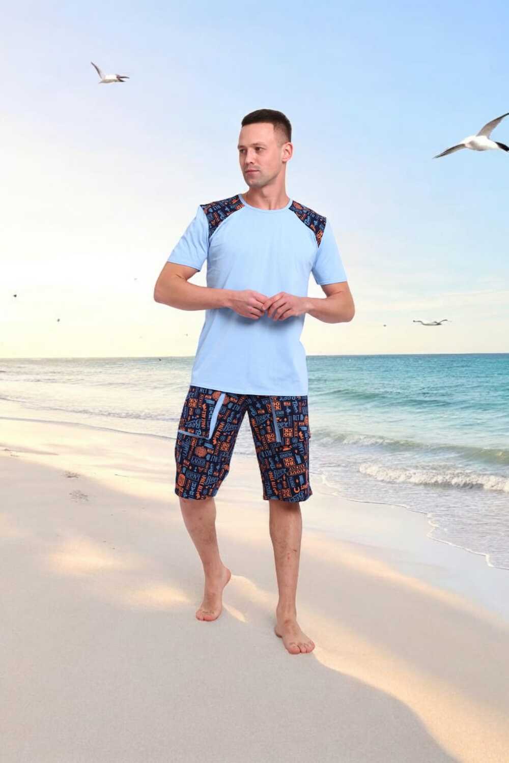 Погрузись в атмосферу свободы и летнего беззаботного отдыха с этим стильным мужским костюмом! Легкая футболка нежно-голубого цвета с оригинальными контрастными вставками на плечах это не просто одежда, а настроение.Костюм идеально подойдёт для отдыха на пляже, летней вечеринки или просто уютного дня дома. Свободный крой, приятная к телу ткань и яркий дизайн делают его настоящим must-have сезона.Выразительный дизайн, который притягивает взгляды, мягкий трикотаж, дарящий комфорт с утра до вечера, универсальность для дома, дачи, моря или прогулки, карманы в шортах для практичности, отлично сочетается с пляжными сандалиями или кедами.