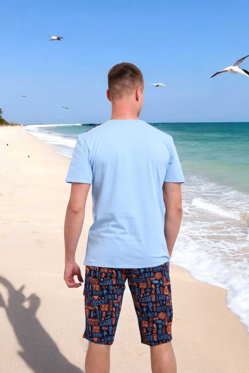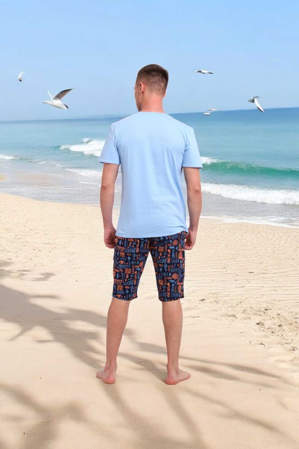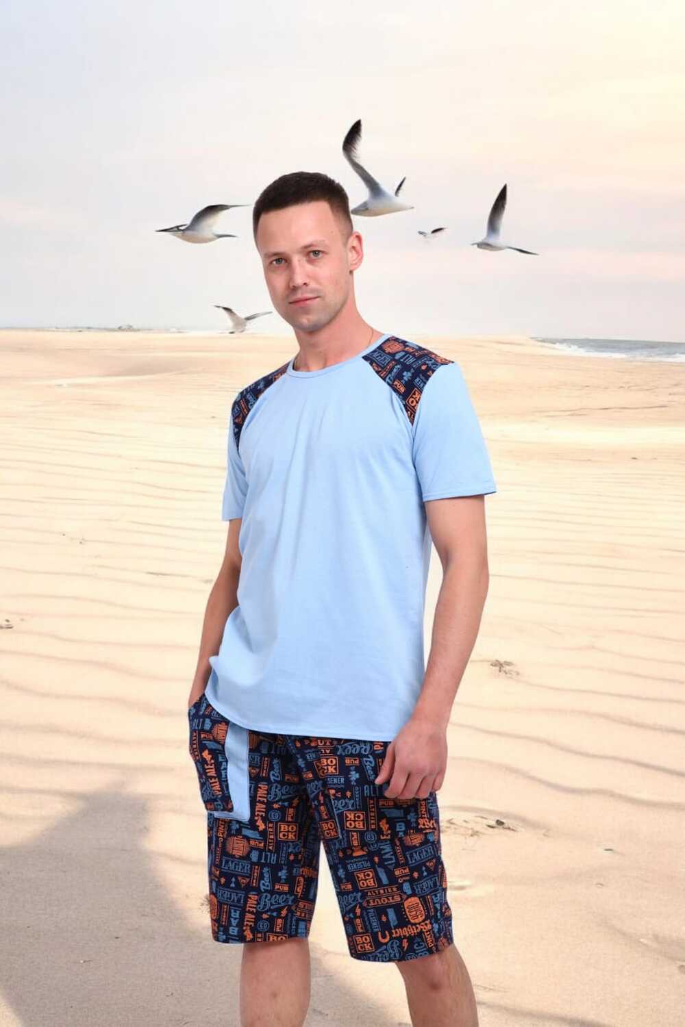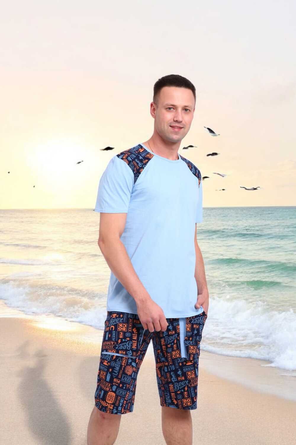 Погрузись в атмосферу свободы и летнего беззаботного отдыха с этим стильным мужским костюмом! Легкая футболка нежно-голубого цвета с оригинальными контрастными вставками на плечах это не просто одежда, а настроение.Костюм идеально подойдёт для отдыха на пляже, летней вечеринки или просто уютного дня дома. Свободный крой, приятная к телу ткань и яркий дизайн делают его настоящим must-have сезона.Выразительный дизайн, который притягивает взгляды, мягкий трикотаж, дарящий комфорт с утра до вечера, универсальность для дома, дачи, моря или прогулки, карманы в шортах для практичности, отлично сочетается с пляжными сандалиями или кедами.