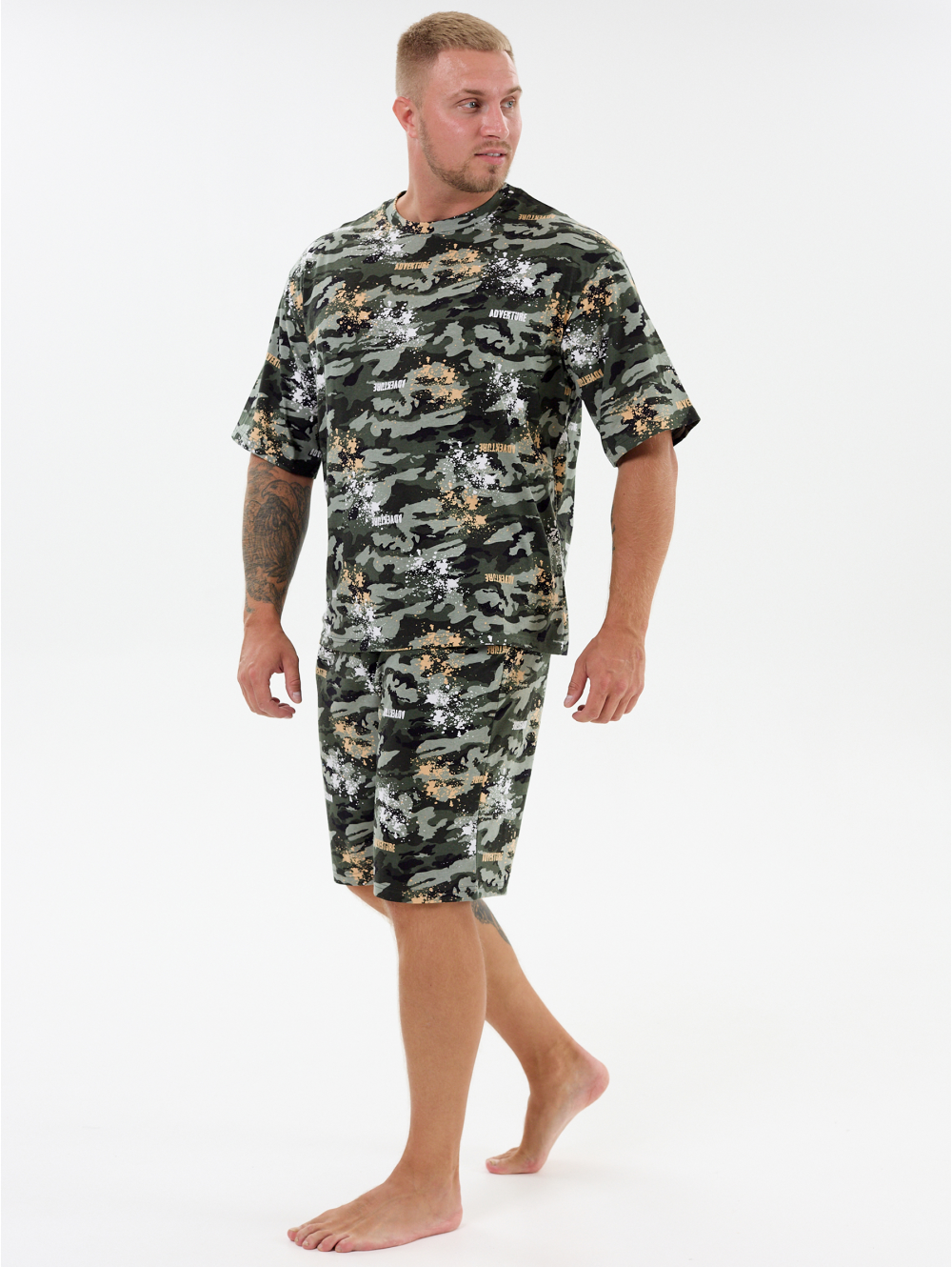 Костюм Альтаир состоит из футболки и шорт. Футболка оверсайз со спущенной линией плеча. Рукава втачные короткие. Шорты мужские полуприлегающие.
