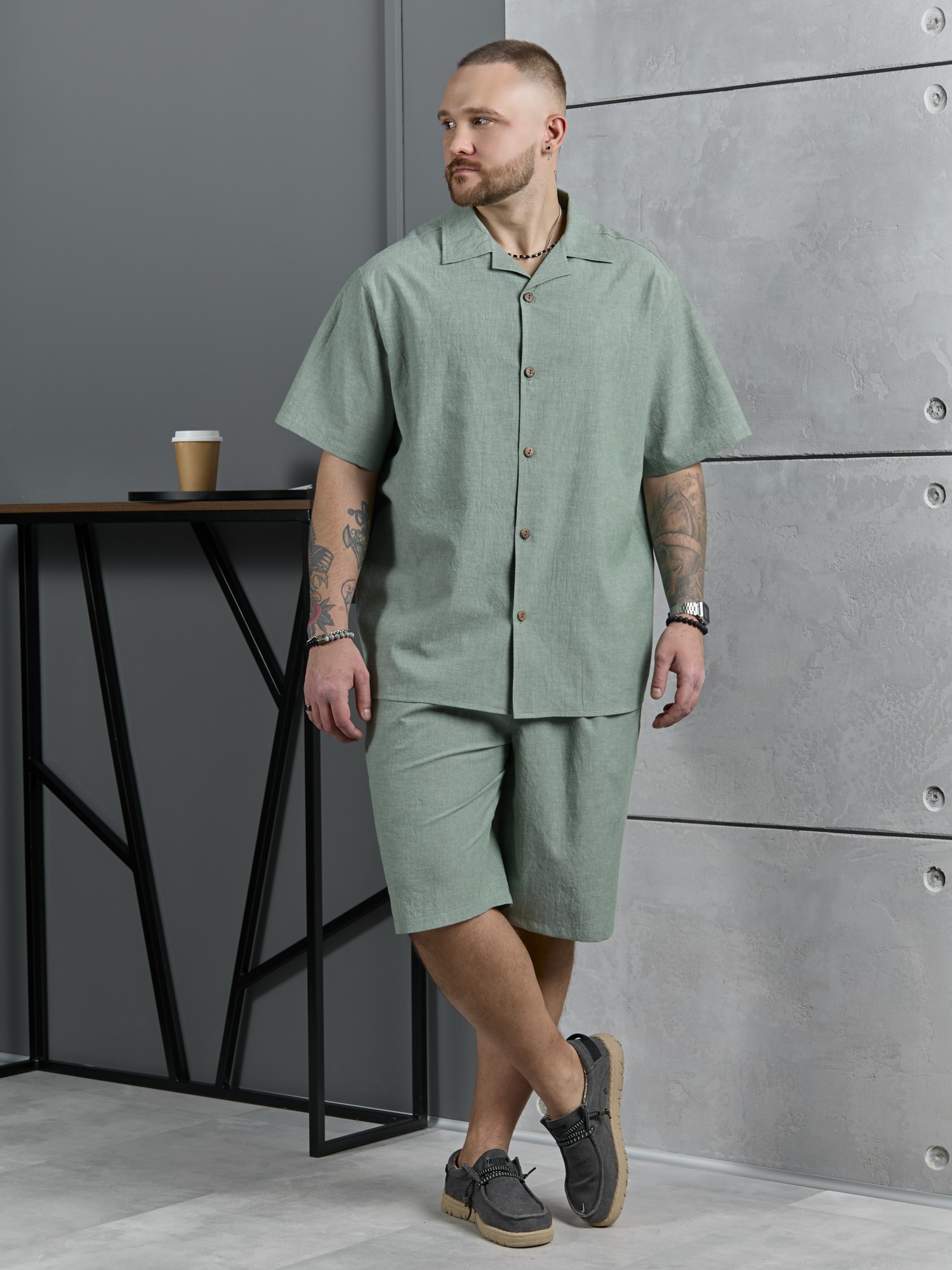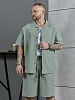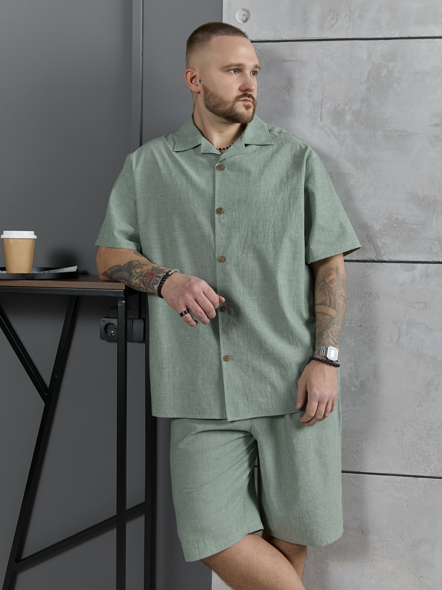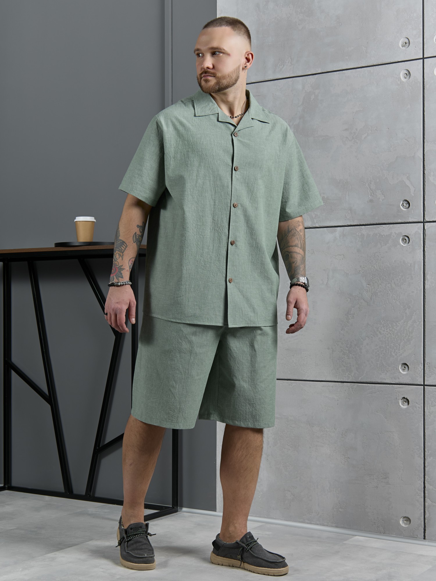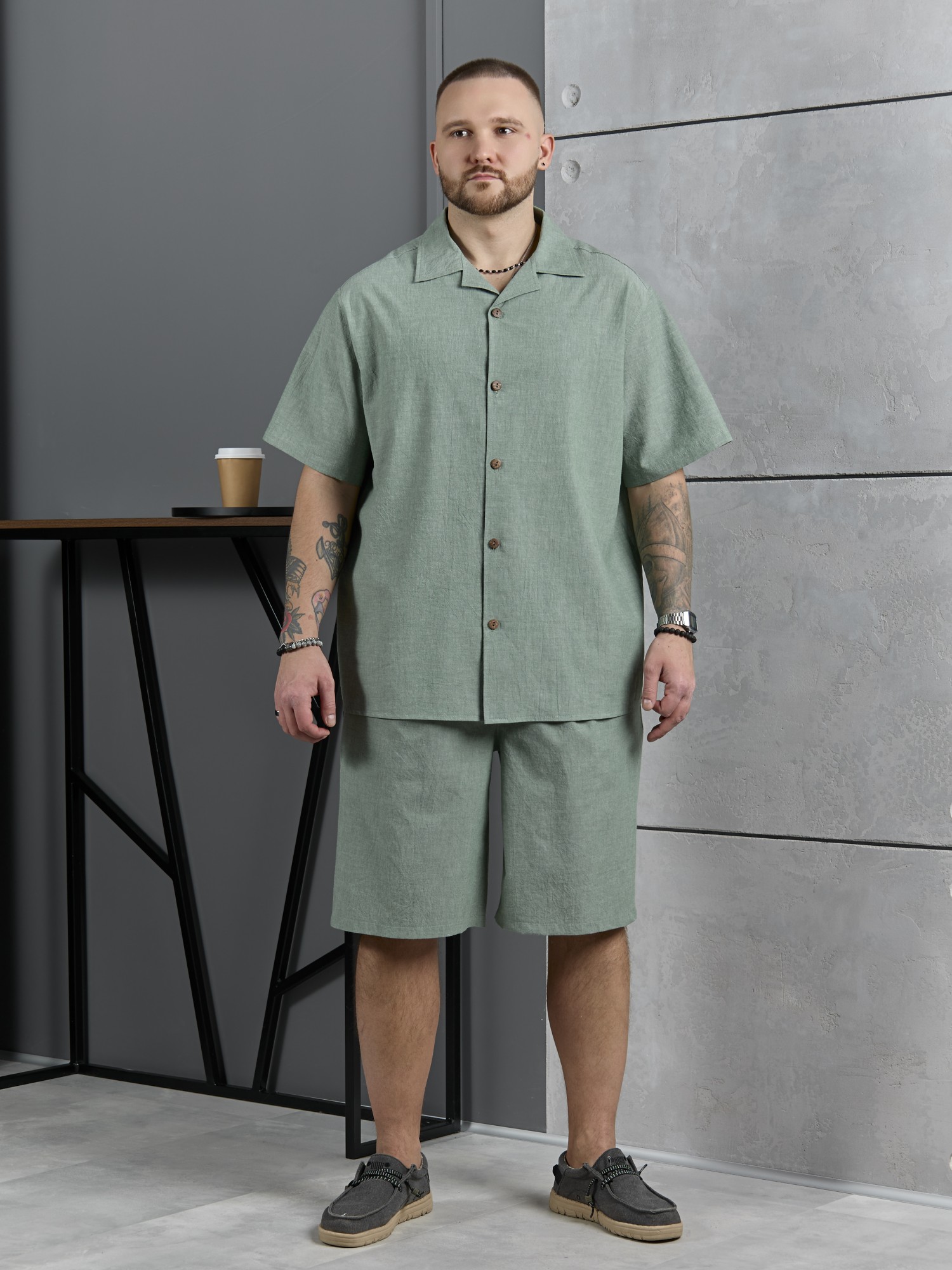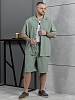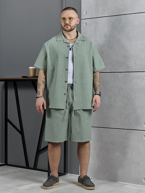 Костюм мужской, состоящий их рубашки и шорт из гладкокрашеного фактурного полотна. Рубашка - с короткими втачными рукавами, стояче-отложным воротником и центральной бортовой застежкой на обметанные петли и пуговицы. Спинка - с притачной кокеткой. По плечевым швам, воротнику, кокетке и швам втачивания рукавов настрочены отделочные строчки. Нижние срезы изделия и рукавов обработаны подгибкой. Шорты - удлиненные, на притачном поясе с эластичной тесьмой внутри и карманами в боковых шва. Средний шов переда обработан с имитацией застежки "гульфик". Для регулирования степени прилегания изделия по талии предусмотрен шнурок вставленный в пояс через две обметанные петли. Нижние срезы обработаны подгибкой.