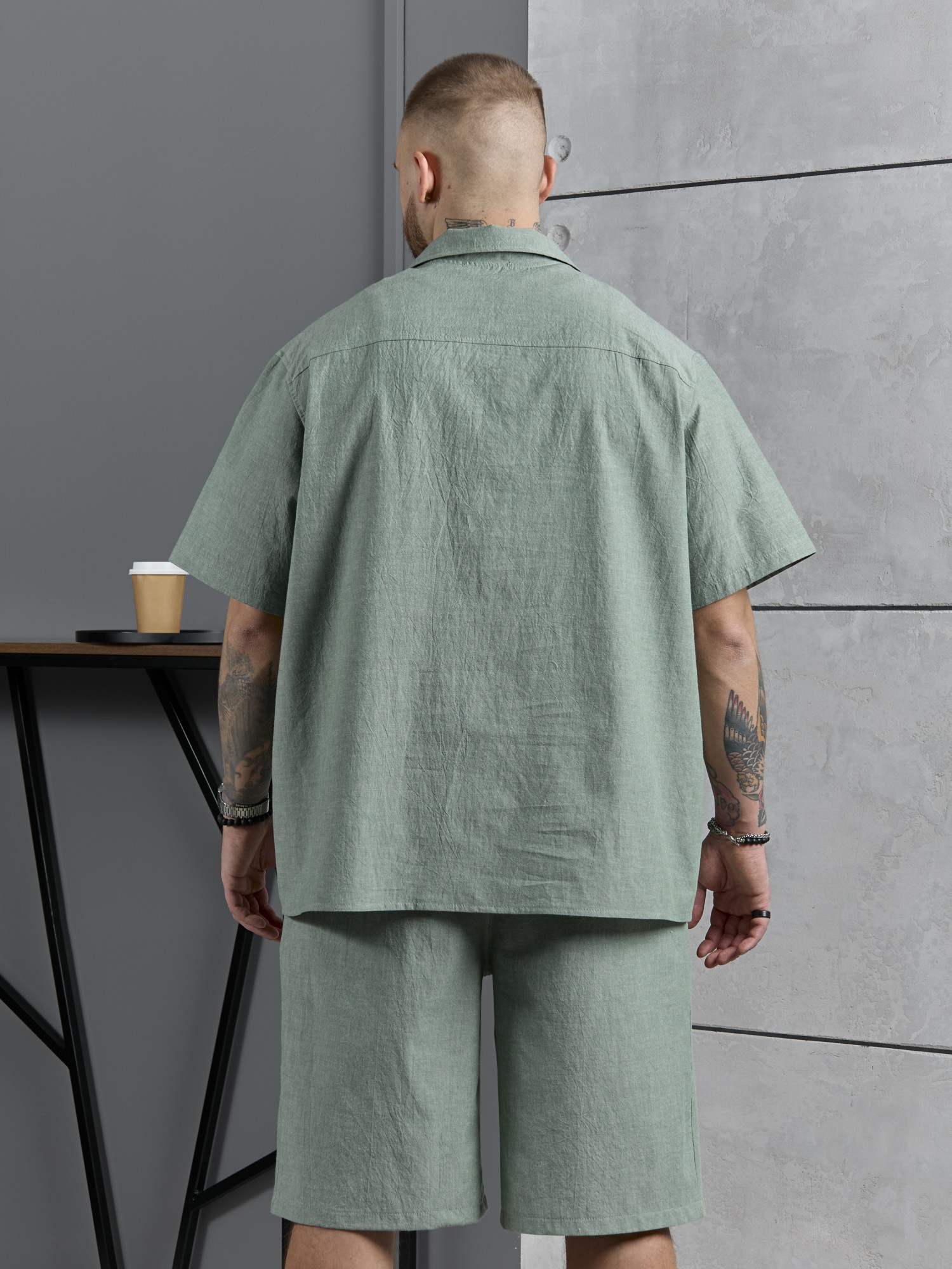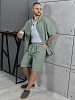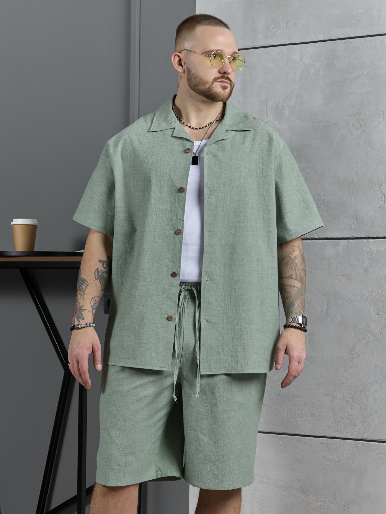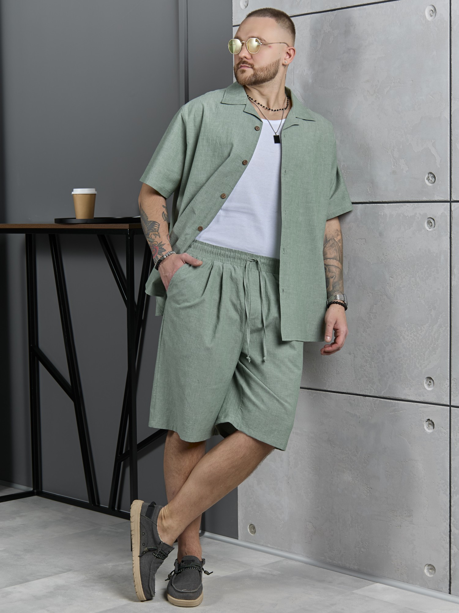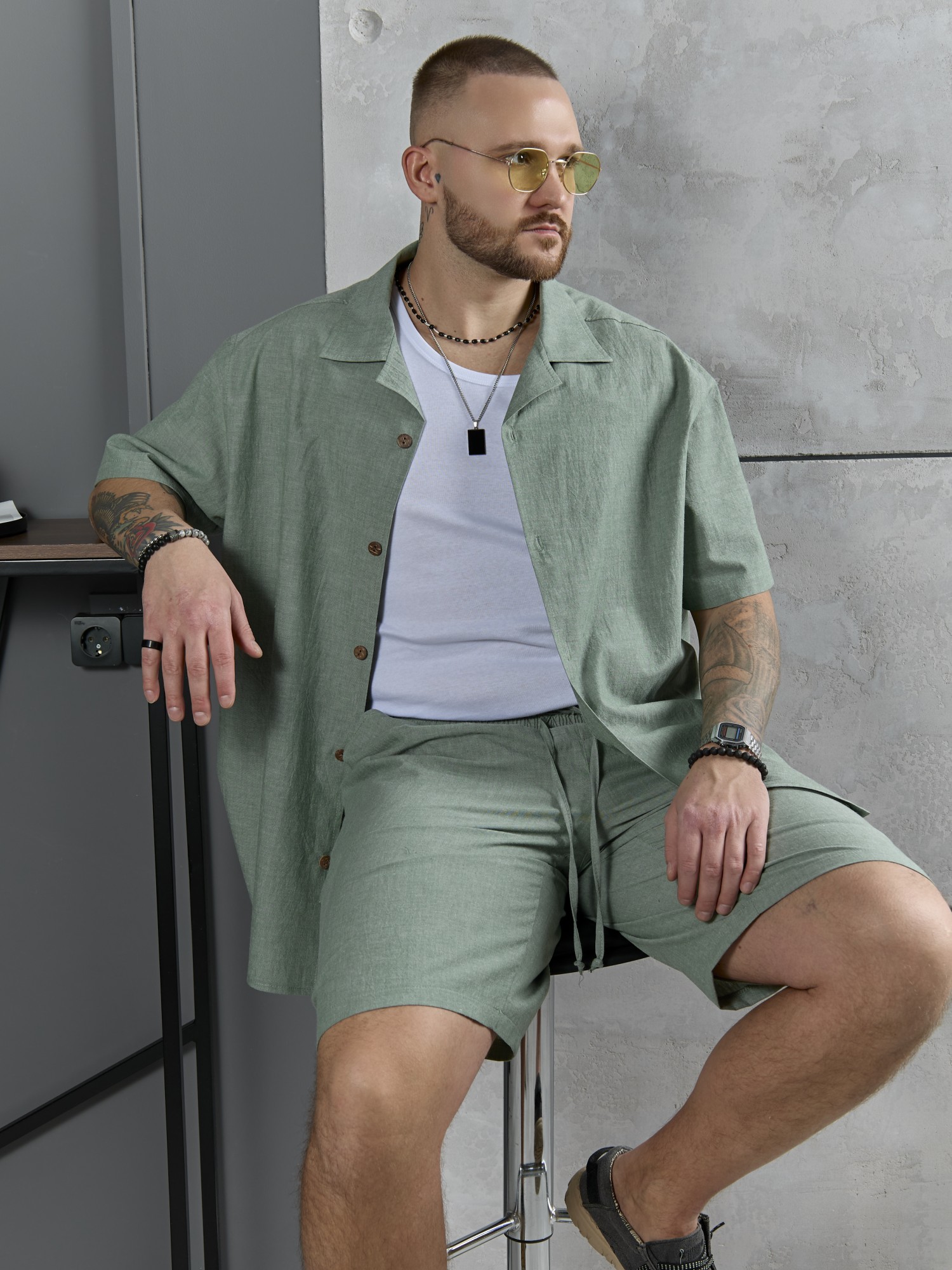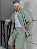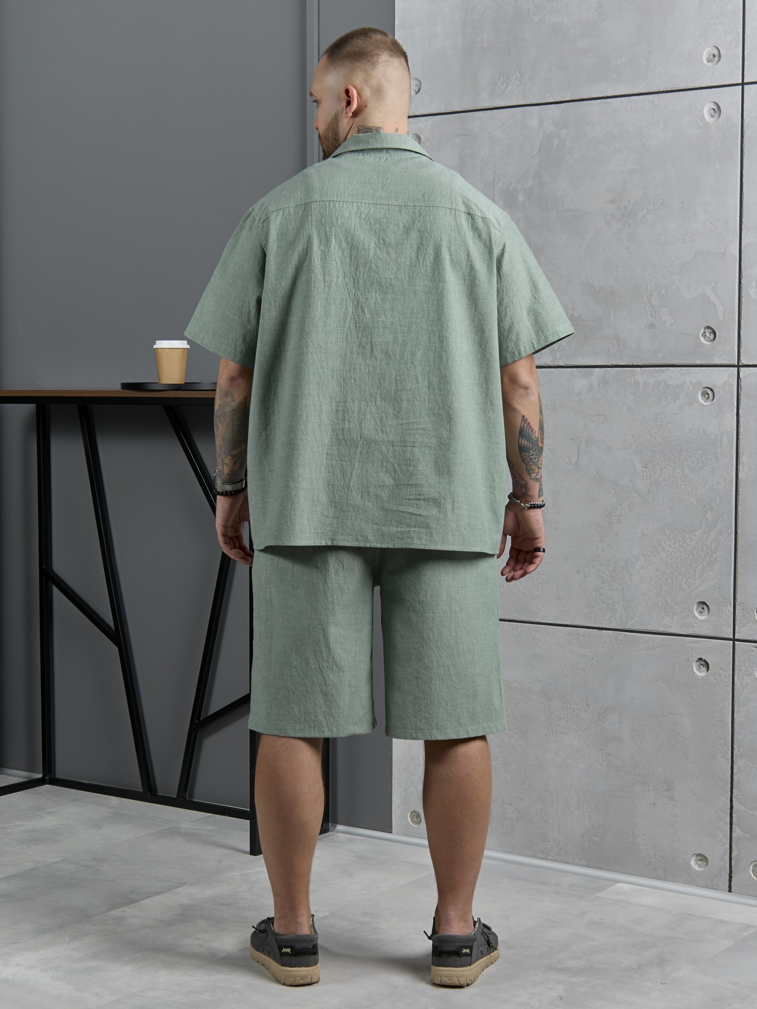 Костюм мужской, состоящий их рубашки и шорт из гладкокрашеного фактурного полотна. Рубашка - с короткими втачными рукавами, стояче-отложным воротником и центральной бортовой застежкой на обметанные петли и пуговицы. Спинка - с притачной кокеткой. По плечевым швам, воротнику, кокетке и швам втачивания рукавов настрочены отделочные строчки. Нижние срезы изделия и рукавов обработаны подгибкой. Шорты - удлиненные, на притачном поясе с эластичной тесьмой внутри и карманами в боковых шва. Средний шов переда обработан с имитацией застежки "гульфик". Для регулирования степени прилегания изделия по талии предусмотрен шнурок вставленный в пояс через две обметанные петли. Нижние срезы обработаны подгибкой.