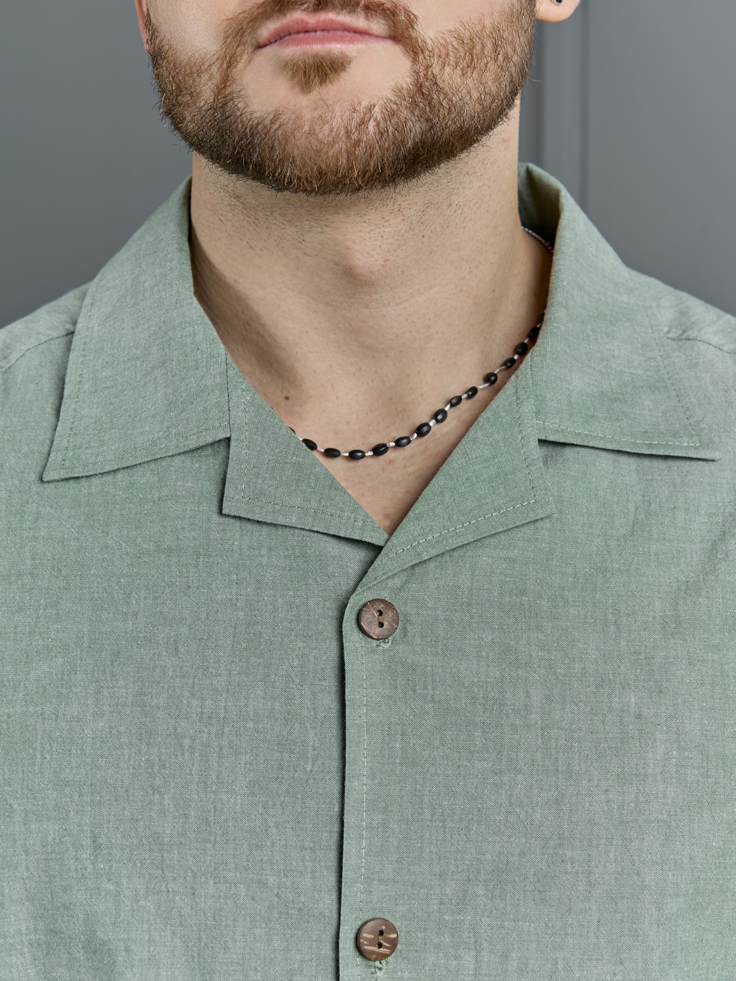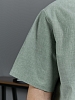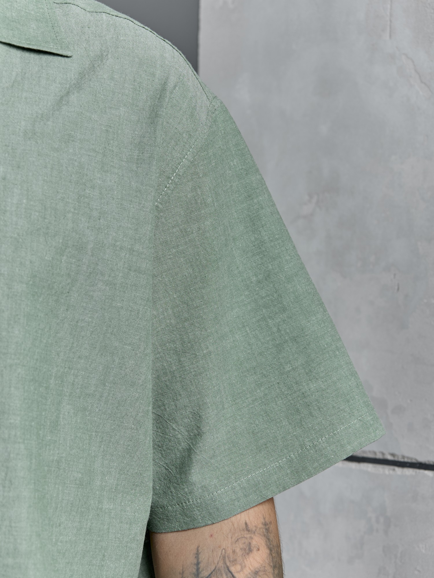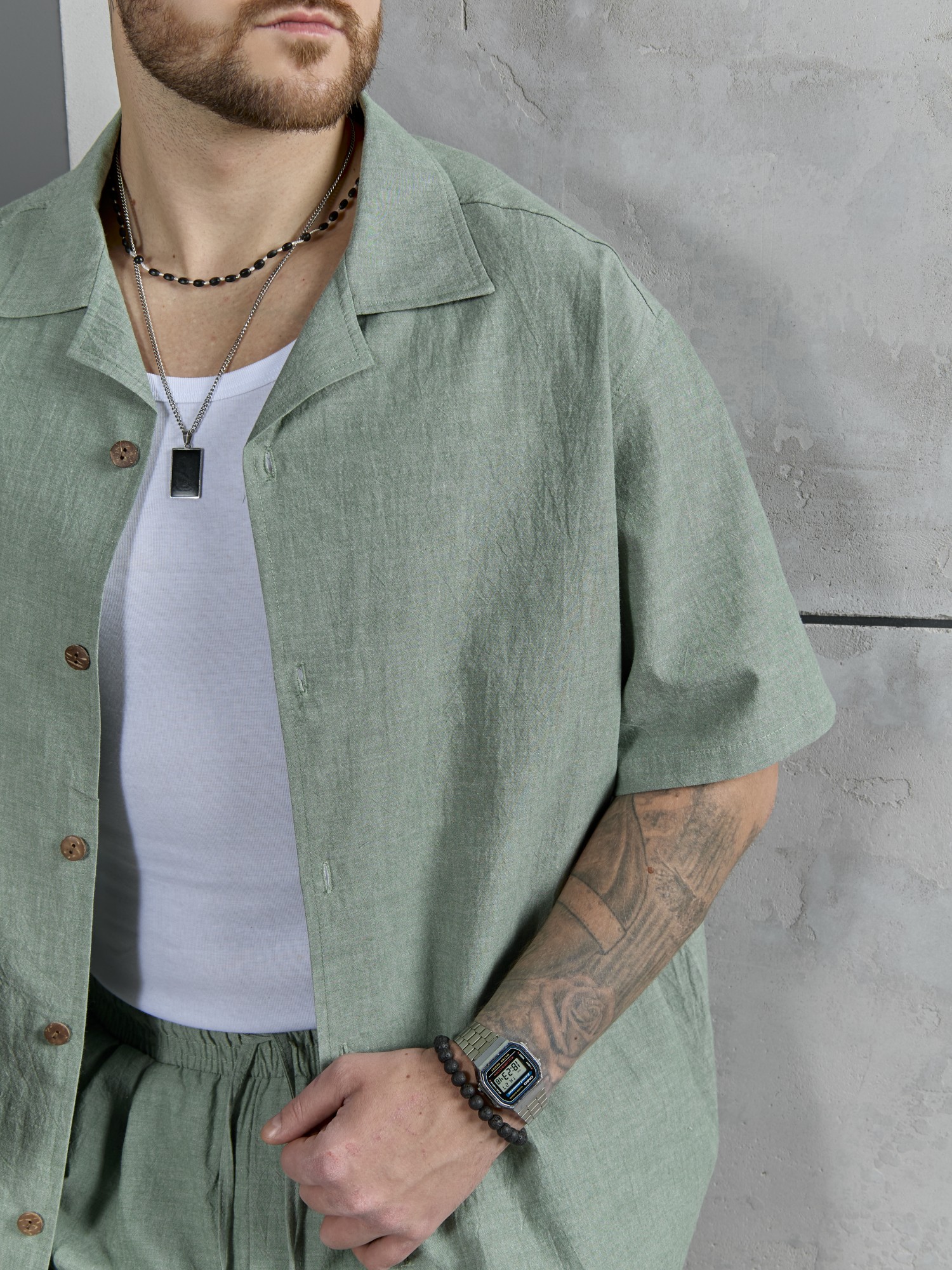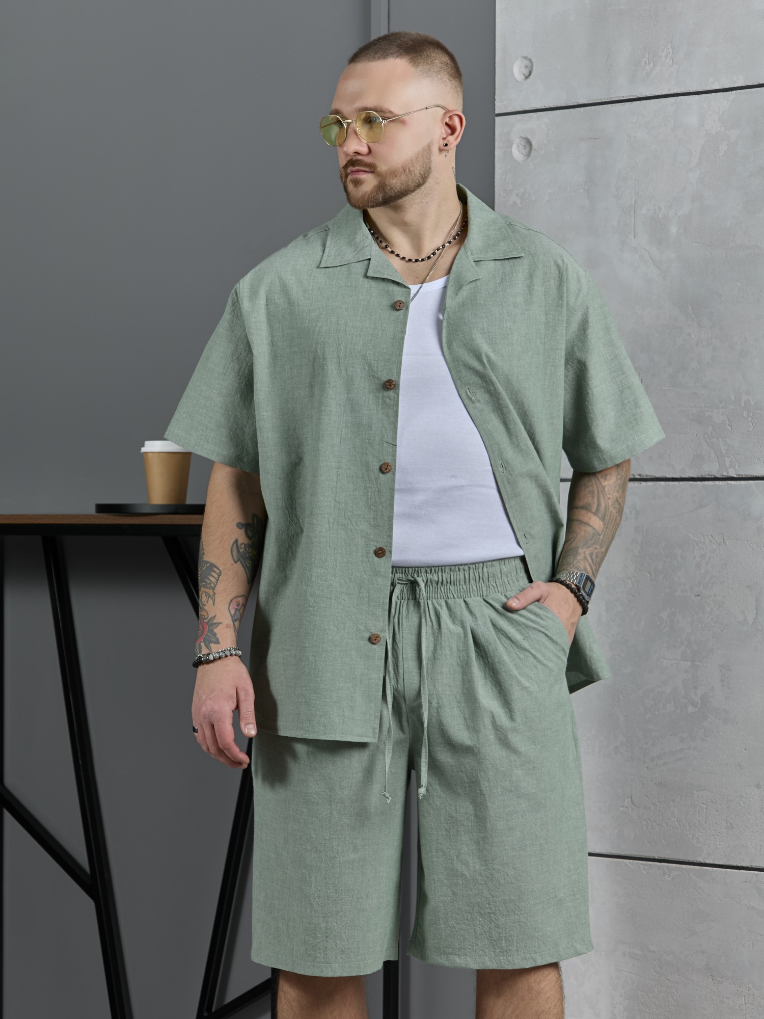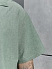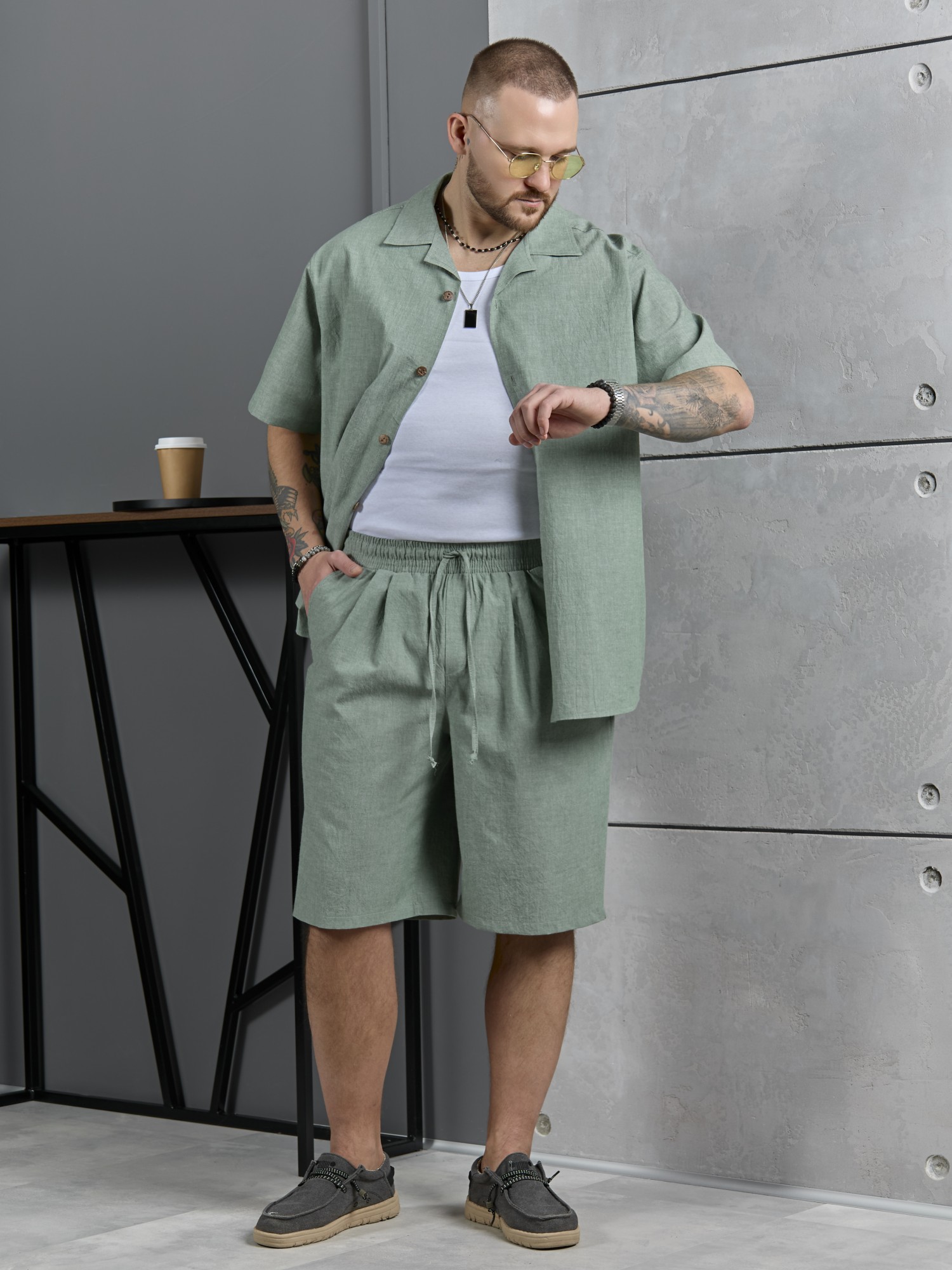 Костюм мужской, состоящий их рубашки и шорт из гладкокрашеного фактурного полотна. Рубашка - с короткими втачными рукавами, стояче-отложным воротником и центральной бортовой застежкой на обметанные петли и пуговицы. Спинка - с притачной кокеткой. По плечевым швам, воротнику, кокетке и швам втачивания рукавов настрочены отделочные строчки. Нижние срезы изделия и рукавов обработаны подгибкой. Шорты - удлиненные, на притачном поясе с эластичной тесьмой внутри и карманами в боковых шва. Средний шов переда обработан с имитацией застежки "гульфик". Для регулирования степени прилегания изделия по талии предусмотрен шнурок вставленный в пояс через две обметанные петли. Нижние срезы обработаны подгибкой.
