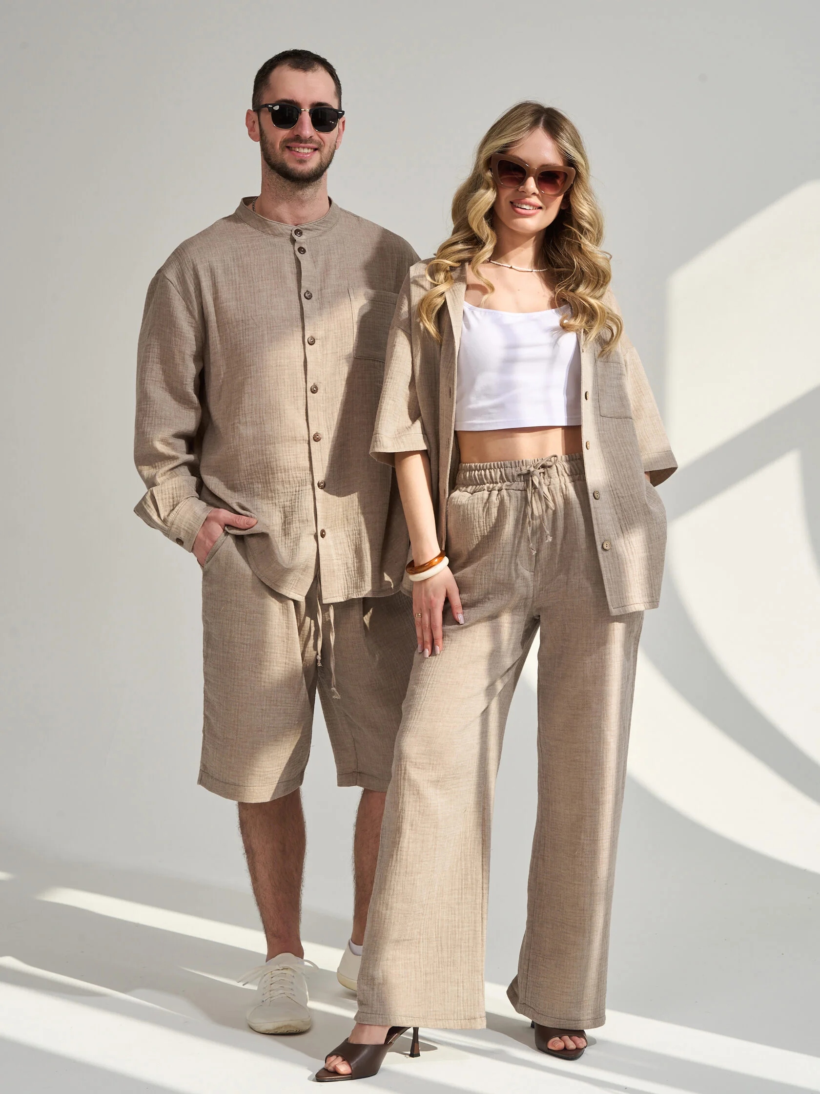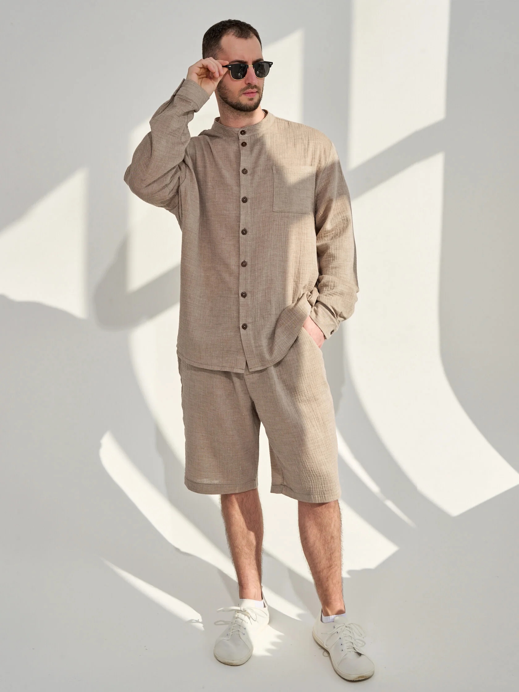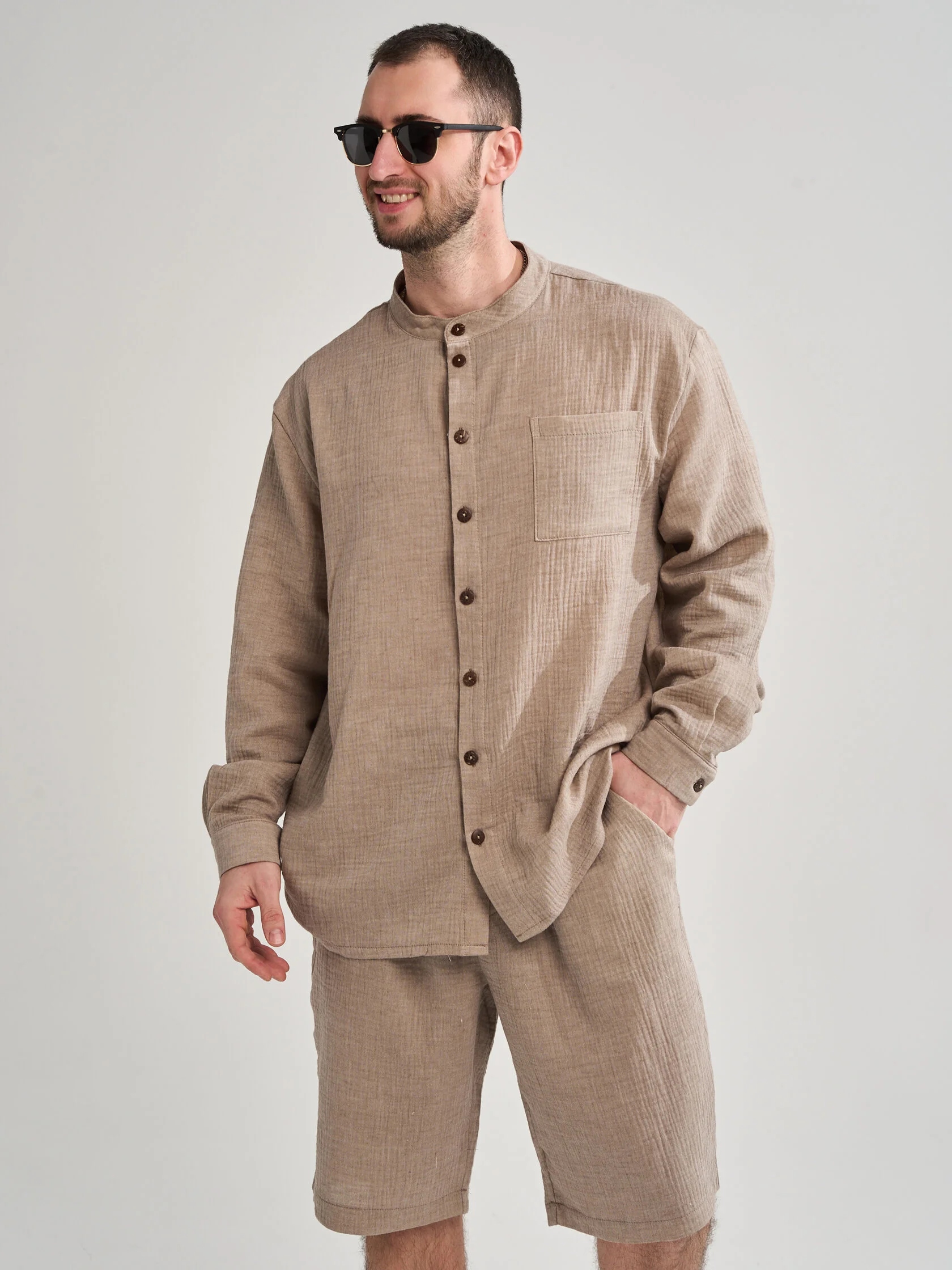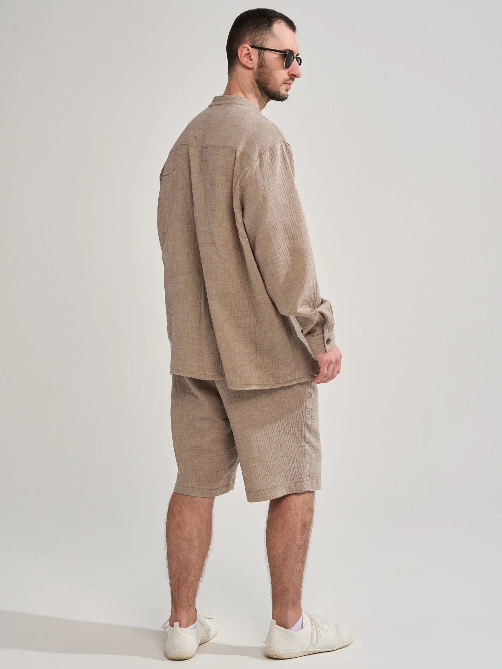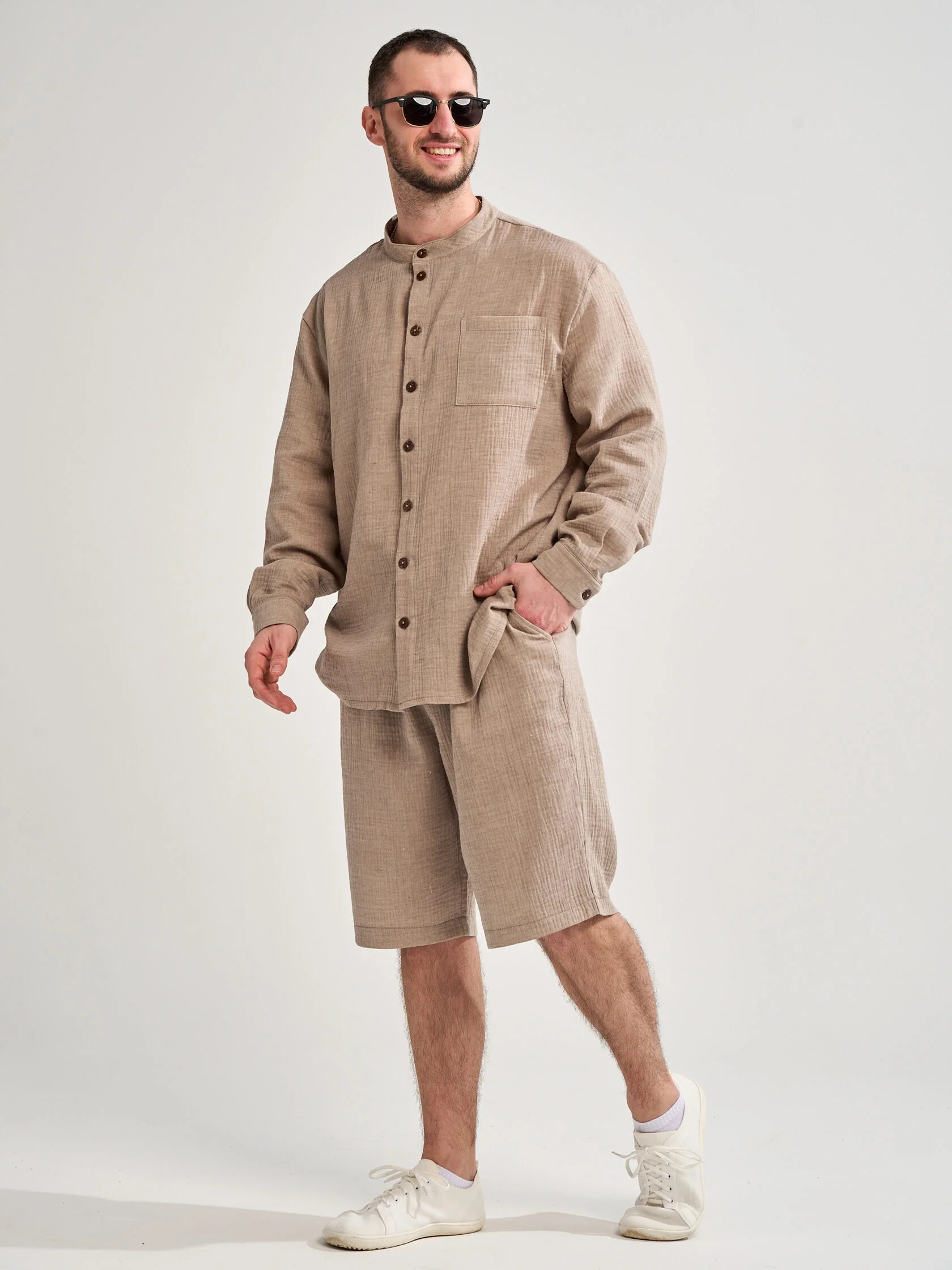 Мужской костюм с шортами из муслина — лёгкий и комфортный комплект, подходящий для жаркой погоды, пляжного отдыха, прогулок или домашнего использования. Муслин — тонкая хлопковая ткань, которая хорошо пропускает воздух, быстро сохнет и не мнётся.