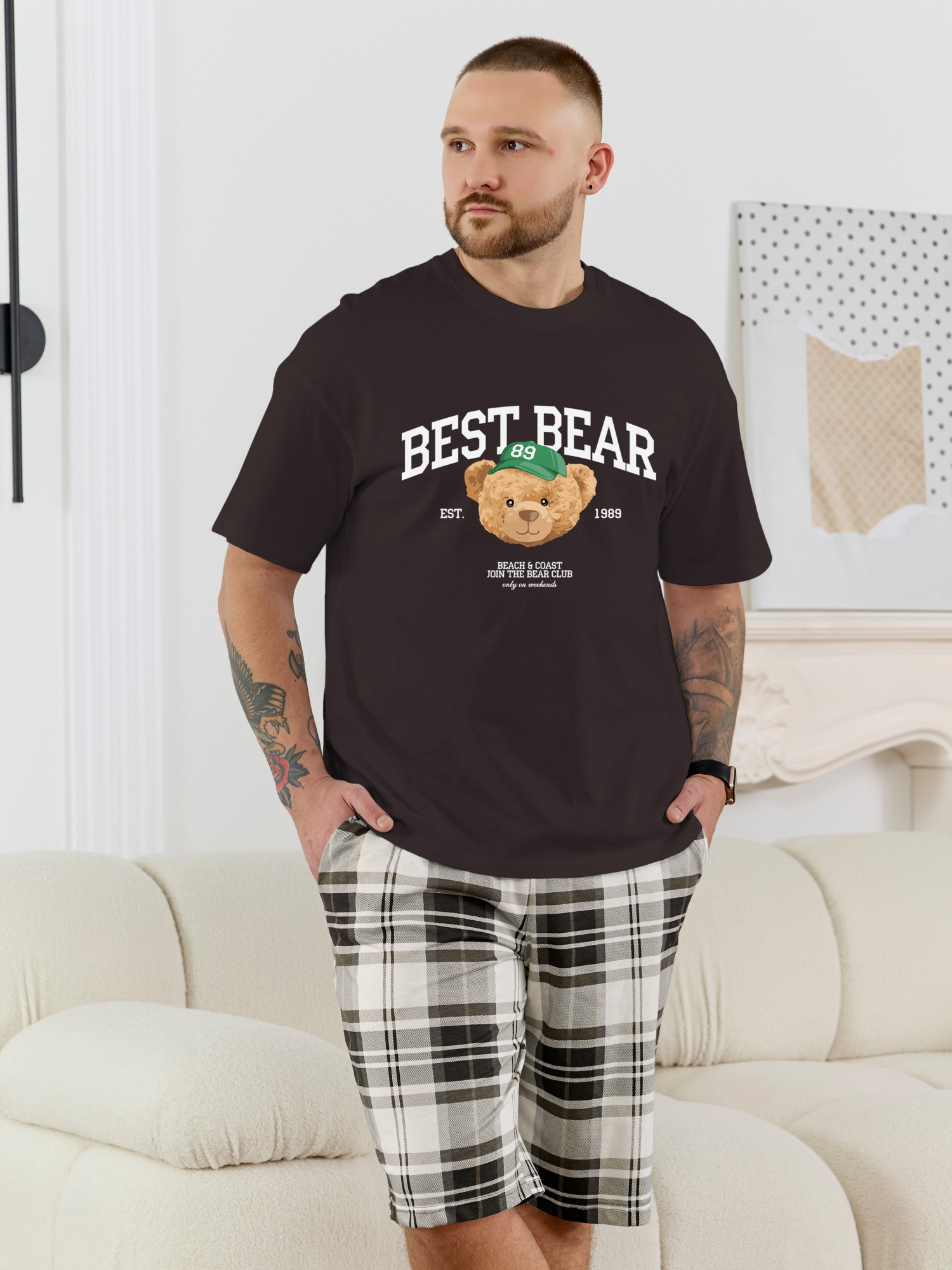 Костюм мужской, состоящий из футболки и шорт. Футболка однотонная с принтом на груди; модель свободная, со спущенной линией плеч, втачными рукавами, овальным вырезом горловины. Шорты из полотна с набивным рисунком эксклюзивного дизайна, с боковыми карманами с обтачными входами, на притачном поясе с отстроченной эластичной тесьмой.