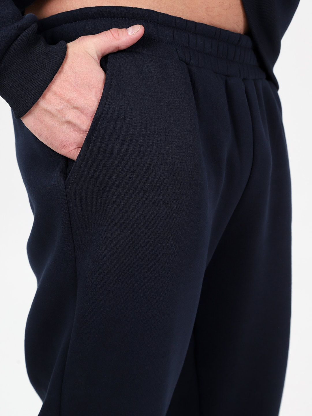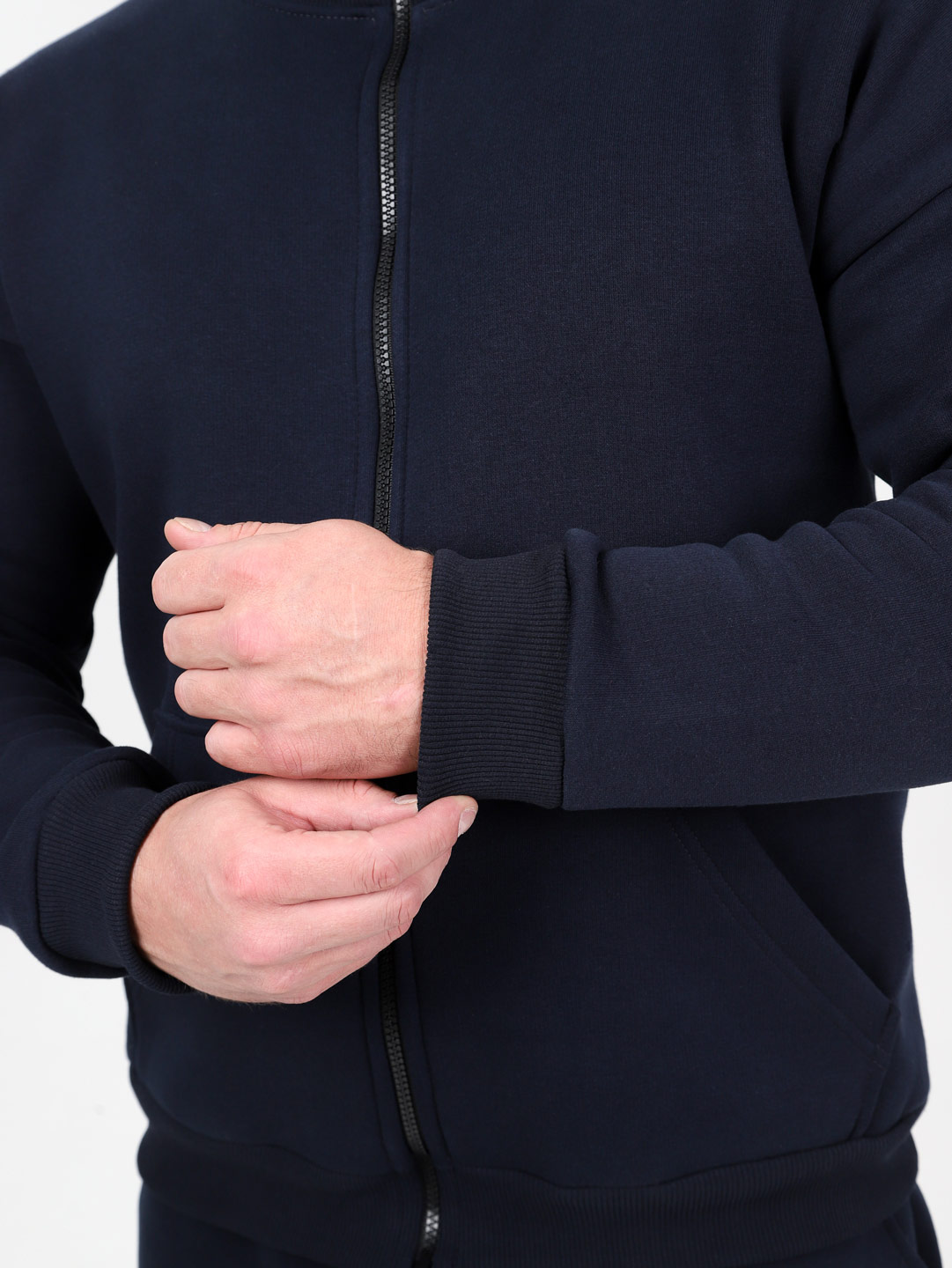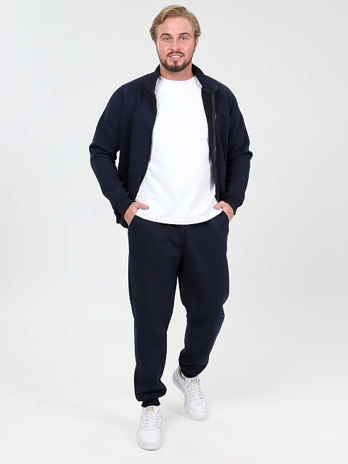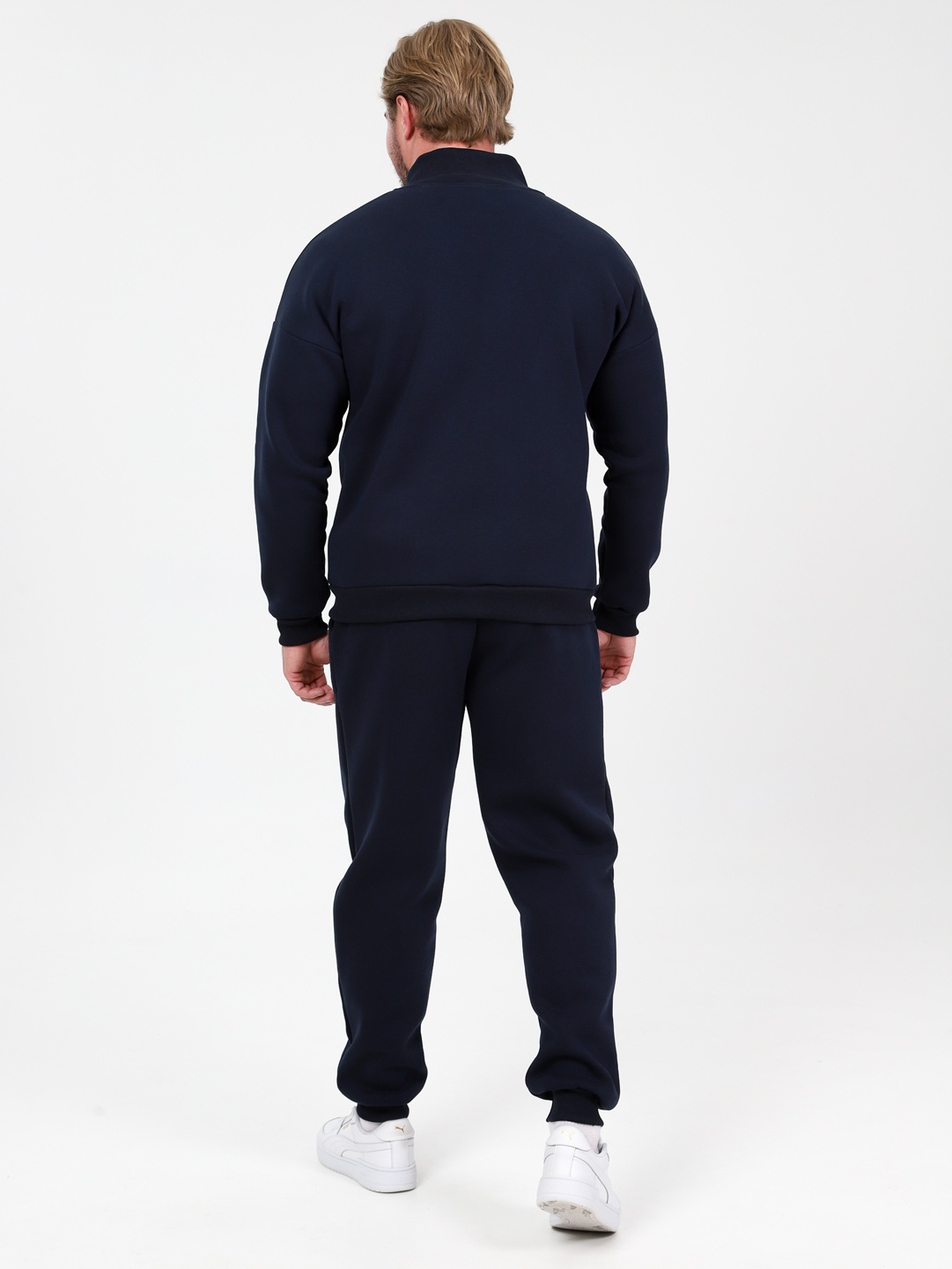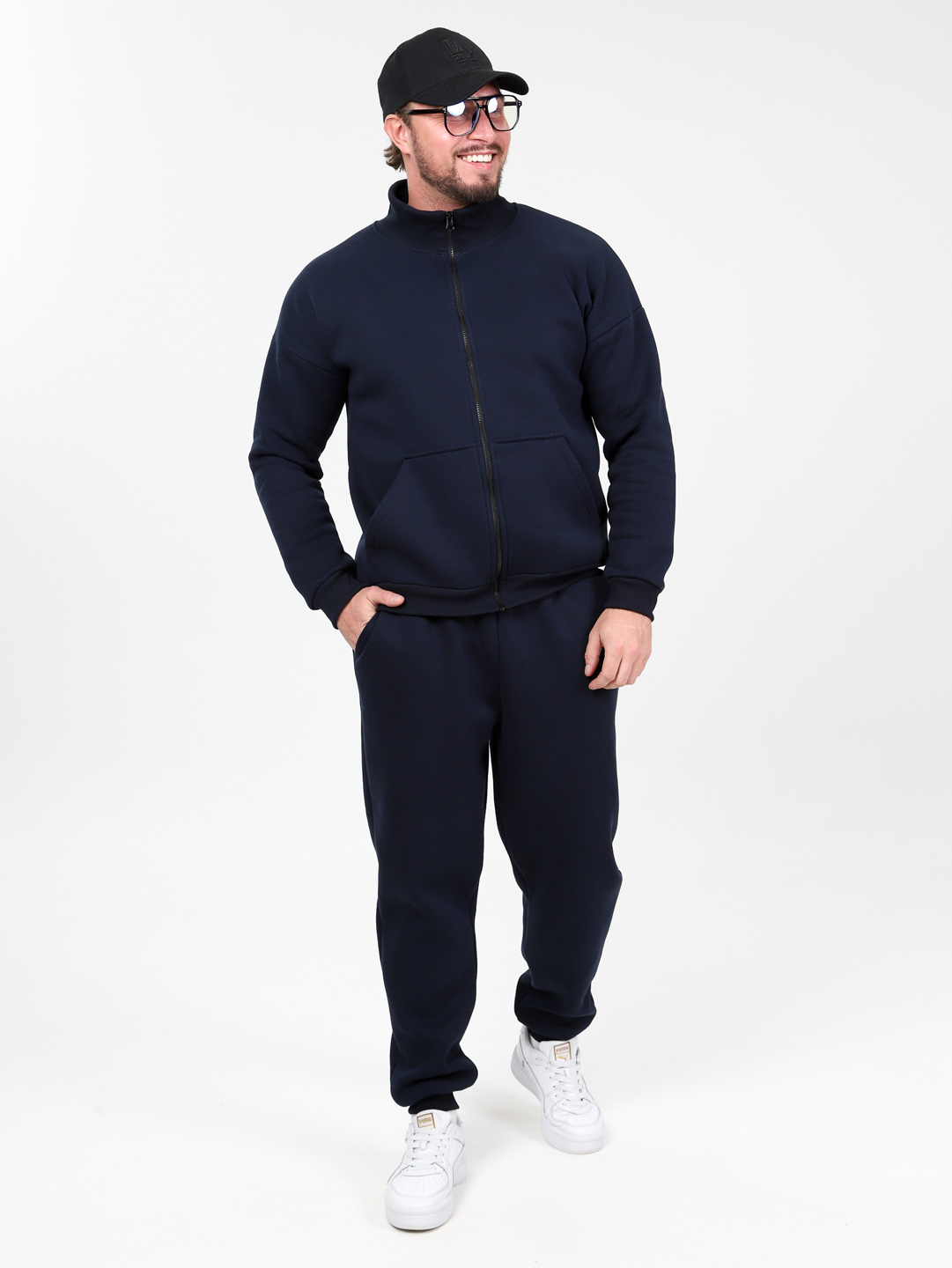 Утепленный мужской костюм из футера с начесом, с крашением варенка. Толстовка с высоким горлом на молнии, карманом кенгуру и манжетами из кашкорсе по низу рукавов и кофты. Брюки джоггеры с карманами в боковых швах, поясом на резинке с несколькими отстрочками и манжетами из кашкорсе по низу брюк.