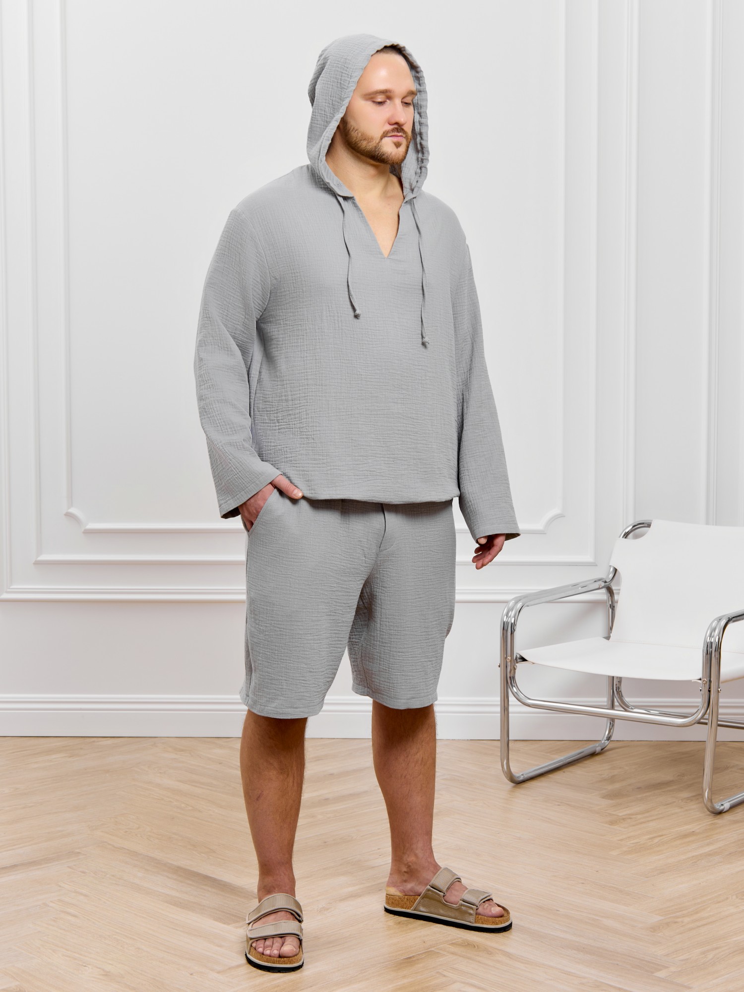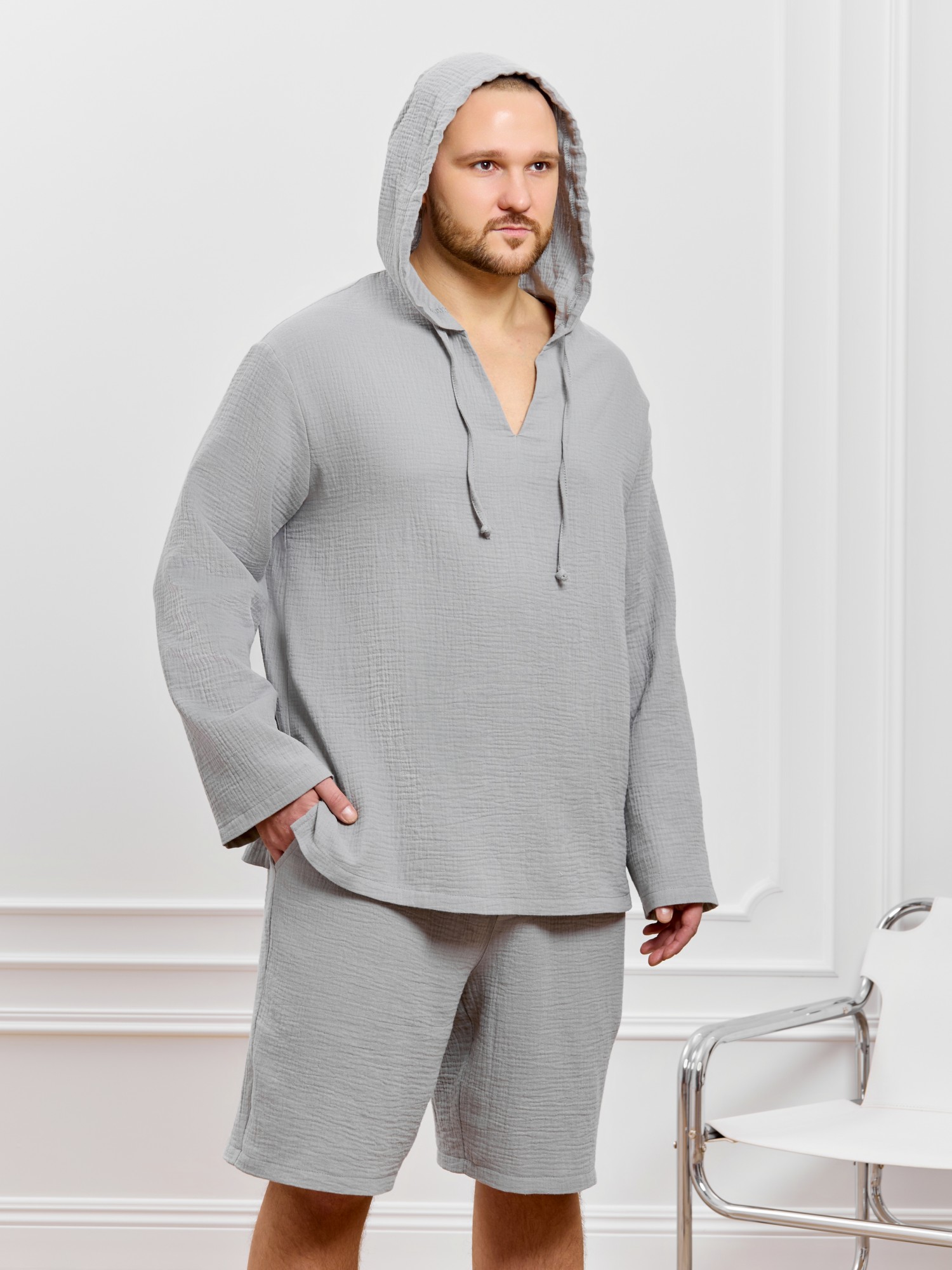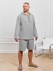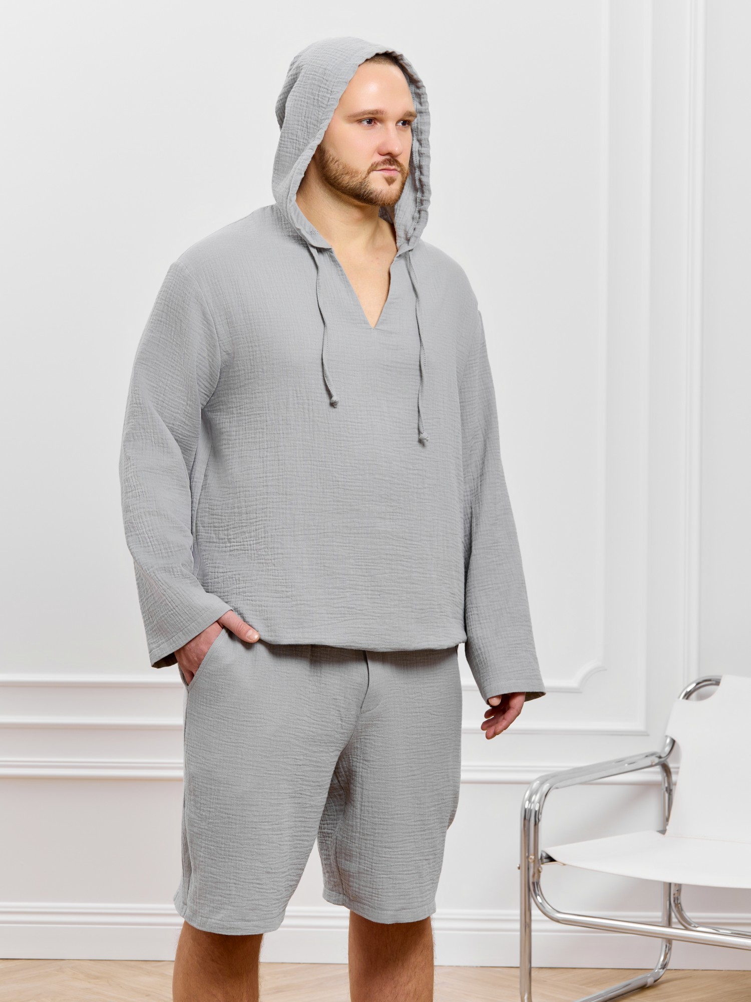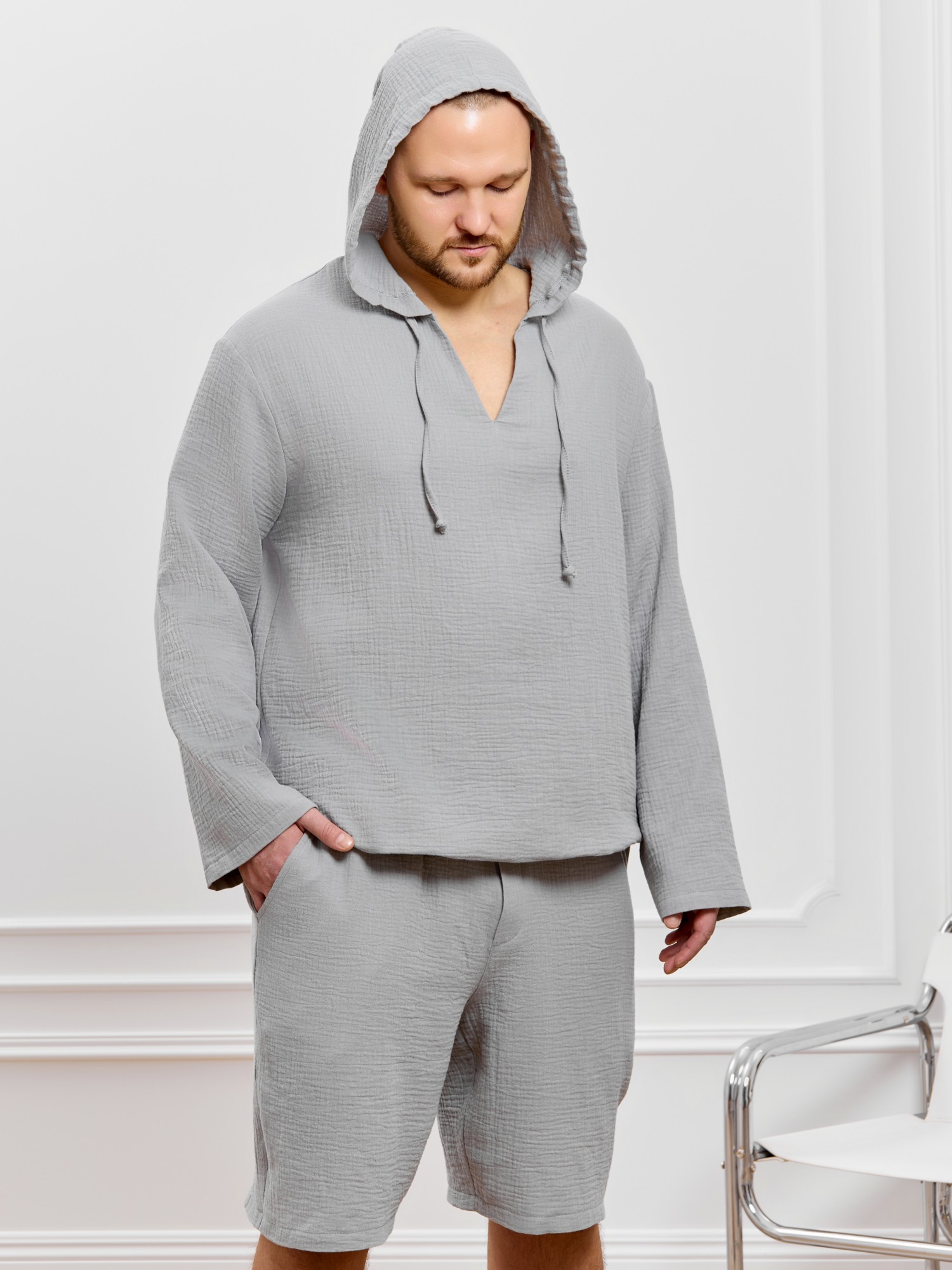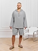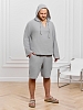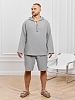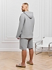 Костюм мужской из фактурного гладкокрашеного полотна, состоящий их джемпера и брюк. Джемпер - с капюшоном, длинными втачными рукавами и V-образным вырезом горловины спереди. В шве подгибки переднего края капюшона вставлен шнурок из основного материала. Нижние срезы рукавов и низ изделия обработаны подгибкой. Шорты - классическогь покроя, на притачном поясе с эластичной тесьмой внутри, с карманами в боковых швах. Нижние срезы обработаны подгибкой.