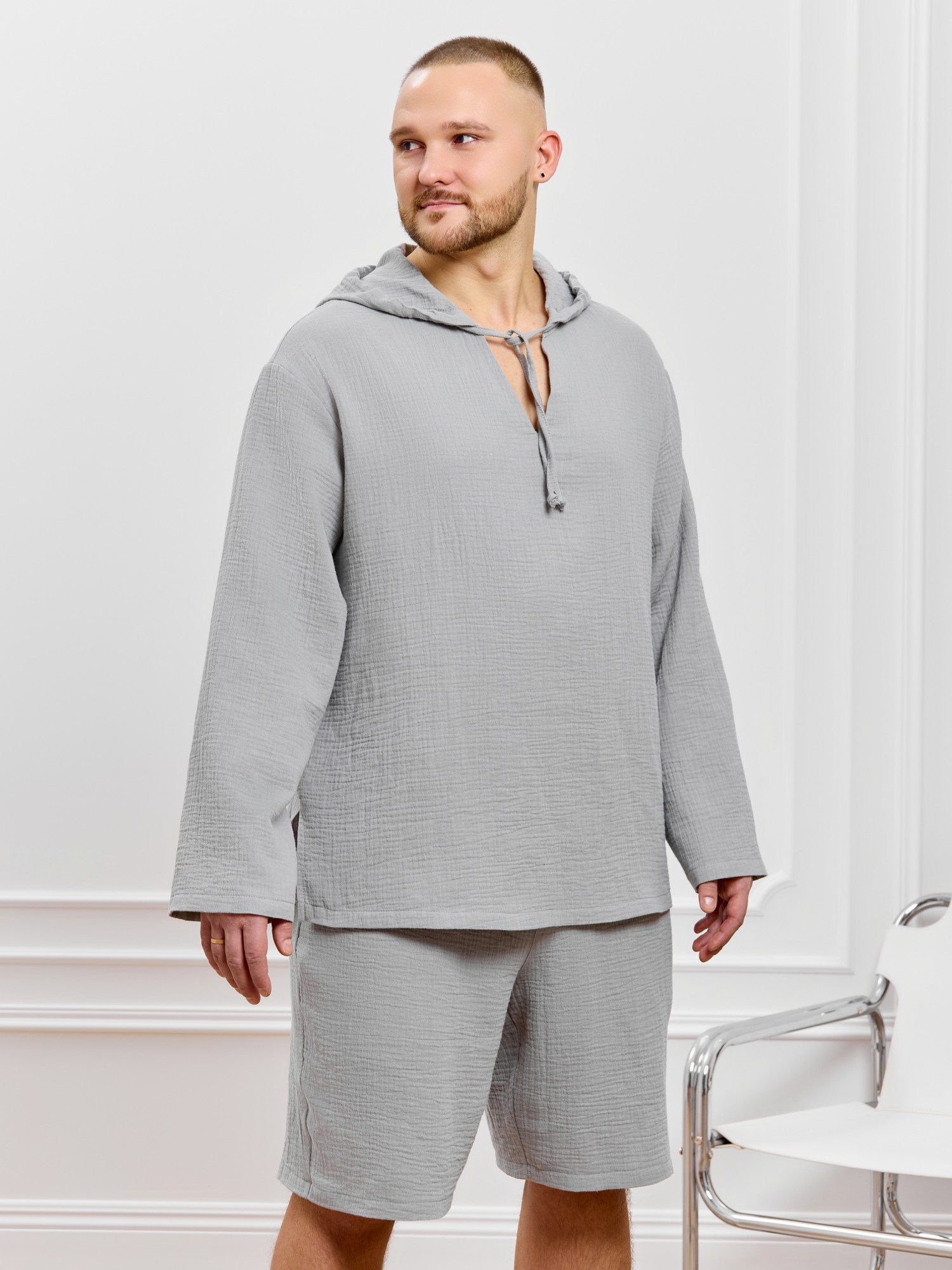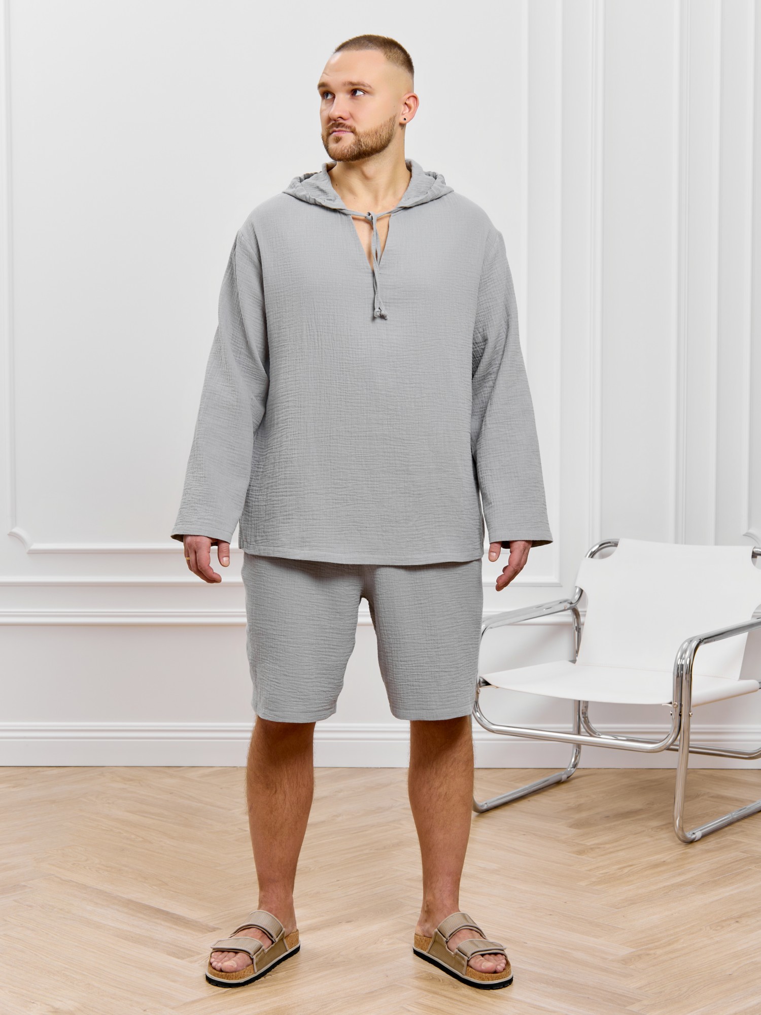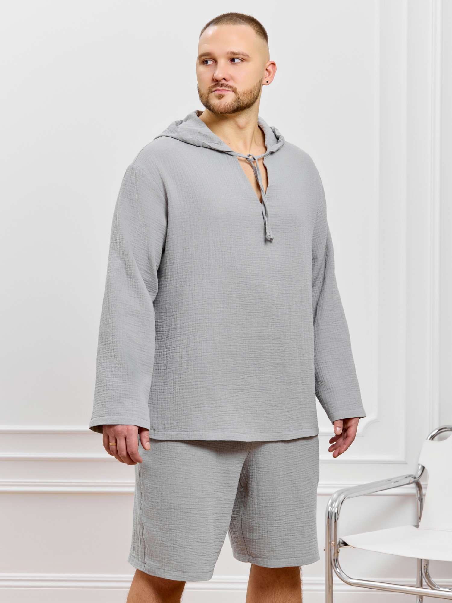Костюм мужской из фактурного гладкокрашеного полотна, состоящий их джемпера и брюк. Джемпер - с капюшоном, длинными втачными рукавами и V-образным вырезом горловины спереди. В шве подгибки переднего края капюшона вставлен шнурок из основного материала. Нижние срезы рукавов и низ изделия обработаны подгибкой. Шорты - классическогь покроя, на притачном поясе с эластичной тесьмой внутри, с карманами в боковых швах. Нижние срезы обработаны подгибкой.