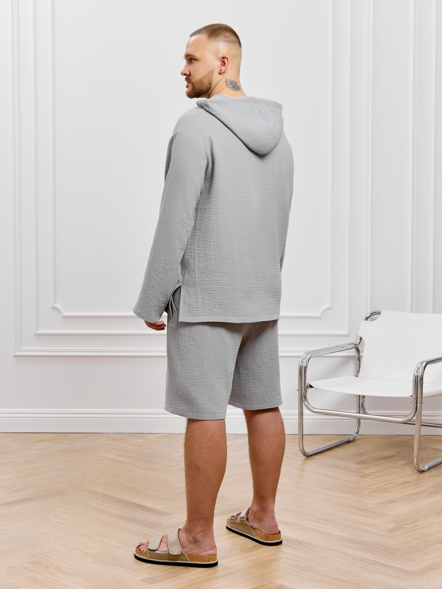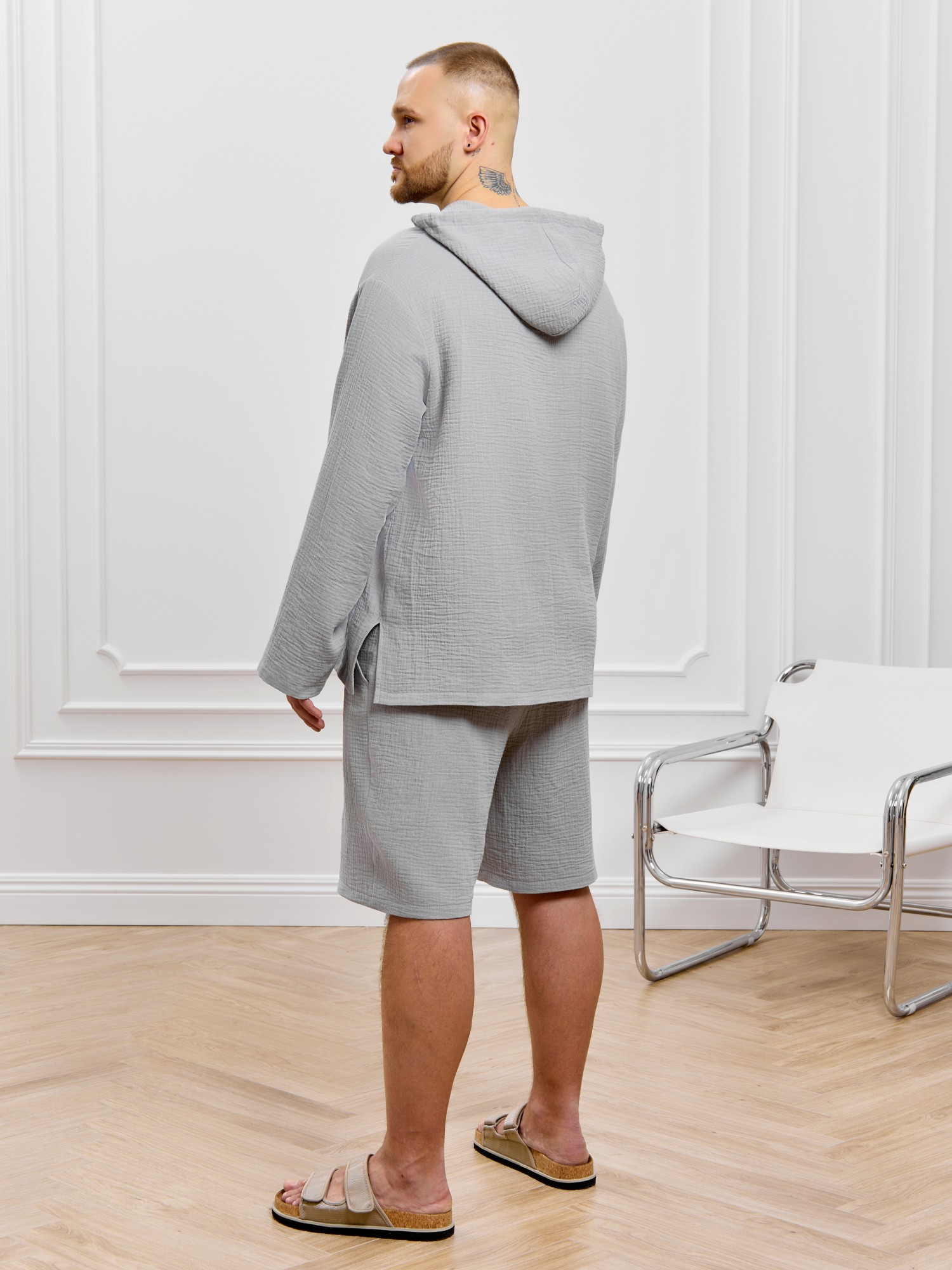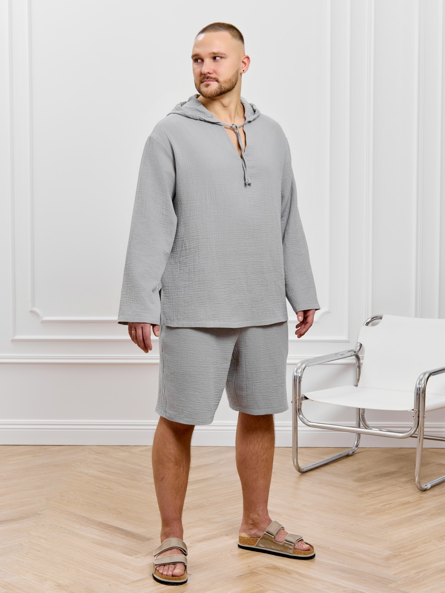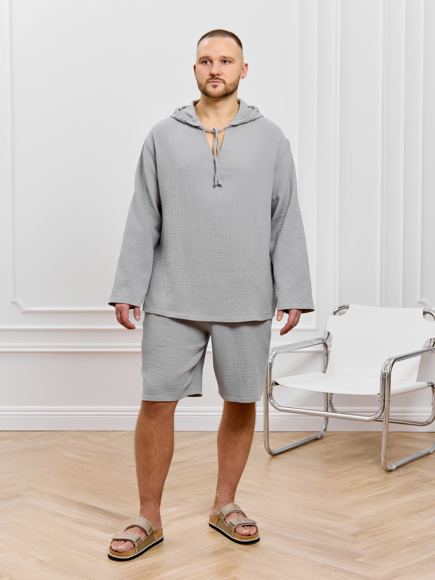 Костюм мужской из фактурного гладкокрашеного полотна, состоящий их джемпера и брюк. Джемпер - с капюшоном, длинными втачными рукавами и V-образным вырезом горловины спереди. В шве подгибки переднего края капюшона вставлен шнурок из основного материала. Нижние срезы рукавов и низ изделия обработаны подгибкой. Шорты - классическогь покроя, на притачном поясе с эластичной тесьмой внутри, с карманами в боковых швах. Нижние срезы обработаны подгибкой.