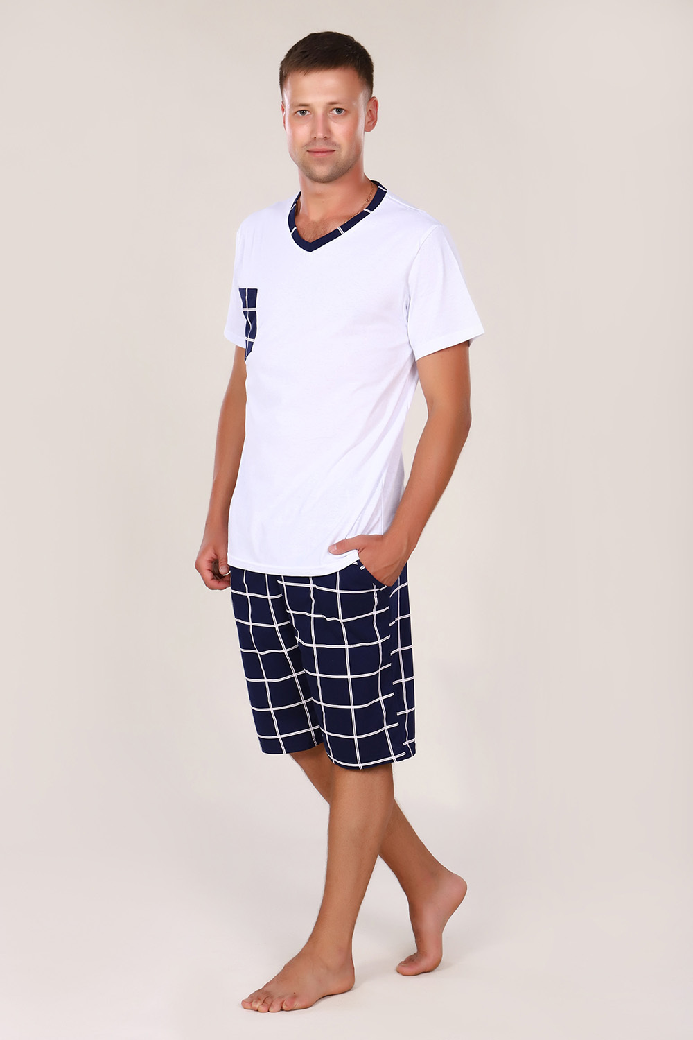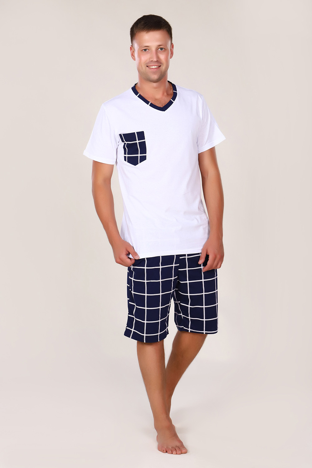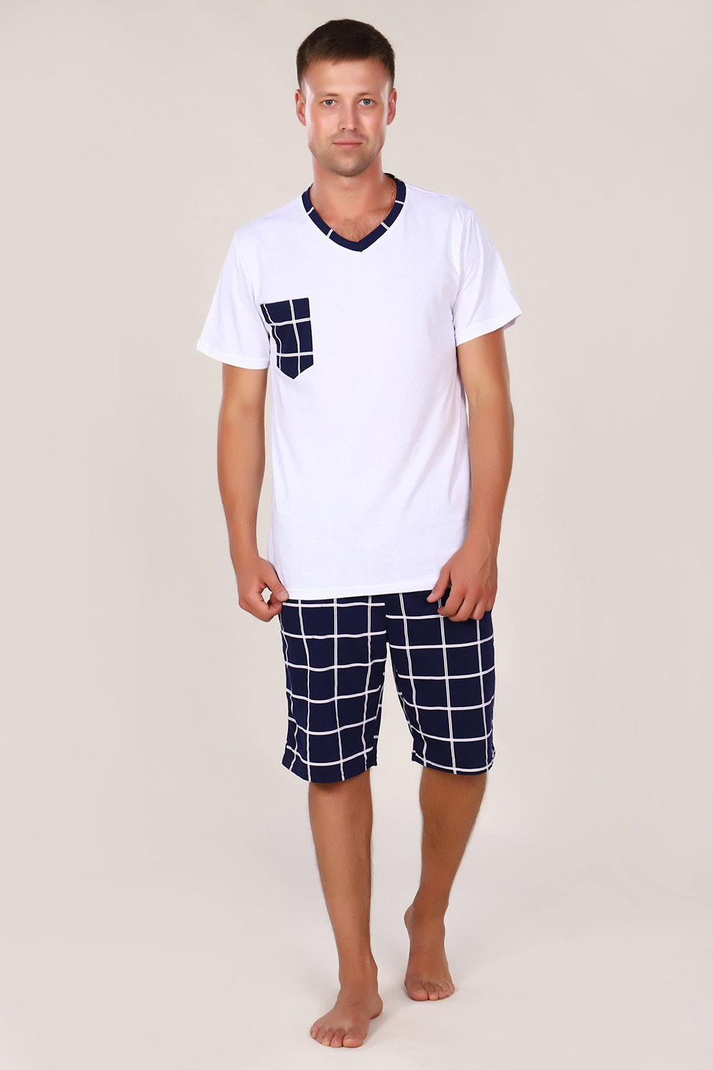 Мужской костюм из кулирки с шортами — это комплект из футболки и шорт, изготовленный из 100% хлопка. Кулирка — тонкое трикотажное полотно, которое хорошо тянется, не мнётся и позволяет коже дышать. Такие костюмы подходят для дома, отдыха, спорта или пляжа.