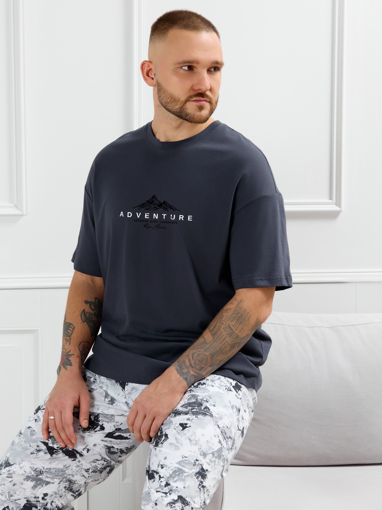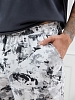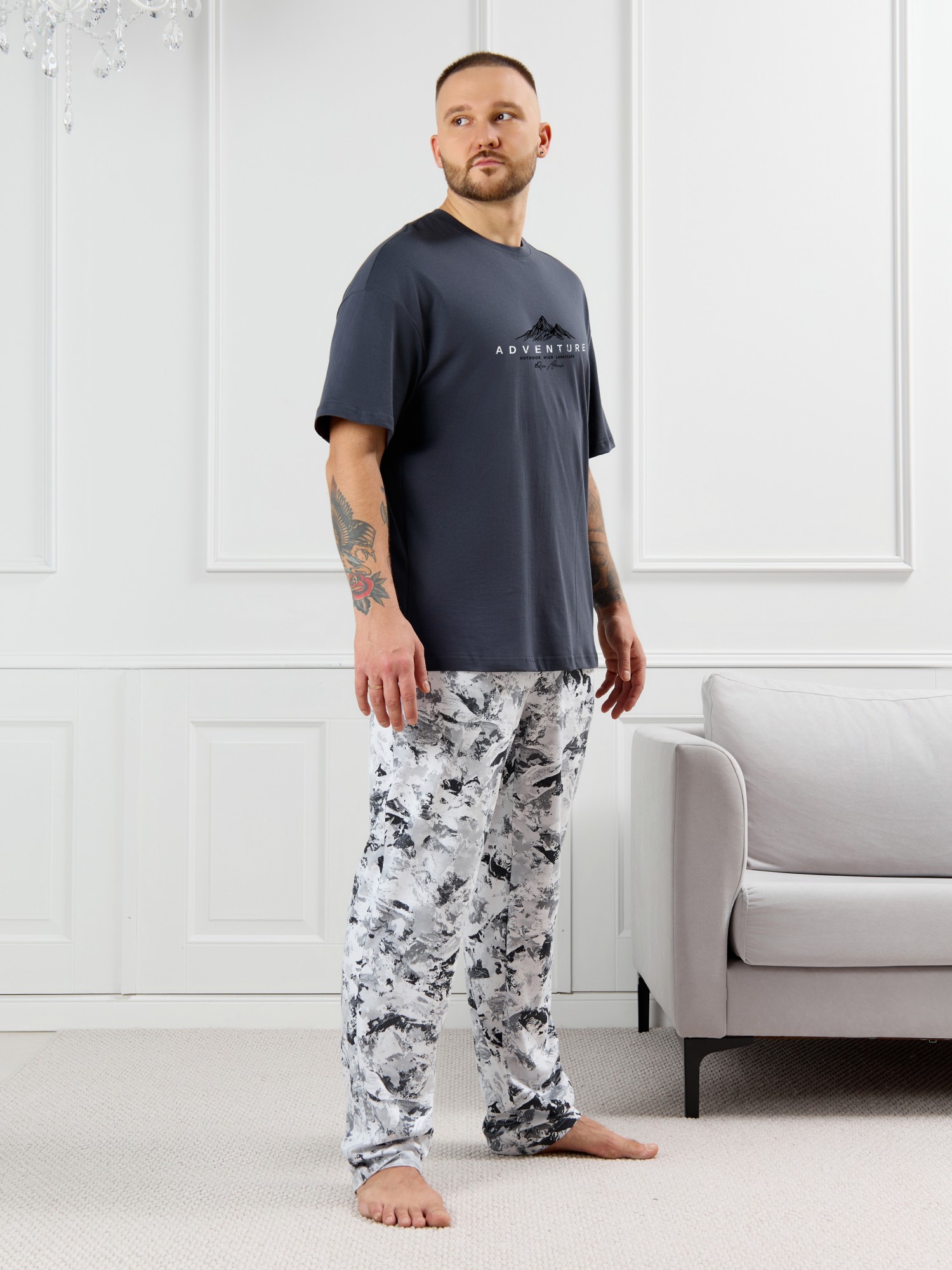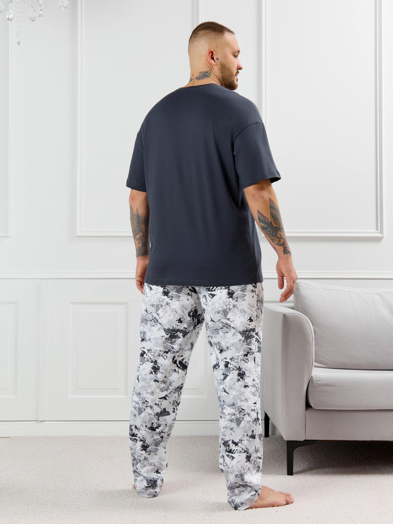 Костюм мужской, состоящий из футболки и брюк. Футболка однотонная с принтом на груди; модель свободная, со спущенной линией плеч, овальным вырезом горловины. Брюки из полотна с набивным рисунком эксклюзивного дизайна, прямые, с боковыми карманами с обтачными входами, на притачном поясе с отстроченной эластичной тесьмой.