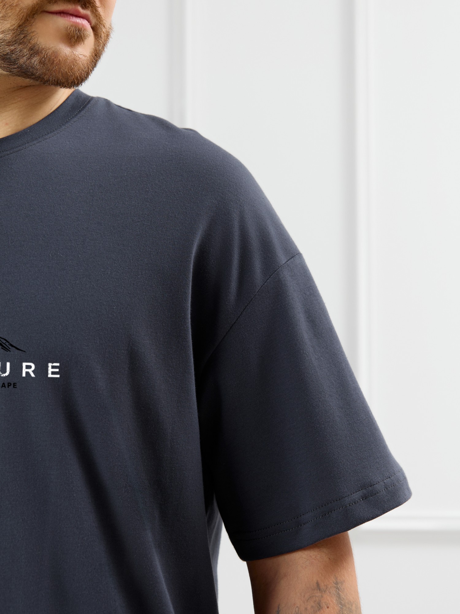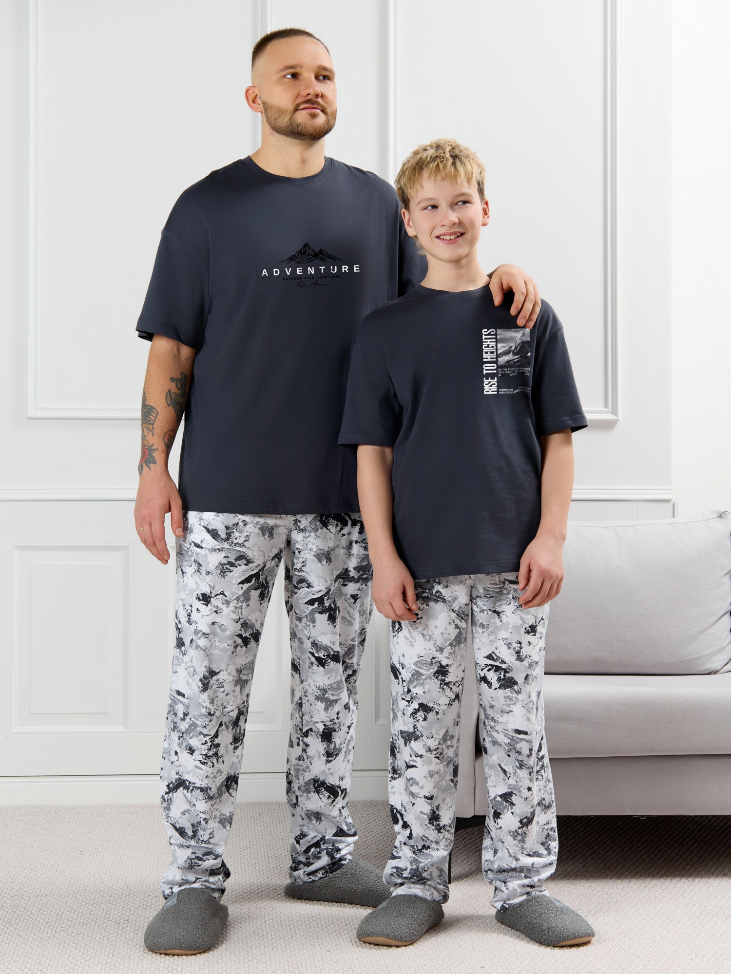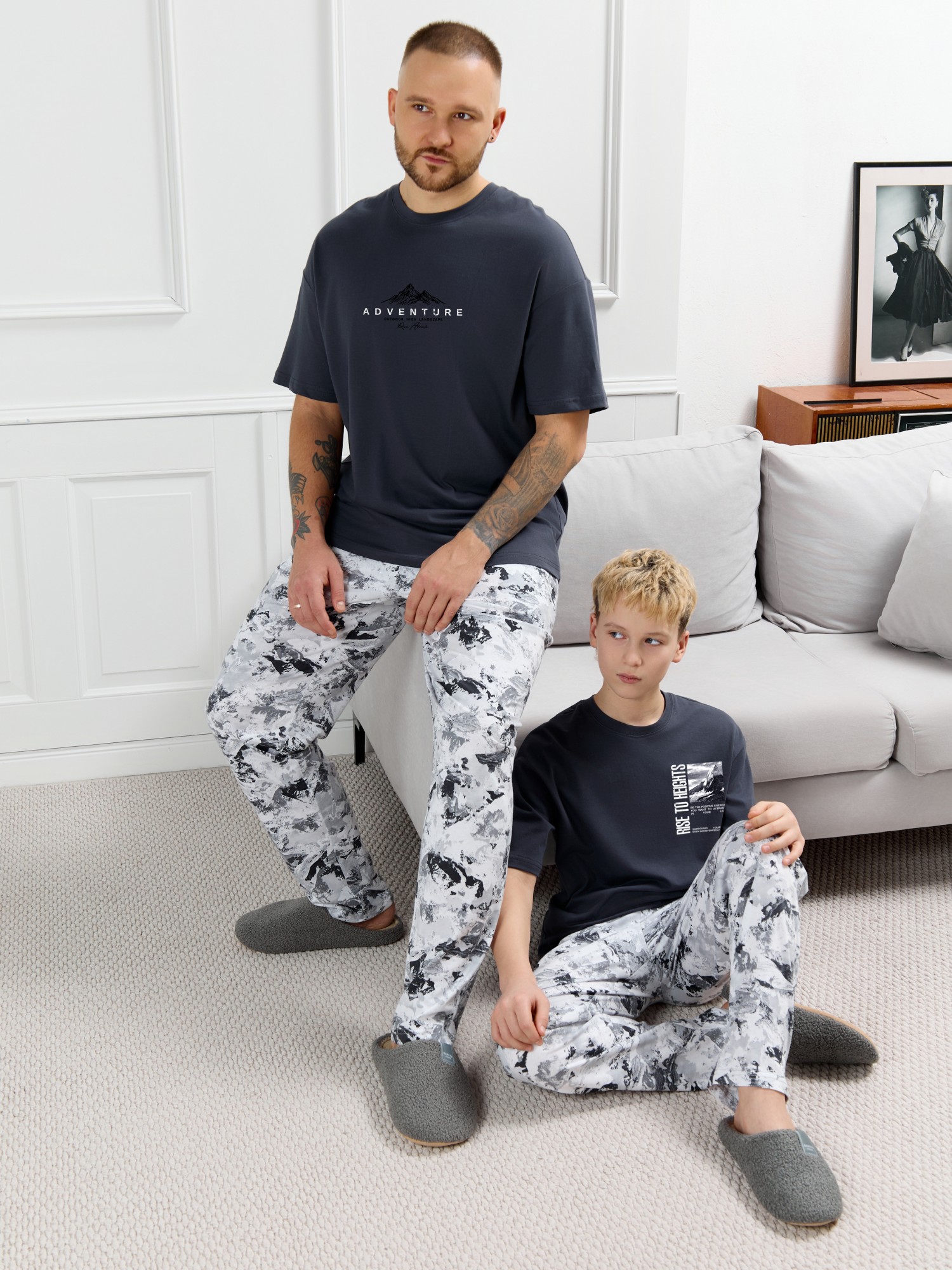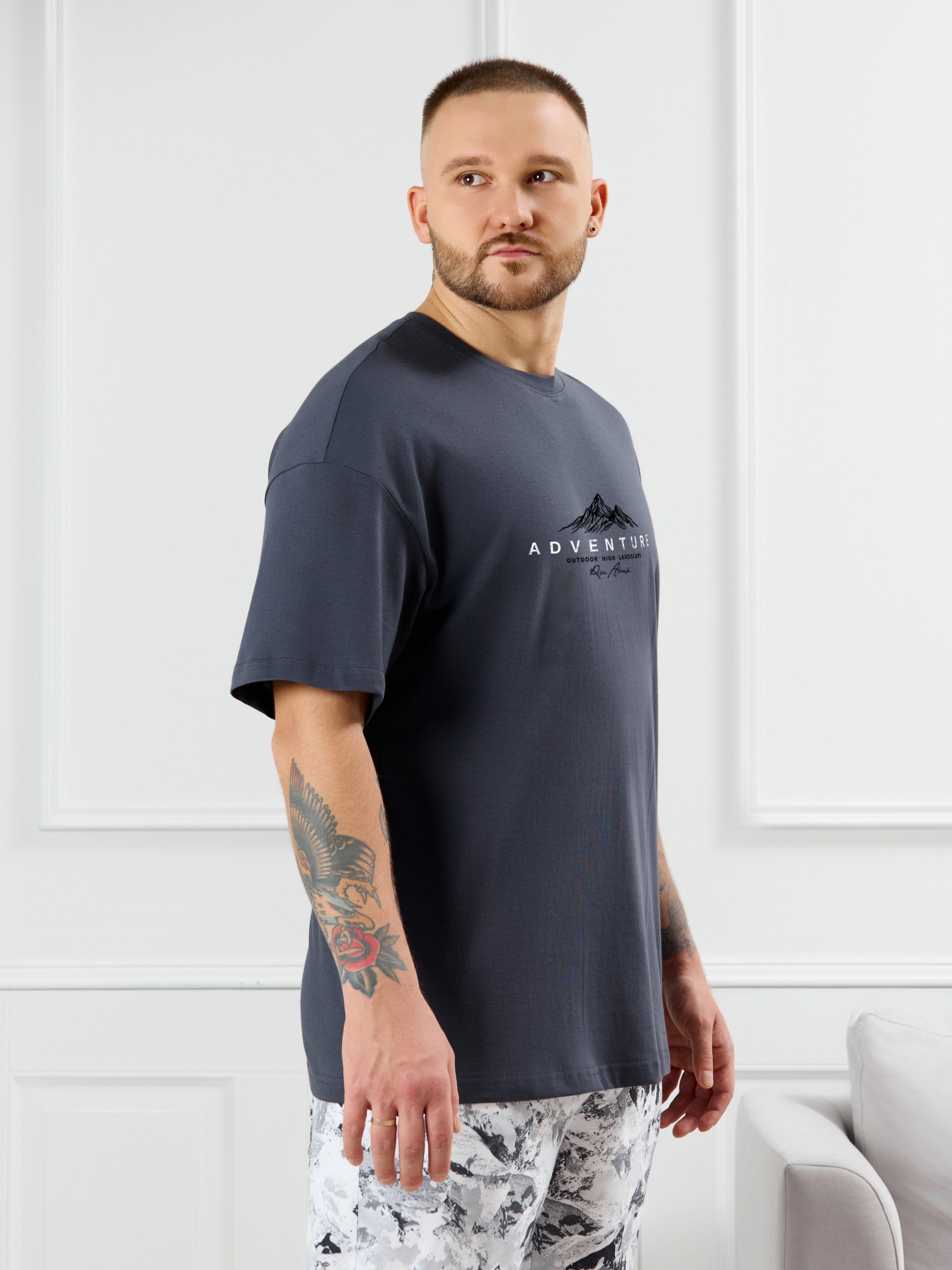 Костюм мужской, состоящий из футболки и брюк. Футболка однотонная с принтом на груди; модель свободная, со спущенной линией плеч, овальным вырезом горловины. Брюки из полотна с набивным рисунком эксклюзивного дизайна, прямые, с боковыми карманами с обтачными входами, на притачном поясе с отстроченной эластичной тесьмой.
