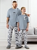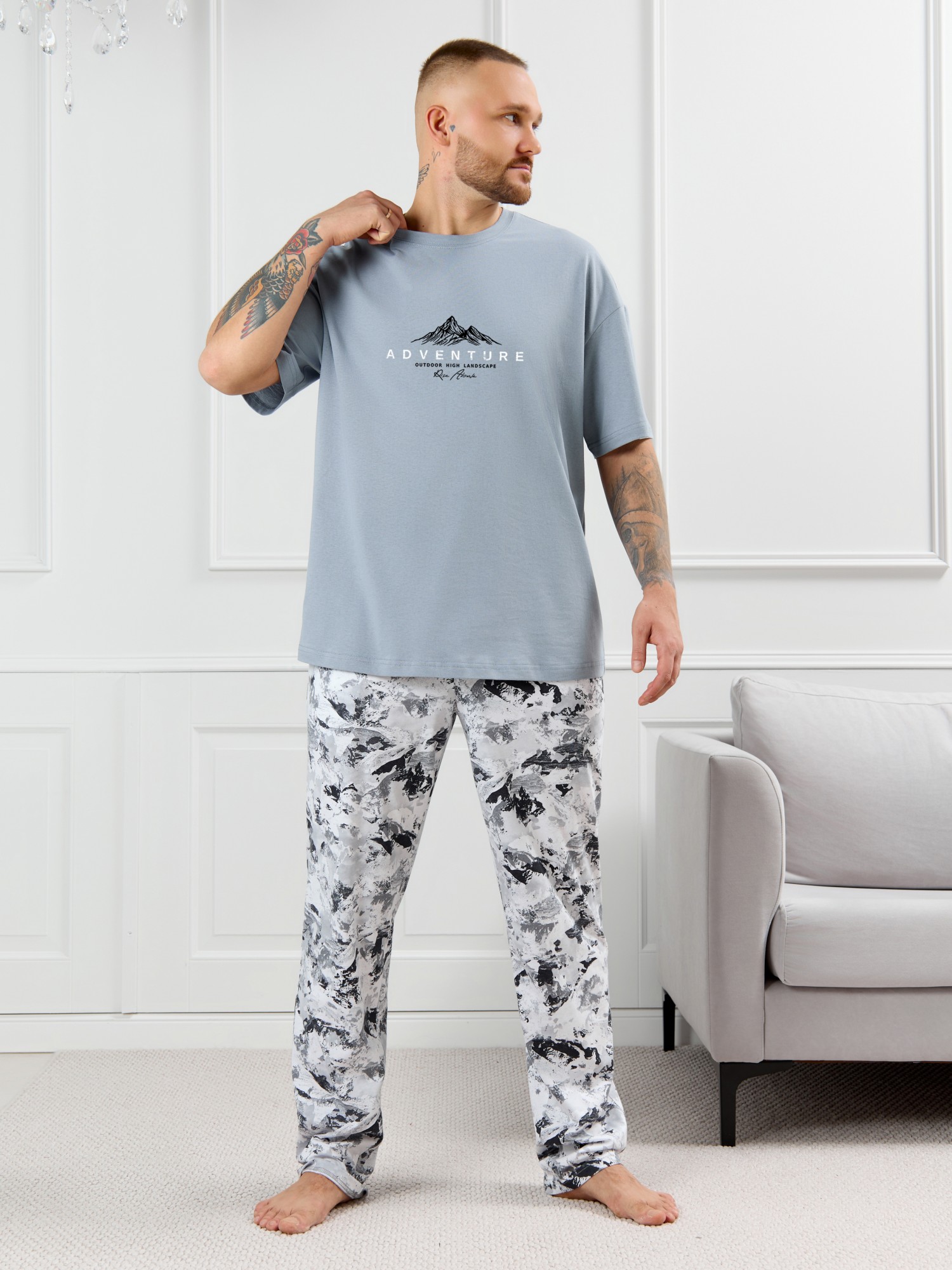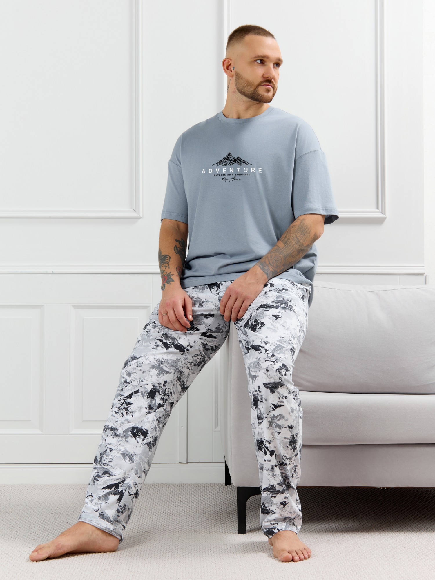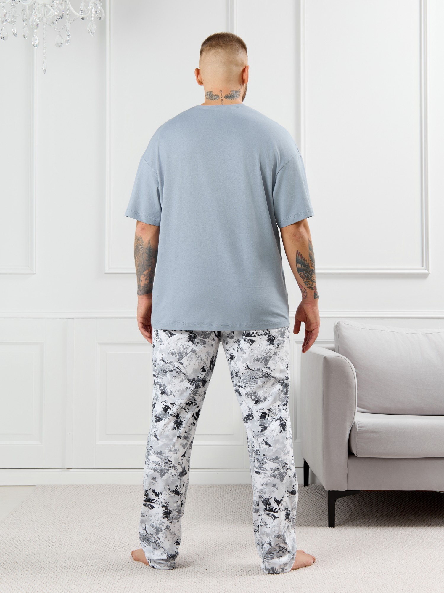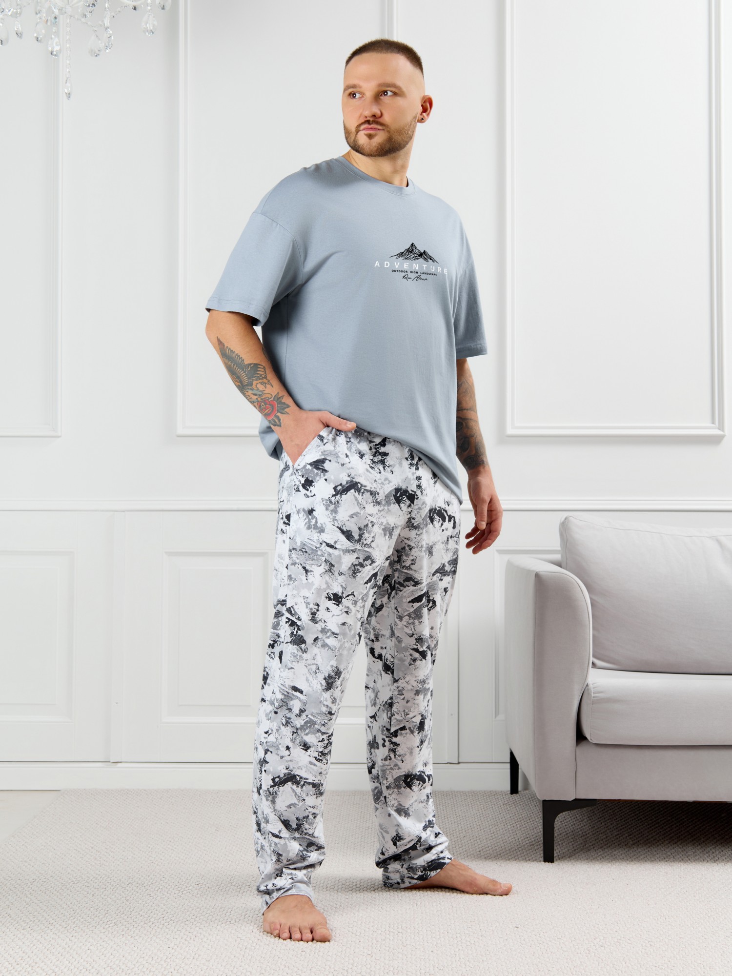 Костюм мужской, состоящий из футболки и брюк. Футболка однотонная с принтом на груди; модель свободная, со спущенной линией плеч, овальным вырезом горловины. Брюки из полотна с набивным рисунком эксклюзивного дизайна, прямые, с боковыми карманами с обтачными входами, на притачном поясе с отстроченной эластичной тесьмой.