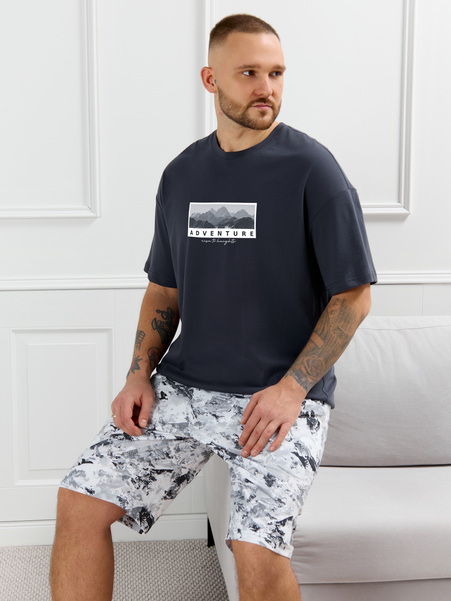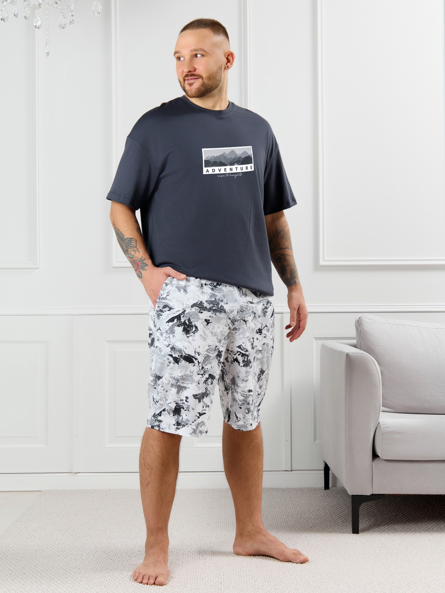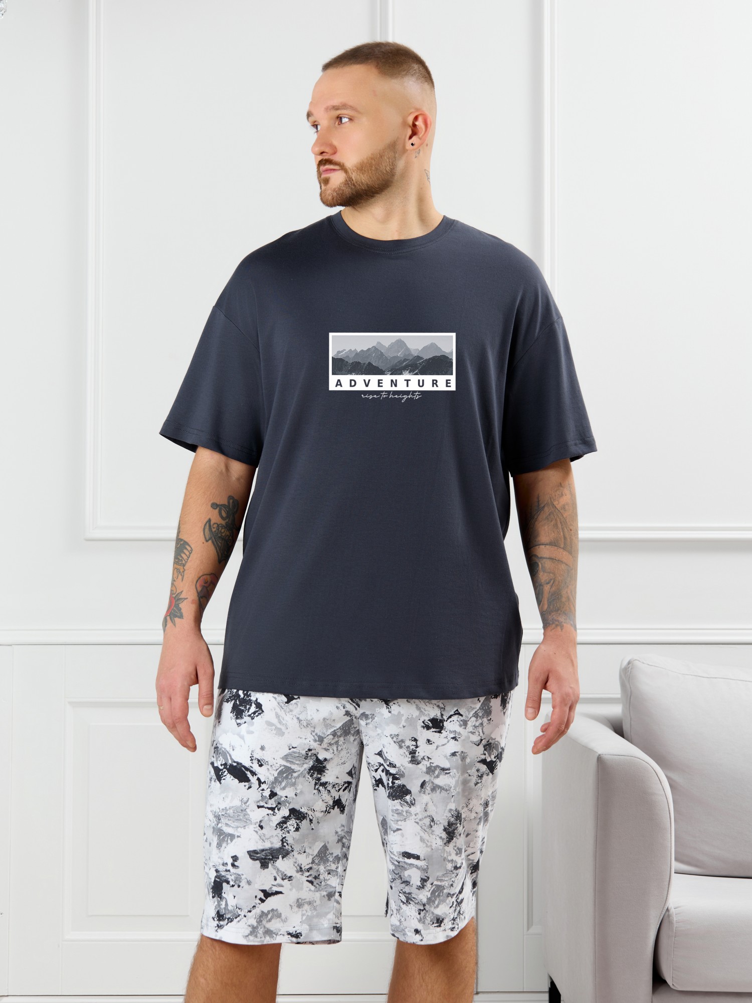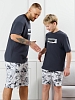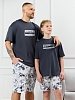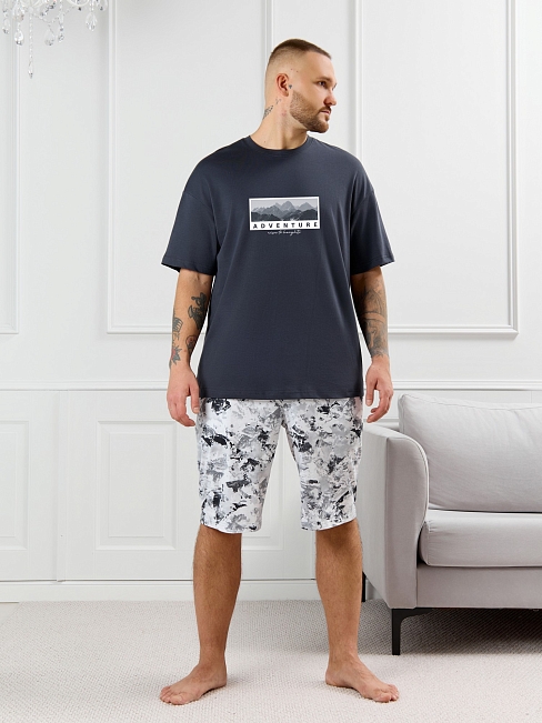Костюм мужской, состоящий из футболки и шорт. Футболка однотонная с принтом на груди; модель свободная, со спущенной линией плеч, овальным вырезом горловины. Шорты из полотна с набивным рисунком эксклюзивного дизайна, с боковыми карманами с обтачными входами, на притачном поясе с отстроченной эластичной тесьмой.