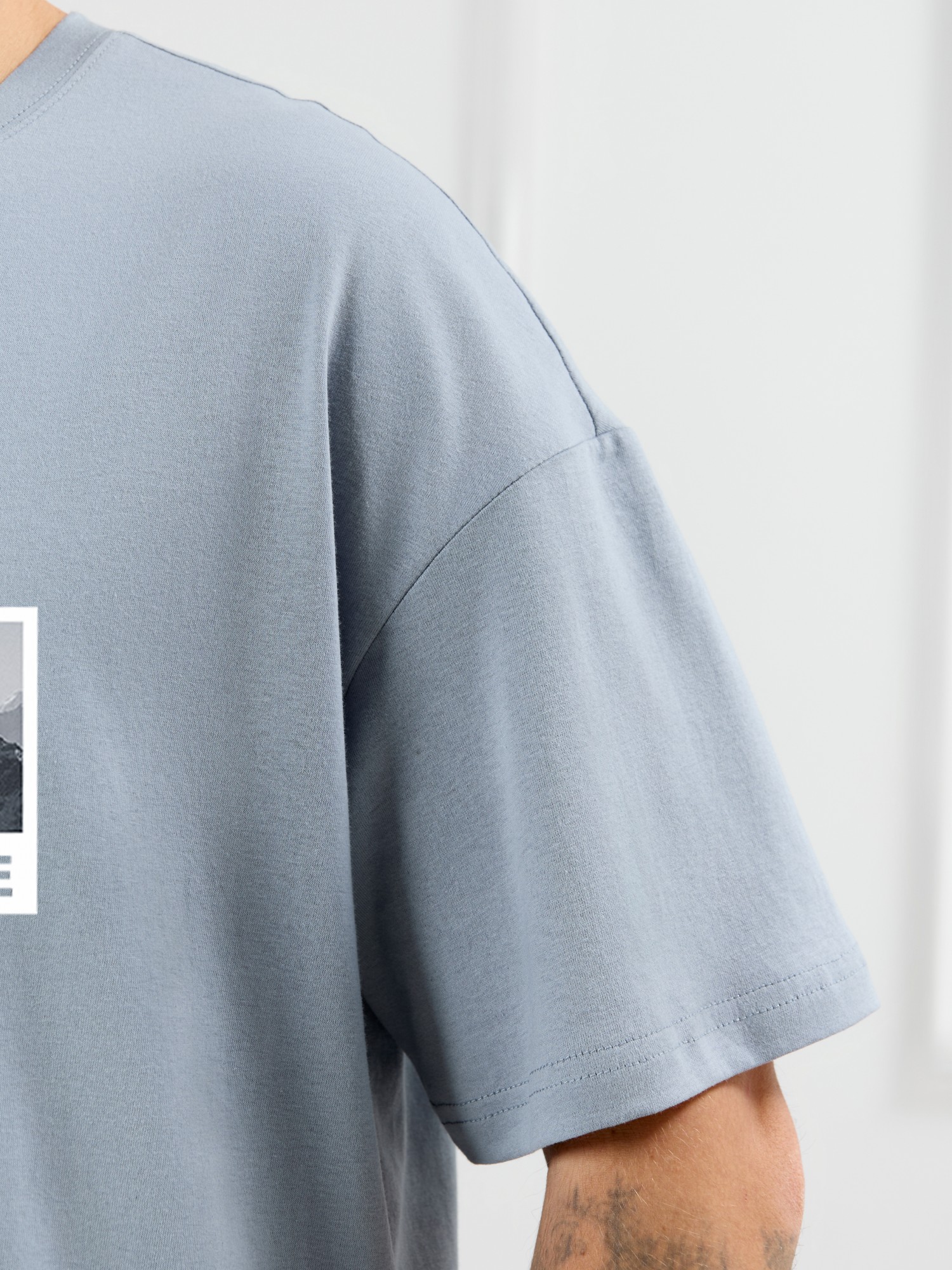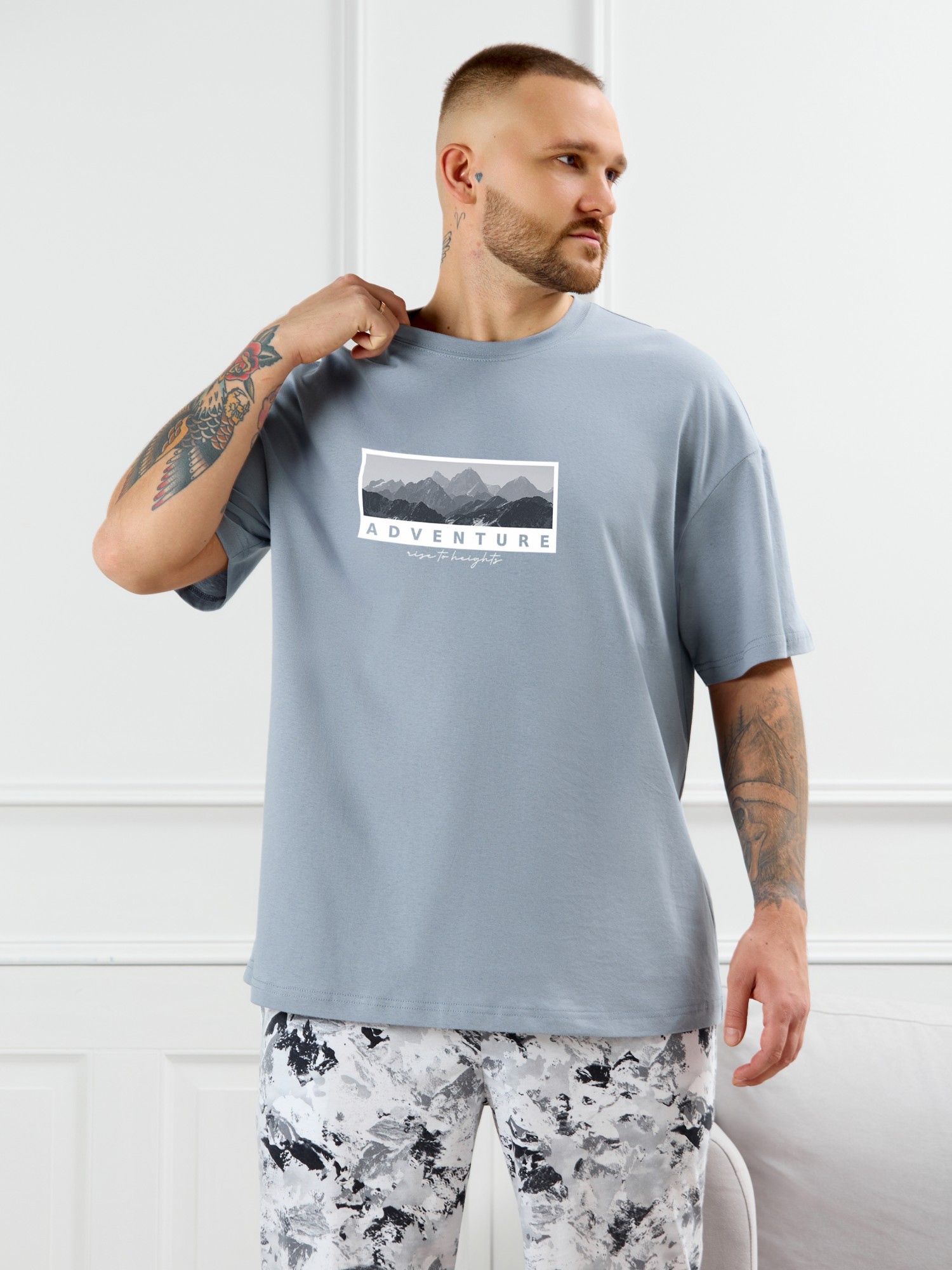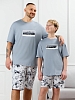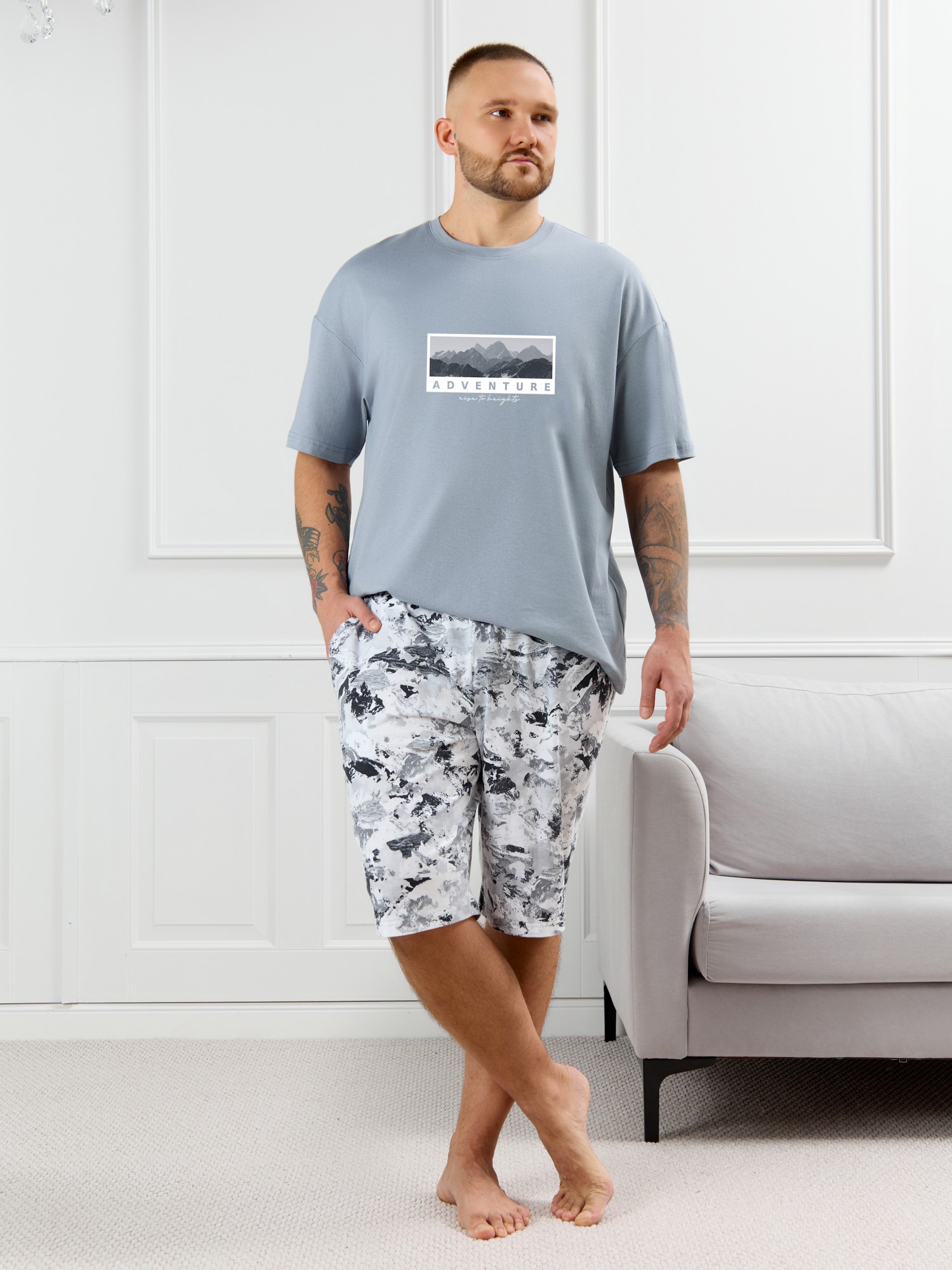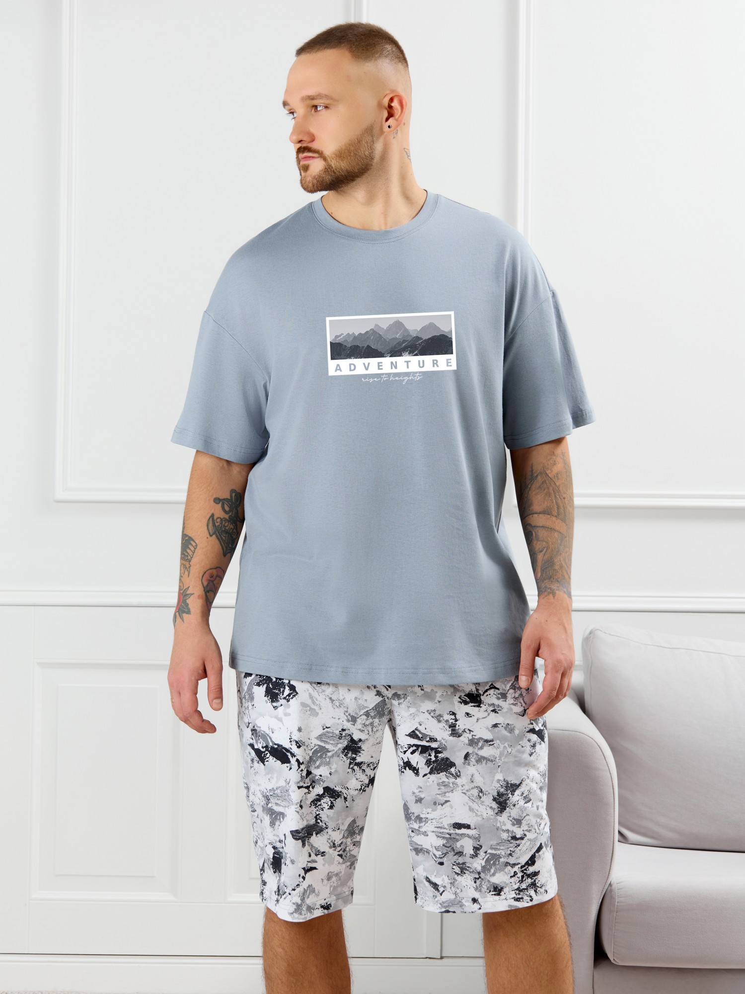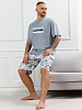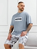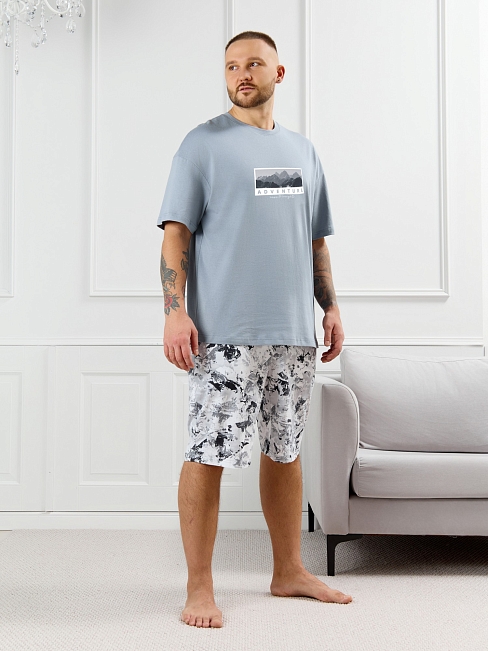 Костюм мужской, состоящий из футболки и шорт. Футболка однотонная с принтом на груди; модель свободная, со спущенной линией плеч, овальным вырезом горловины. Шорты из полотна с набивным рисунком эксклюзивного дизайна, с боковыми карманами с обтачными входами, на притачном поясе с отстроченной эластичной тесьмой.