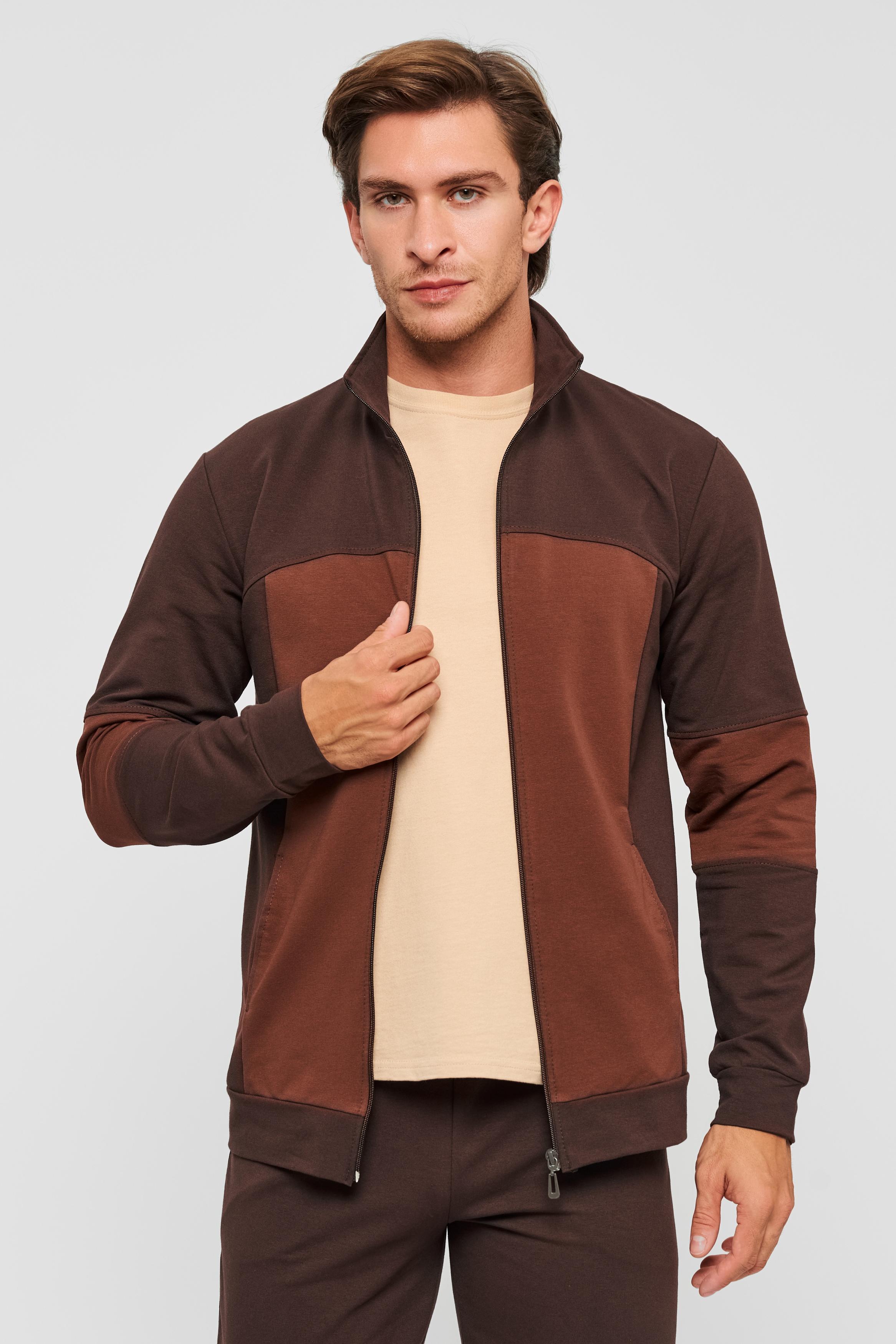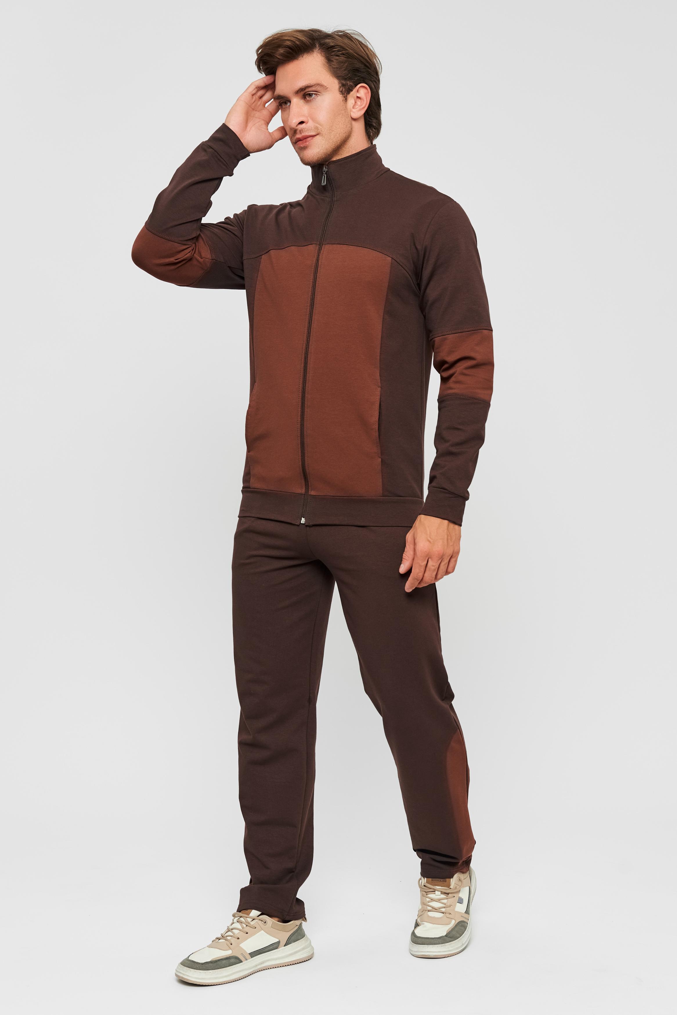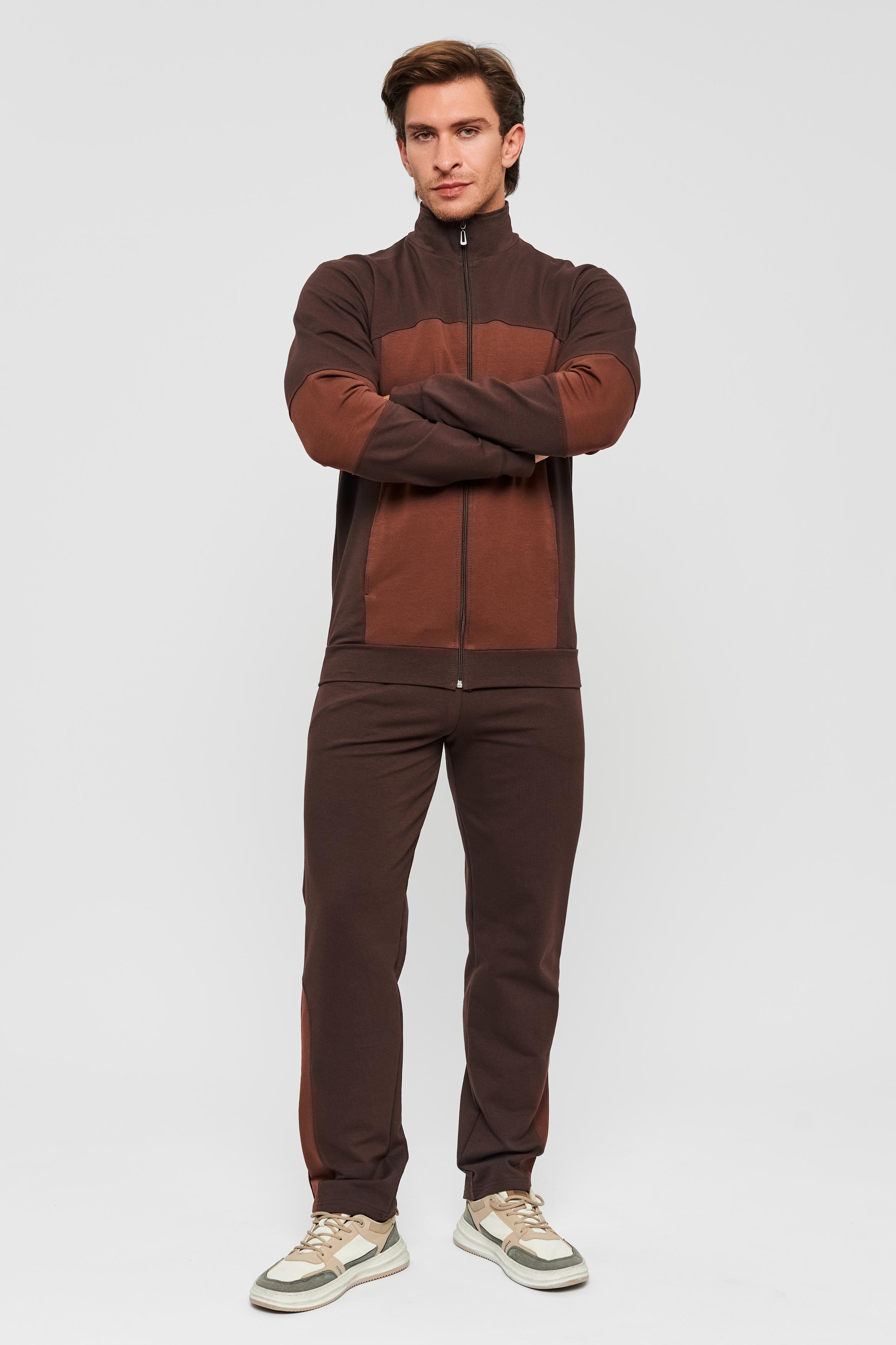 Мужской спортивный костюм из хлопкового трикотажа. В комплекте костюма куртка на манжетах и свободные прямые брюки. Воротник куртки - стойка, полочка и рукава выполнены оригинальным образом комбинацией тканей, застёжка на молнии. Куртка и брюки с удобными карманами. Брюки на поясной резинке, выполнены из однотонного цвета. Модель костюма свободного покроя, не сковывает движений. Такой костюм прекрасно подойдёт как для спорта, так и для отдыха.