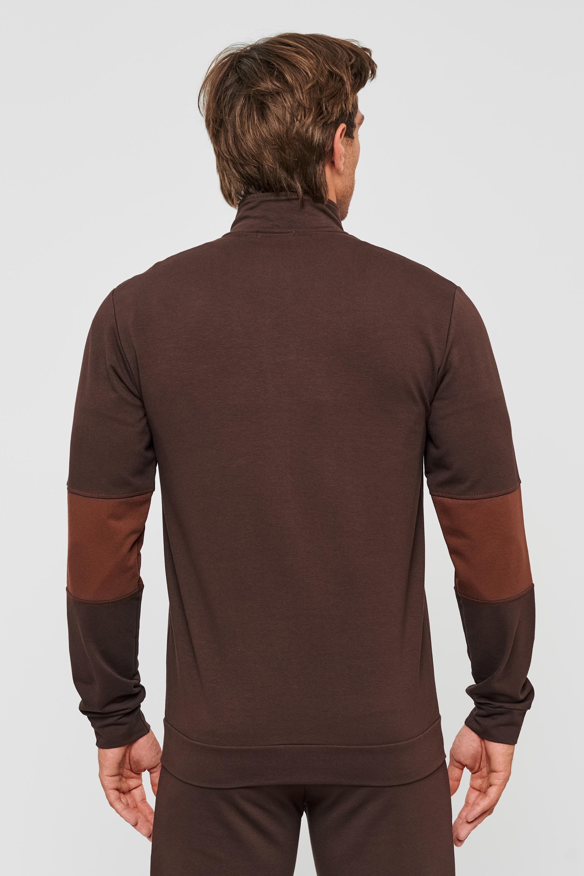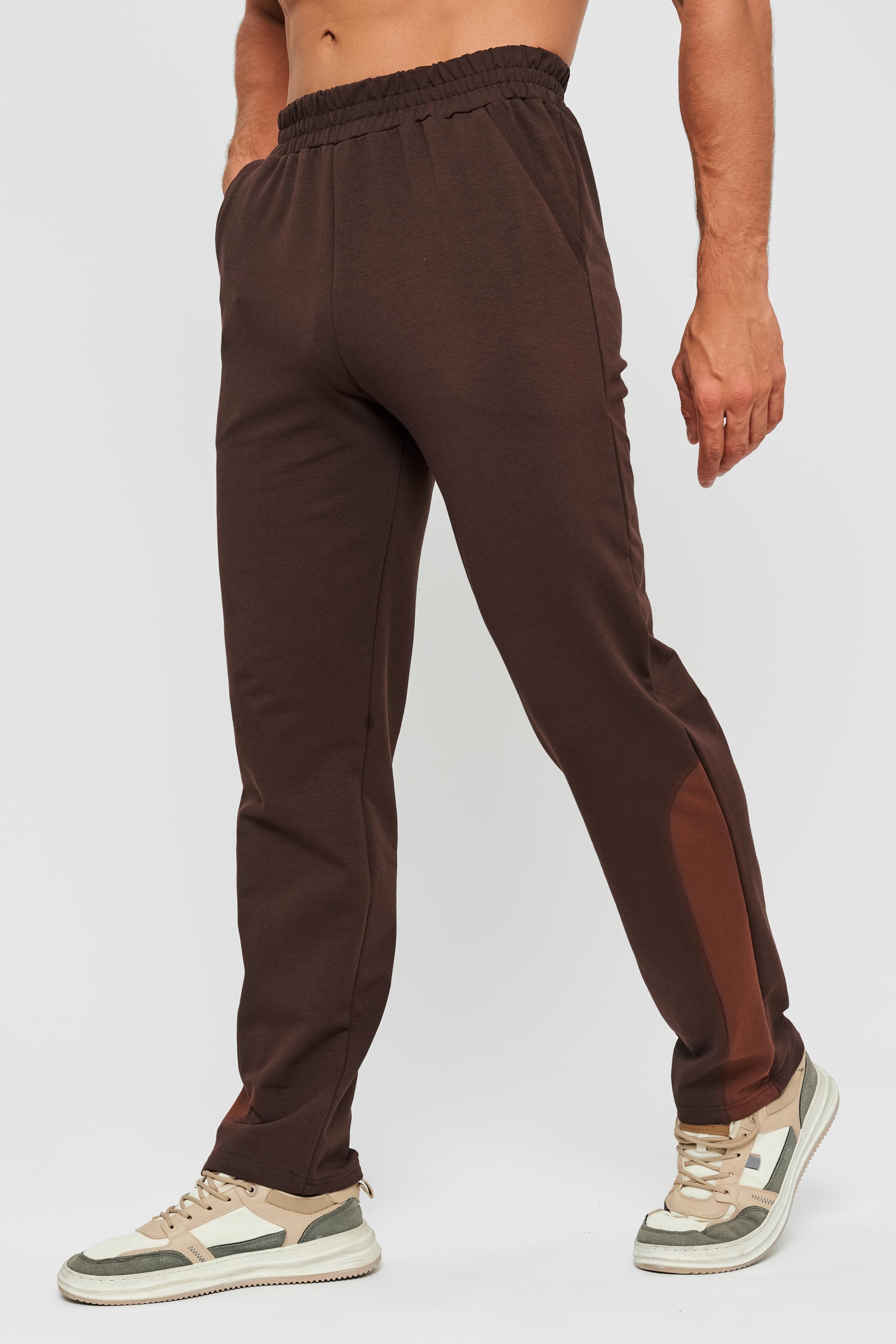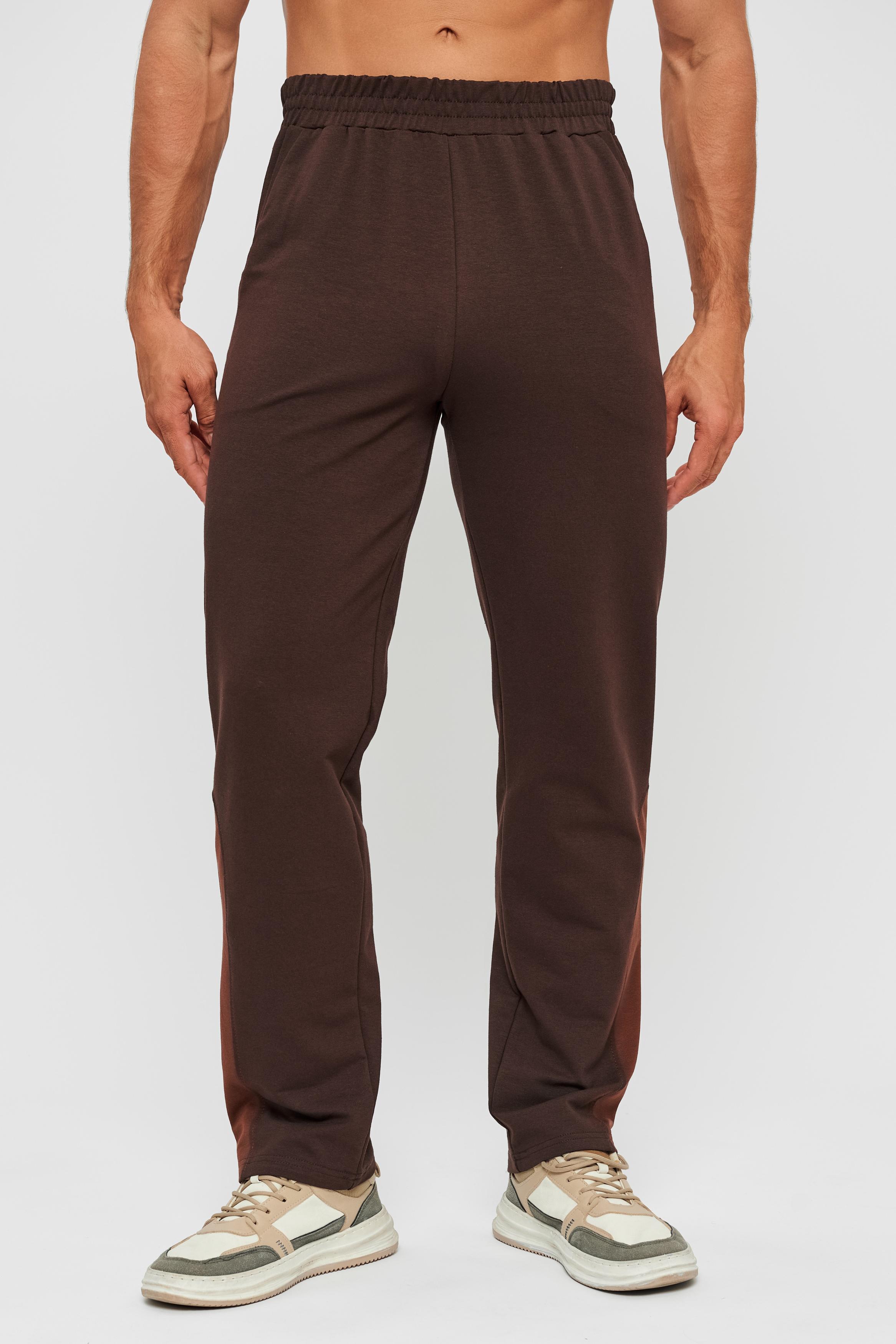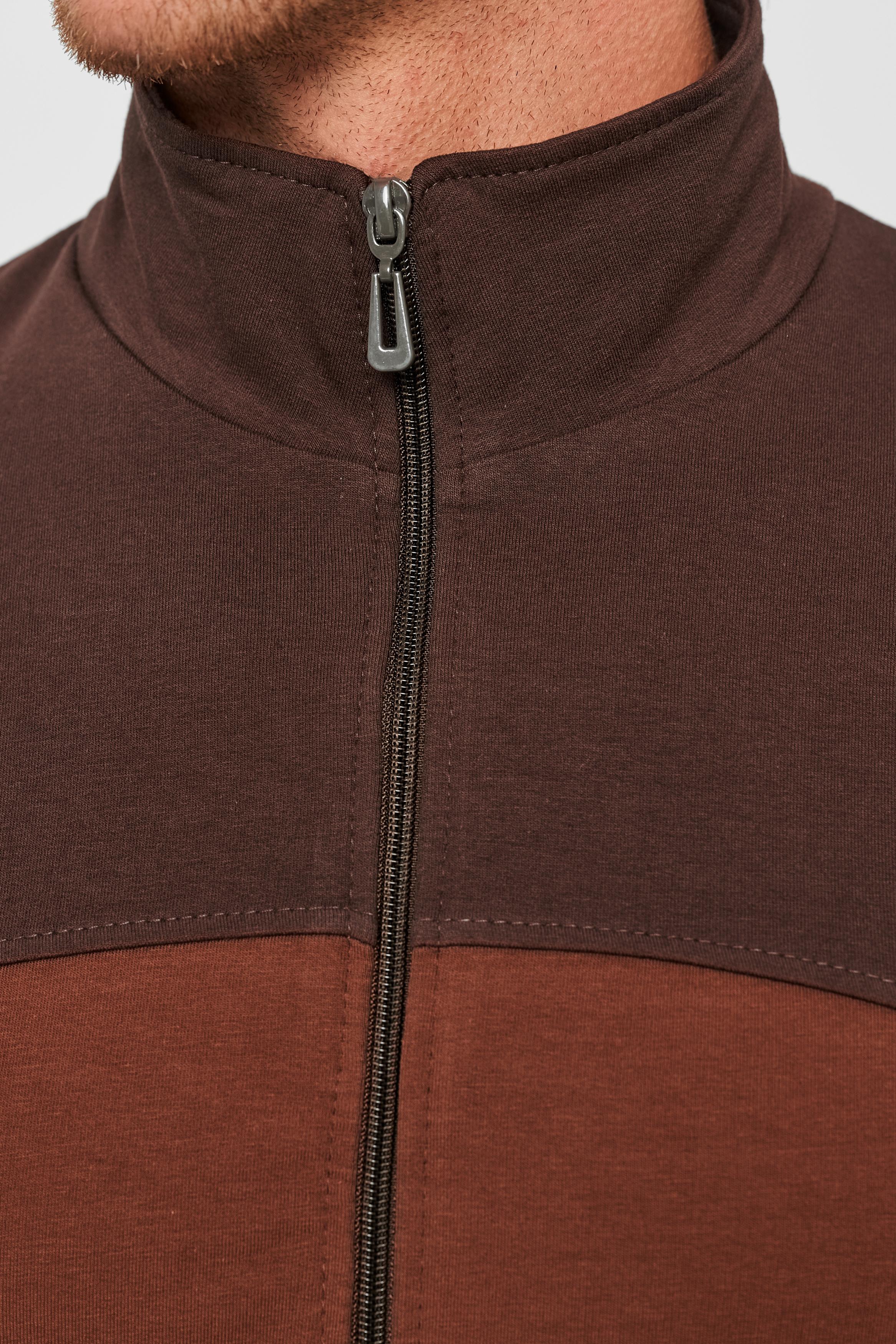 Мужской спортивный костюм из хлопкового трикотажа. В комплекте костюма куртка на манжетах и свободные прямые брюки. Воротник куртки - стойка, полочка и рукава выполнены оригинальным образом комбинацией тканей, застёжка на молнии. Куртка и брюки с удобными карманами. Брюки на поясной резинке, выполнены из однотонного цвета. Модель костюма свободного покроя, не сковывает движений. Такой костюм прекрасно подойдёт как для спорта, так и для отдыха.