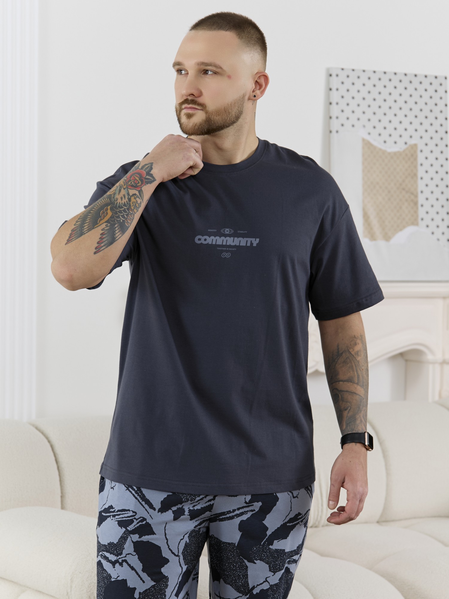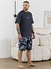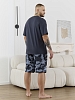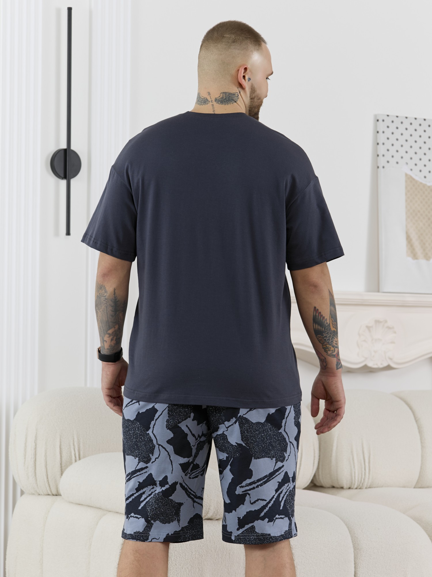 Костюм мужской, состоящий из футболки и шорт. Футболка однотонная с принтом на груди; модель свободная, со спущенной линией плеч, втачными рукавами, овальным вырезом горловины. Шорты из полотна с набивным рисунком эксклюзивного дизайна, с боковыми карманами с обтачными входами, на притачном поясе с отстроченной эластичной тесьмой.