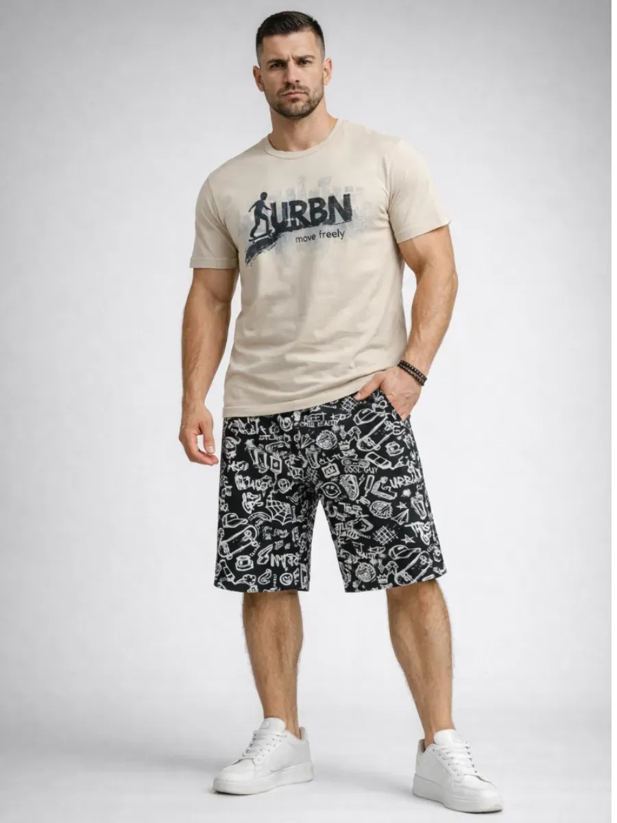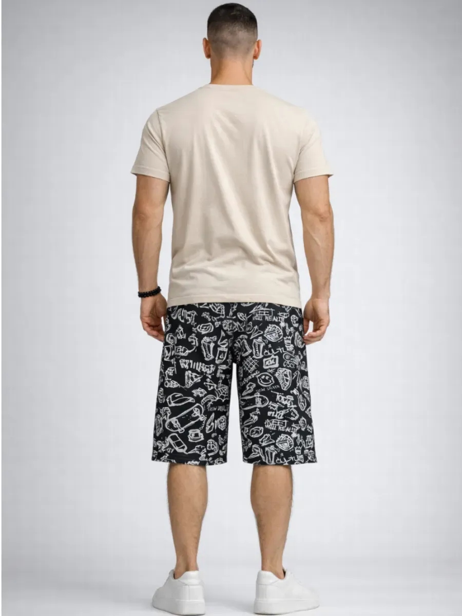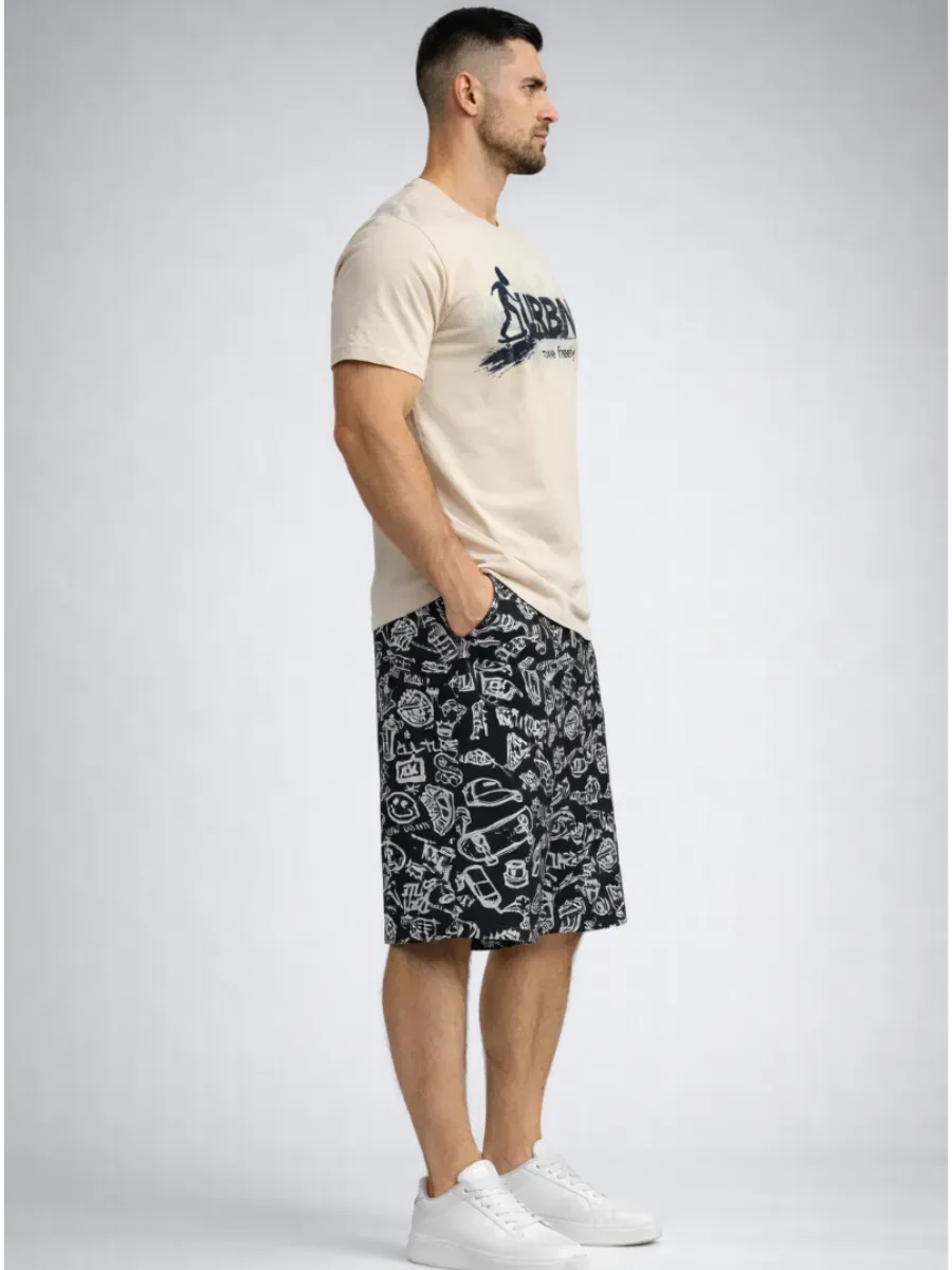 Мужской трикотажный костюм с шортами невероятно удобен, практичен и оригинален. Модель в ярких тонах станет удачным выбором для каждодневного образа. Такие летние костюмы из хлопкового трикотажа отлично подходят для пляжного сезона и для домашнего времяпрепровождения. Трикотажный костюм состоит из футболки с коротким рукавом и шорт. Удлинённые шорты с удобными боковыми карманами будут практичны и комфортны в любое время года. Необычным исполнением данной модели является авторский принт. Такой мужской костюм отлично подойдет для дома и отдыха, а также в качестве мужской пижамы.