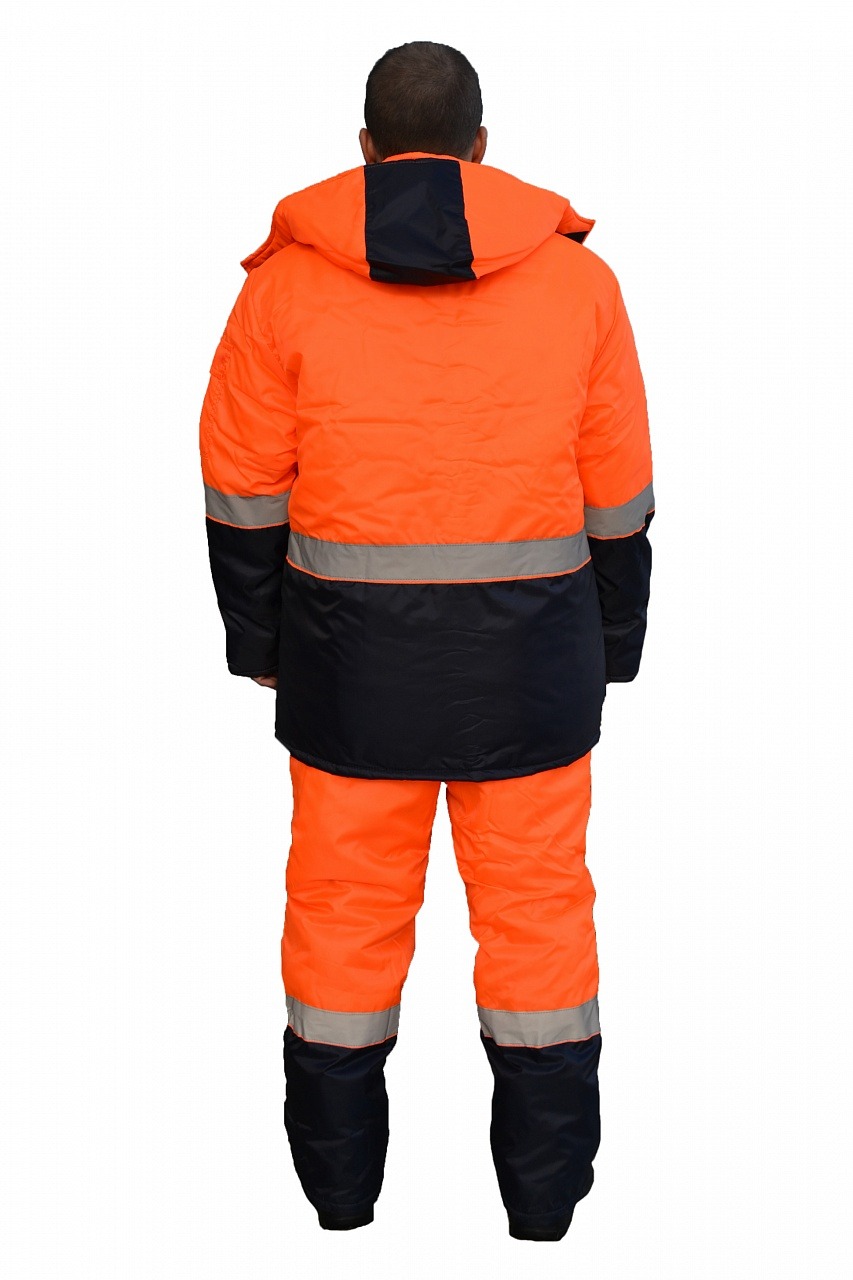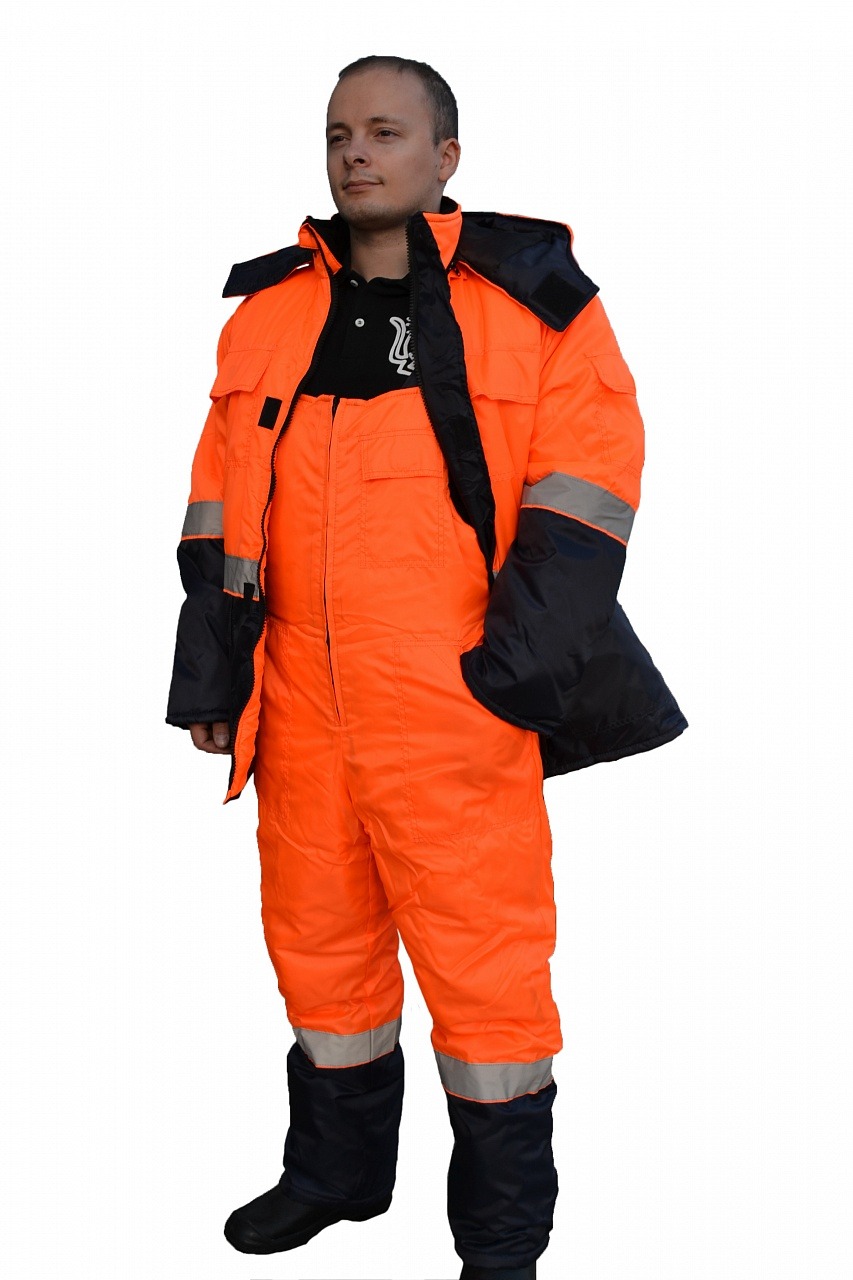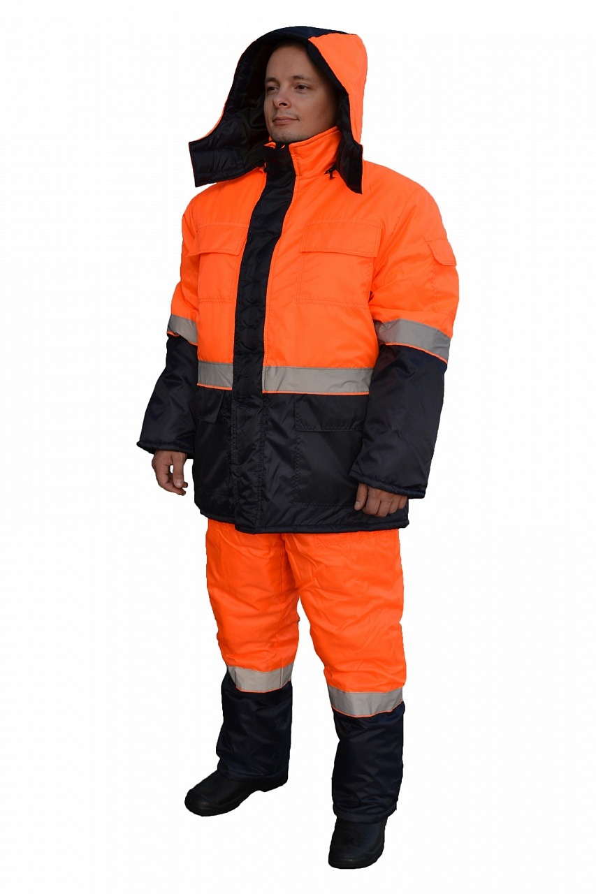 Куртка прямого силуэта с центральной бортовой застёжкой на тесьму-молнию закрытую планкой на текстильной ленте велькро. Полочка состоит из двух частей по линии стачивания которых настрочена светоотражающая лента шириной 50мм. На куртке 4 накладных кармана с клапаном, закрывающимся на текстильную ленту велькро. Спинка состоит из 2х частей, по линии стачивания которых настрочена светоотражающая лента шириной 50мм. Рукав втачной одношовный с трикотажным манжетом. Состоит из 2х частей по линии стачивания которых настрочена светоотражающая лента шириной 50мм. На левом рукаве один накладной карман с клапаном на текстильной ленте велькро. Воротник втачной стойка, внутренняя часть на флисе. Капюшон состоит из 3х частей, с хомутом на текстильной ленте велькро. Пристегивается по средствам тесьмы-молнии. С левой стороны расположен один внутренний карман на текстильной ленте велькро.