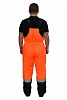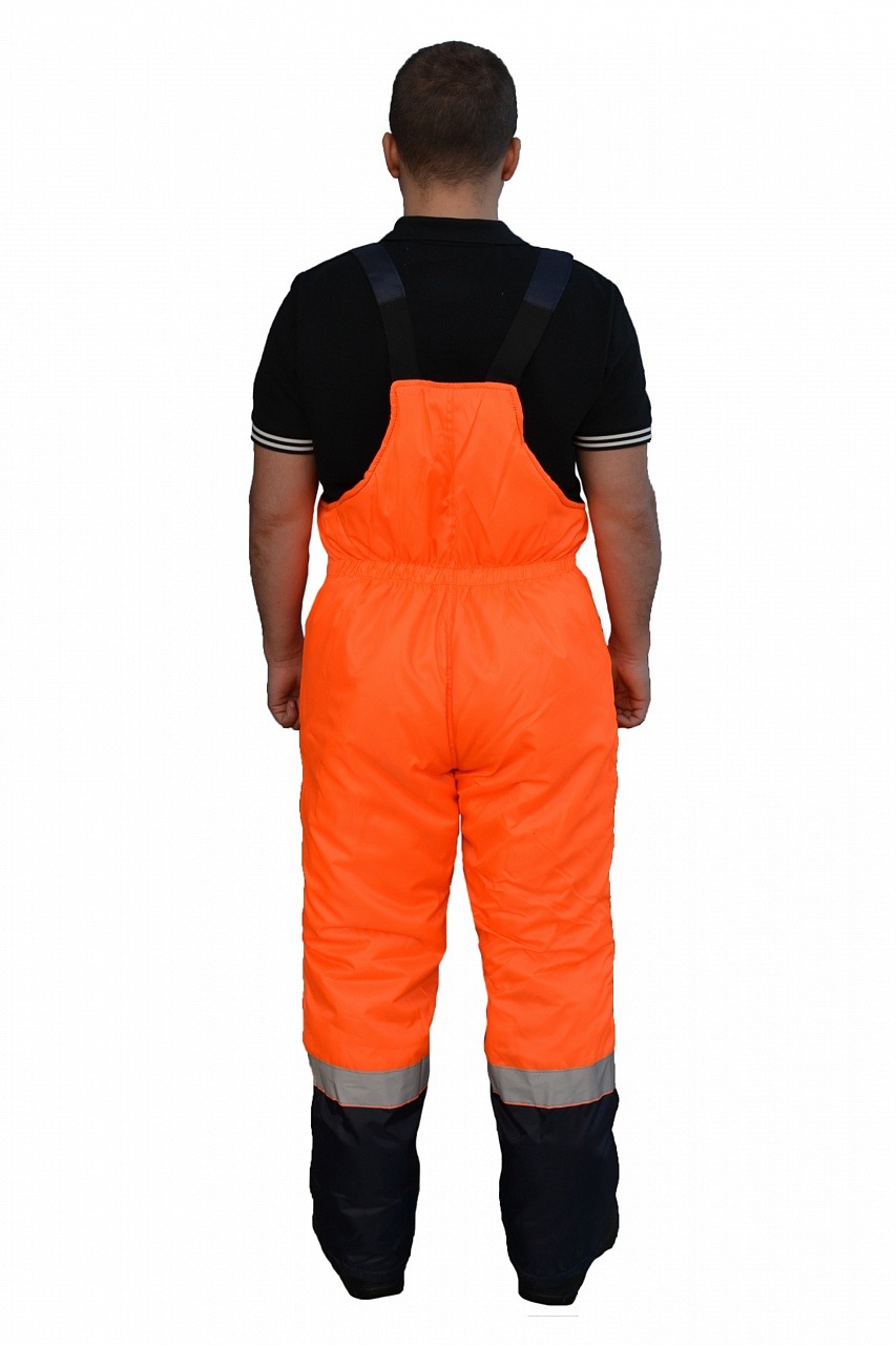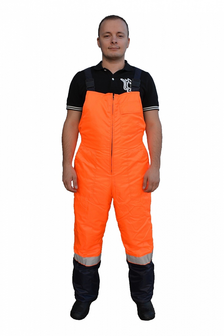 Полукомбинезон с застежкой на тесьму – молнию по передним половинкам, с регулирующимися бретелями. Передние половинки цельнокроеные. По верхним частям передних половинок расположены боковые накладные карманы с наклонным входом, один нагрудный карман с клапаном на текстильной ленте велькро. Задняя часть цельнокроеная на резинке. По нижней части полукомбинезона настрочена светоотражающая лента шириной 50мм.