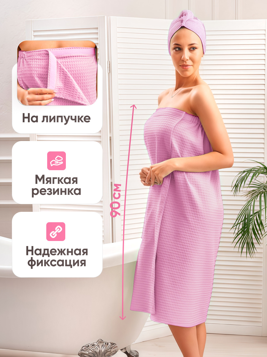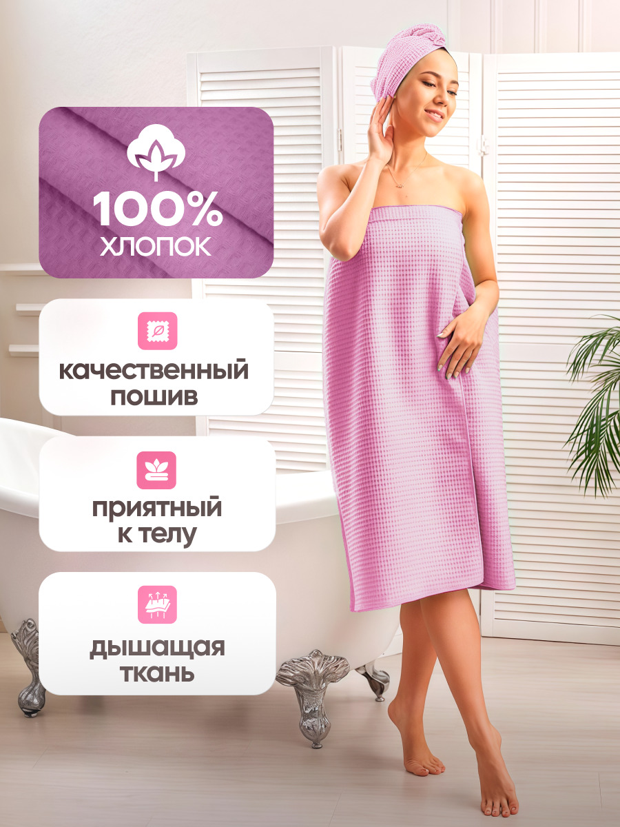 Женский набор для сауны вафельный 2 в 1 AVICTORY состоит из полотенца на липучке и чалмы для сушки волос. Ткань - вафельное полотно, 100% хлопок, плотность 240 гр/м2. Размер килта 90*150 см.